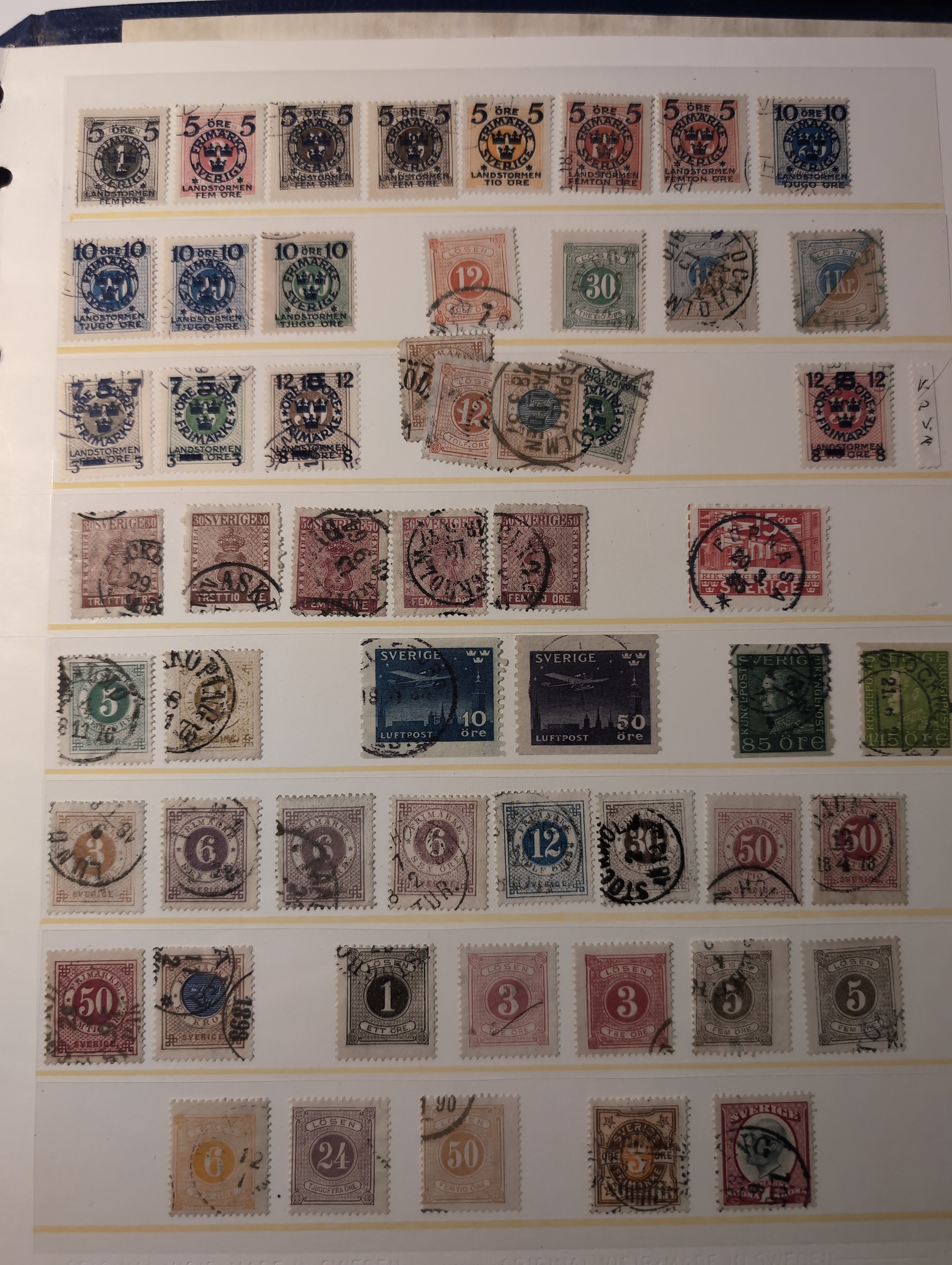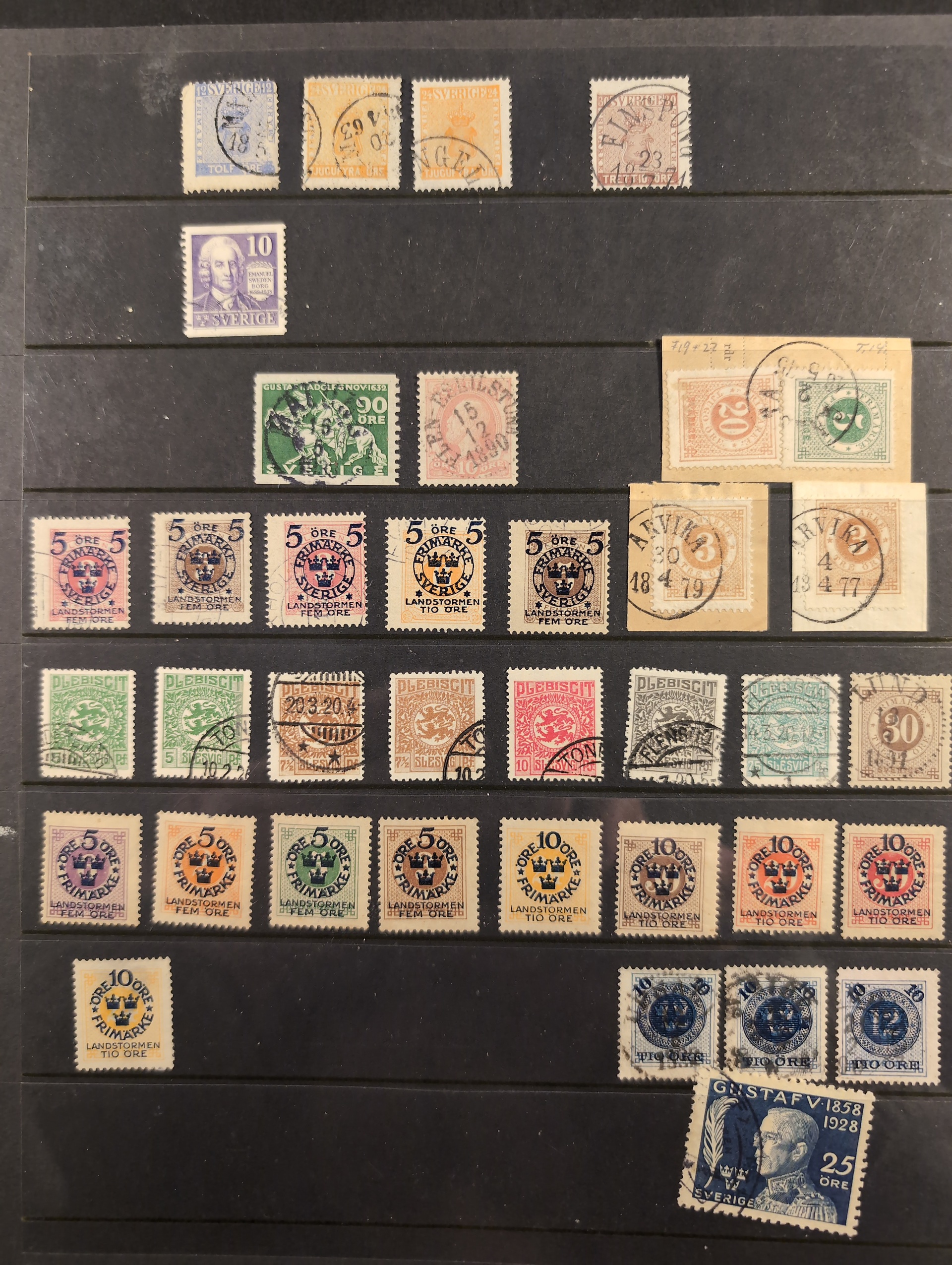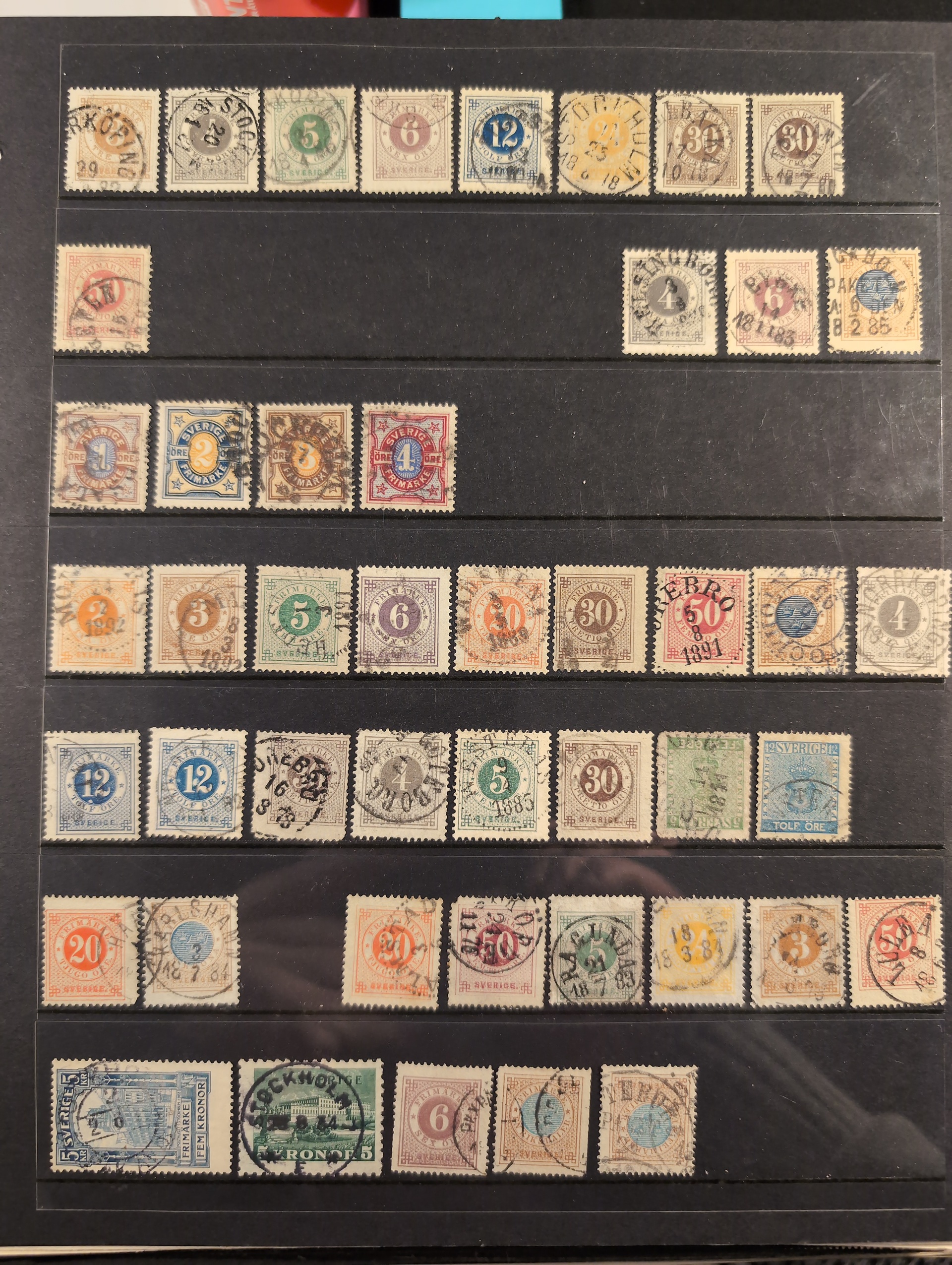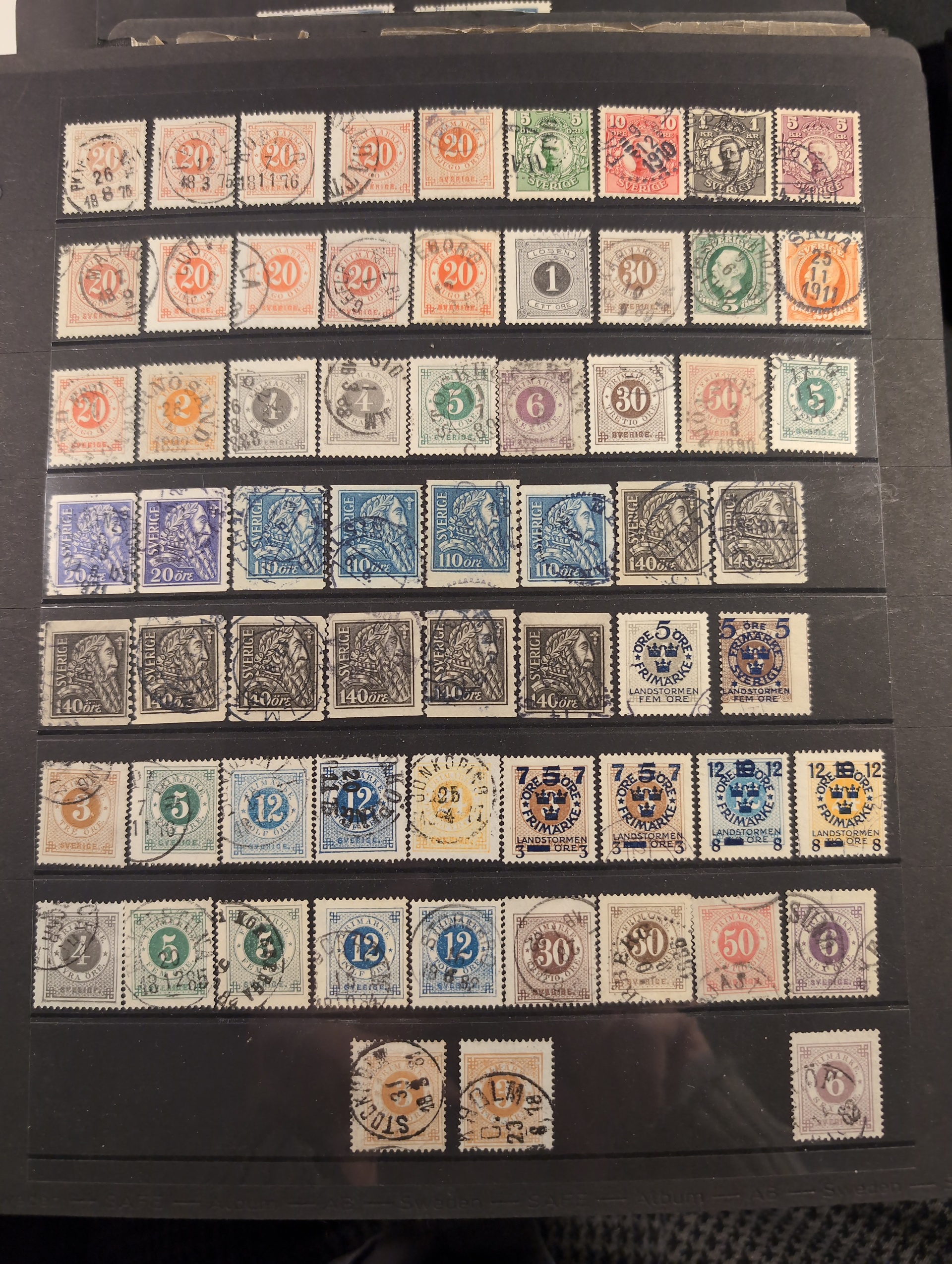 Sweden. Accumulation mostly used 1855–1960s in box. Three albums and about 100 visir leaves with mostly older stamps, incl, some better but the quality is very mixed. Much Circle type stamps, unchecked by us. Please see a selection of scans at www.philea.se. Mixed quality. Approx. 8 kg. (1000s)
