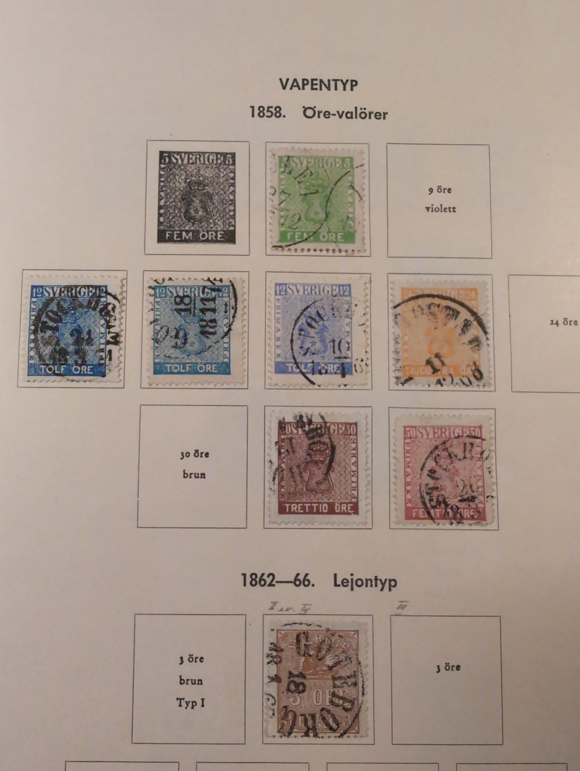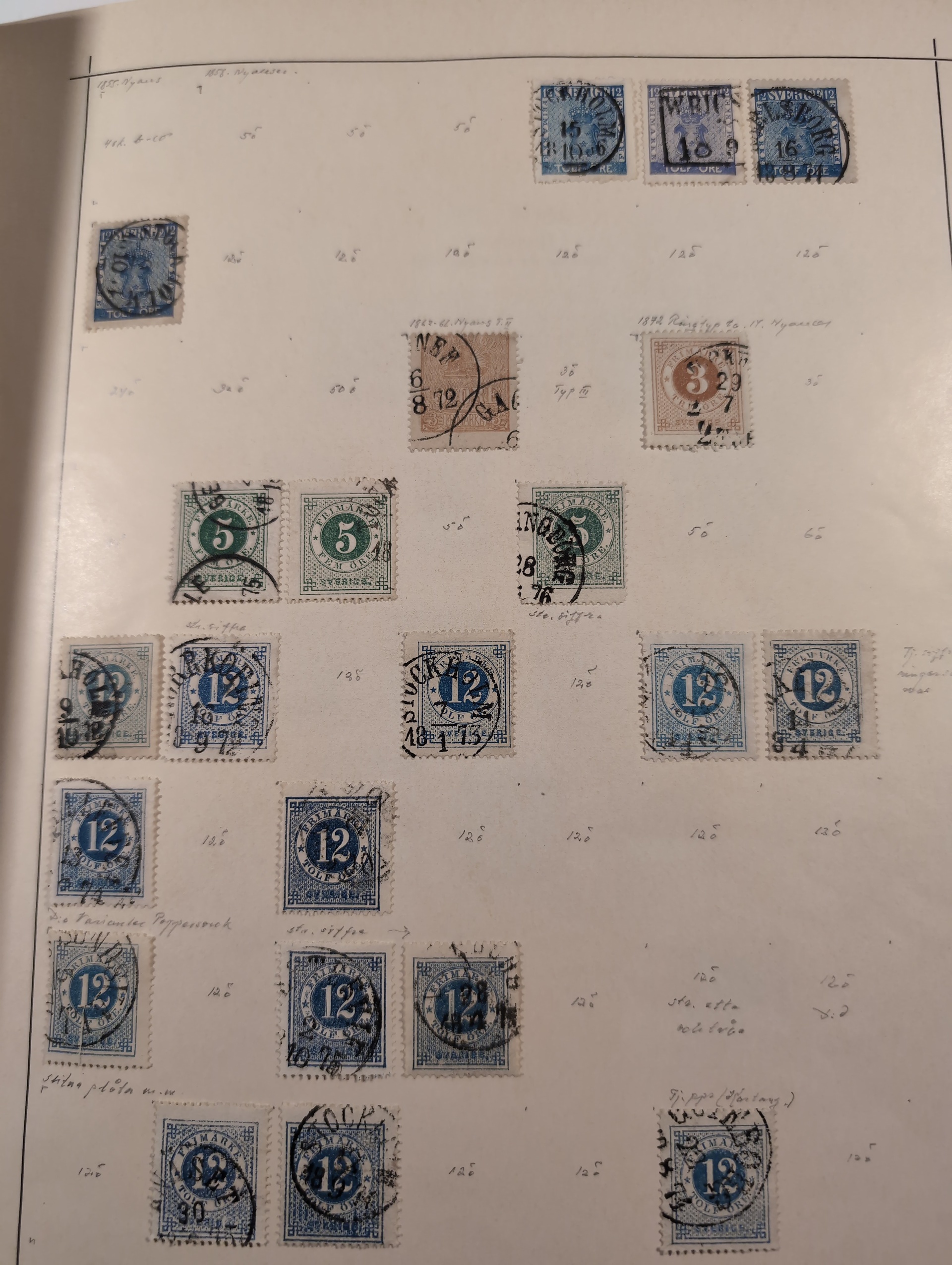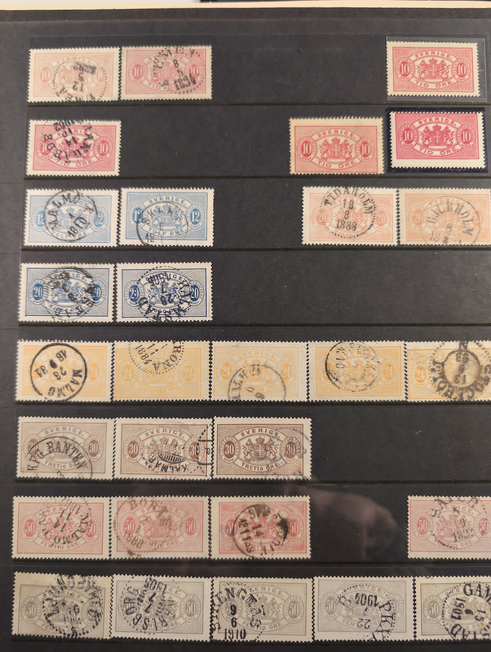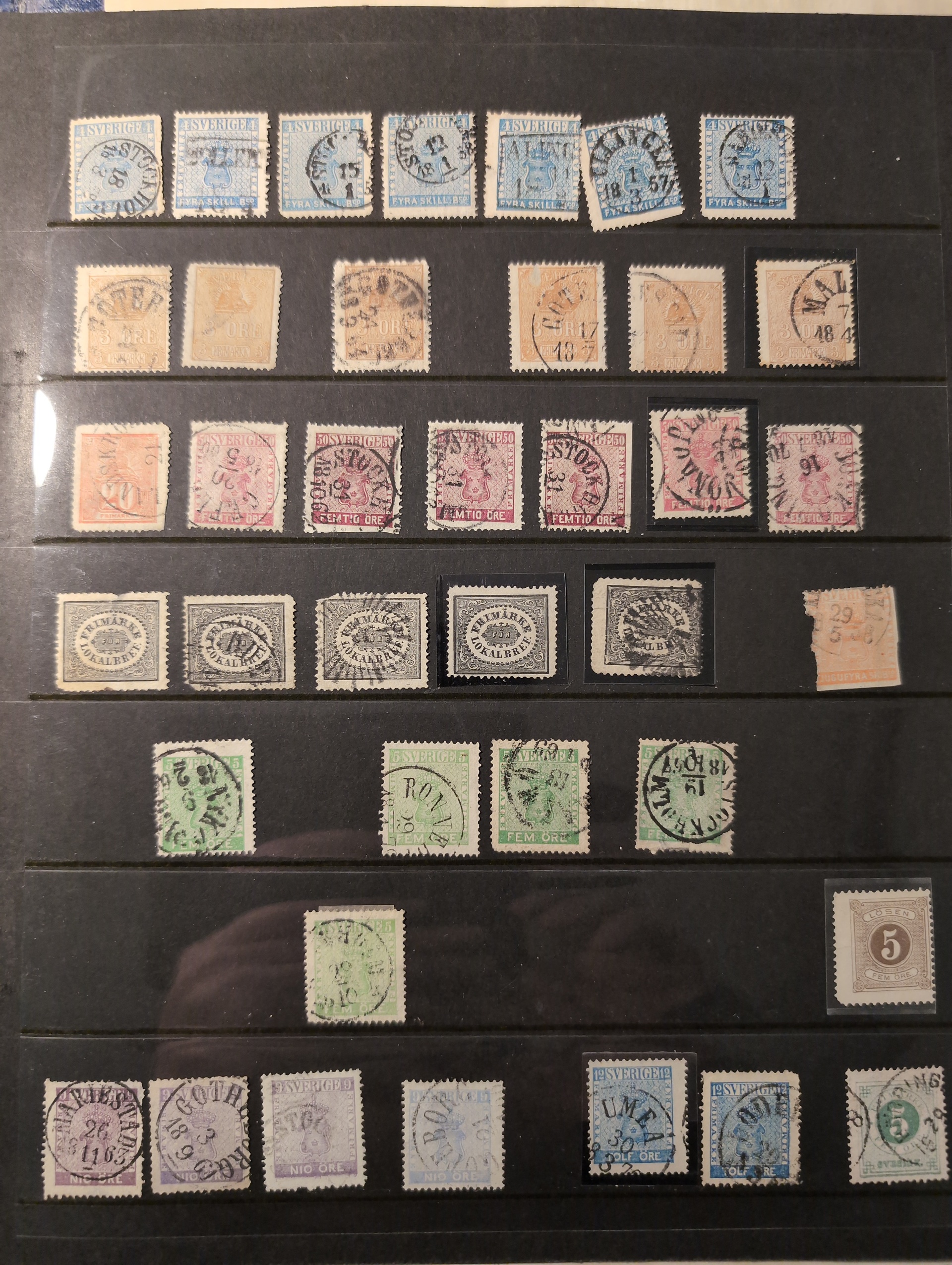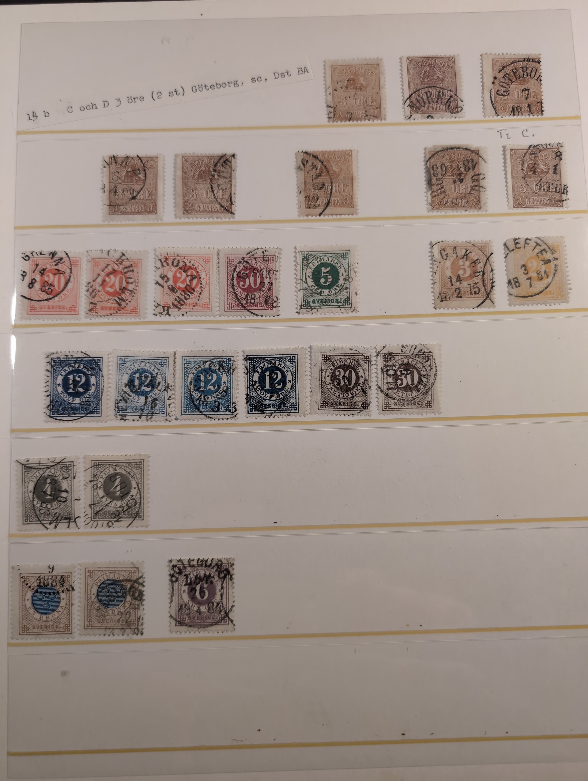Sweden. Accumulation mostly used 1855–1960s in box. Three albums and about 100 visir leaves with mostly older stamps, incl, some better but the quality is very mixed. Much Circle type stamps, unchecked by us. Please see a selection of scans at www.philea.se. Mixed quality. Approx. 8 kg. (1000s)
