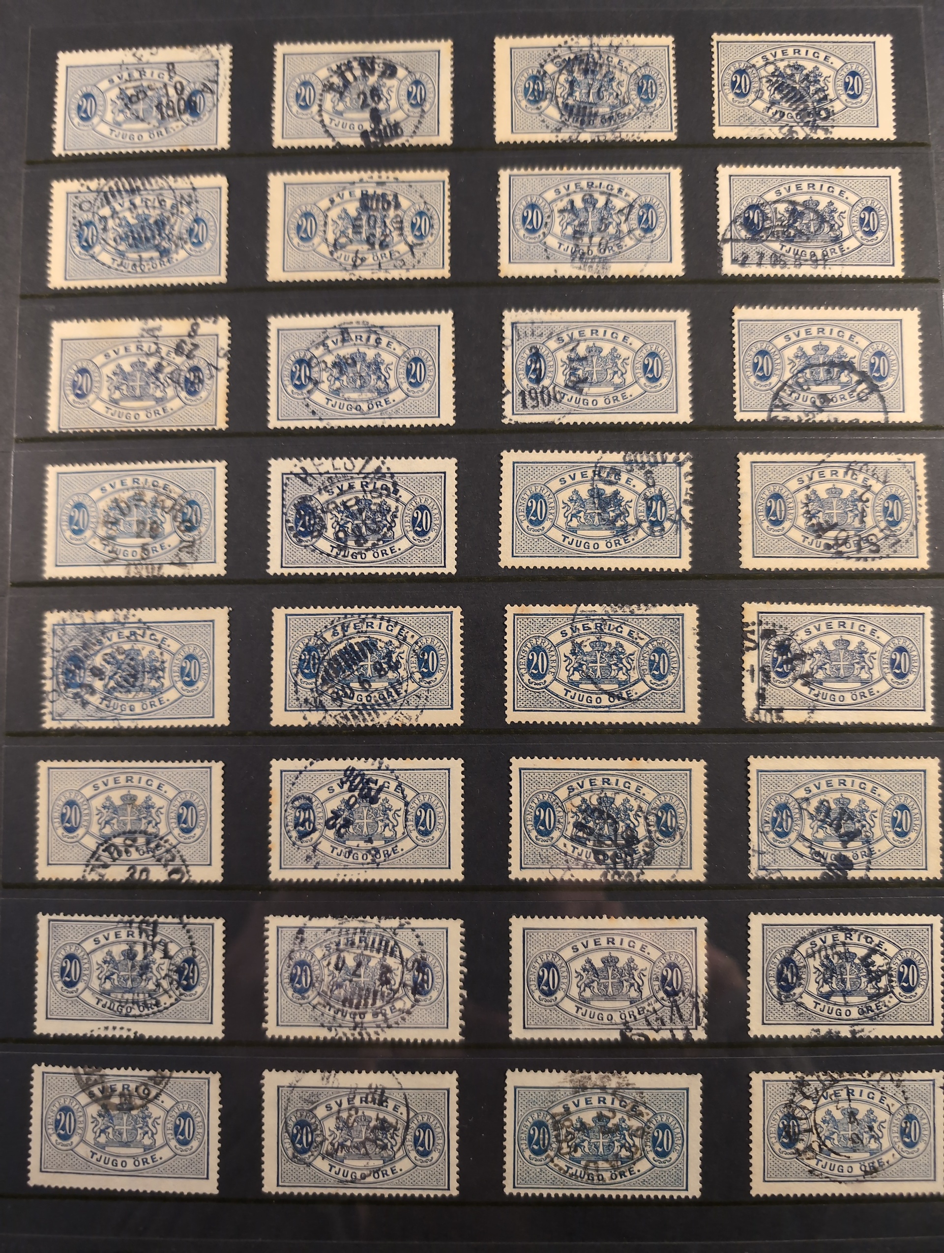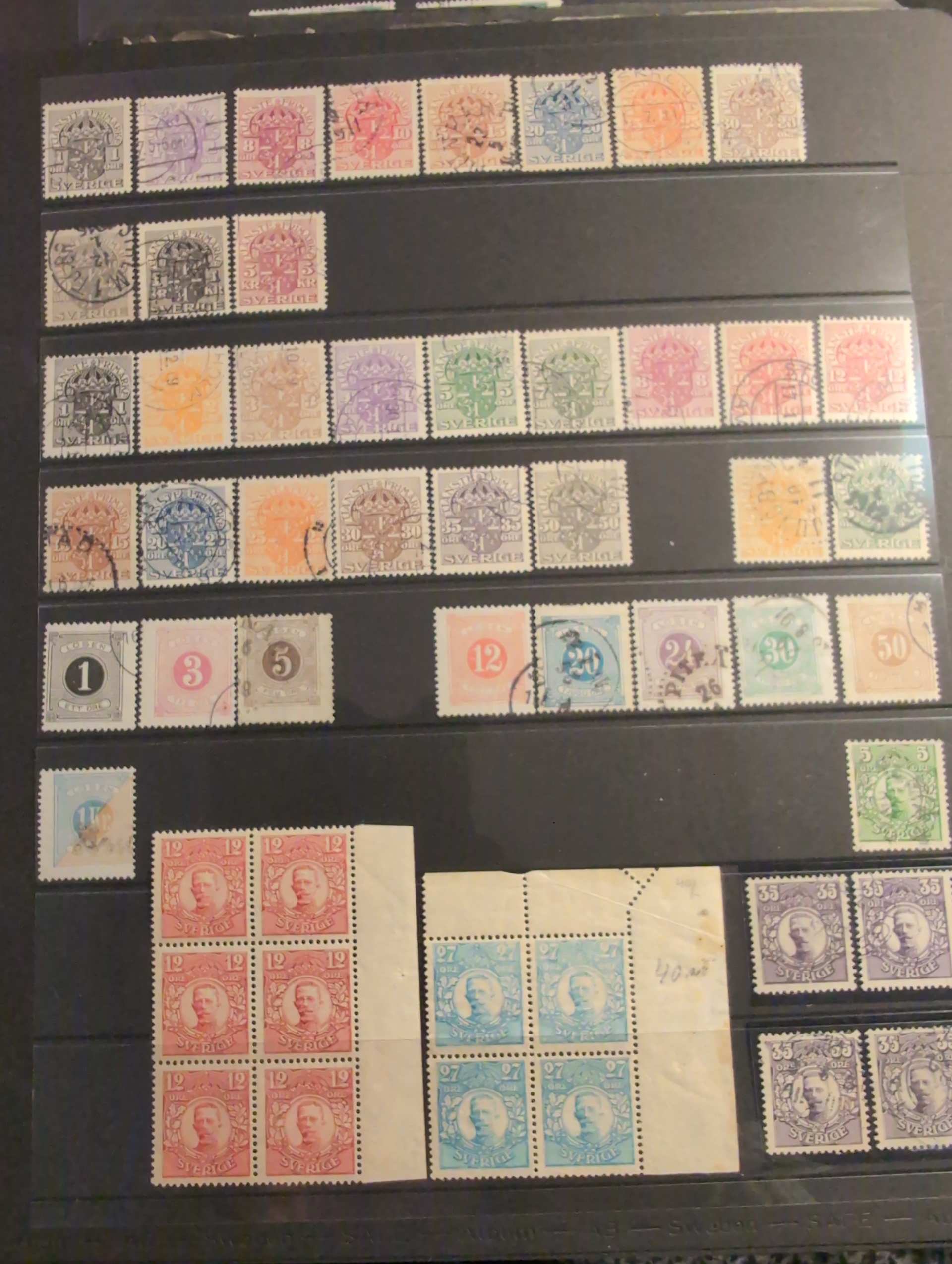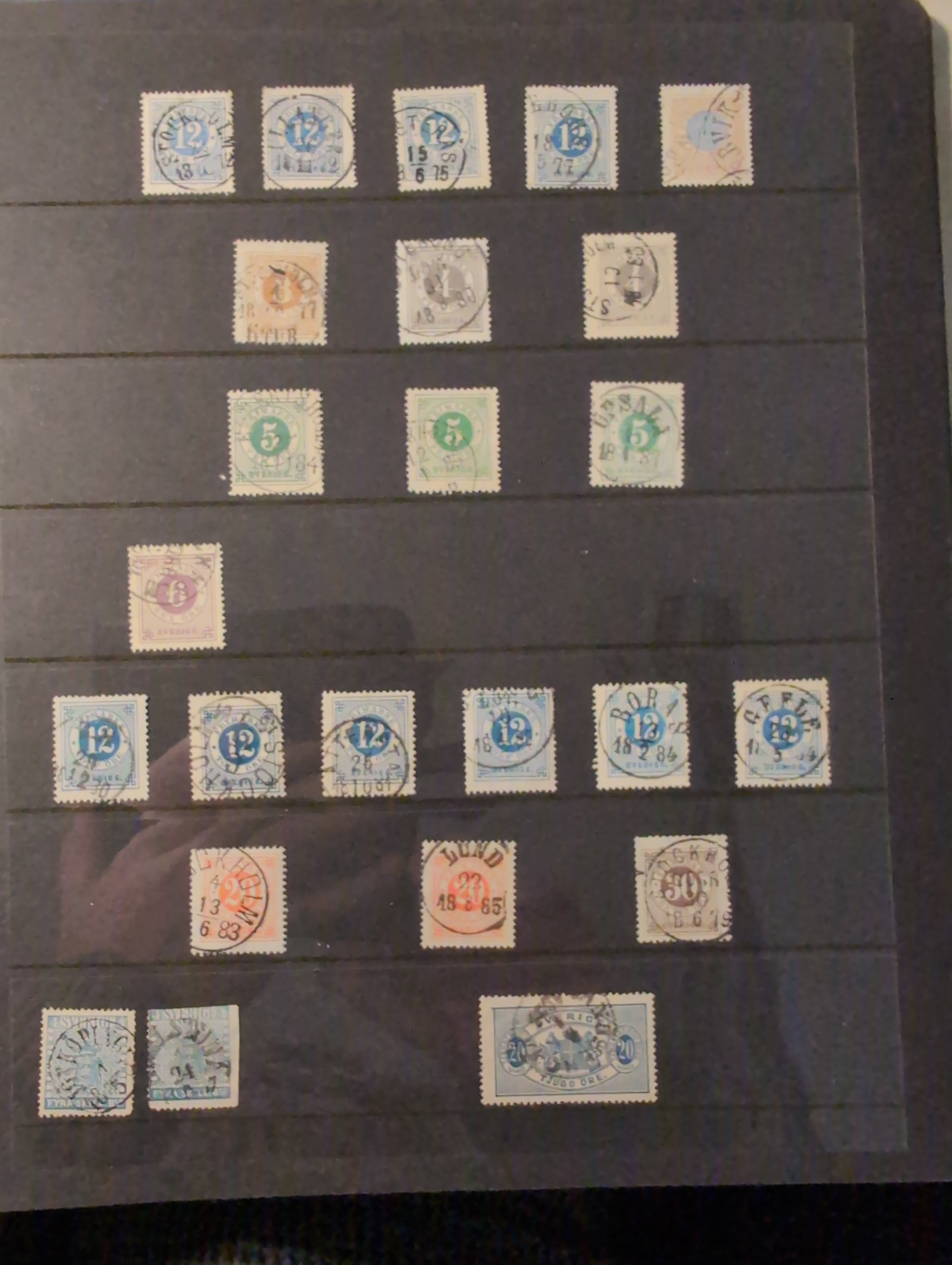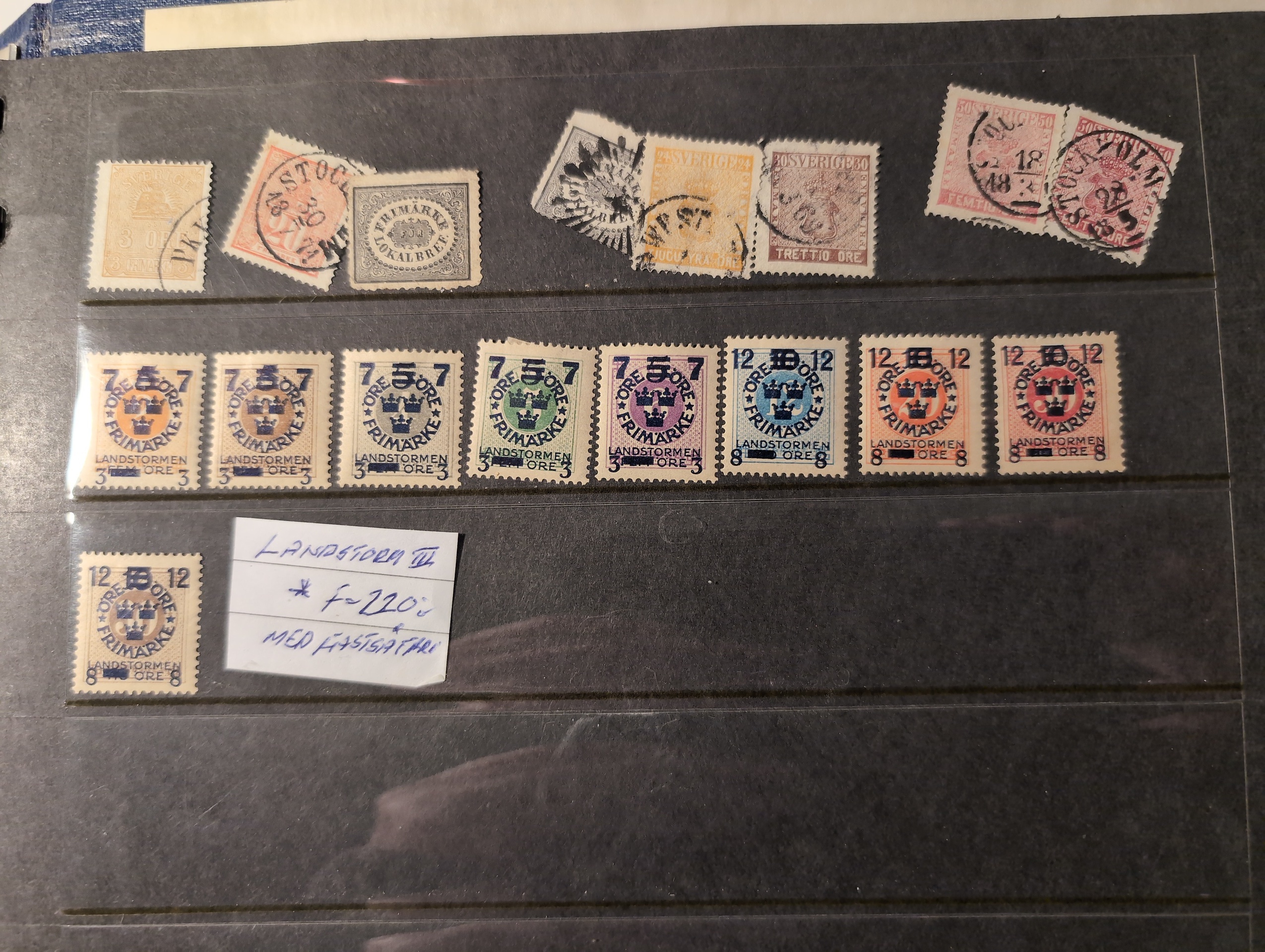 Sweden. Accumulation mostly used 1855–1960s in box. Three albums and about 100 visir leaves with mostly older stamps, incl, some better but the quality is very mixed. Much Circle type stamps, unchecked by us. Please see a selection of scans at www.philea.se. Mixed quality. Approx. 8 kg. (1000s)