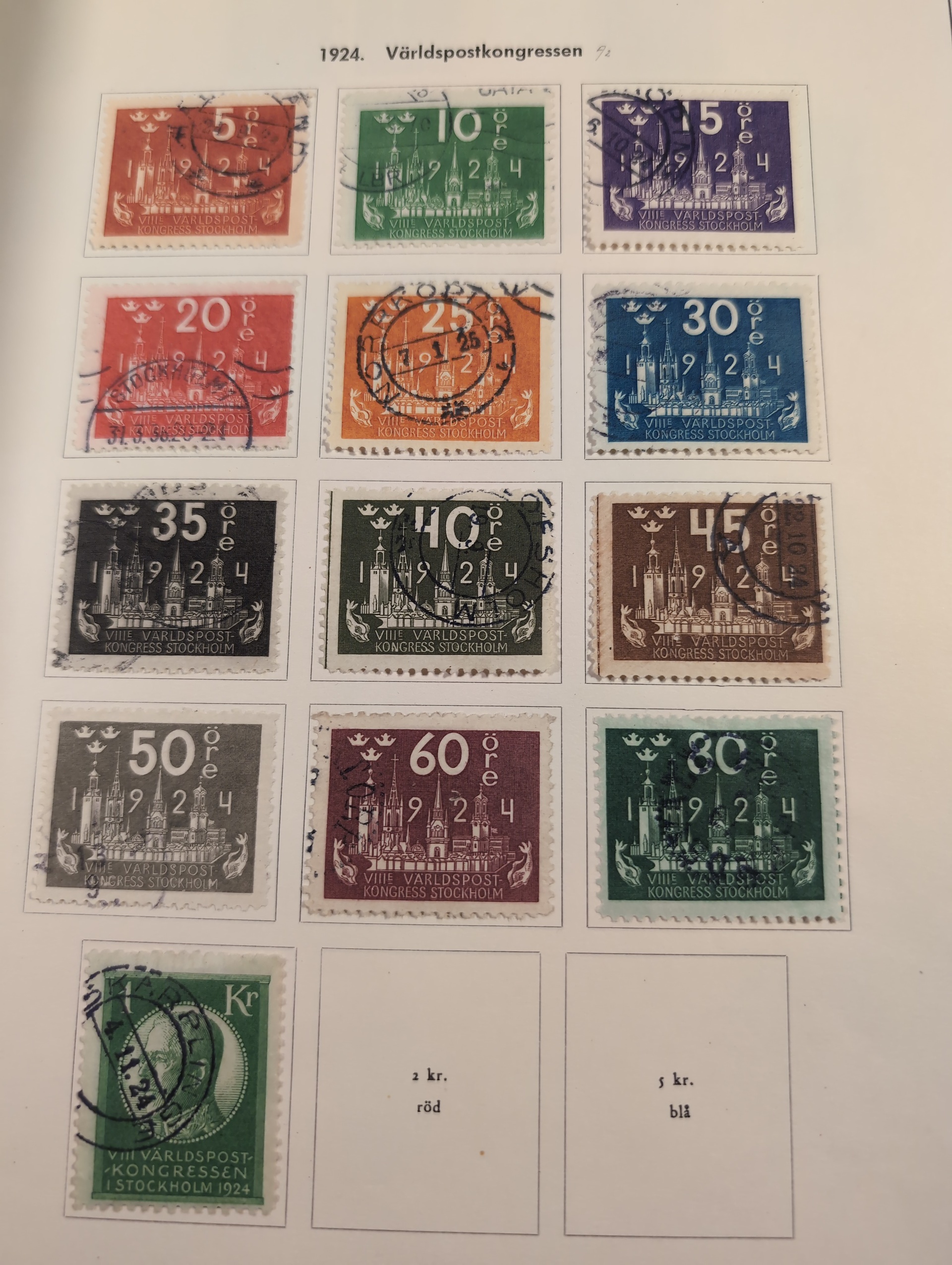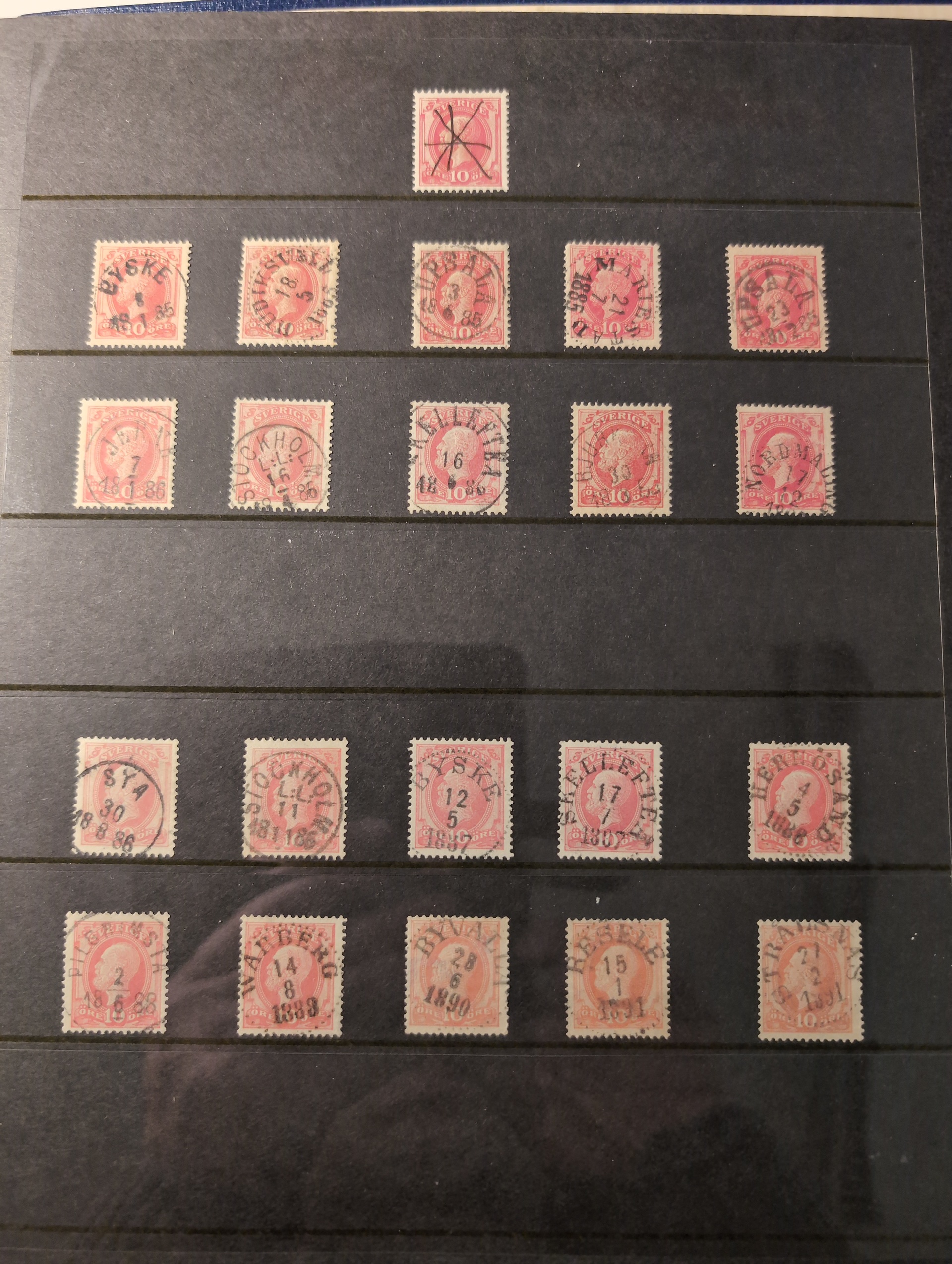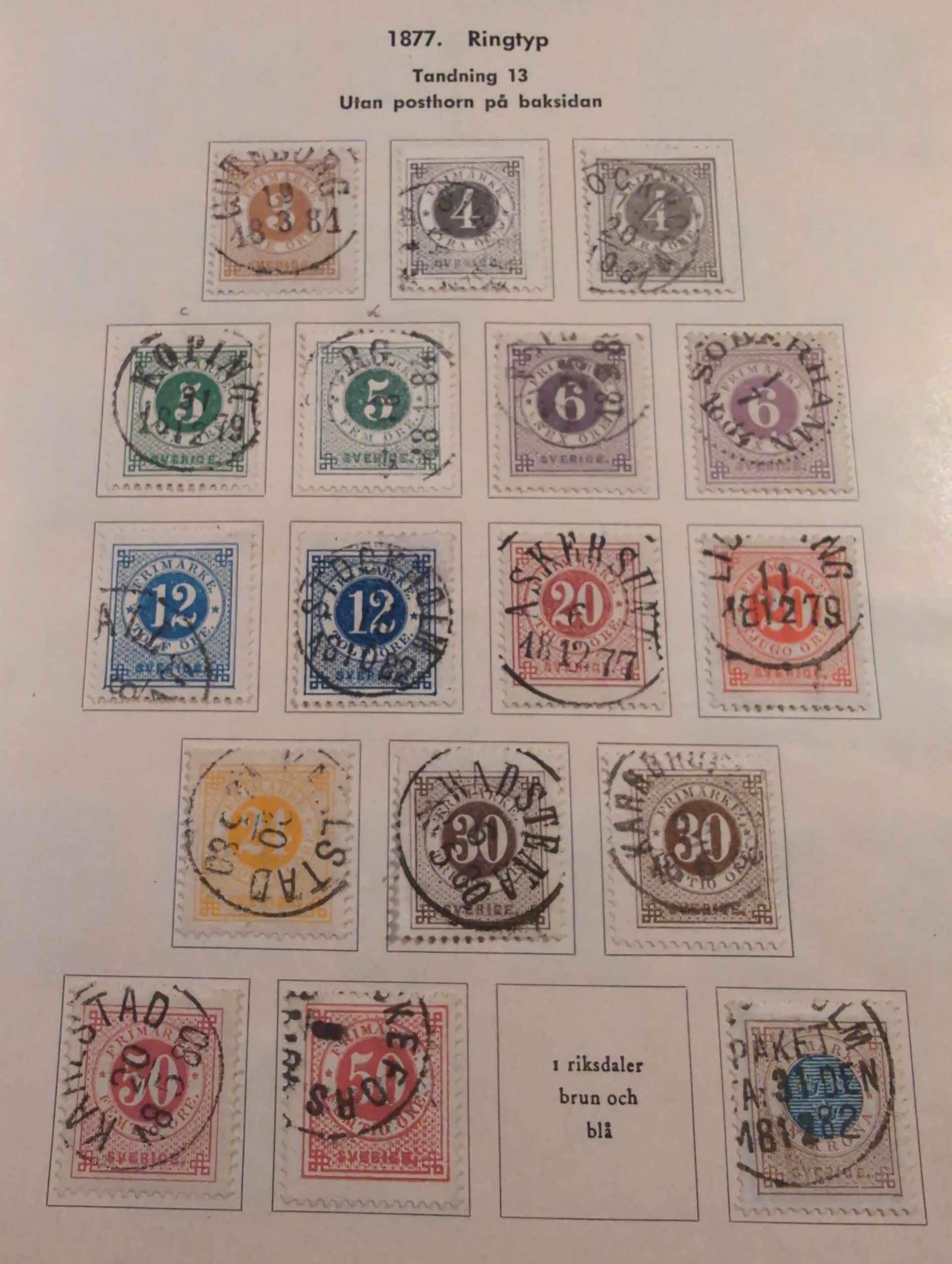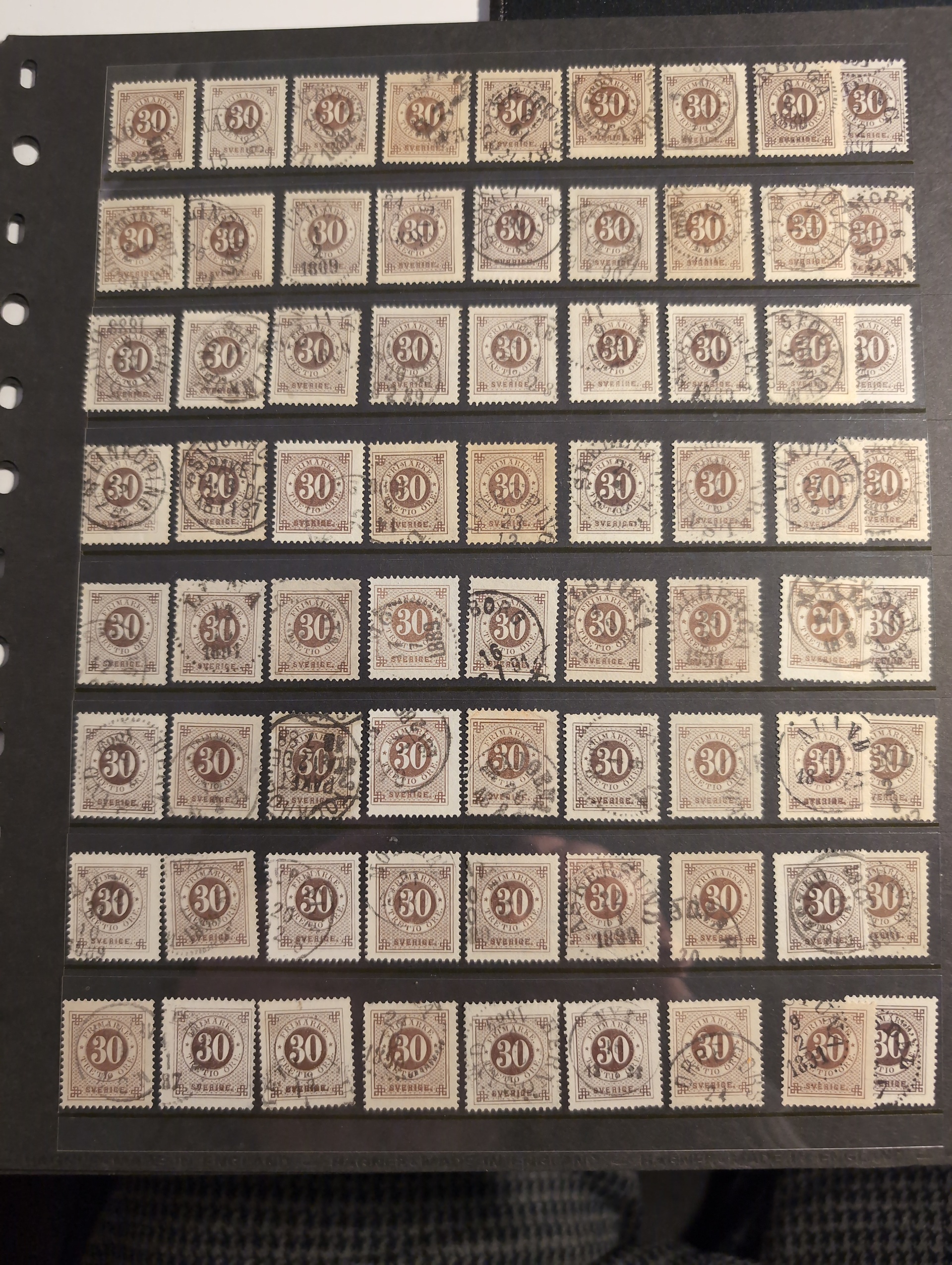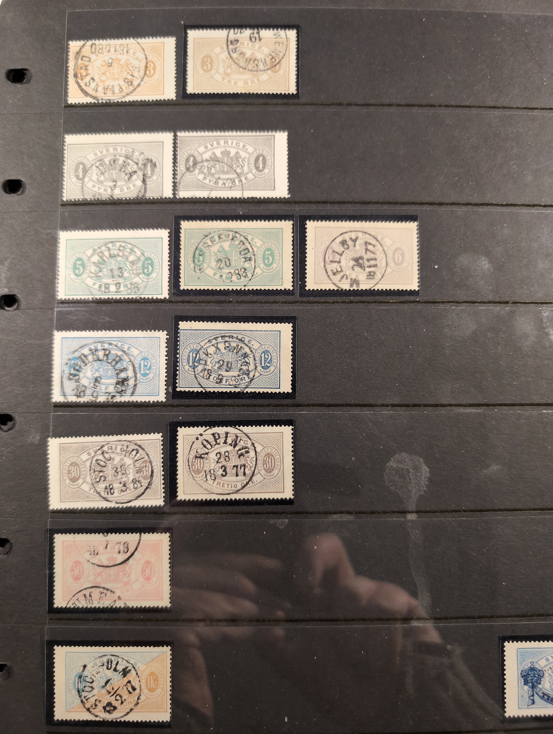 Sweden. Accumulation mostly used 1855–1960s in box. Three albums and about 100 visir leaves with mostly older stamps, incl, some better but the quality is very mixed. Much Circle type stamps, unchecked by us. Please see a selection of scans at www.philea.se. Mixed quality. Approx. 8 kg. (1000s)