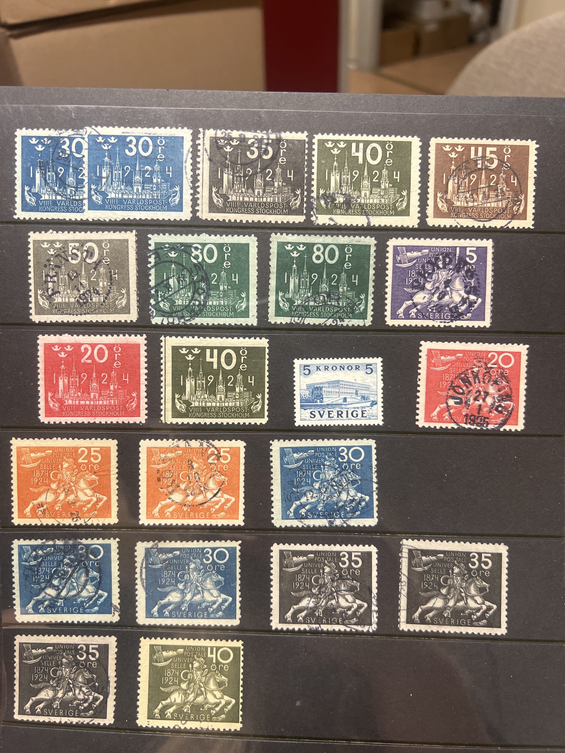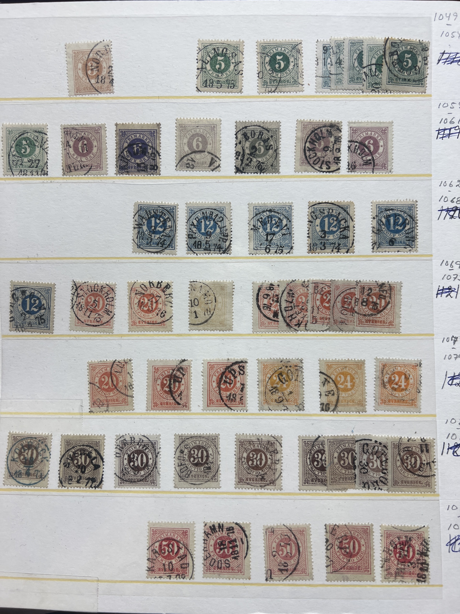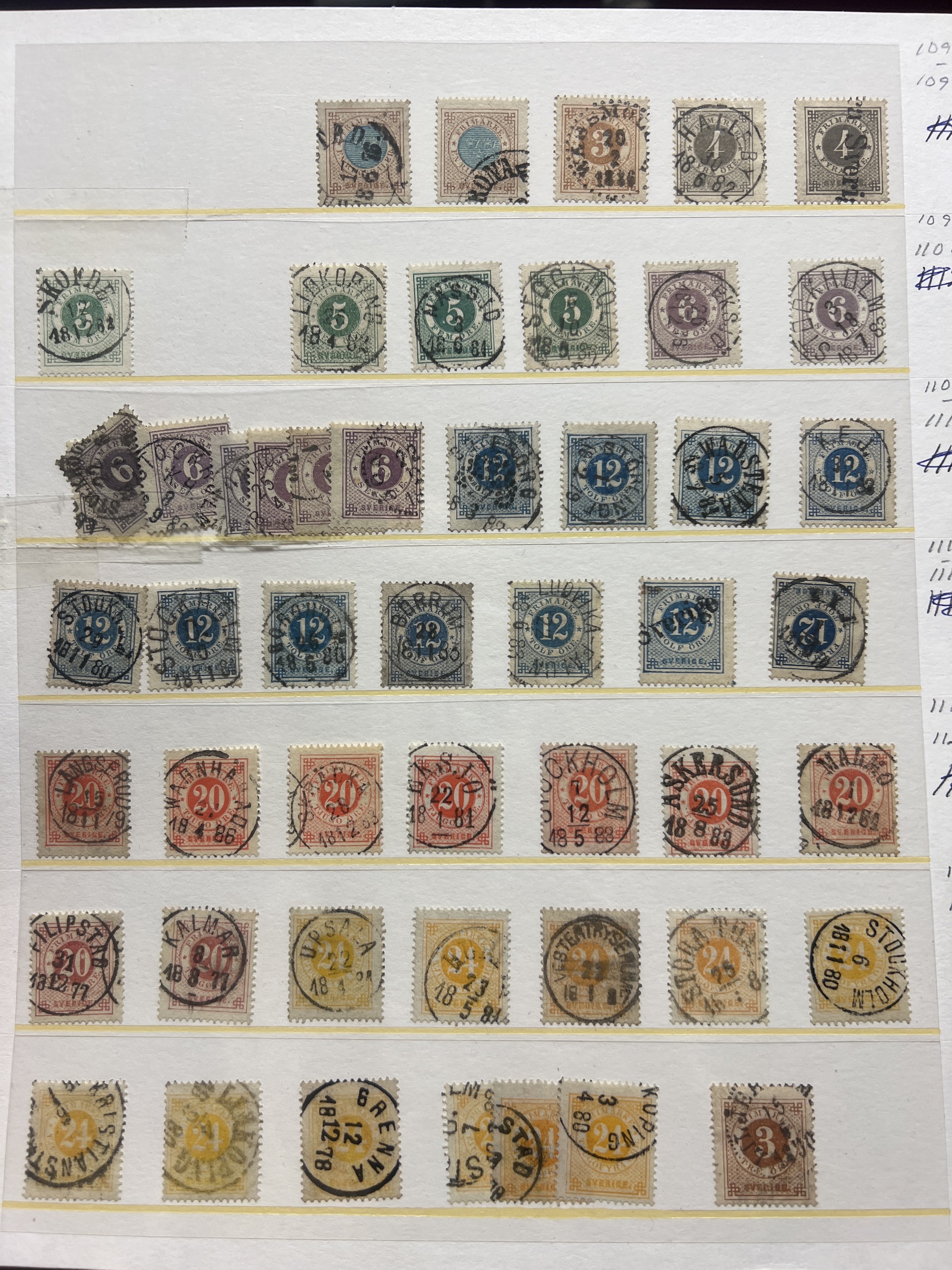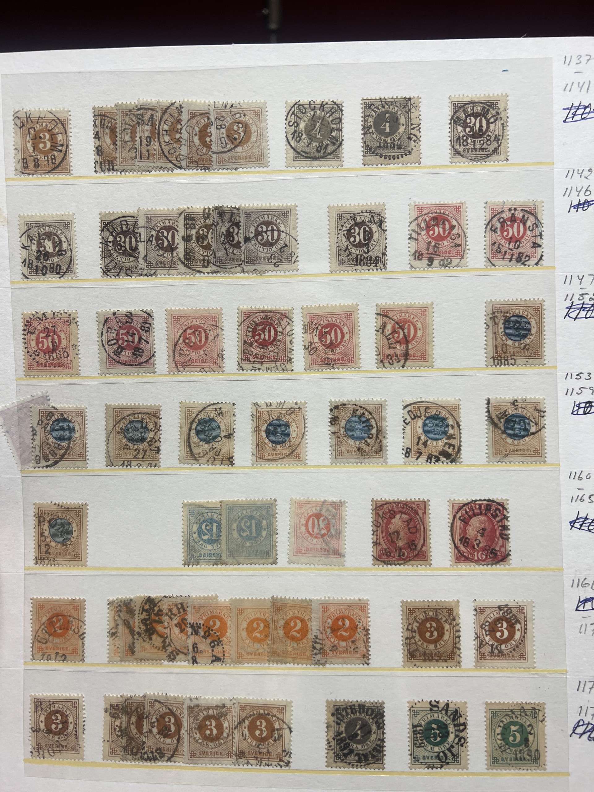 Sweden. Accumulation ★★/★/⊙ 1858–1950s on visir leaves. Interesting lot with mint coil stamps, coat-of-arms and circle types with nice cancels, some booklets, etc. Low reserve. Please see a selection of scans at www.philea.se. Somewhat mixed quality. (400)