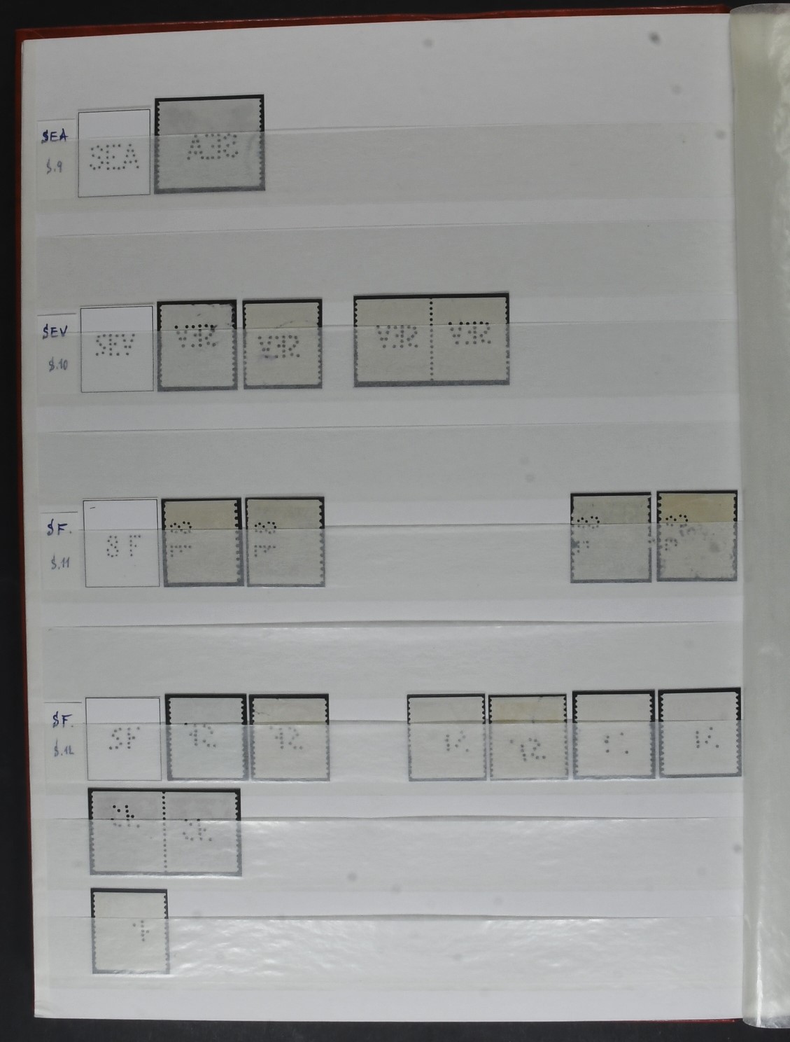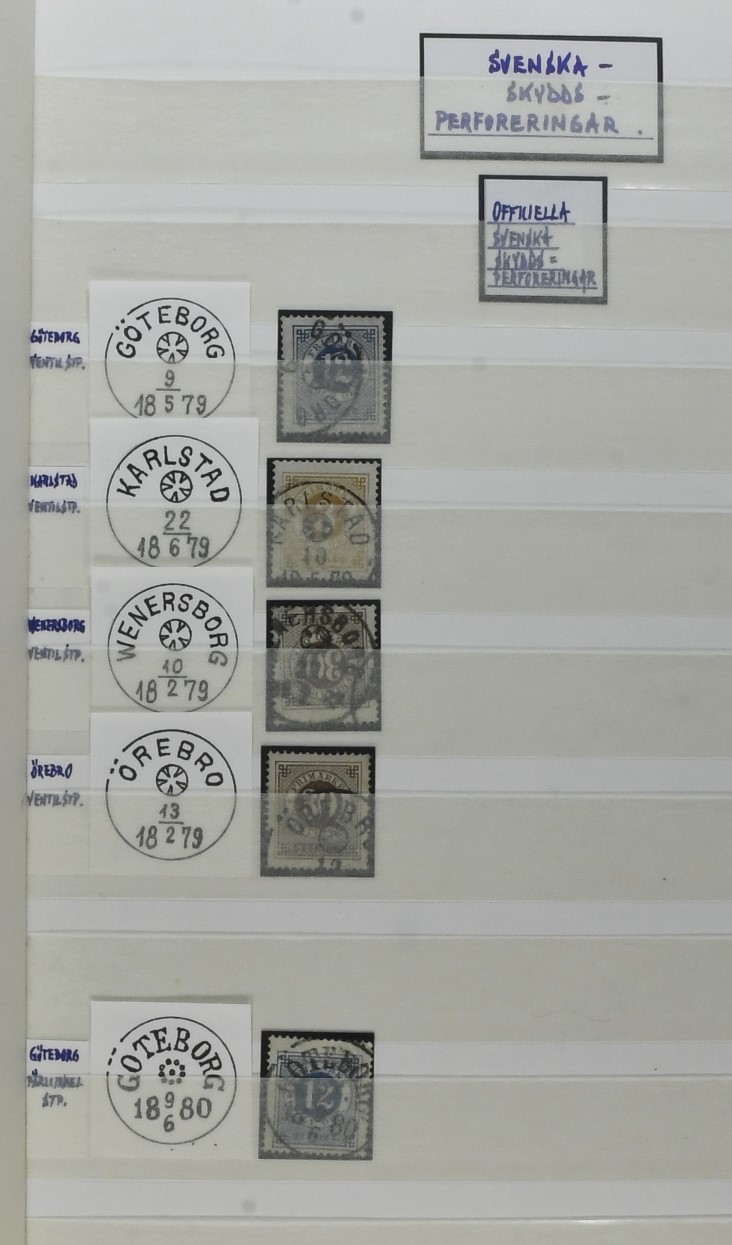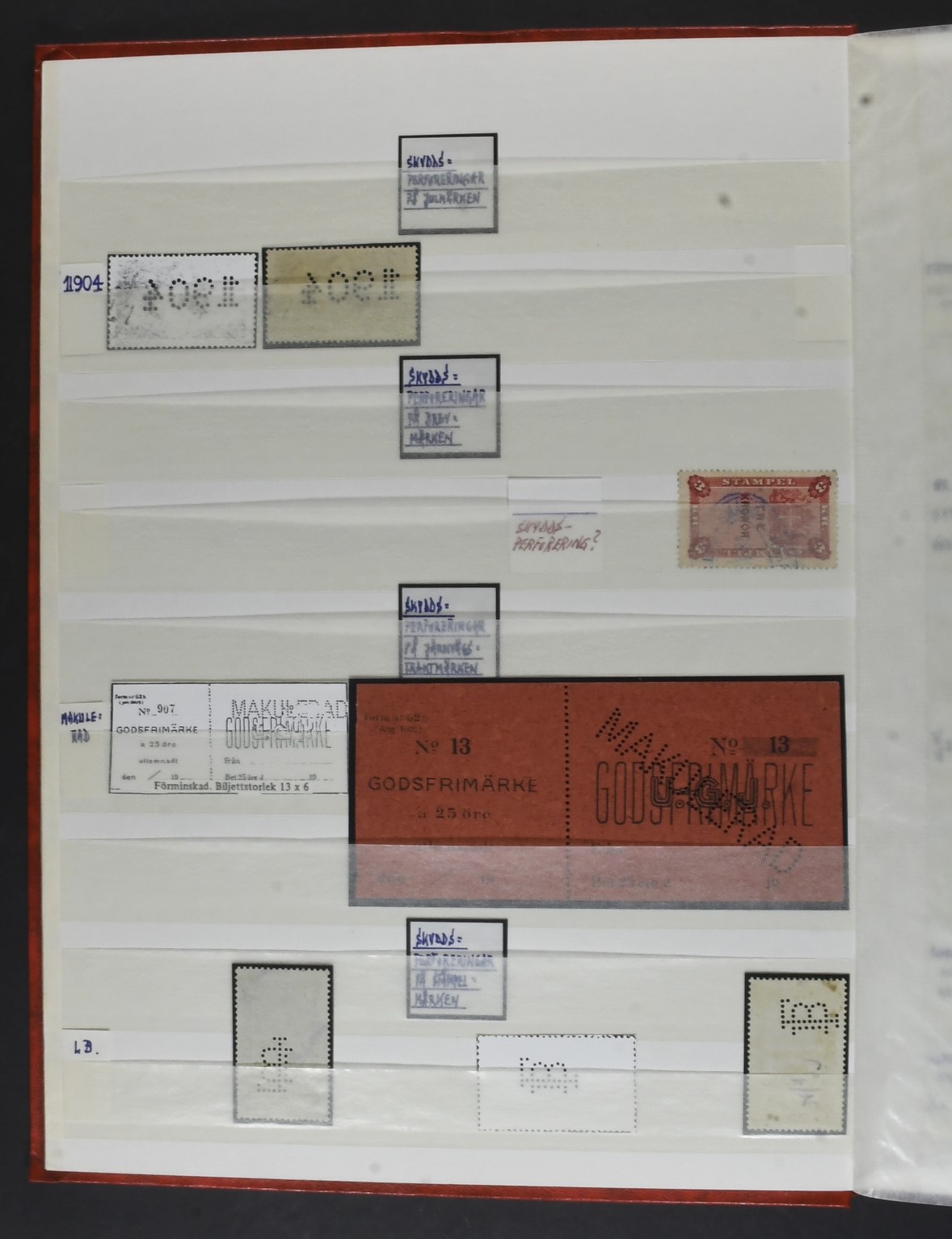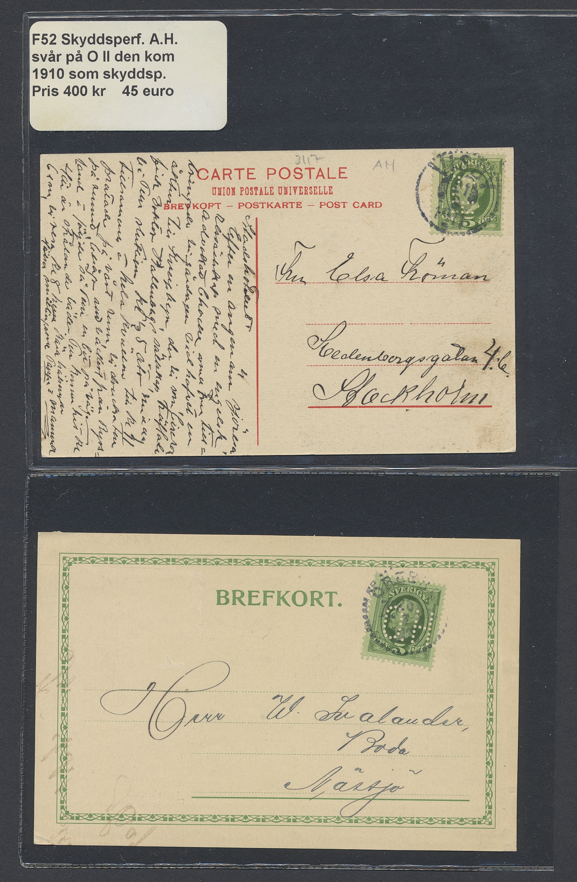 Sweden. Perfins, collection in two stockbooks. Very extensive contaning 170 different types. Only 14 missing according to a former description. About 2500 in total, all neatly presented. Some scans are presented at www.philea.se. (2500)