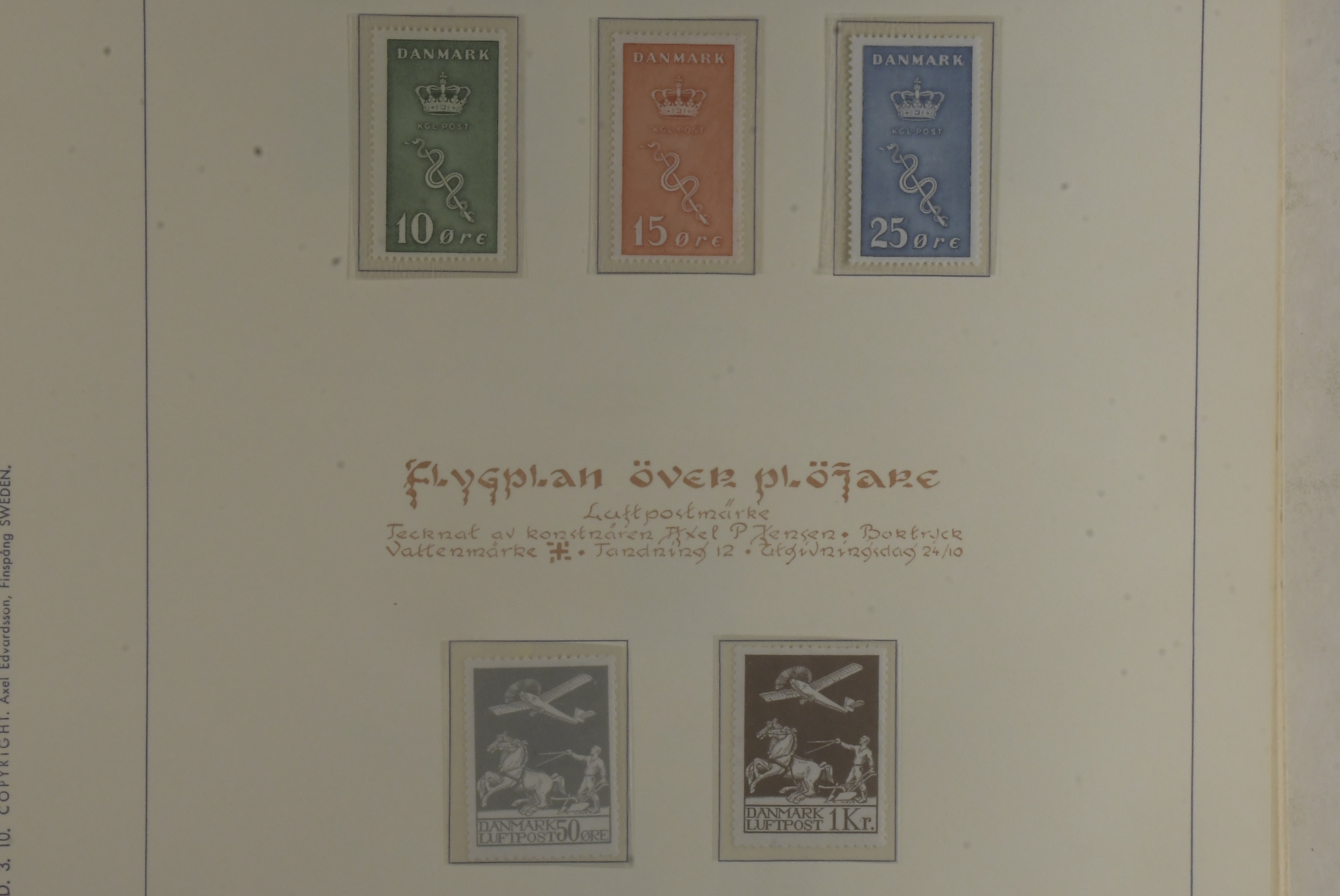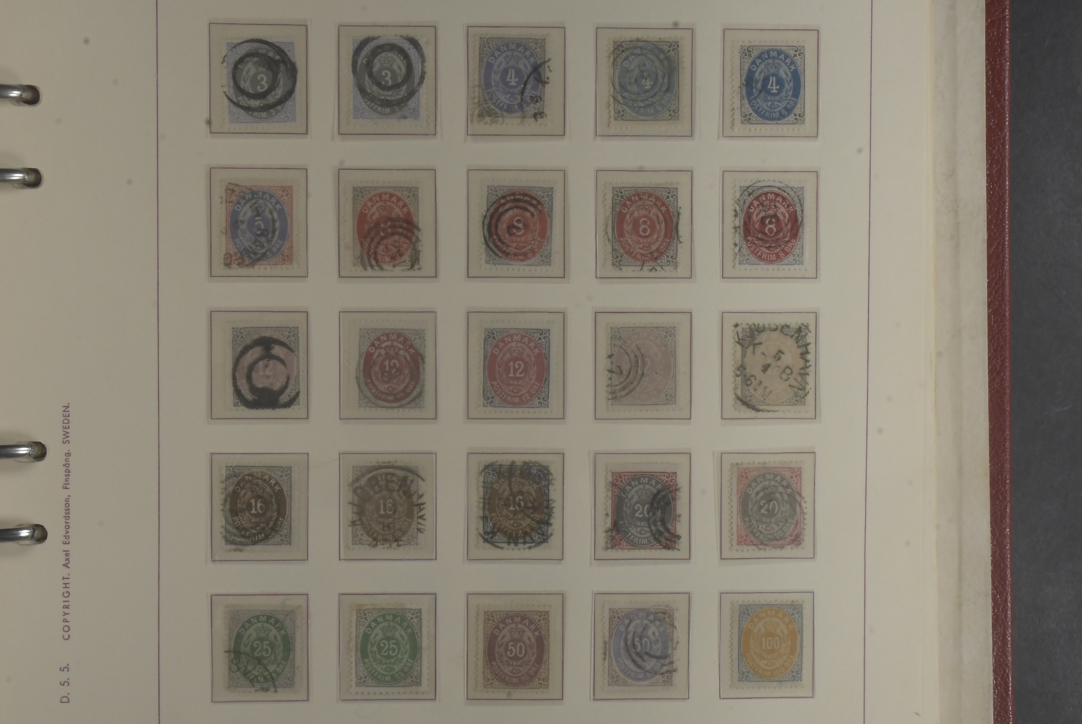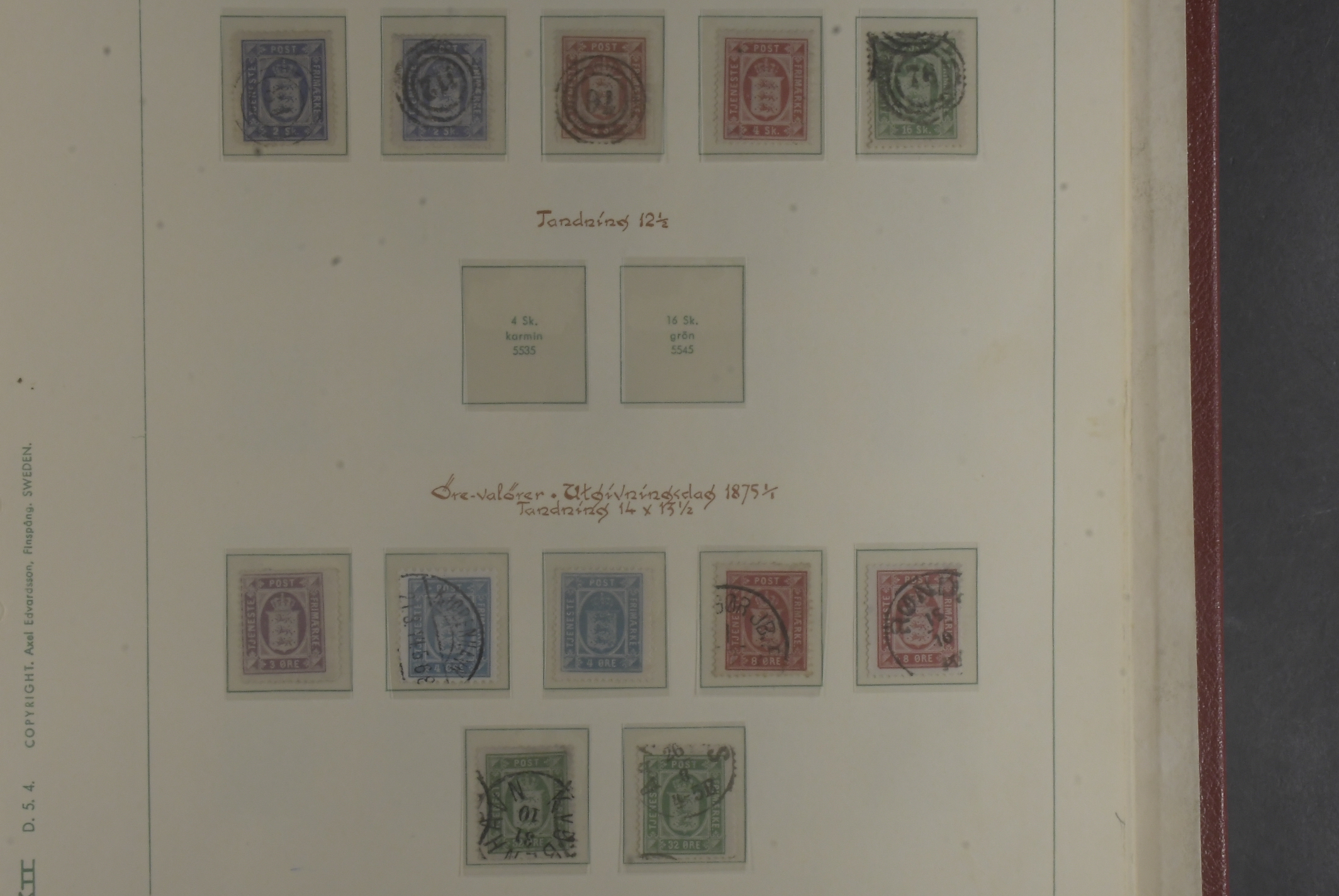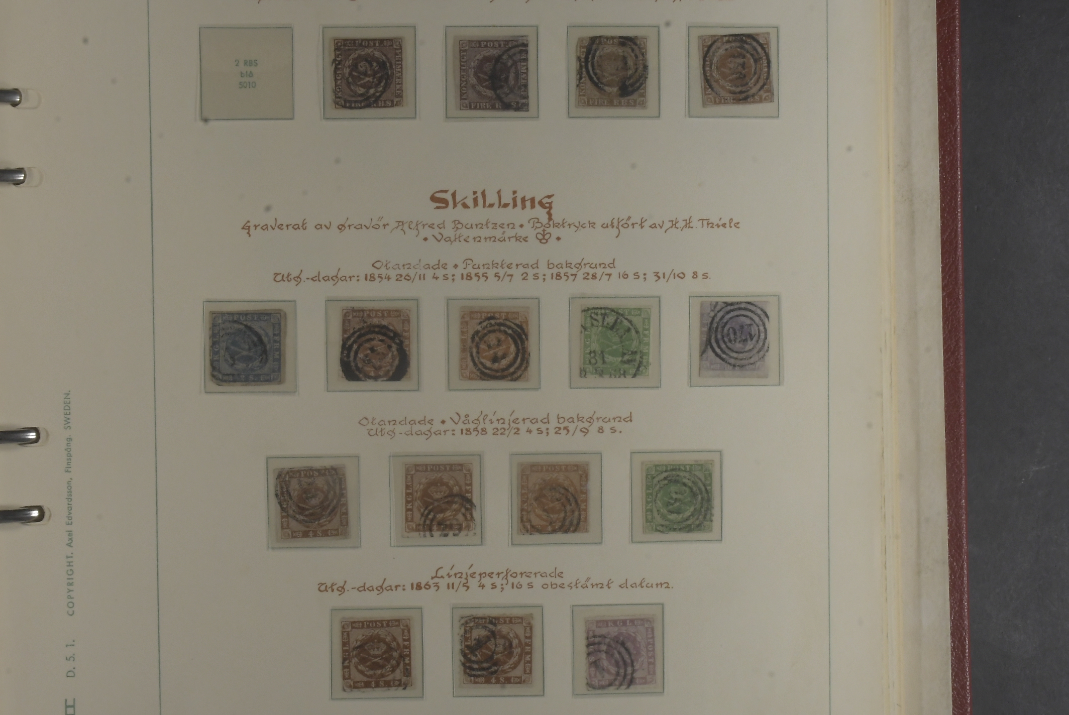 Denmark. Collection ★★/★/⊙ 1851–1969 in Estett album with stamp mounts. Well filled collection with 39 skilling values incl. a very nice 16 s rouletted and 48 s×2, good section of bi-colored incl. some mint and inverted frames. From 1900 more mixed mint and used with both G.P.O used plenty of the overprints and a mint set of the first air mails. Postfarge incl. 50 o 1919, Schleswig mint and 1.zone set mnh. GREENLAND with seven pakke porto stamps. Please see a selection of scans at www.philea.se. Mostly fine quality. (ca. 400)