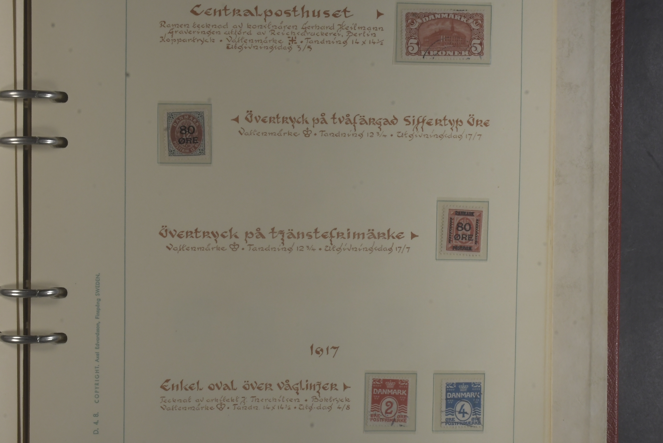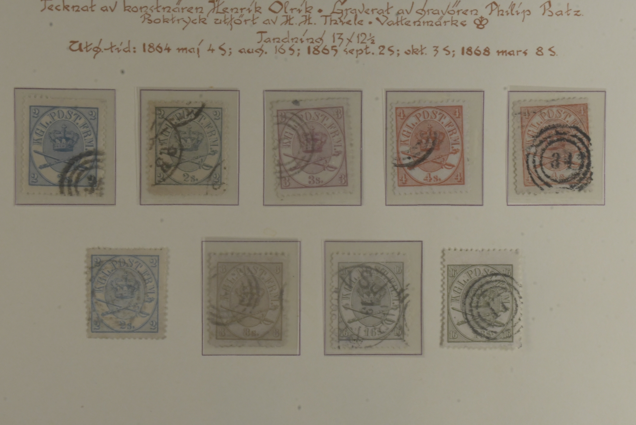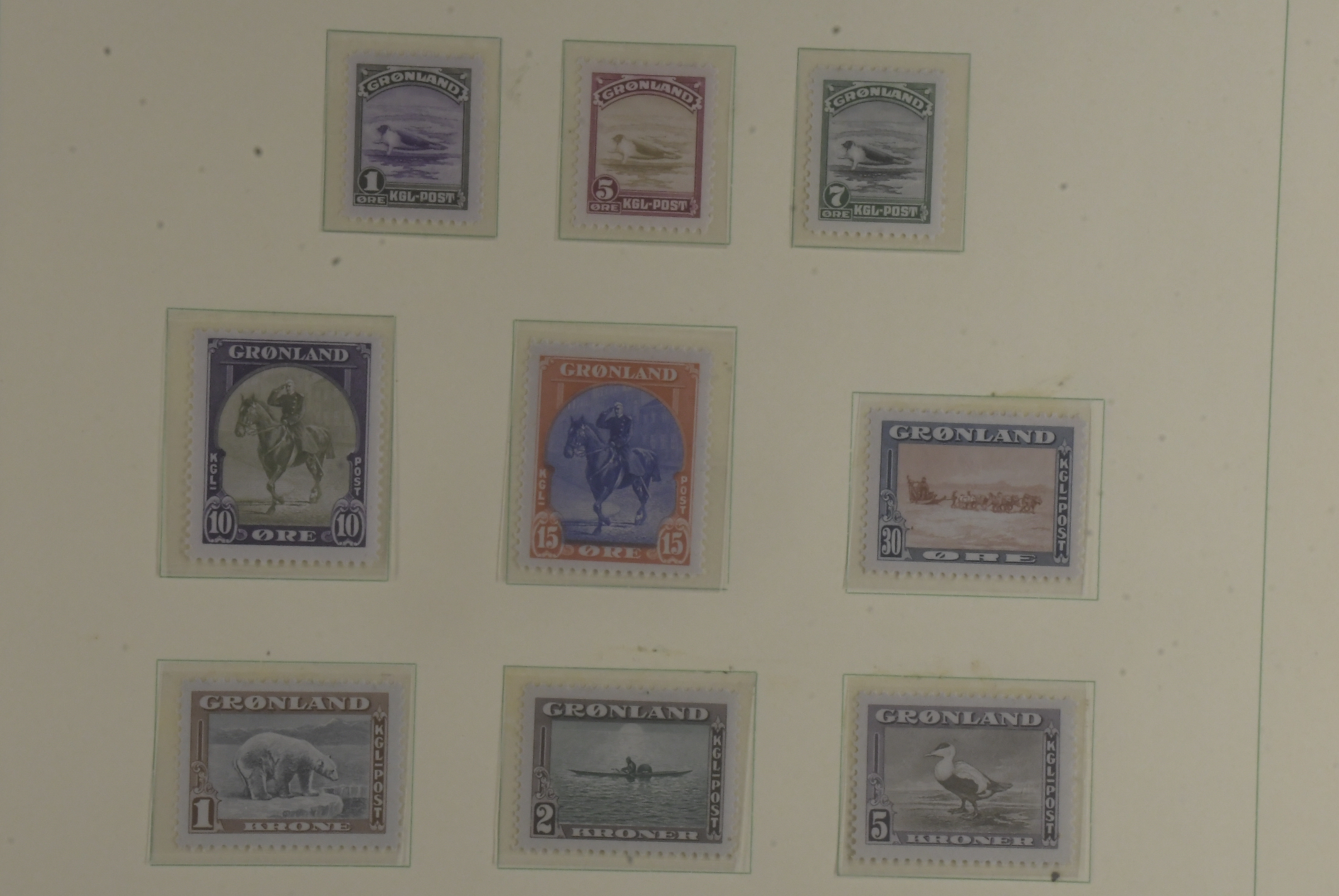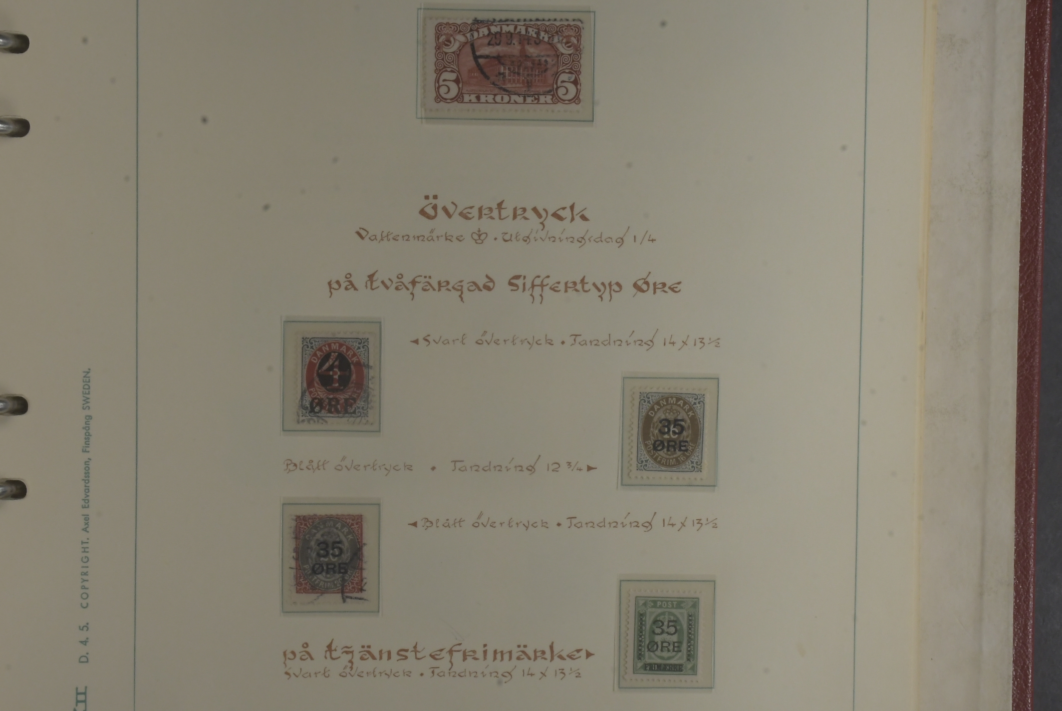 Denmark. Collection ★★/★/⊙ 1851–1969 in Estett album with stamp mounts. Well filled collection with 39 skilling values incl. a very nice 16 s rouletted and 48 s×2, good section of bi-colored incl. some mint and inverted frames. From 1900 more mixed mint and used with both G.P.O used plenty of the overprints and a mint set of the first air mails. Postfarge incl. 50 o 1919, Schleswig mint and 1.zone set mnh. GREENLAND with seven pakke porto stamps. Please see a selection of scans at www.philea.se. Mostly fine quality. (ca. 400)