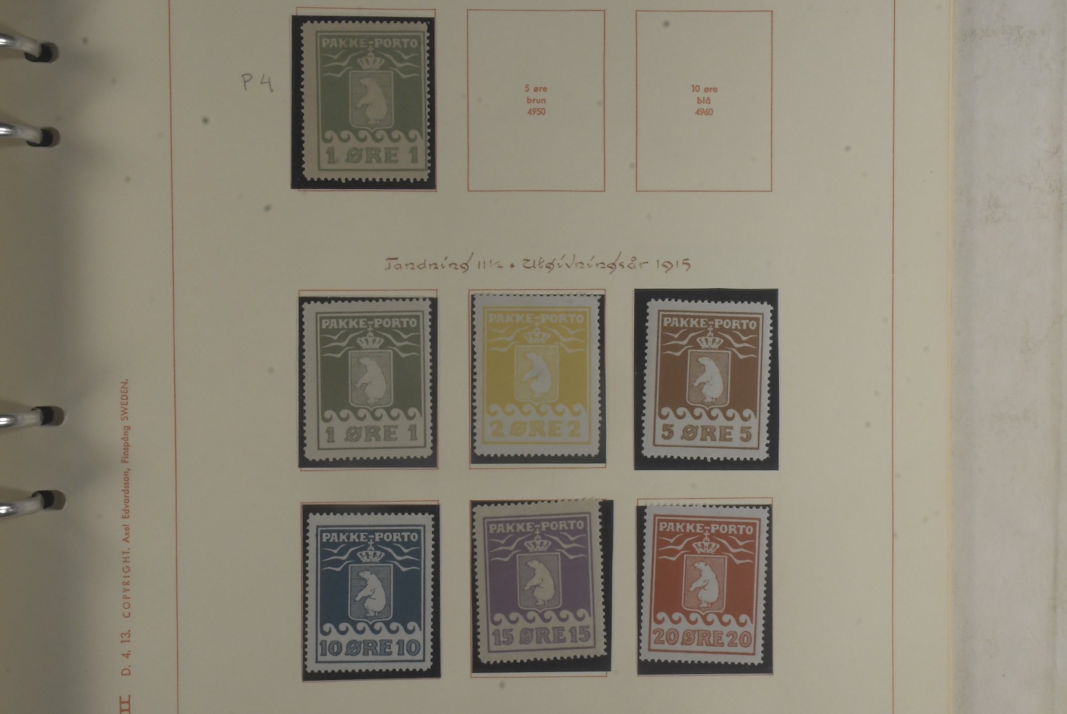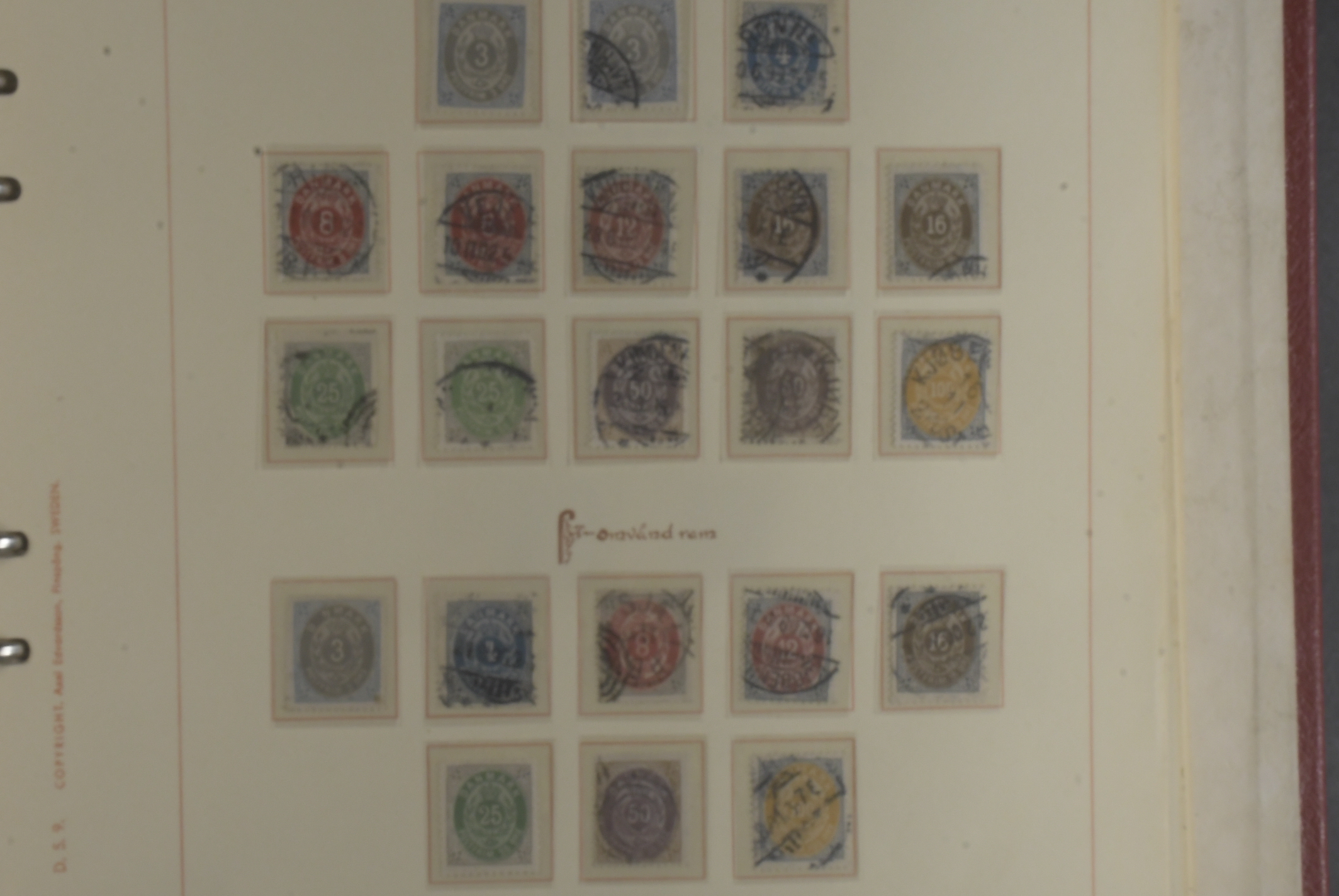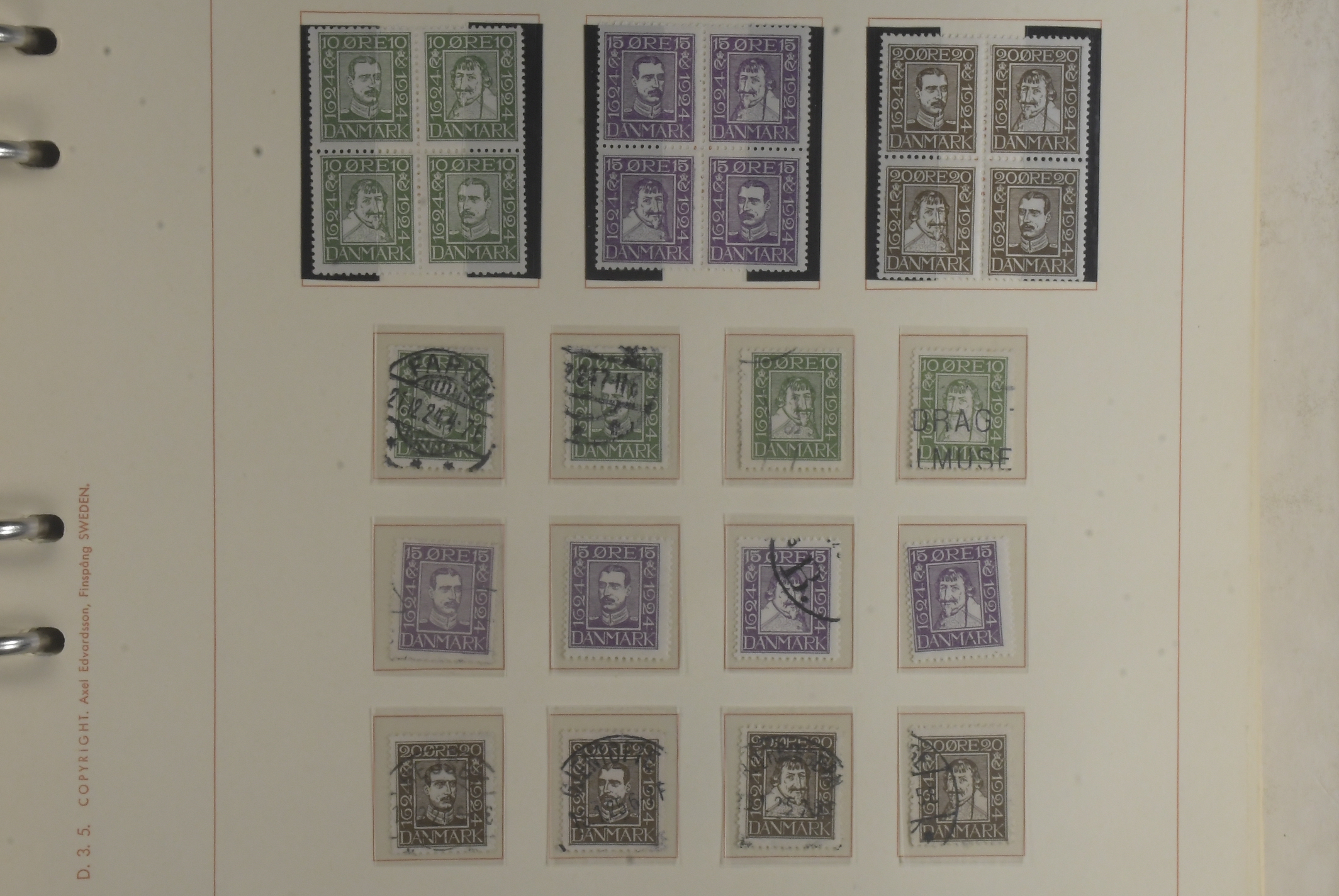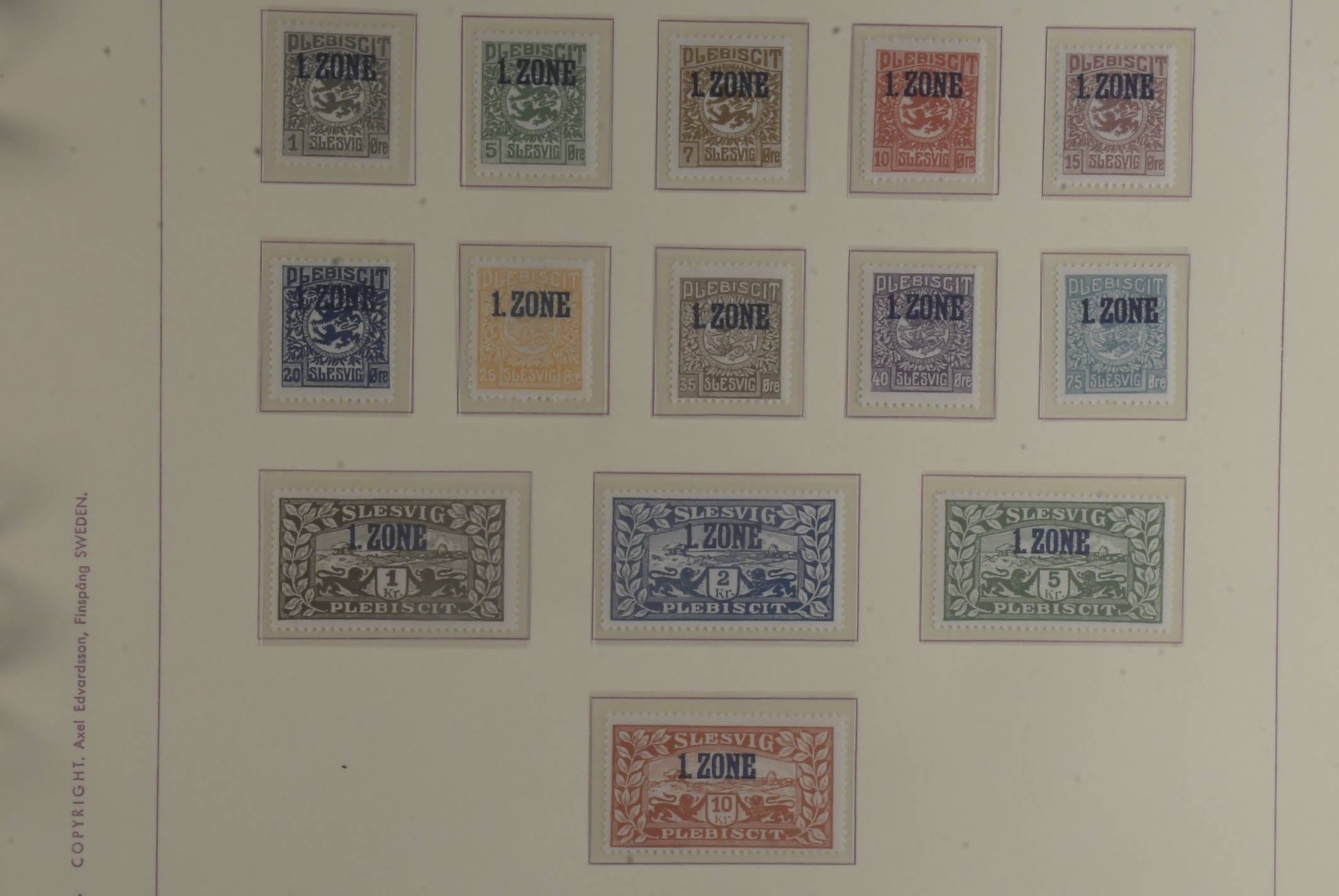 Denmark. Collection ★★/★/⊙ 1851–1969 in Estett album with stamp mounts. Well filled collection with 39 skilling values incl. a very nice 16 s rouletted and 48 s×2, good section of bi-colored incl. some mint and inverted frames. From 1900 more mixed mint and used with both G.P.O used plenty of the overprints and a mint set of the first air mails. Postfarge incl. 50 o 1919, Schleswig mint and 1.zone set mnh. GREENLAND with seven pakke porto stamps. Please see a selection of scans at www.philea.se. Mostly fine quality. (ca. 400)