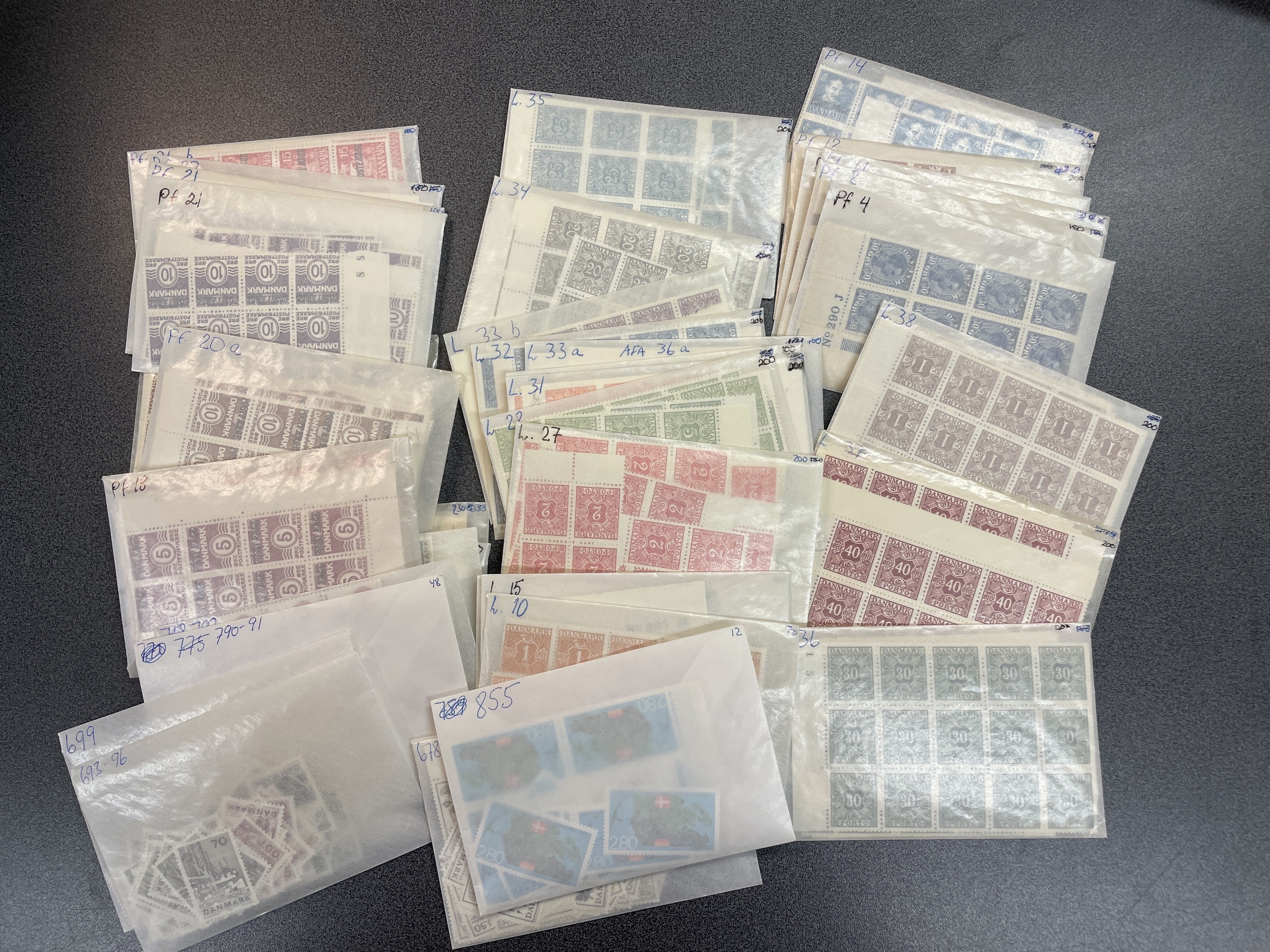 Denmark. ★★. Box with thousands of stamps from Facit 46 to 855, all in envelopes marked with Facit No. Almost all with heavy duplication and several better noted with catalogue value over 200 SEK up to about 1000. E.g. F 117a x 40, and a lot more to be found here!