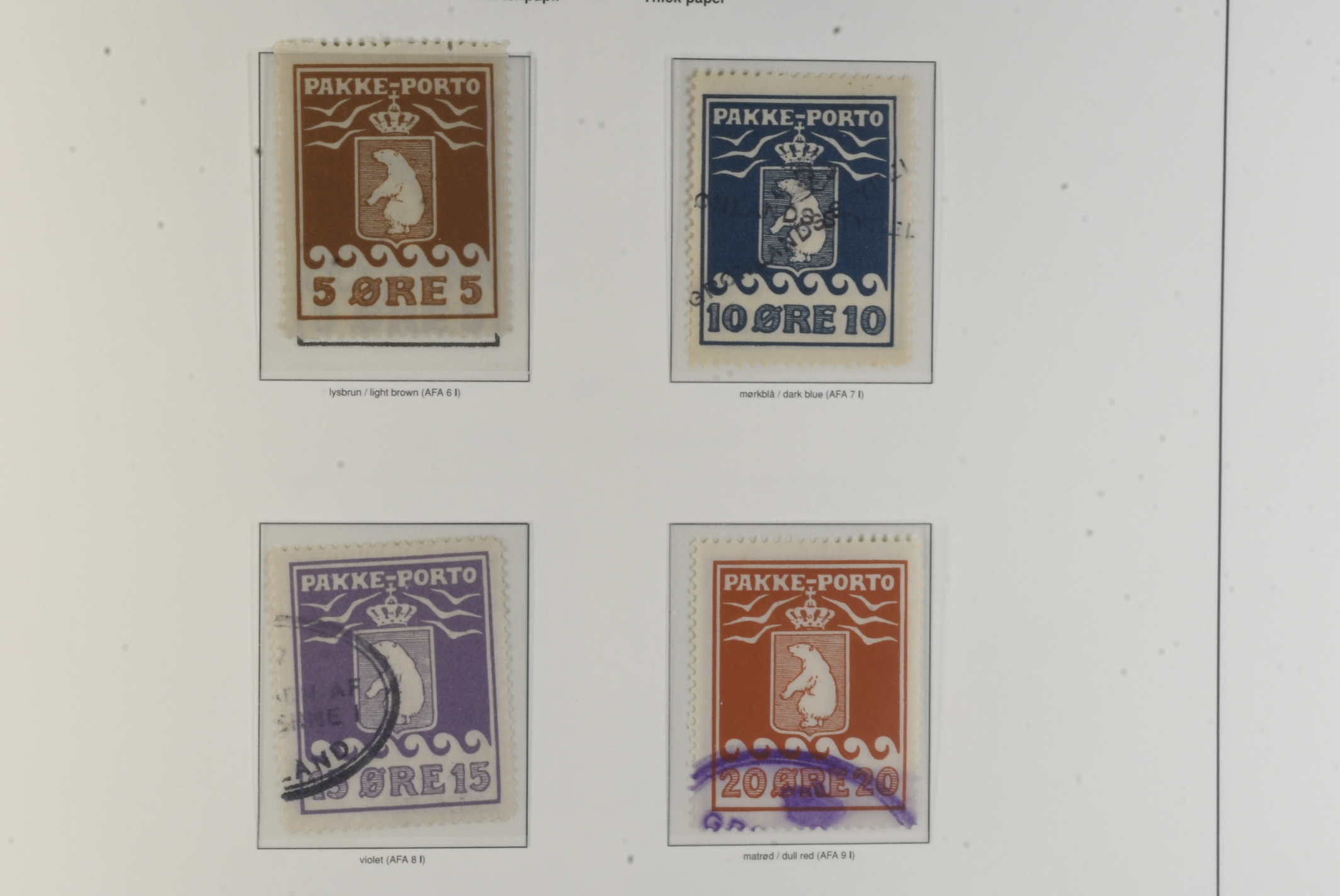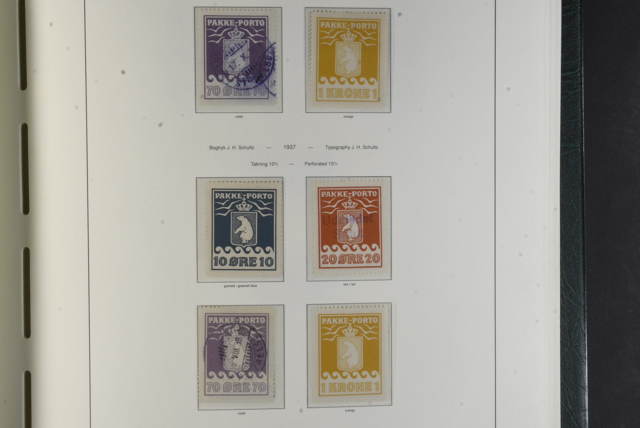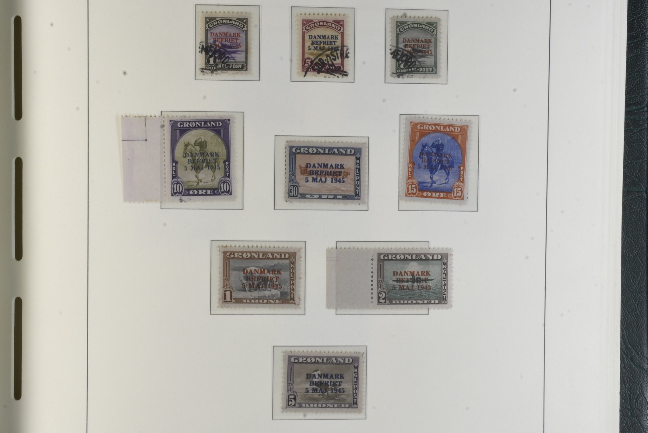 Greenland. Collection ★★/★/⊙ 1905–2003 in Leuchtturm album with stamp mounts. Very well filled with complete Pakke-Porto, 'Danmark Befriet' mint and wrong overprint colours NH. Later issues with high completion with mostly NH but some used or hinged are mixed in. Beware P2 have a strong fold. Low reserve. Viewing is recommended. Please see a selection of scans at www.philea.se. Mostly good quality. (400+)