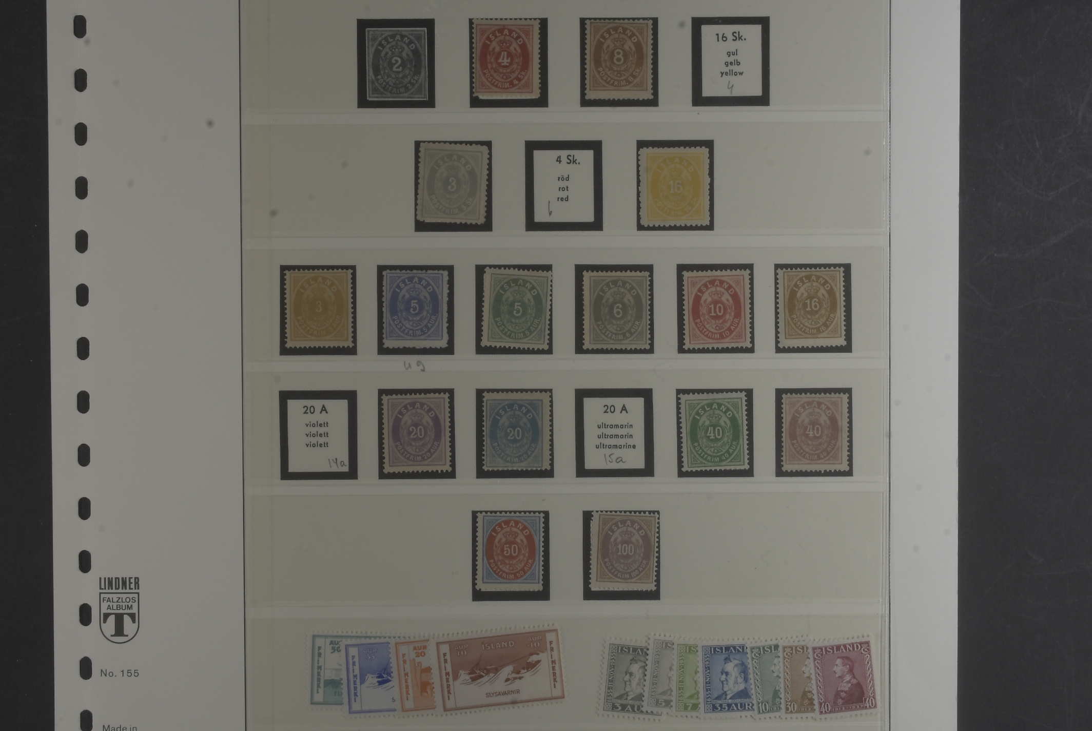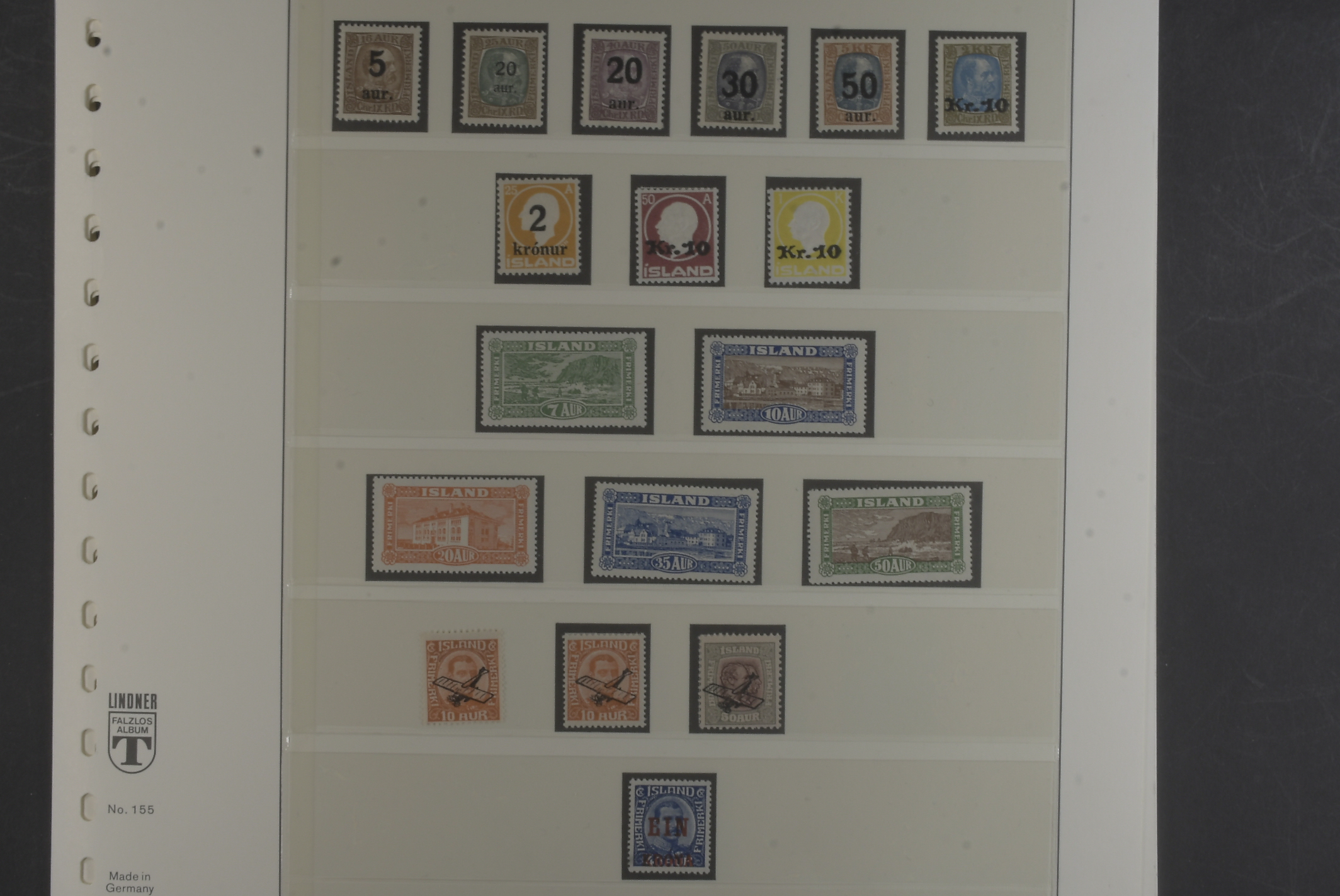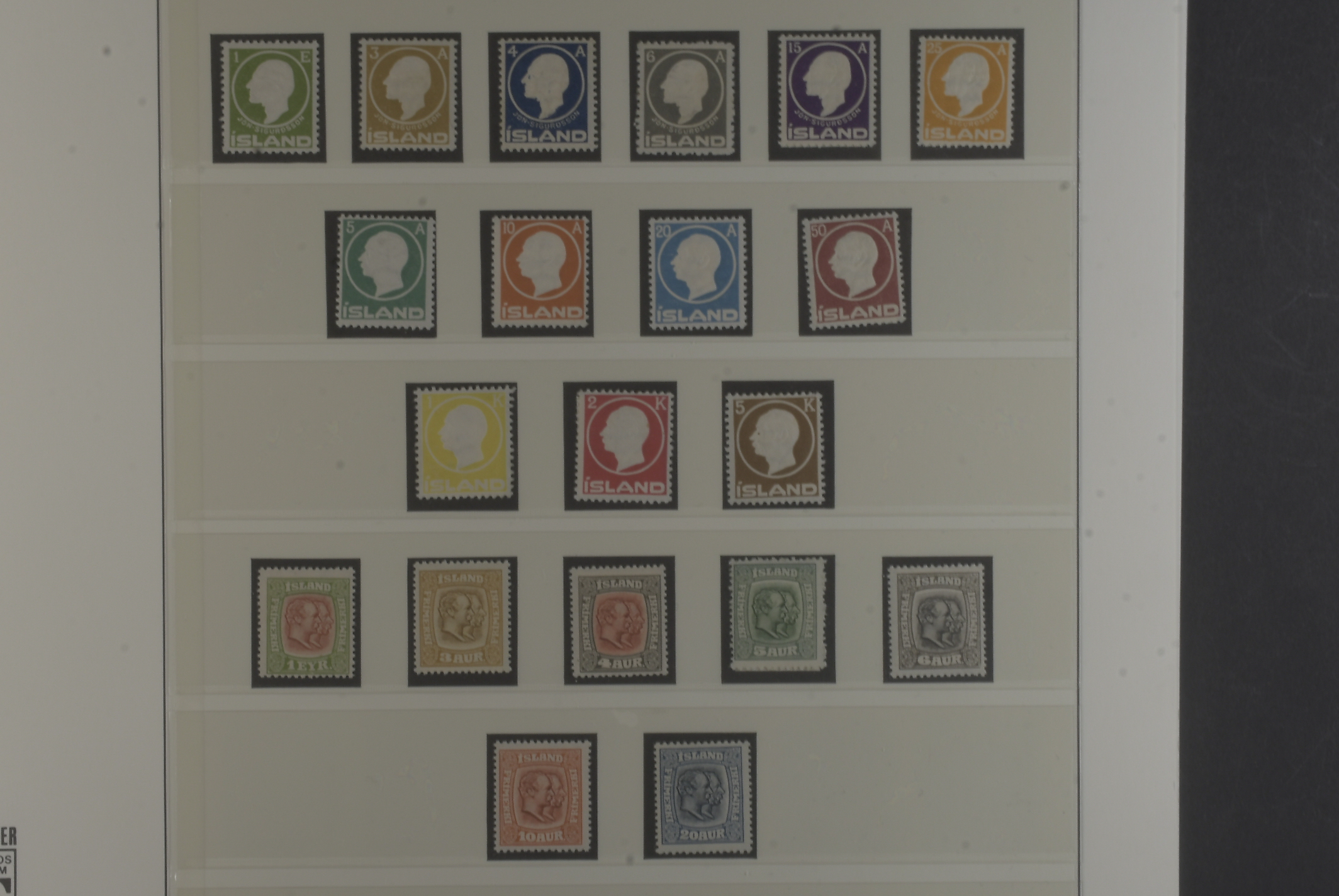 Iceland. Collection ★★/★ 1873–1938 on Lindner T eaves with stamp mounts. Well filled with 4 Skilling values, good section of Aur-values, from 1902 Christian X to the end only missting 10 kr Hopflug, 1 kr have certificate Kaiser. Mostly mint but careful inspection reveals some NH e.g. Althing set. Inspection is recommended. Please see a selection of scans at www.philea.se. Mostly fine quality. (200+)