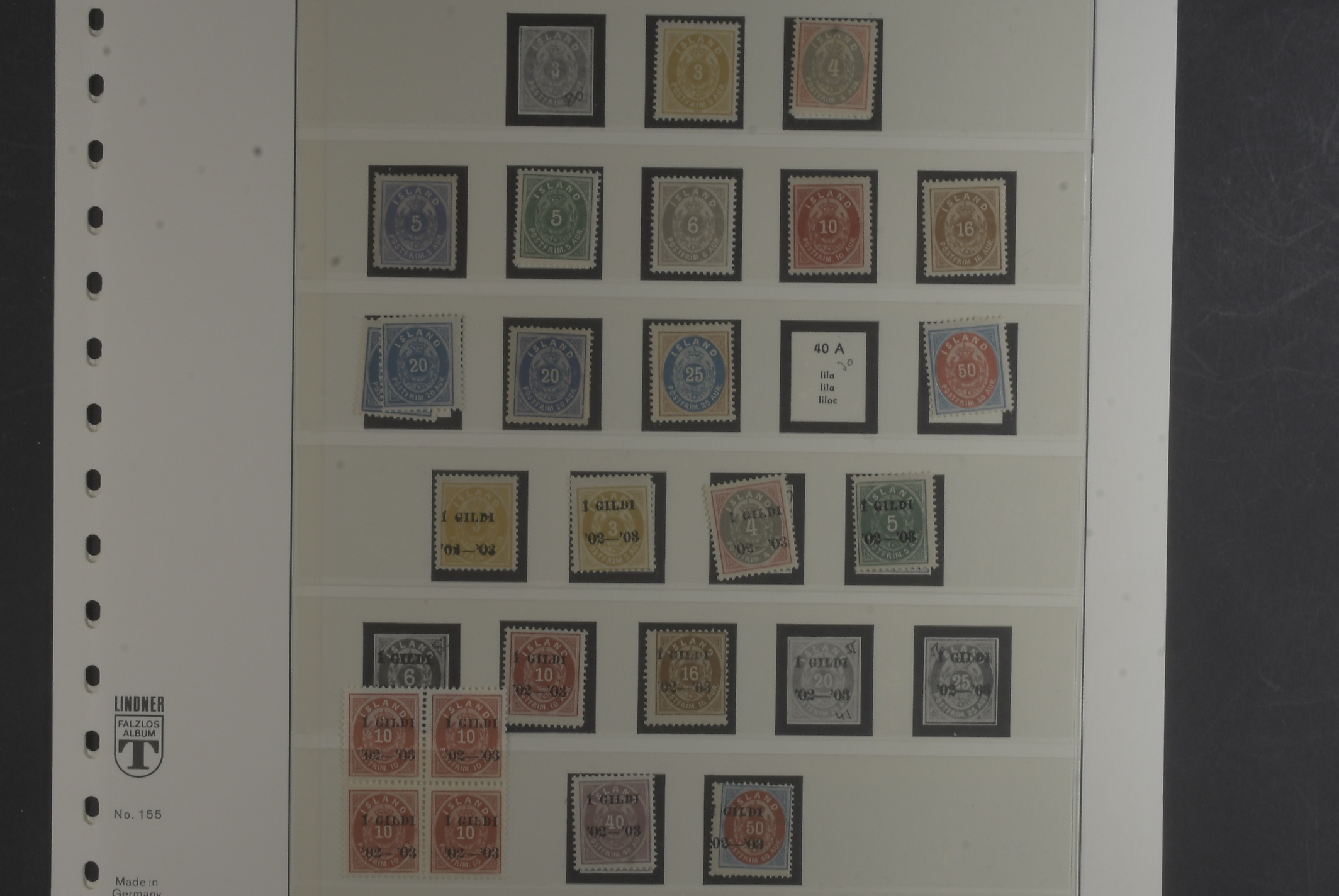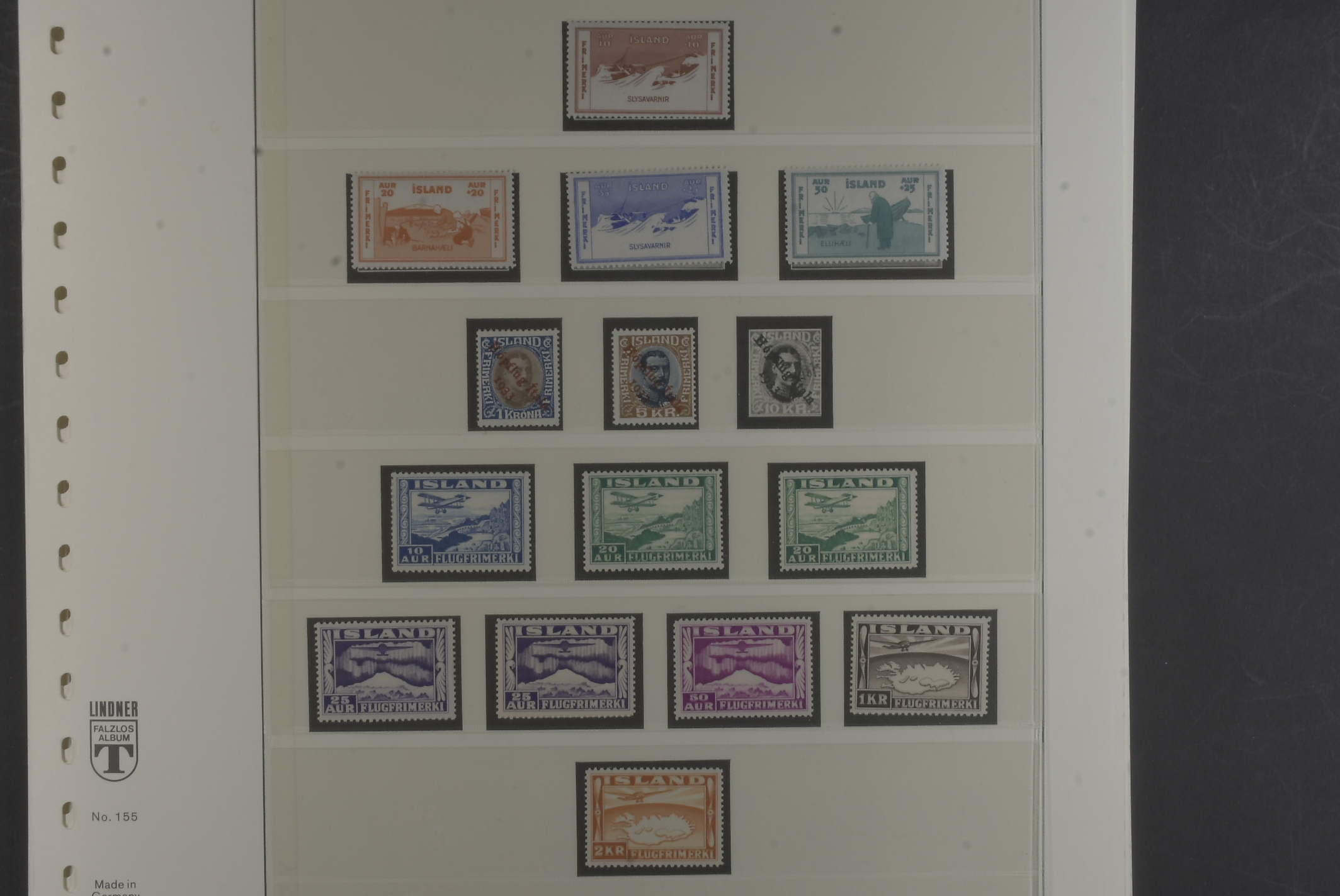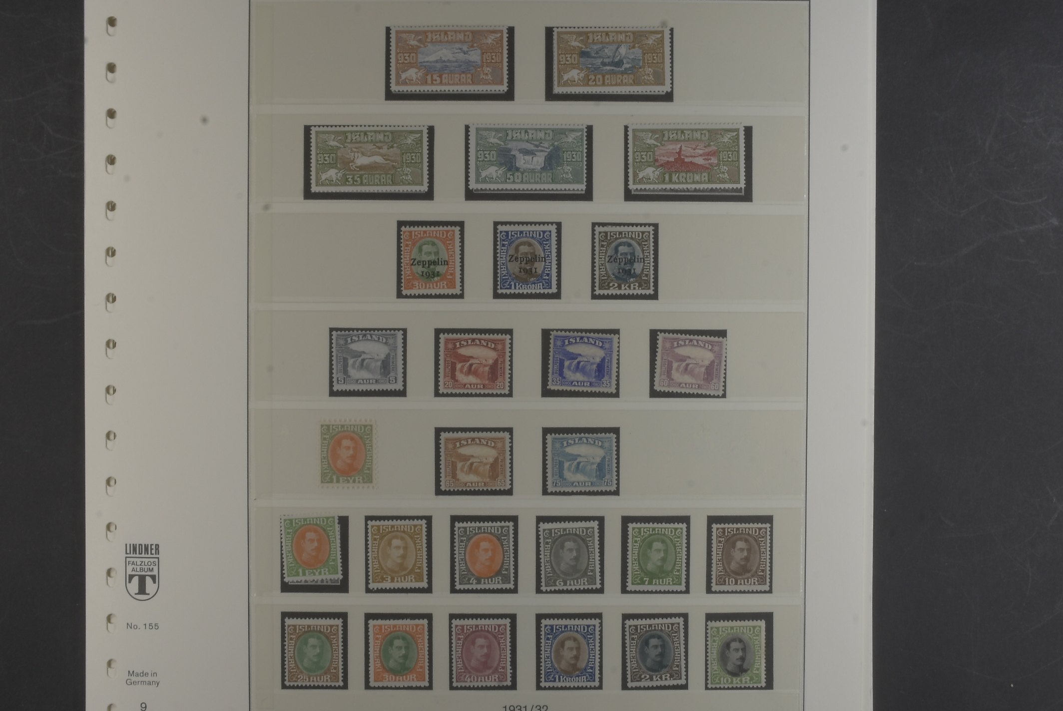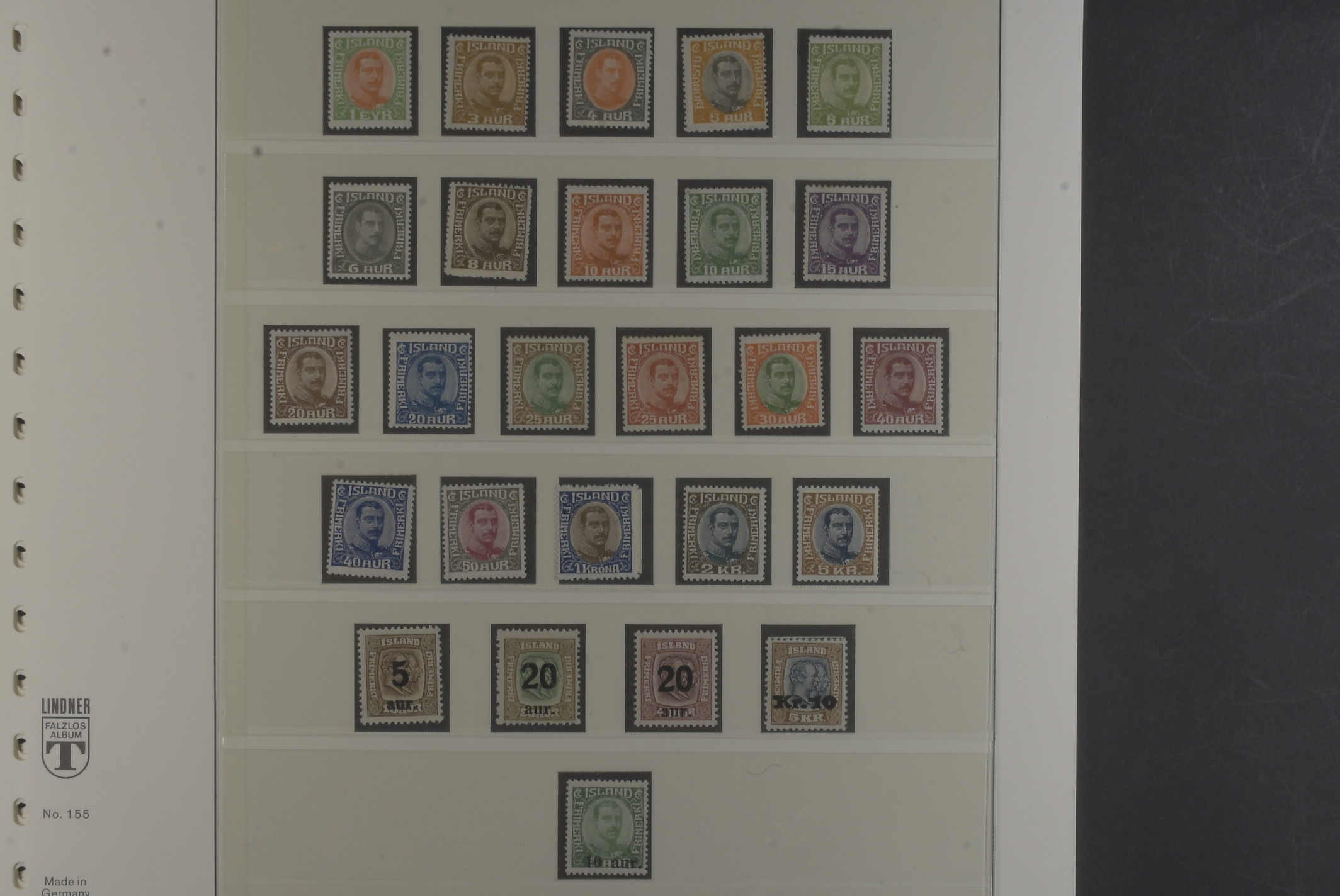 Iceland. Collection ★★/★ 1873–1938 on Lindner T eaves with stamp mounts. Well filled with 4 Skilling values, good section of Aur-values, from 1902 Christian X to the end only missting 10 kr Hopflug, 1 kr have certificate Kaiser. Mostly mint but careful inspection reveals some NH e.g. Althing set. Inspection is recommended. Please see a selection of scans at www.philea.se. Mostly fine quality. (200+)