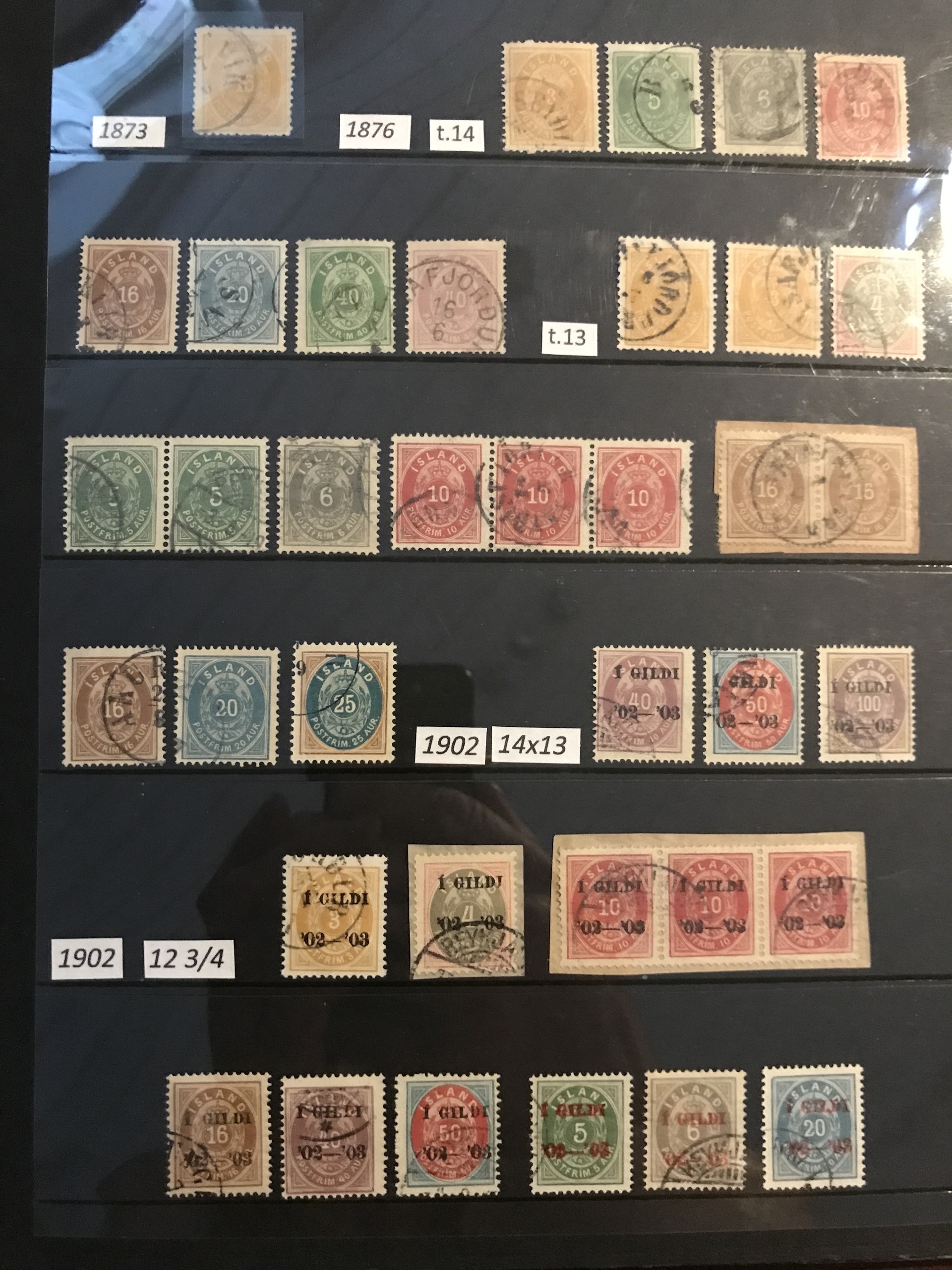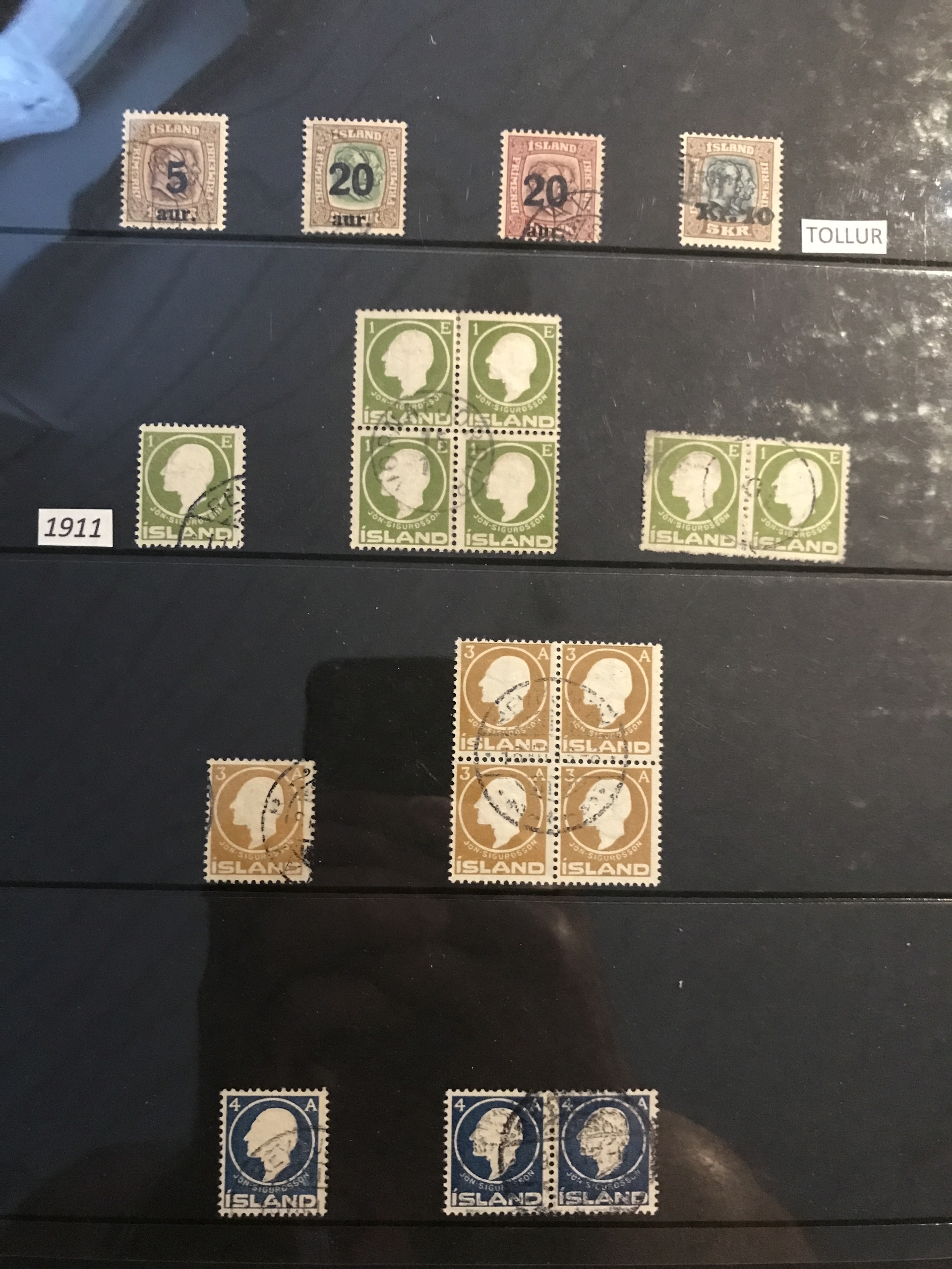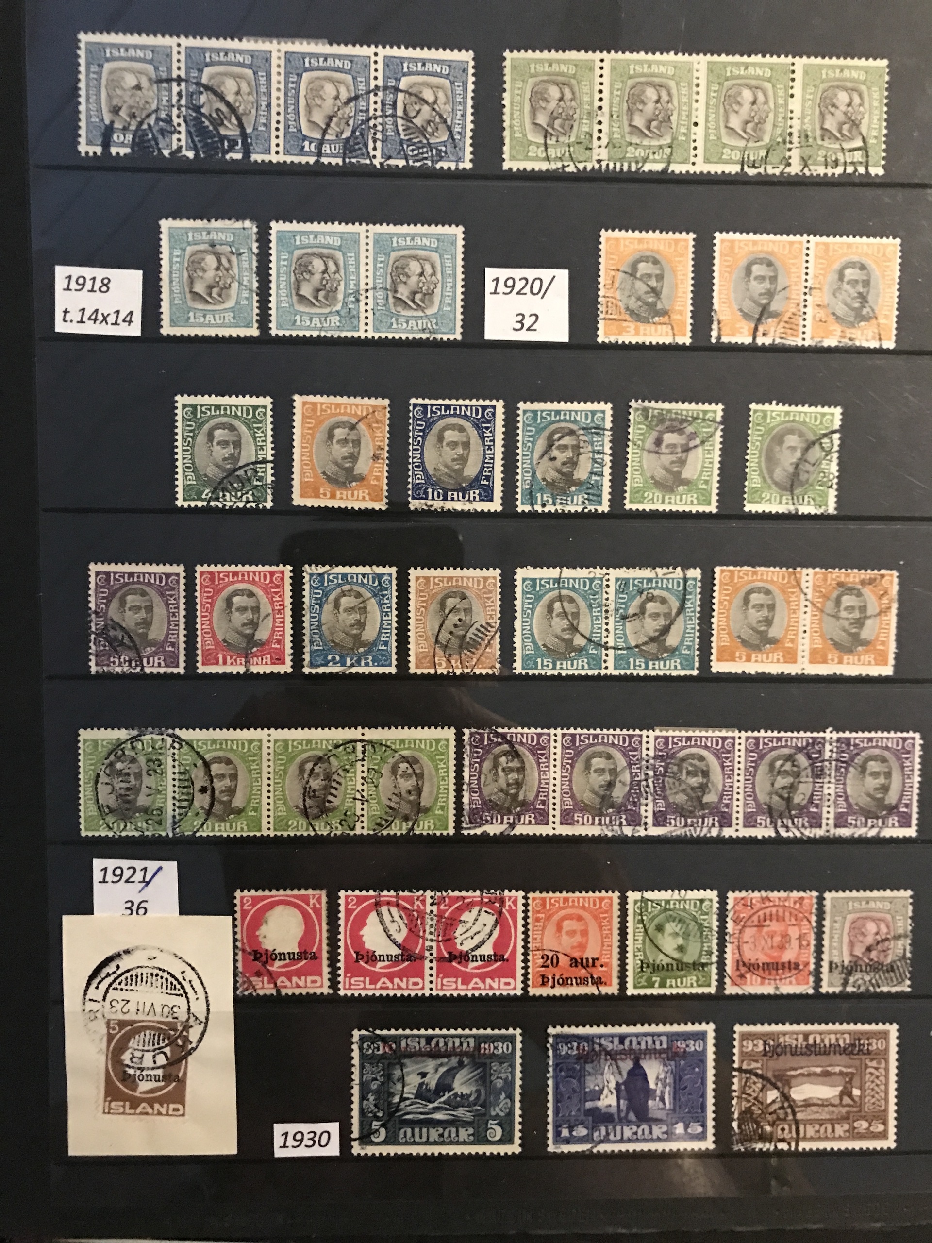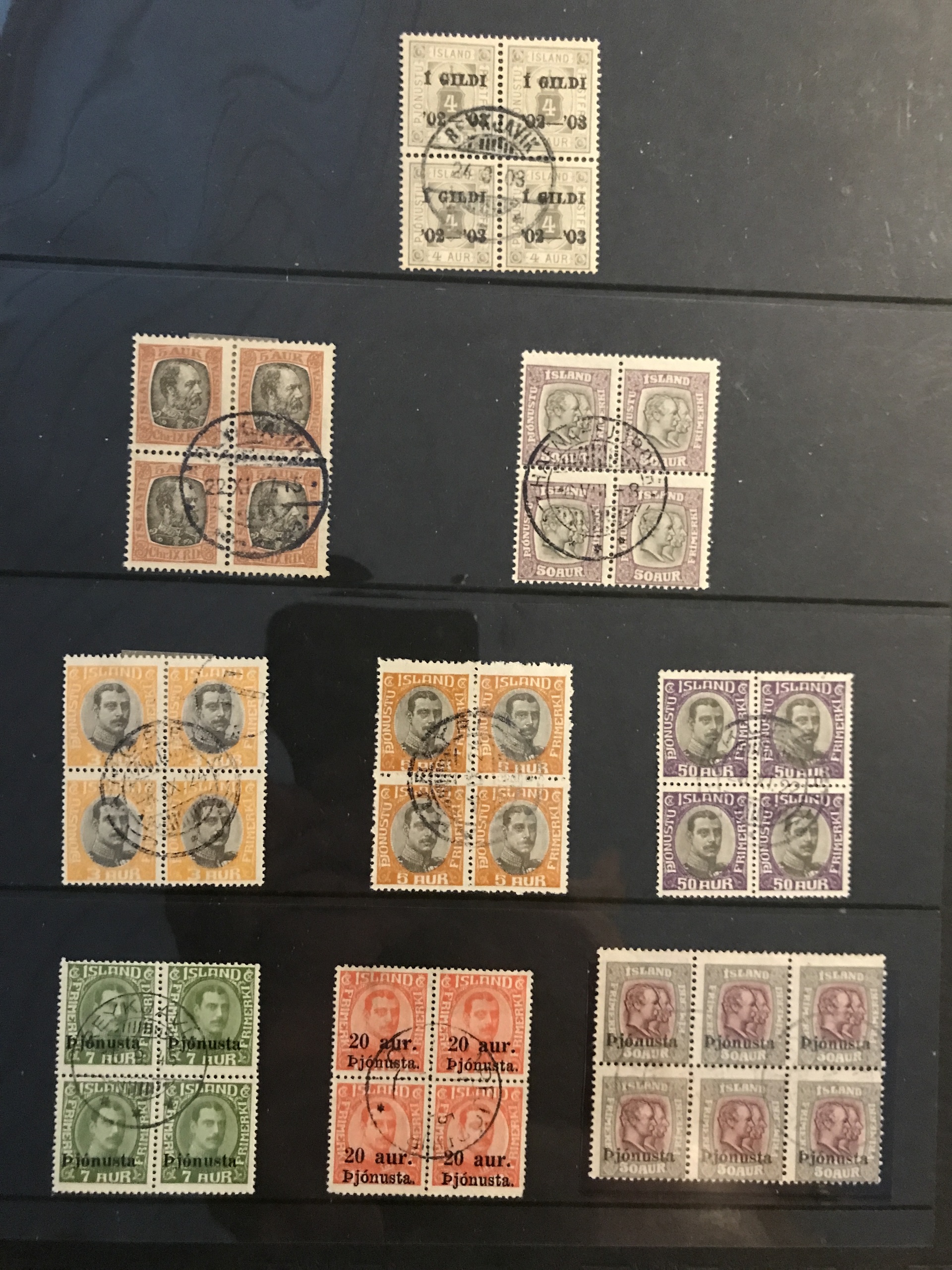 Iceland. Used. Nice selection 1873–1950 in visir binder incl. singles, strips and blocks-of-four. Containing e.g. F7, 16, pair F27, nice official stamps incl. TJ54, TJ58 in block-of-four, etc. Facit 80000++. Please see a selection of scans at www.philea.se. (360)