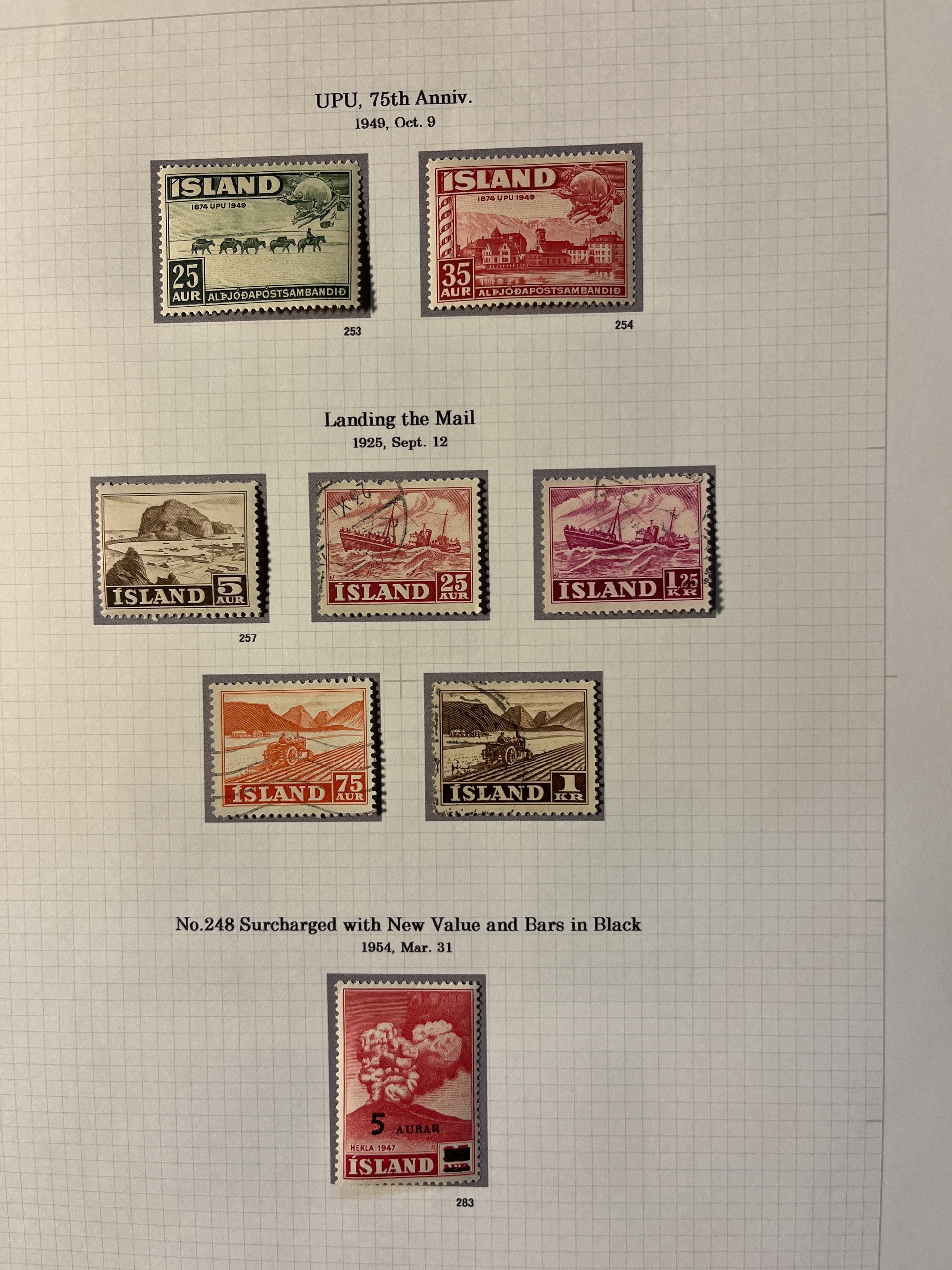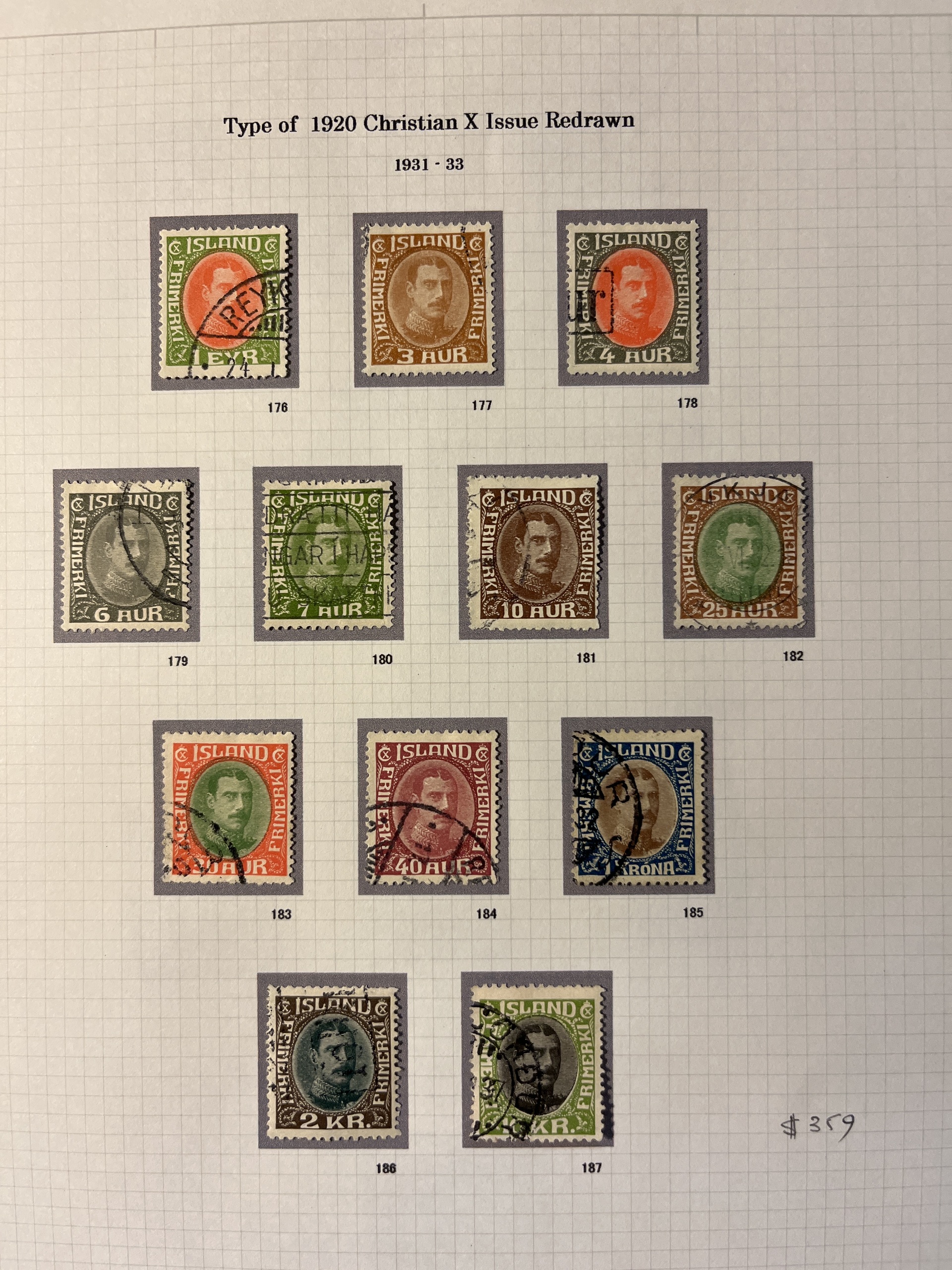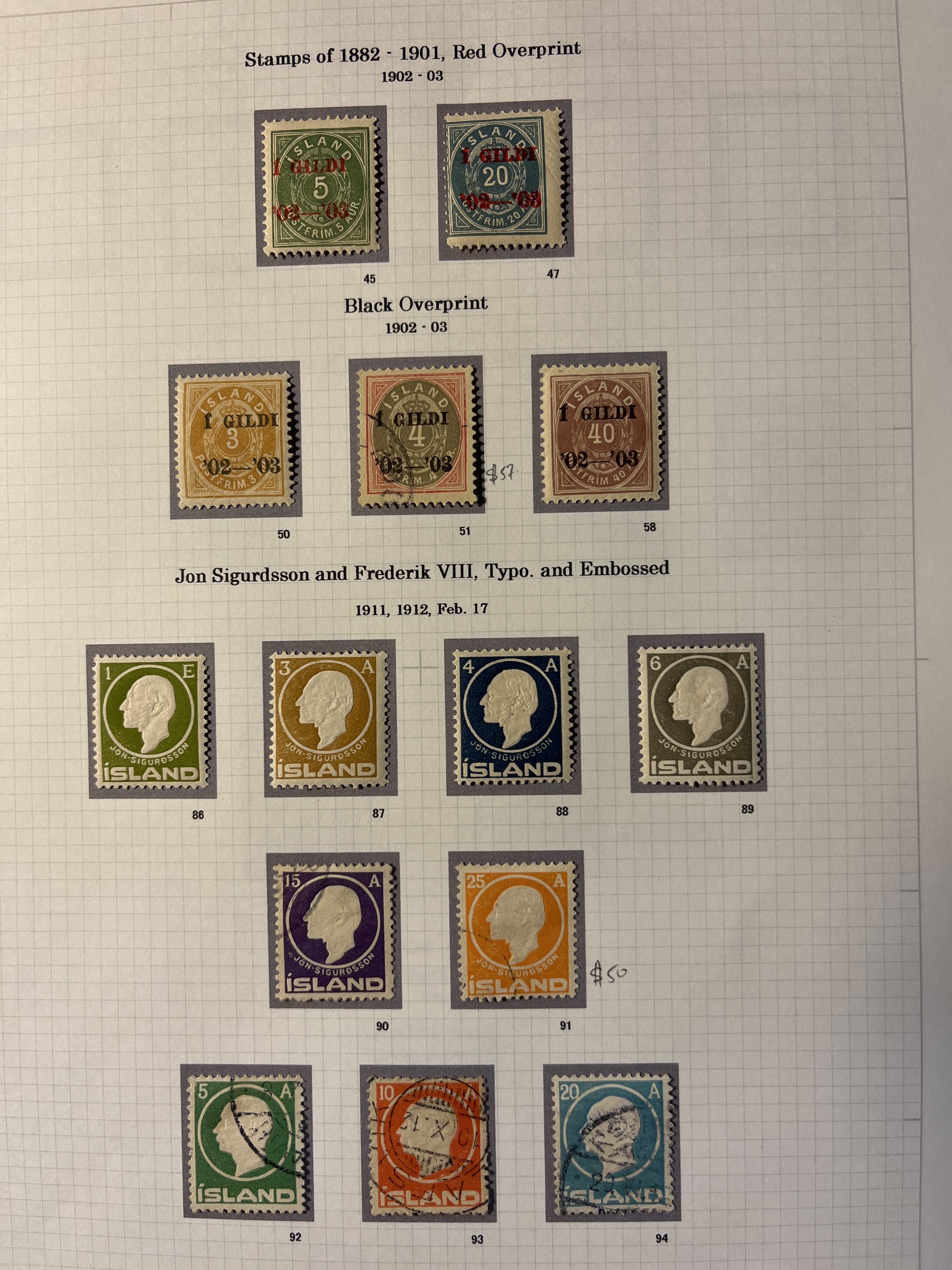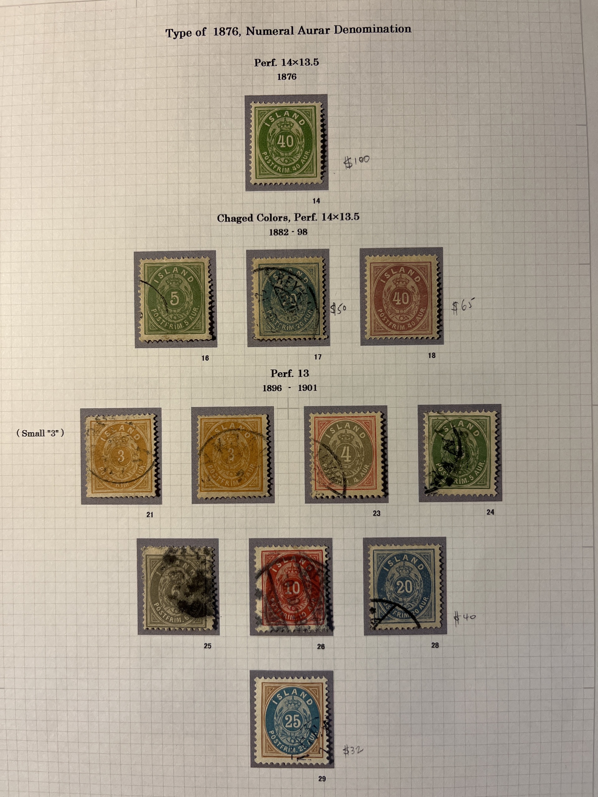Iceland. Collection used 1876–1954 on home made leaves. Several better as 40 aur perf 14 x13½ * and 10 Kr Christian X used 1931. The entire lot is presented at www.philea.se. Mostly fine quality.