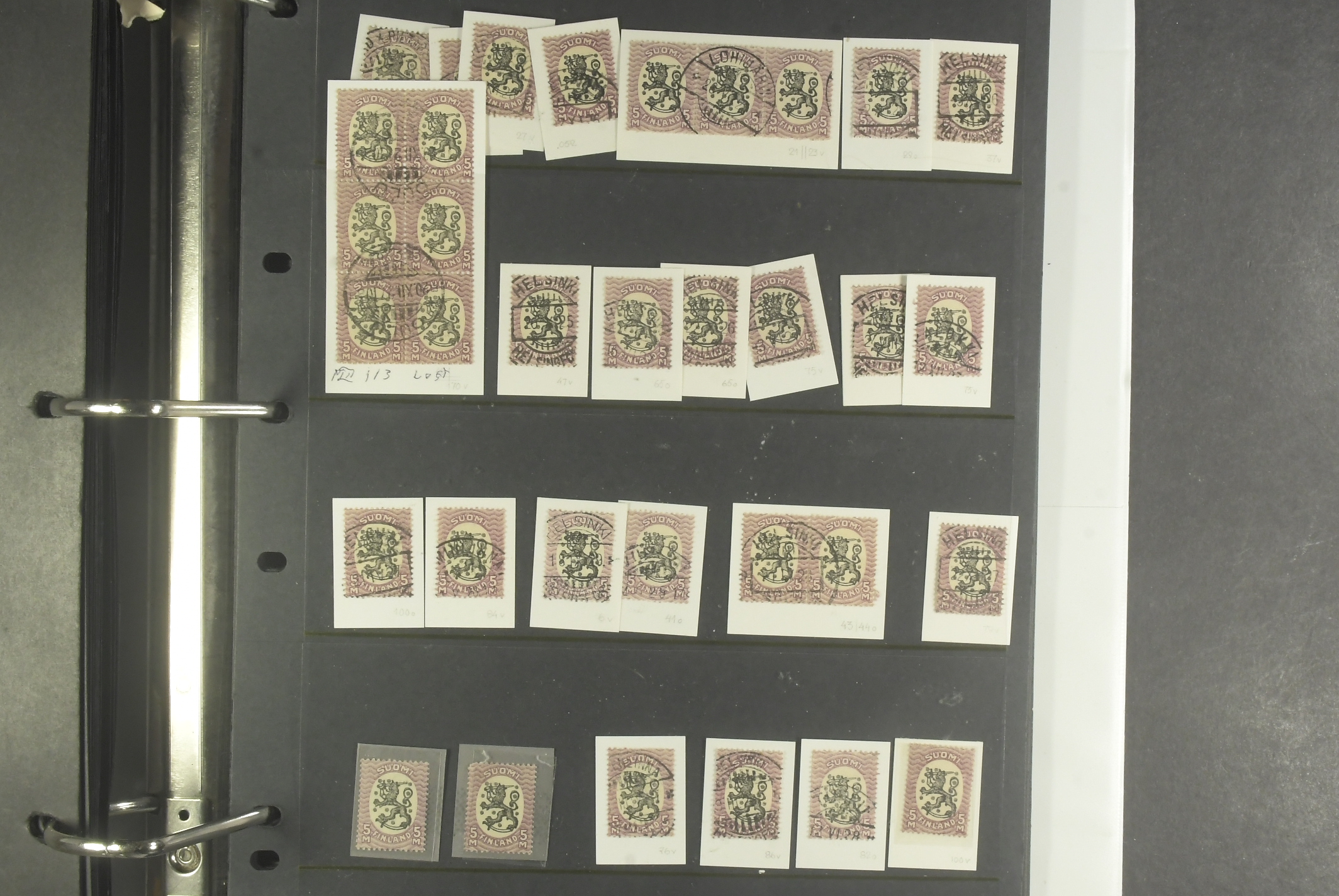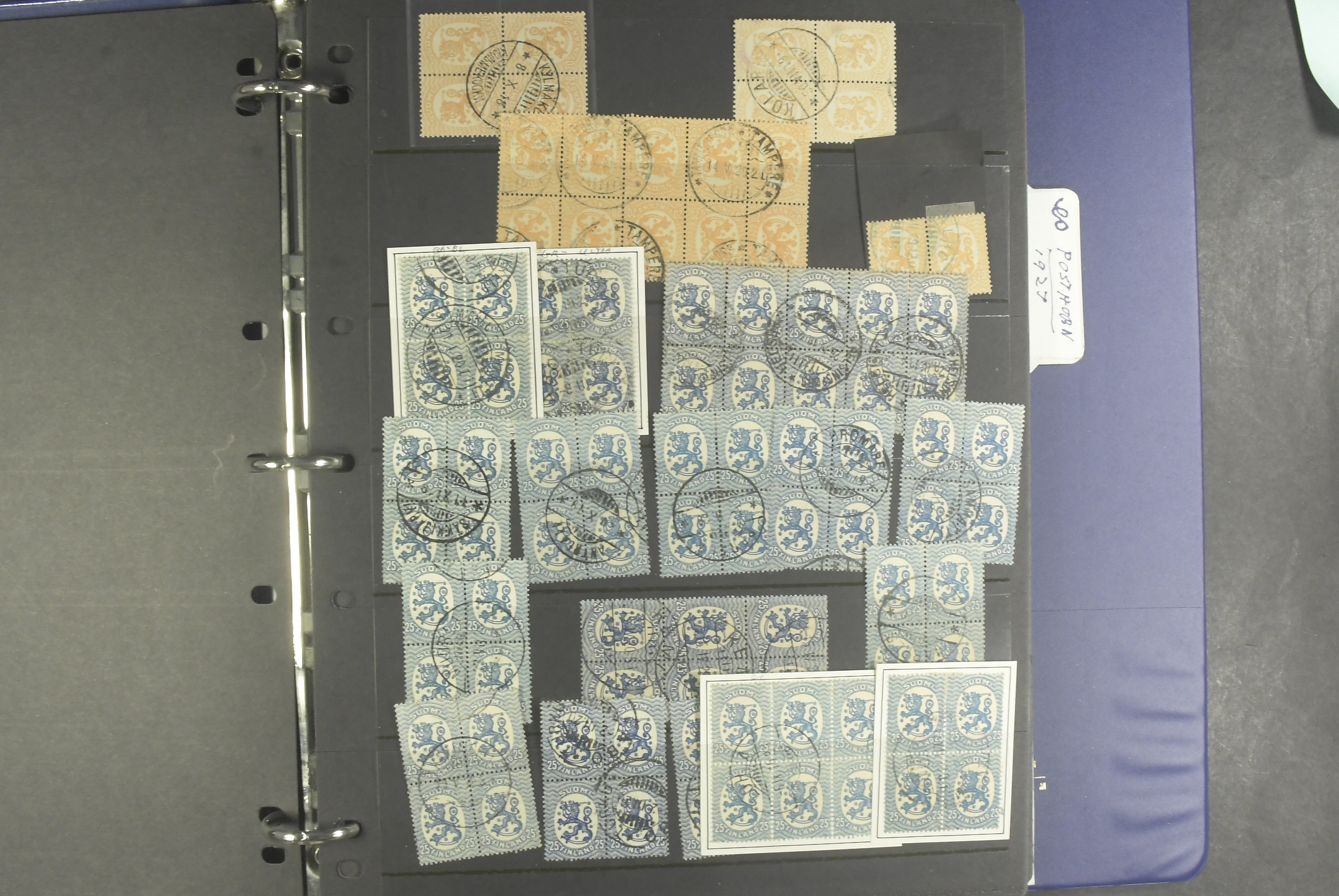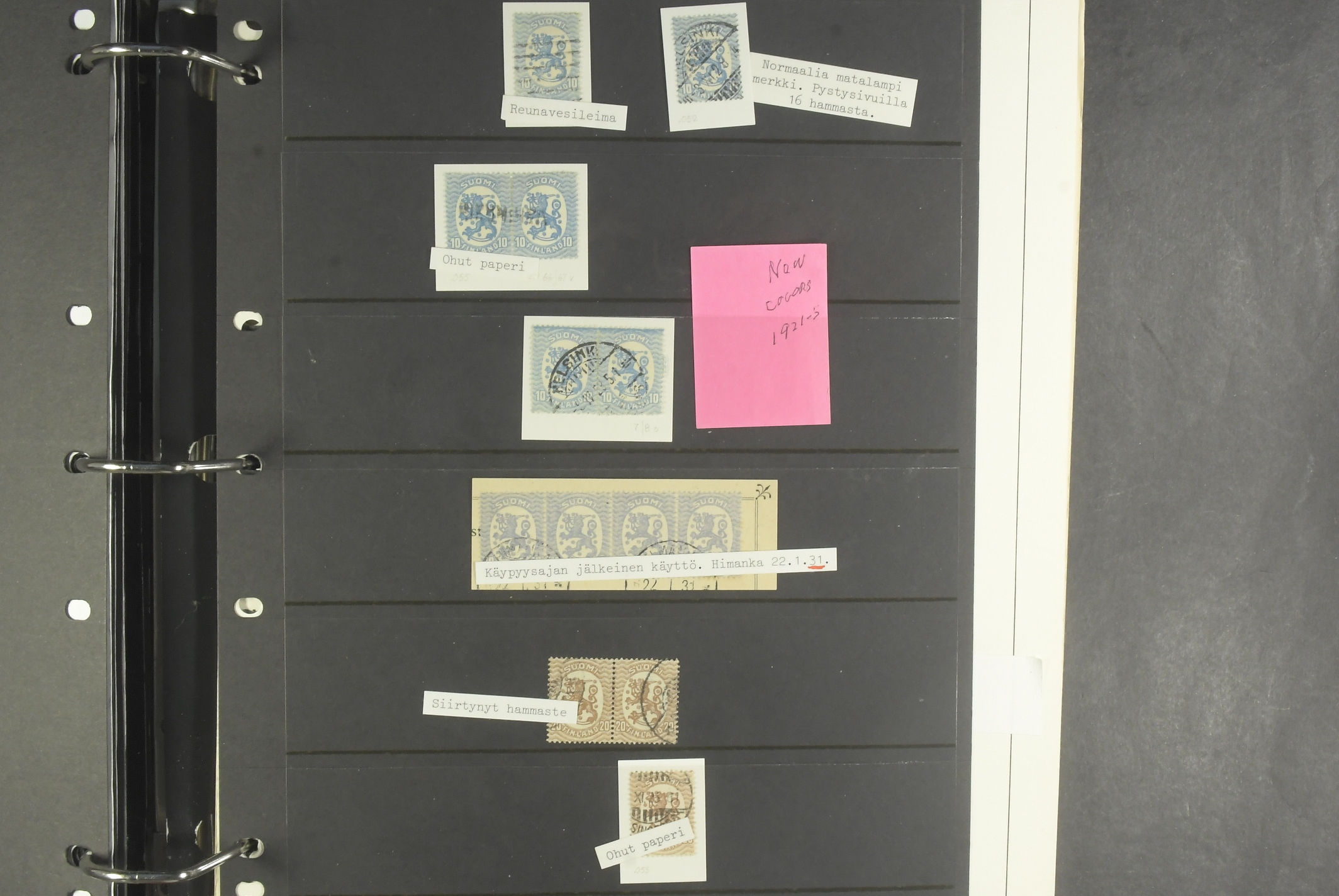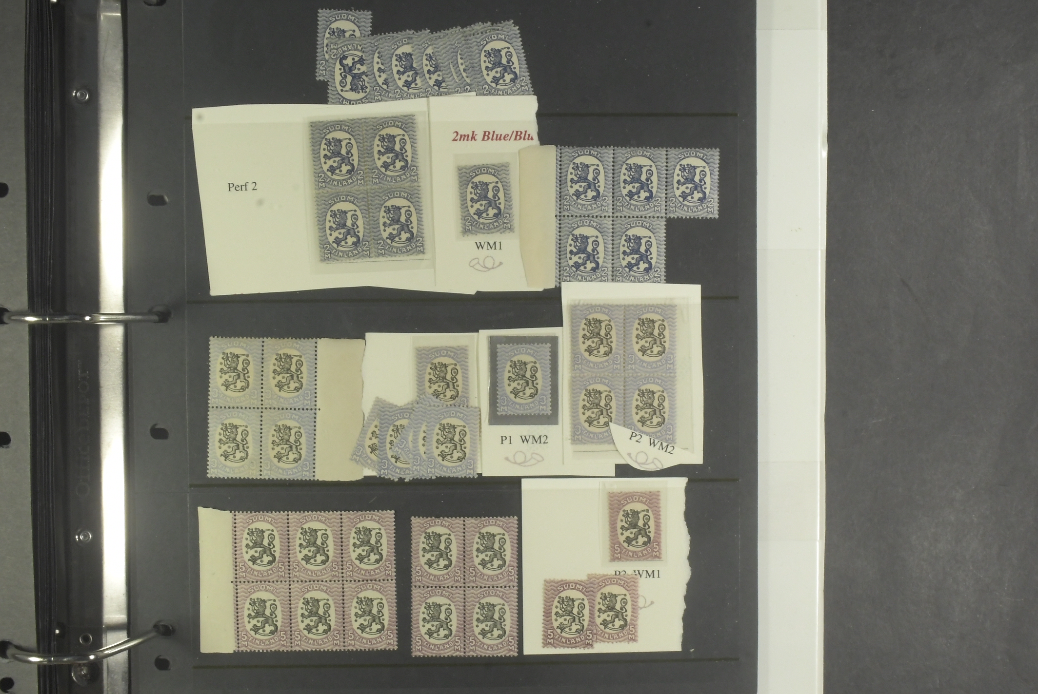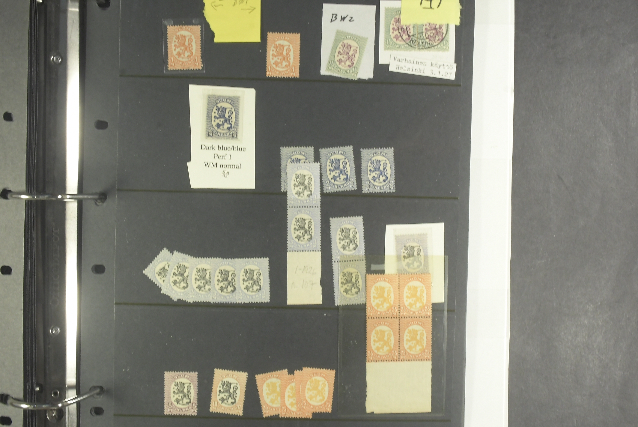Finland. ★/⊙. An extraordinary range, very complex and scholarly even for the more experienced student of these issues, specifically for the first lion definitives of 1919 to 1929, all housed in four volumes with 1000s of stamps with countless varieties, unusual postmarks, lots of multiples, superb imprint blocks of six with the month and year of printing to determine the different papers, etc, etc. Much of this is a 'work in progress', as this collector expanded over a 40 year period of serious buying anything he could find. especially material that was different to the norm. It is because of this that while there are many pages of album leaves, there are also many more pages for the multiples housed in large stockcards, often written up accordingly to identify the stamps. Almost an impossible lot to describe as it is so in depth - anybody who is interested in this area of Finnish philately will be absolutely delighted in the breadth and scope of what is here. The viewing could take hours just to begin to appreciate this amazing holding. Approx. 6 kg.