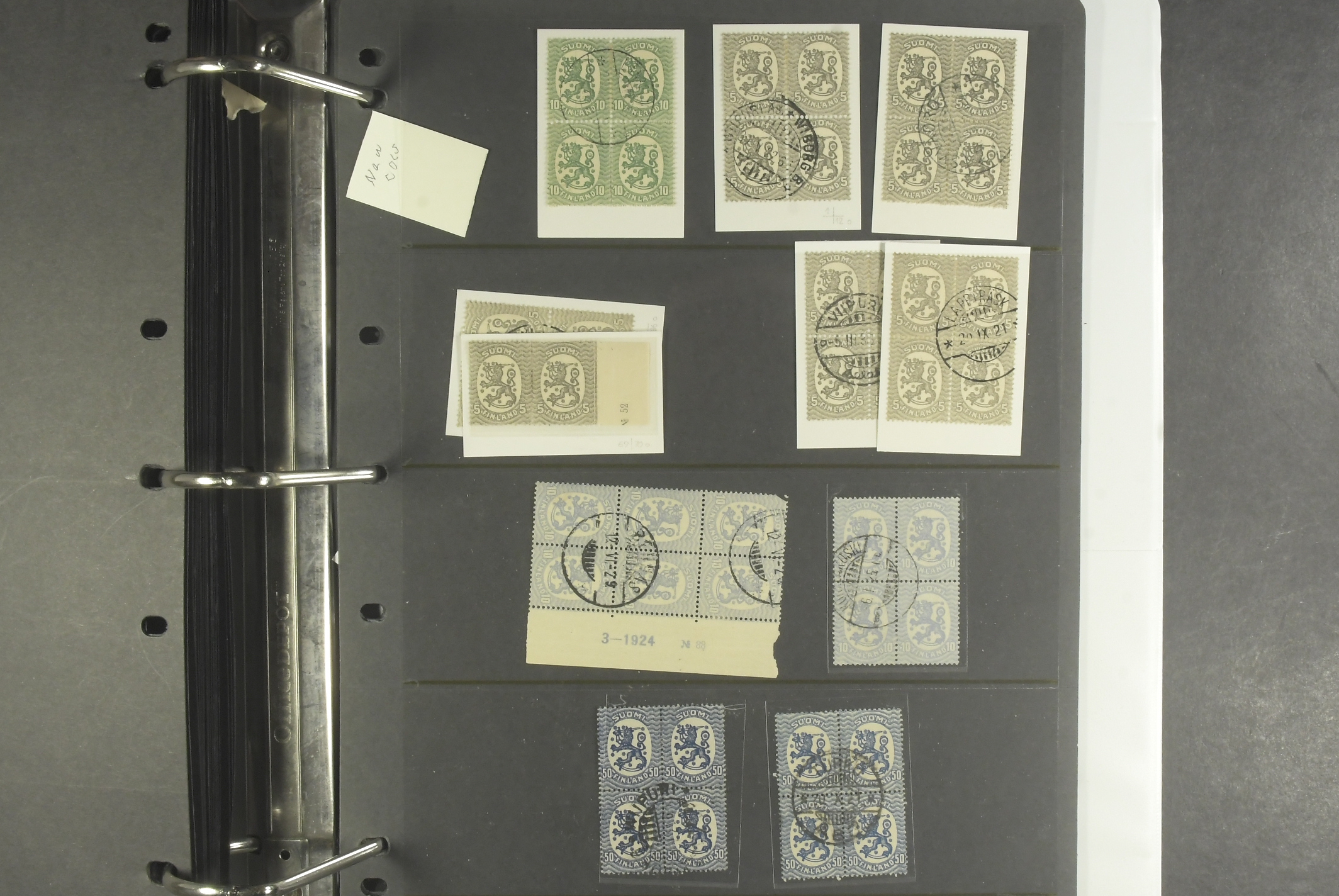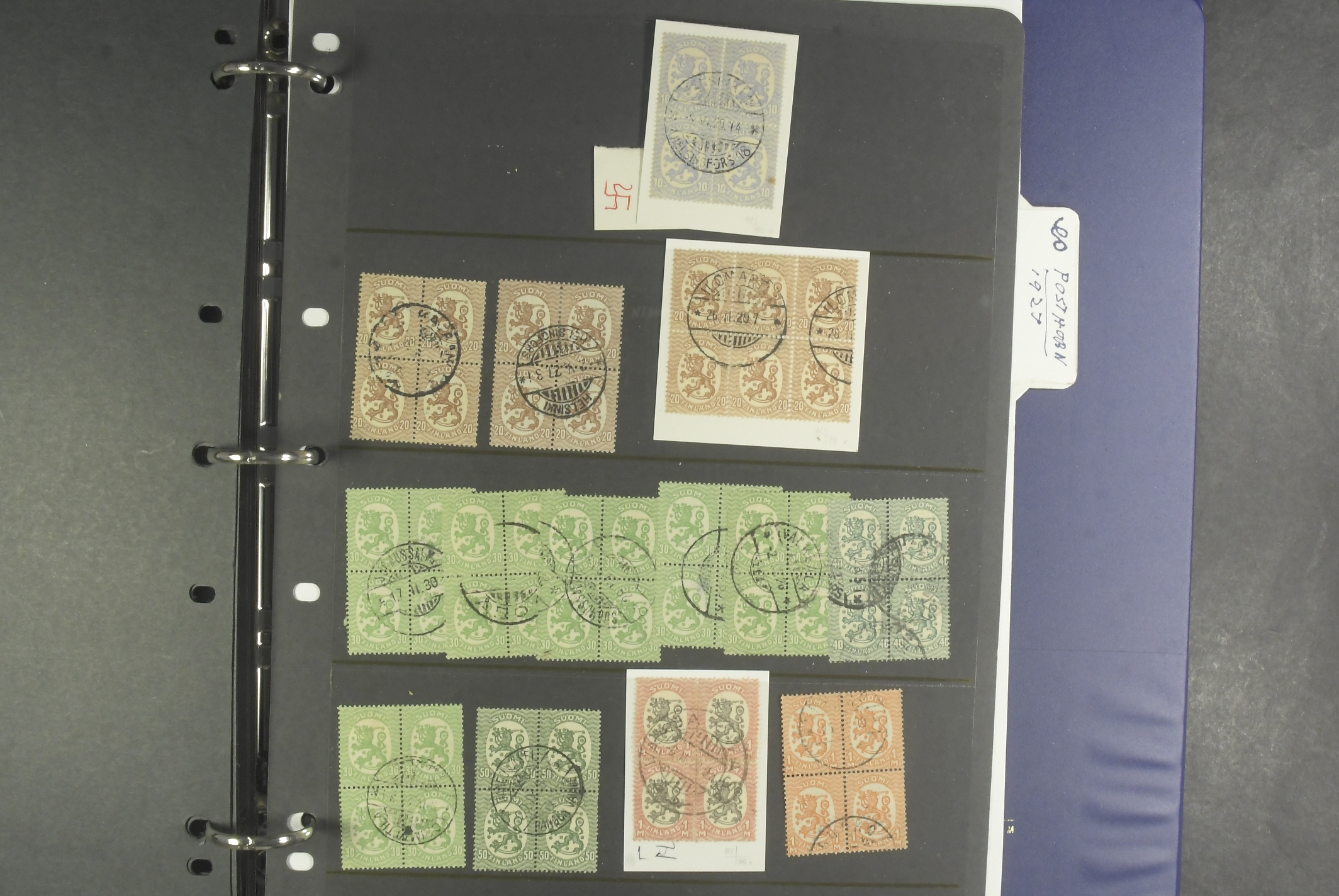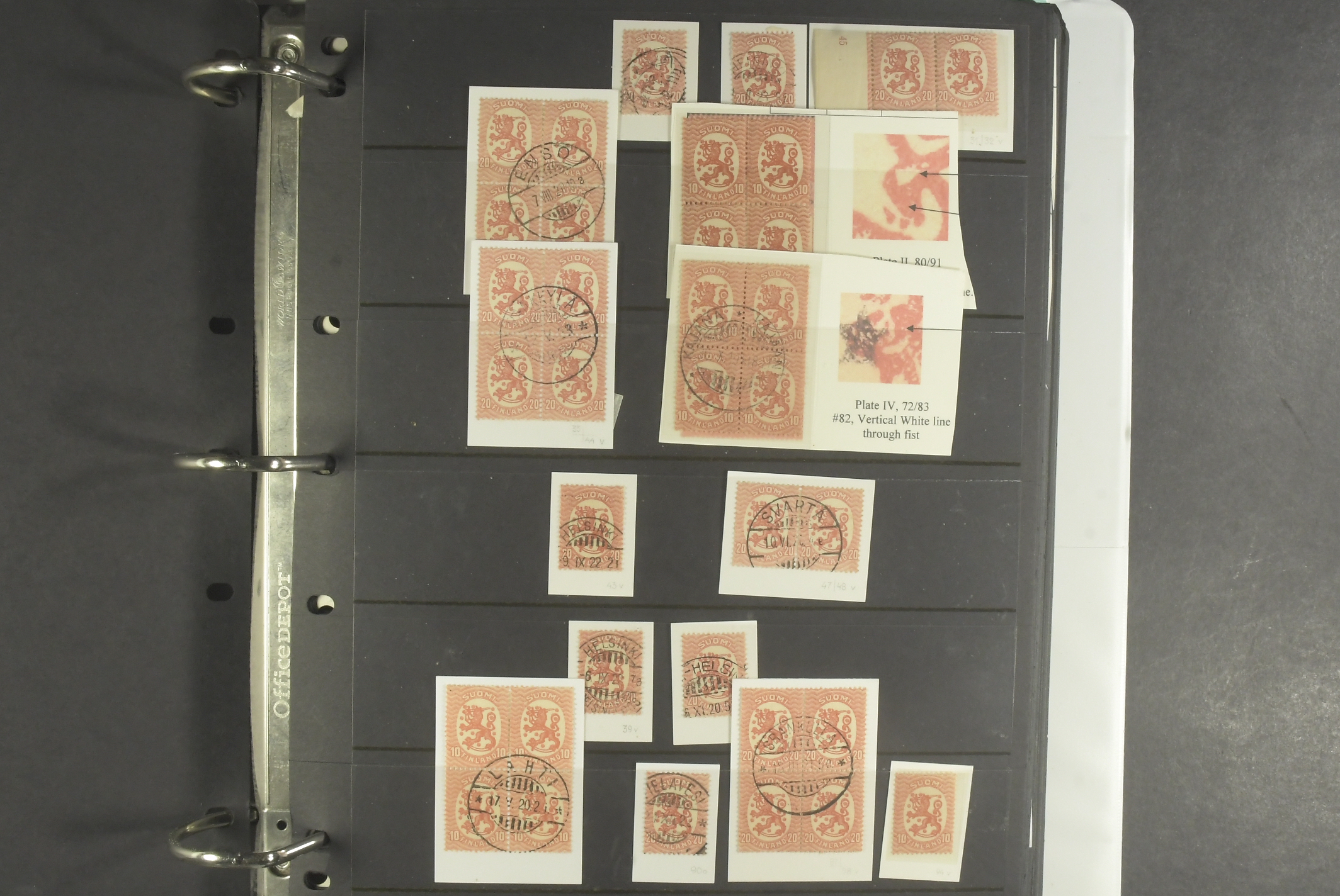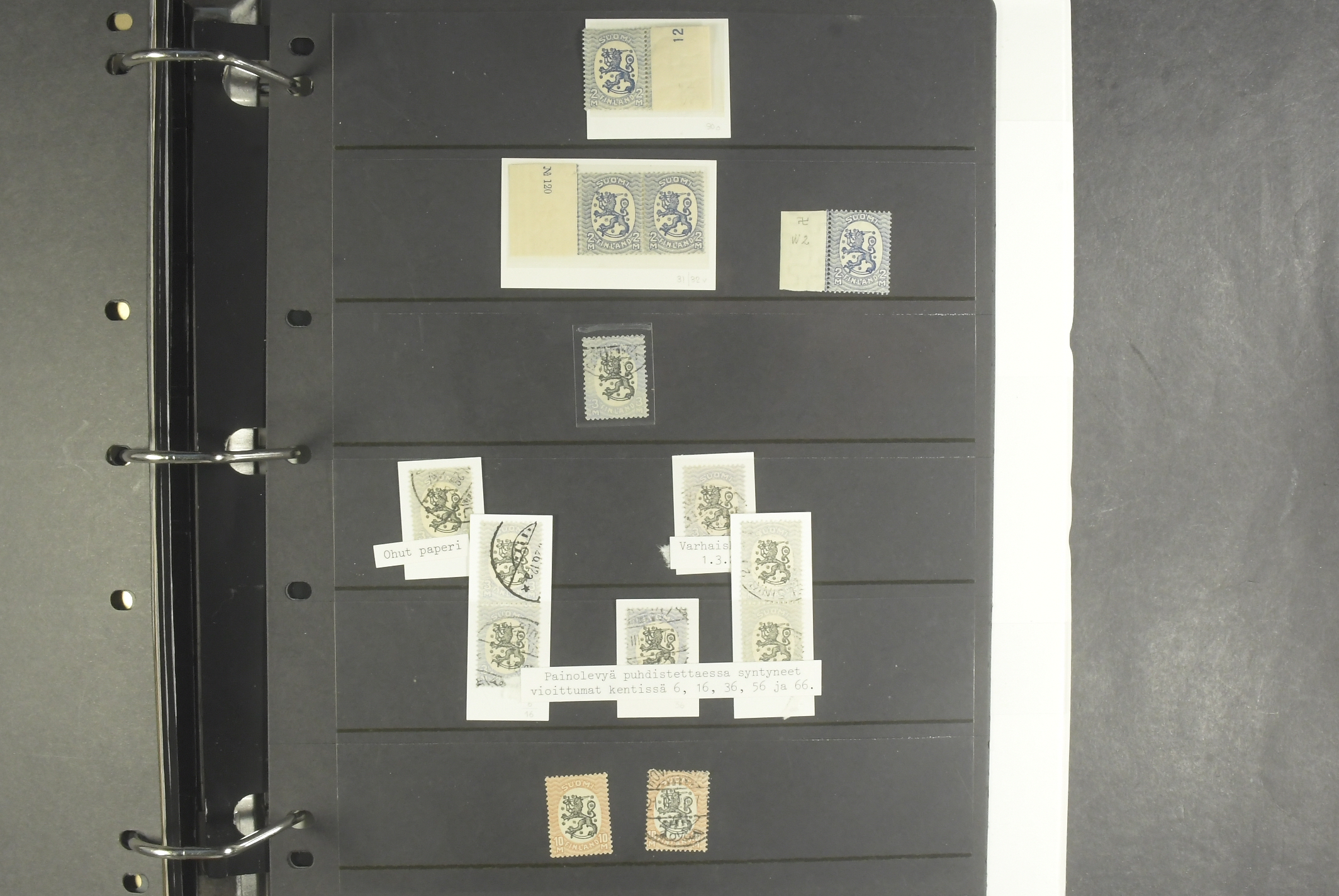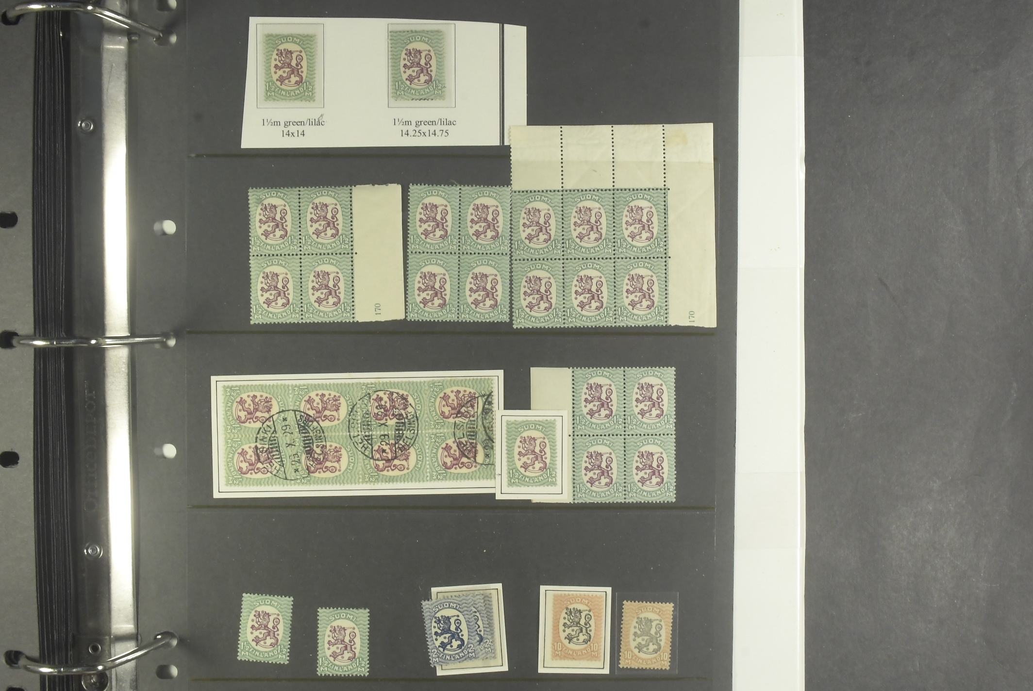 Finland. ★/⊙. An extraordinary range, very complex and scholarly even for the more experienced student of these issues, specifically for the first lion definitives of 1919 to 1929, all housed in four volumes with 1000s of stamps with countless varieties, unusual postmarks, lots of multiples, superb imprint blocks of six with the month and year of printing to determine the different papers, etc, etc. Much of this is a 'work in progress', as this collector expanded over a 40 year period of serious buying anything he could find. especially material that was different to the norm. It is because of this that while there are many pages of album leaves, there are also many more pages for the multiples housed in large stockcards, often written up accordingly to identify the stamps. Almost an impossible lot to describe as it is so in depth - anybody who is interested in this area of Finnish philately will be absolutely delighted in the breadth and scope of what is here. The viewing could take hours just to begin to appreciate this amazing holding. Approx. 6 kg.