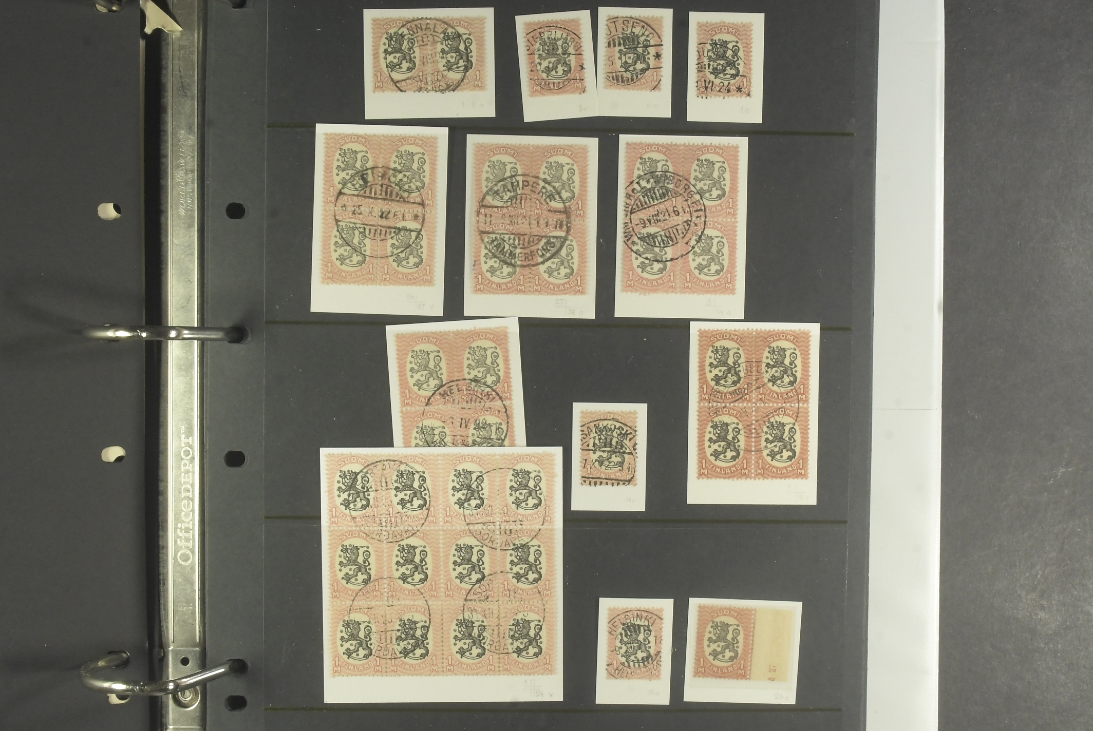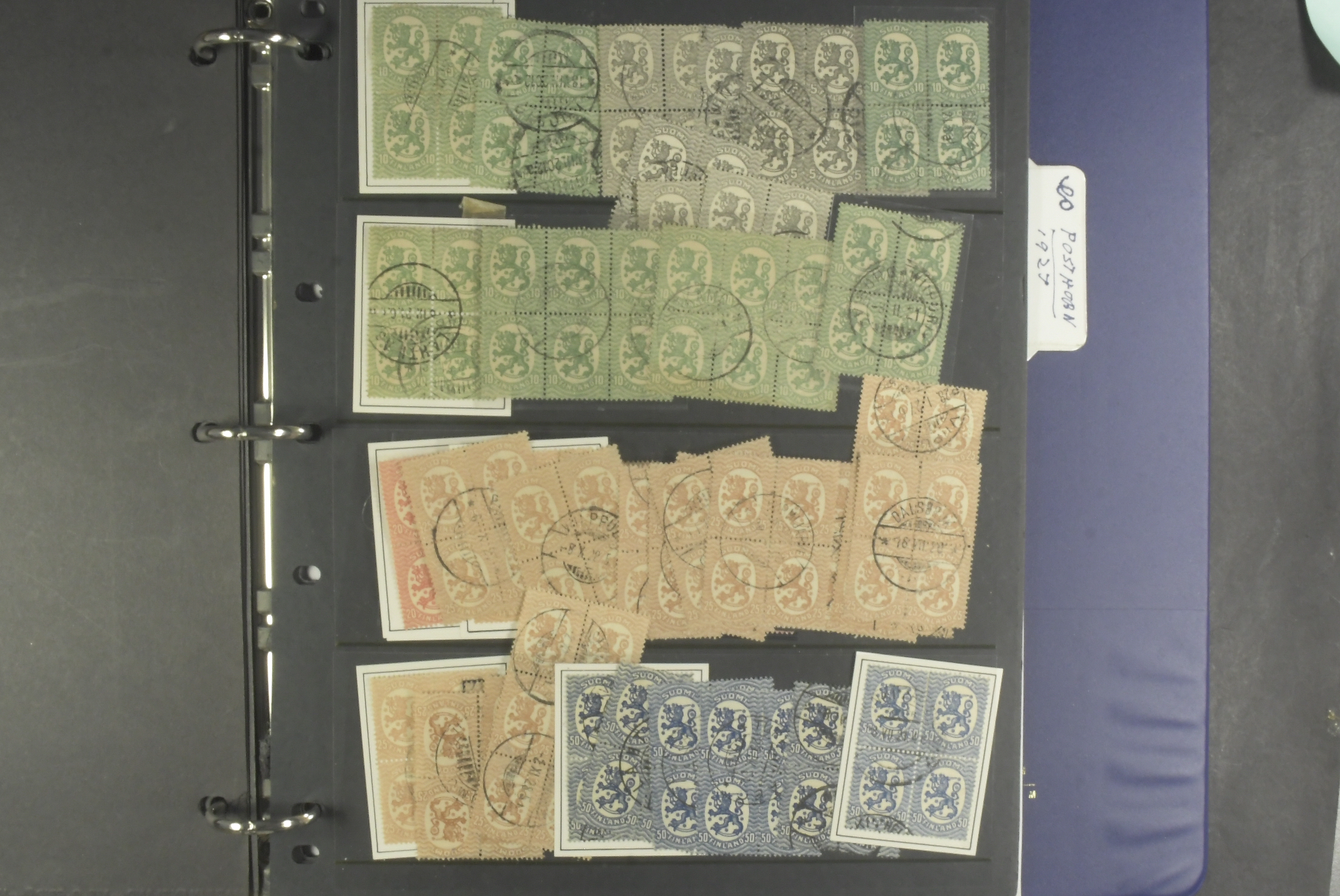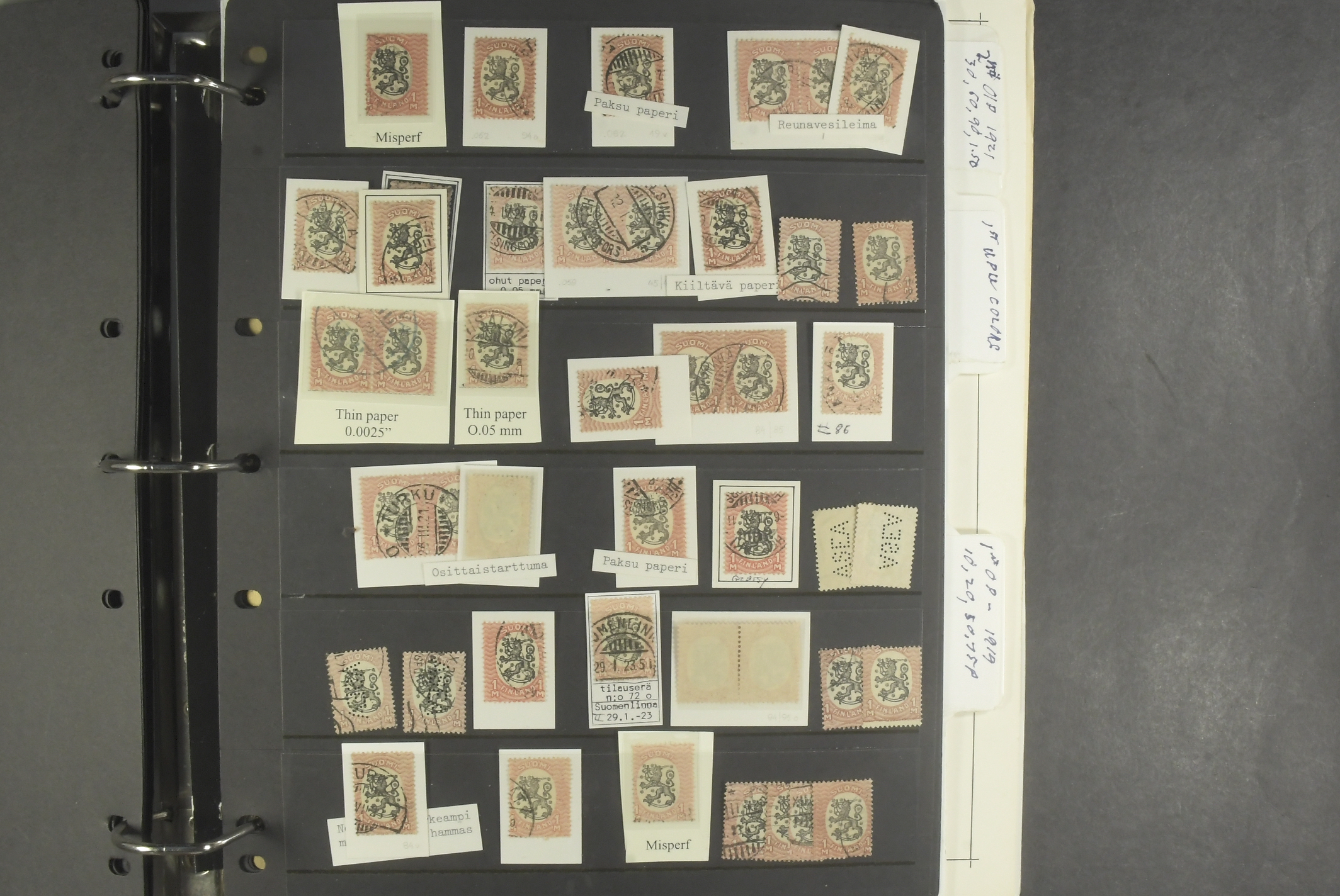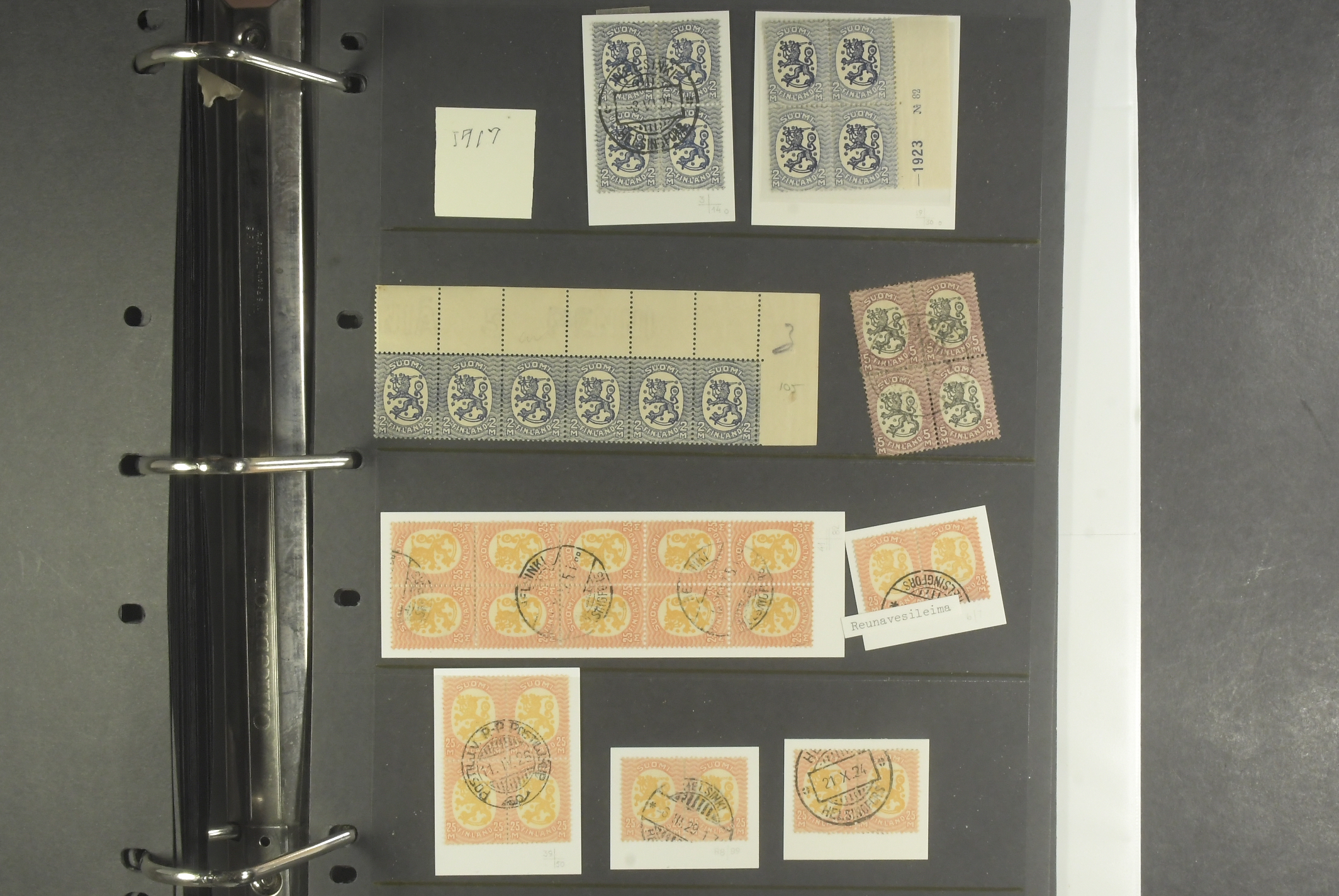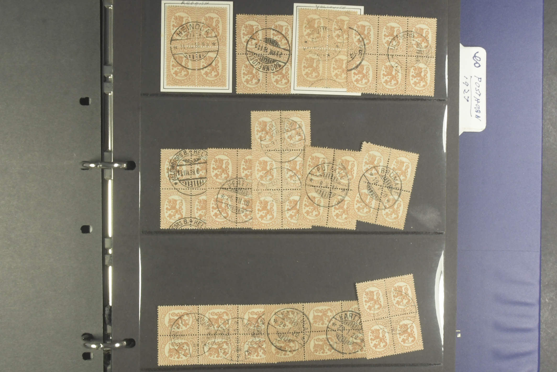 Finland. ★/⊙. An extraordinary range, very complex and scholarly even for the more experienced student of these issues, specifically for the first lion definitives of 1919 to 1929, all housed in four volumes with 1000s of stamps with countless varieties, unusual postmarks, lots of multiples, superb imprint blocks of six with the month and year of printing to determine the different papers, etc, etc. Much of this is a 'work in progress', as this collector expanded over a 40 year period of serious buying anything he could find. especially material that was different to the norm. It is because of this that while there are many pages of album leaves, there are also many more pages for the multiples housed in large stockcards, often written up accordingly to identify the stamps. Almost an impossible lot to describe as it is so in depth - anybody who is interested in this area of Finnish philately will be absolutely delighted in the breadth and scope of what is here. The viewing could take hours just to begin to appreciate this amazing holding. Approx. 6 kg.