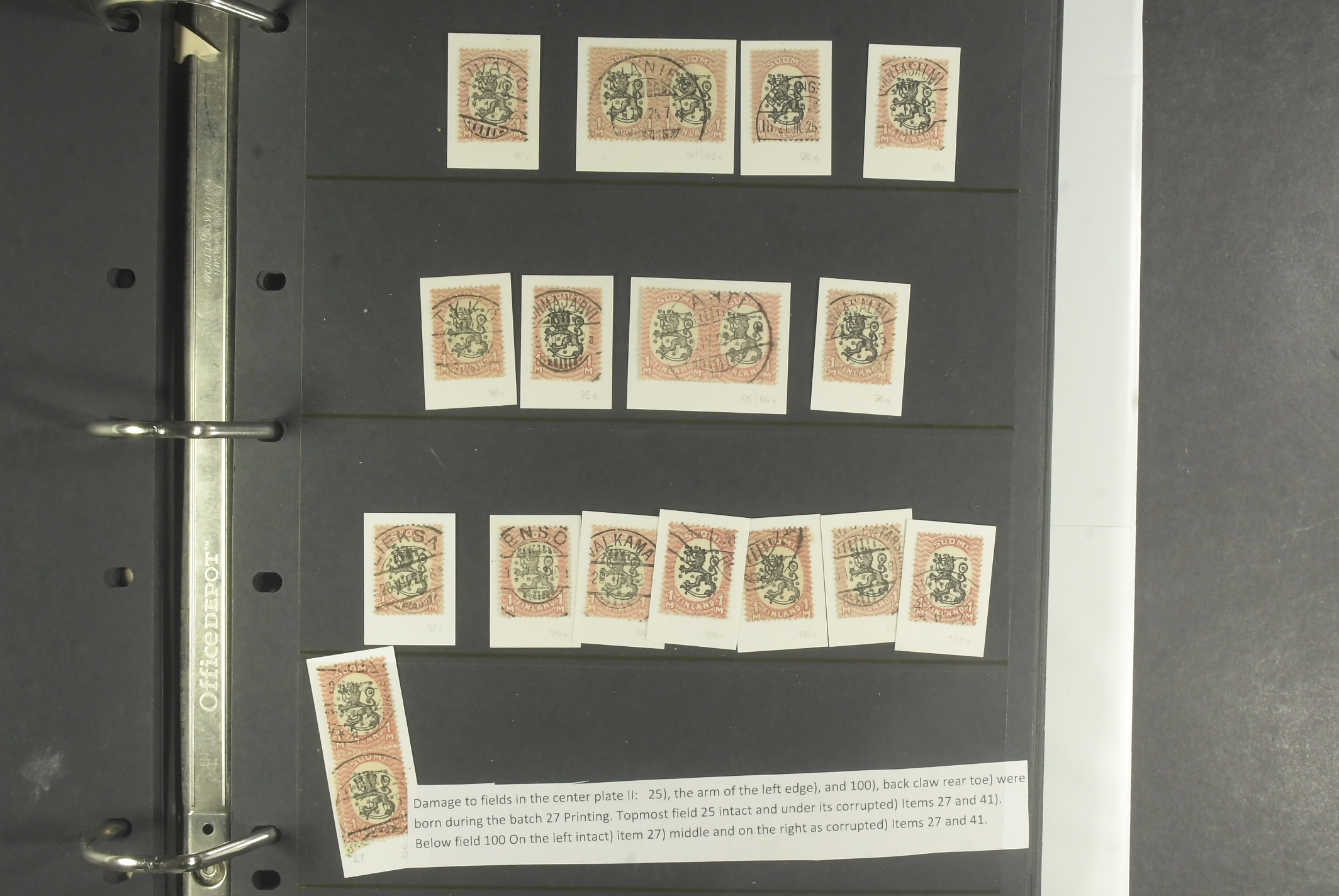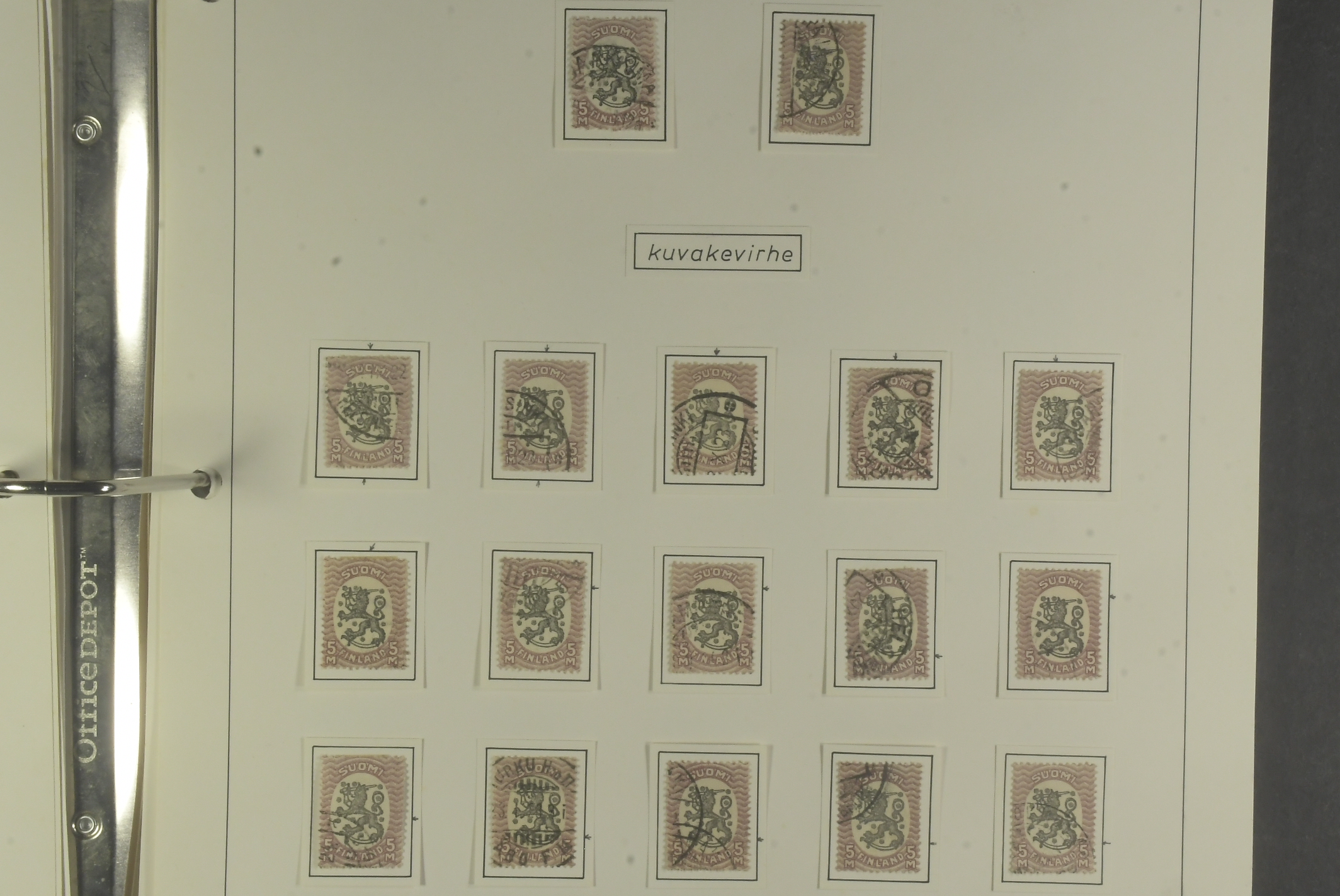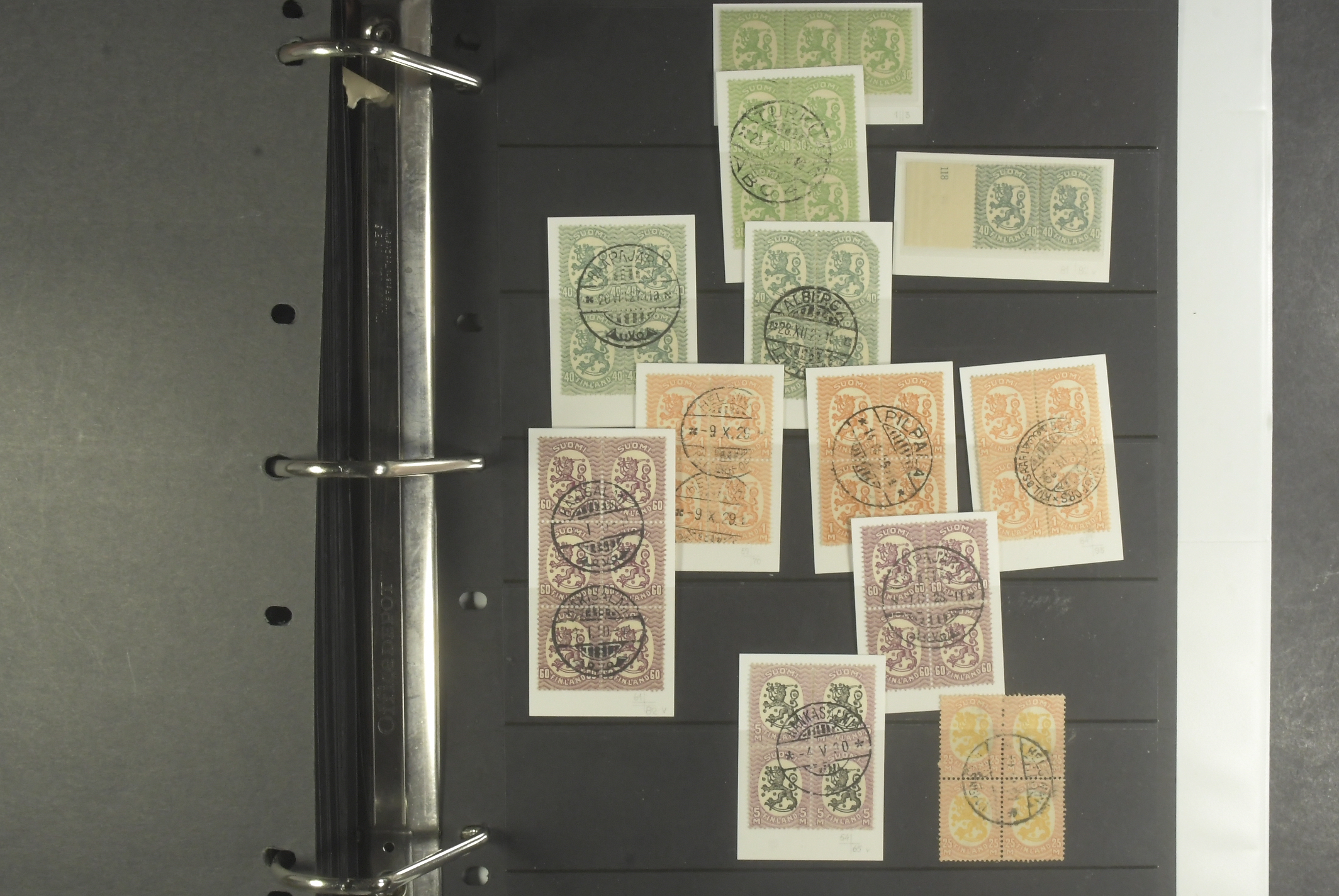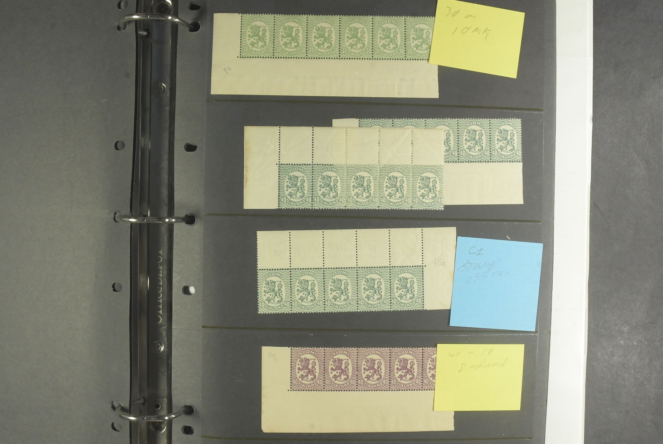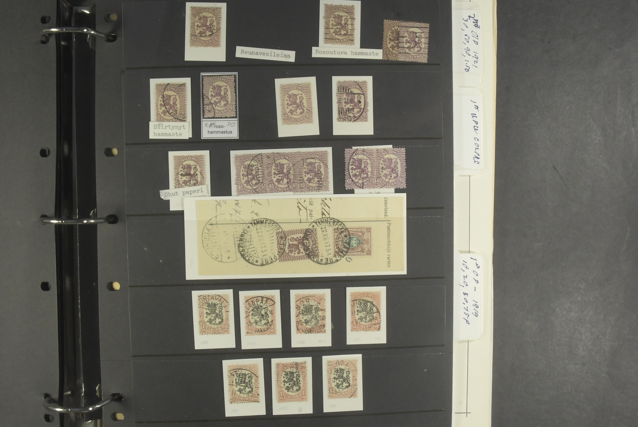 Finland. ★/⊙. An extraordinary range, very complex and scholarly even for the more experienced student of these issues, specifically for the first lion definitives of 1919 to 1929, all housed in four volumes with 1000s of stamps with countless varieties, unusual postmarks, lots of multiples, superb imprint blocks of six with the month and year of printing to determine the different papers, etc, etc. Much of this is a 'work in progress', as this collector expanded over a 40 year period of serious buying anything he could find. especially material that was different to the norm. It is because of this that while there are many pages of album leaves, there are also many more pages for the multiples housed in large stockcards, often written up accordingly to identify the stamps. Almost an impossible lot to describe as it is so in depth - anybody who is interested in this area of Finnish philately will be absolutely delighted in the breadth and scope of what is here. The viewing could take hours just to begin to appreciate this amazing holding. Approx. 6 kg.