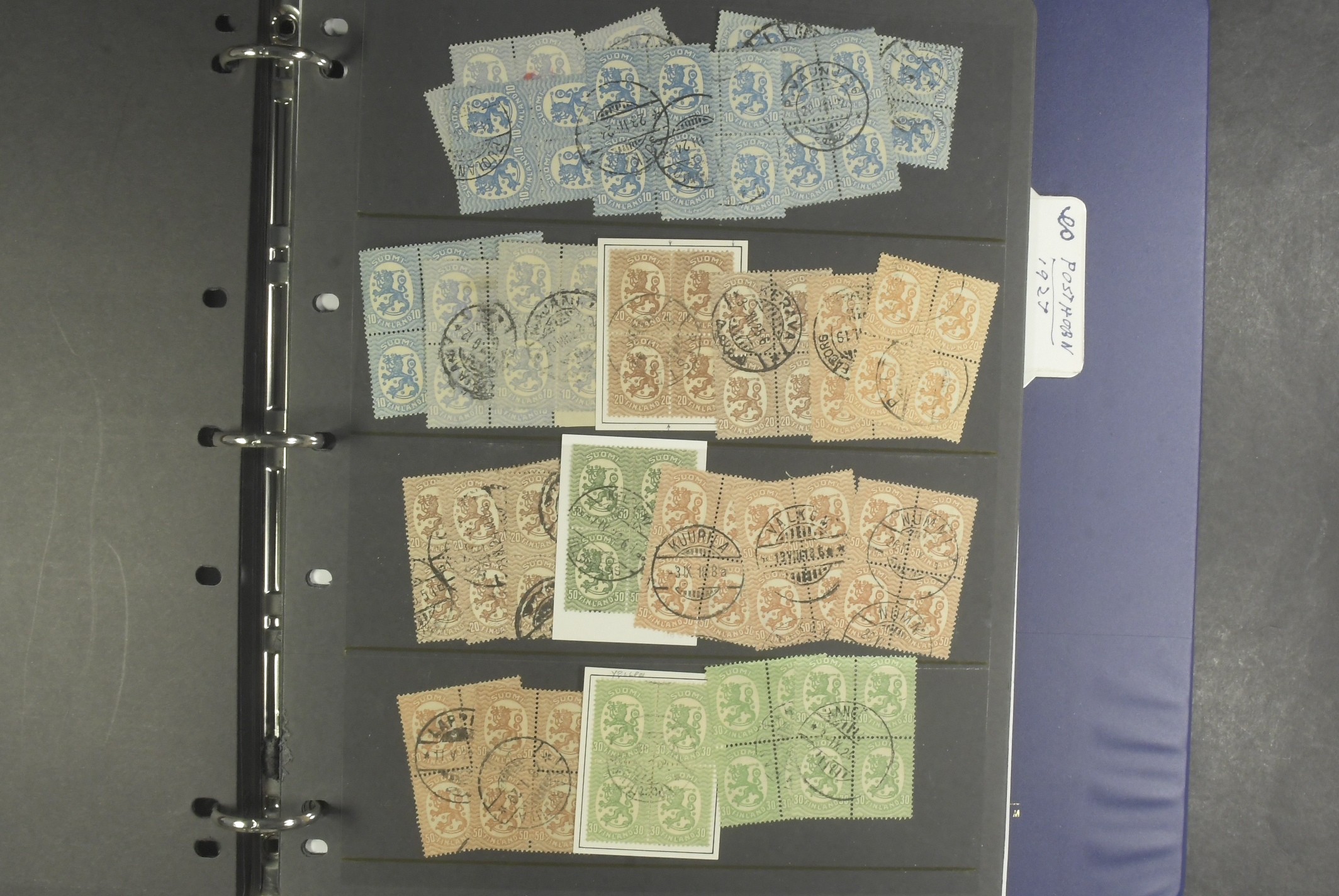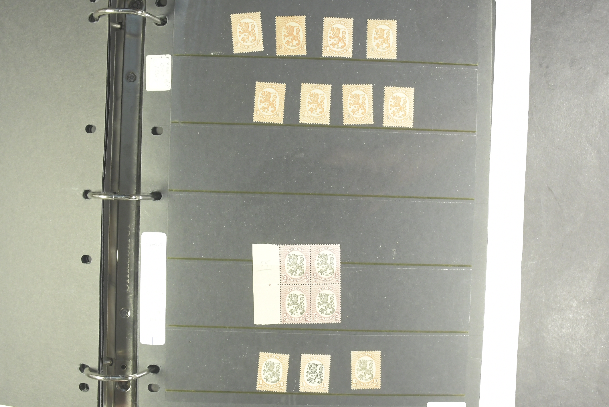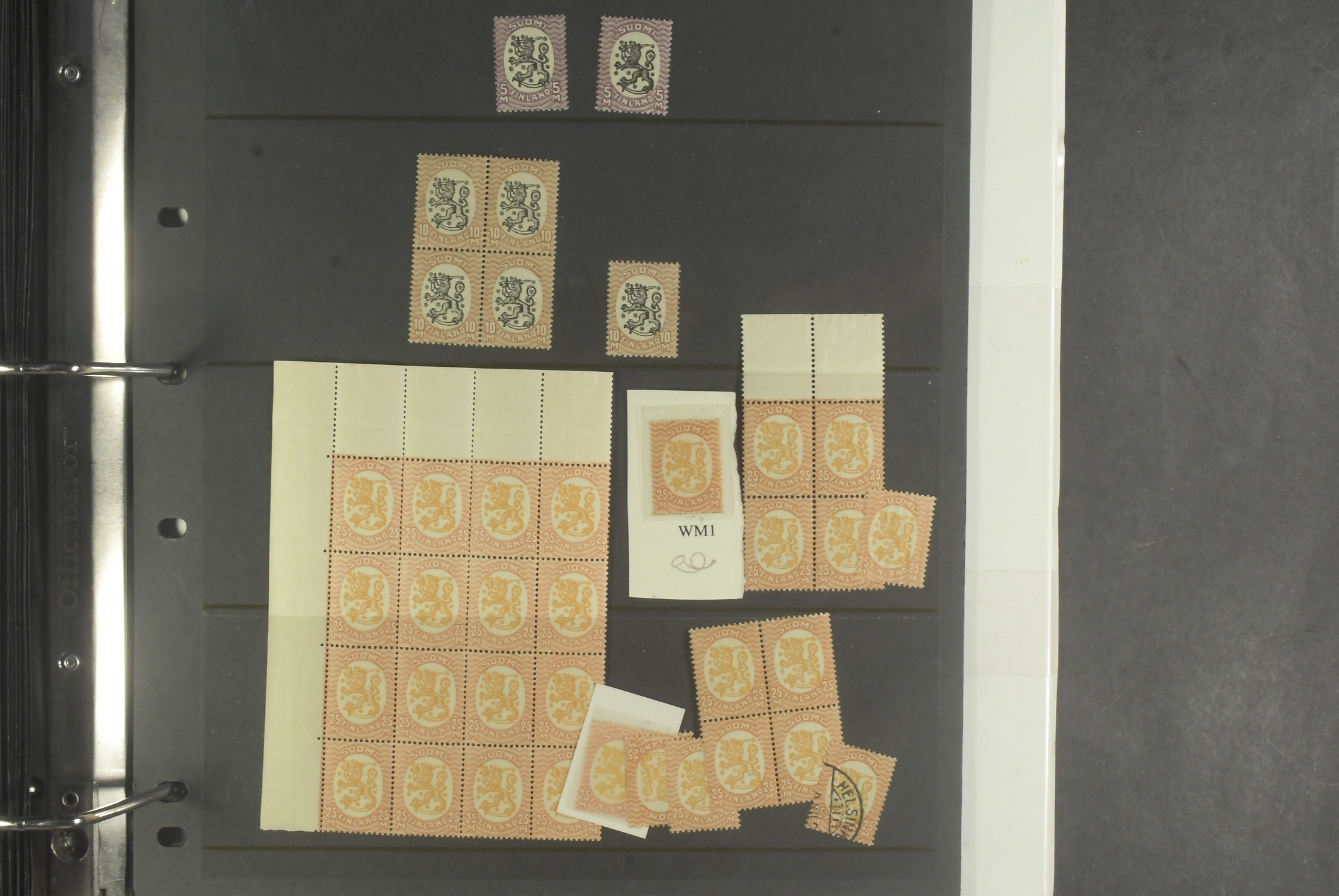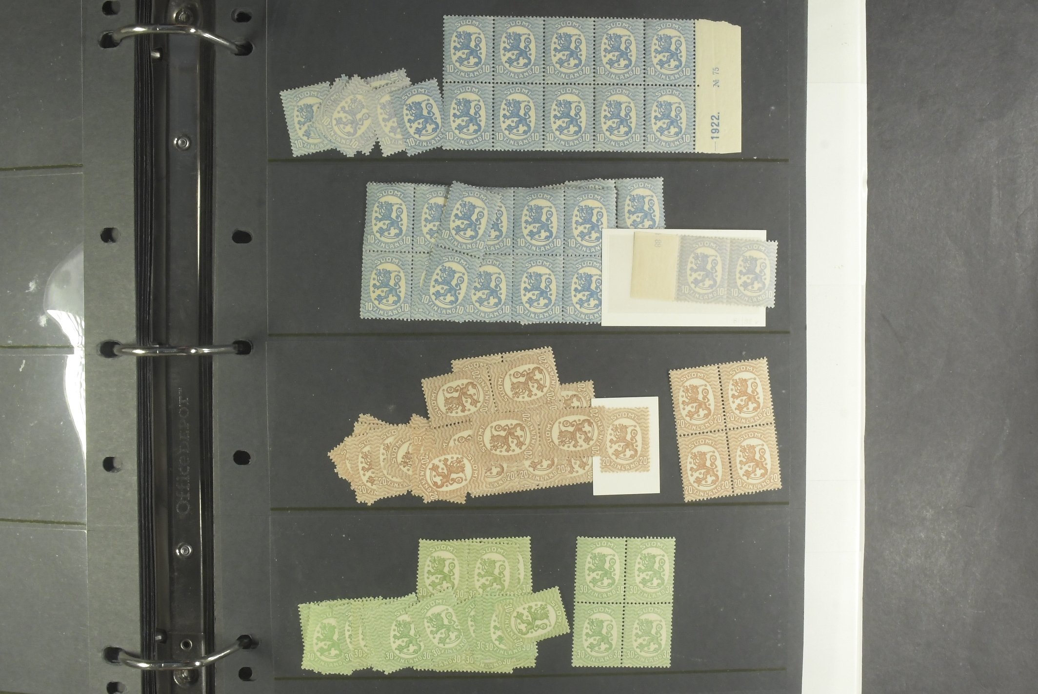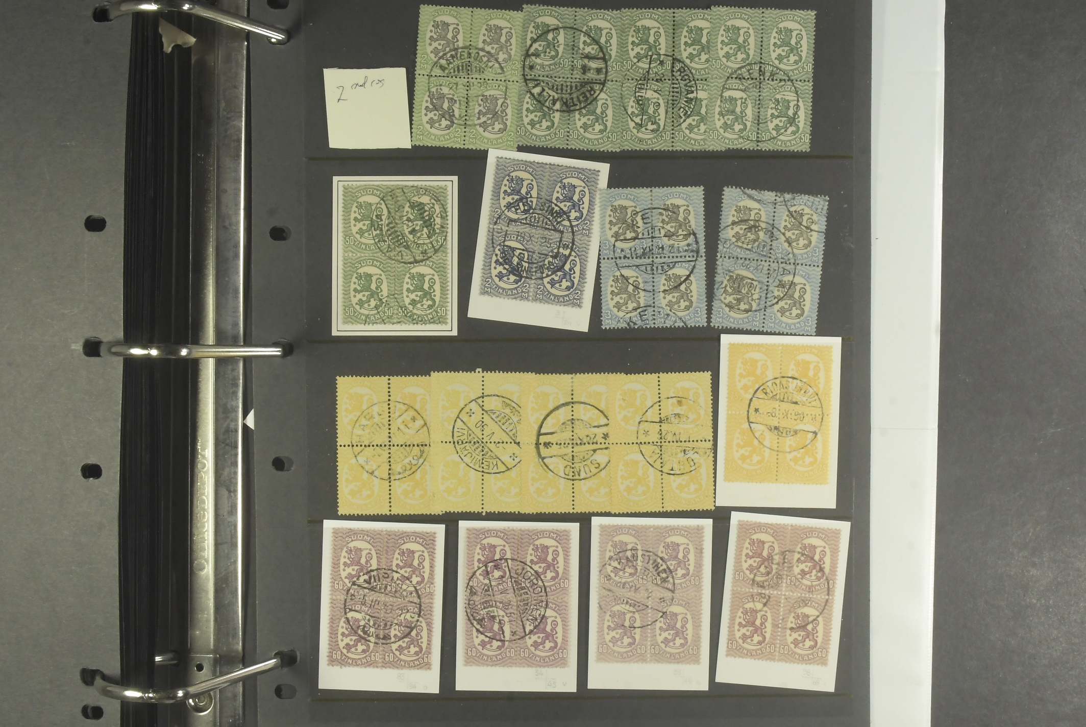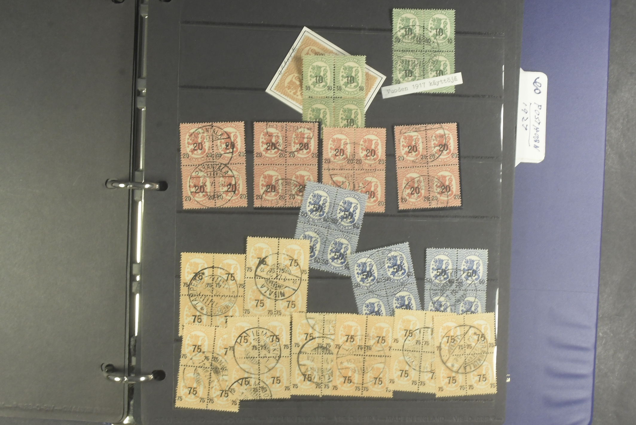 Finland. ★/⊙. An extraordinary range, very complex and scholarly even for the more experienced student of these issues, specifically for the first lion definitives of 1919 to 1929, all housed in four volumes with 1000s of stamps with countless varieties, unusual postmarks, lots of multiples, superb imprint blocks of six with the month and year of printing to determine the different papers, etc, etc. Much of this is a 'work in progress', as this collector expanded over a 40 year period of serious buying anything he could find. especially material that was different to the norm. It is because of this that while there are many pages of album leaves, there are also many more pages for the multiples housed in large stockcards, often written up accordingly to identify the stamps. Almost an impossible lot to describe as it is so in depth - anybody who is interested in this area of Finnish philately will be absolutely delighted in the breadth and scope of what is here. The viewing could take hours just to begin to appreciate this amazing holding. Approx. 6 kg.
