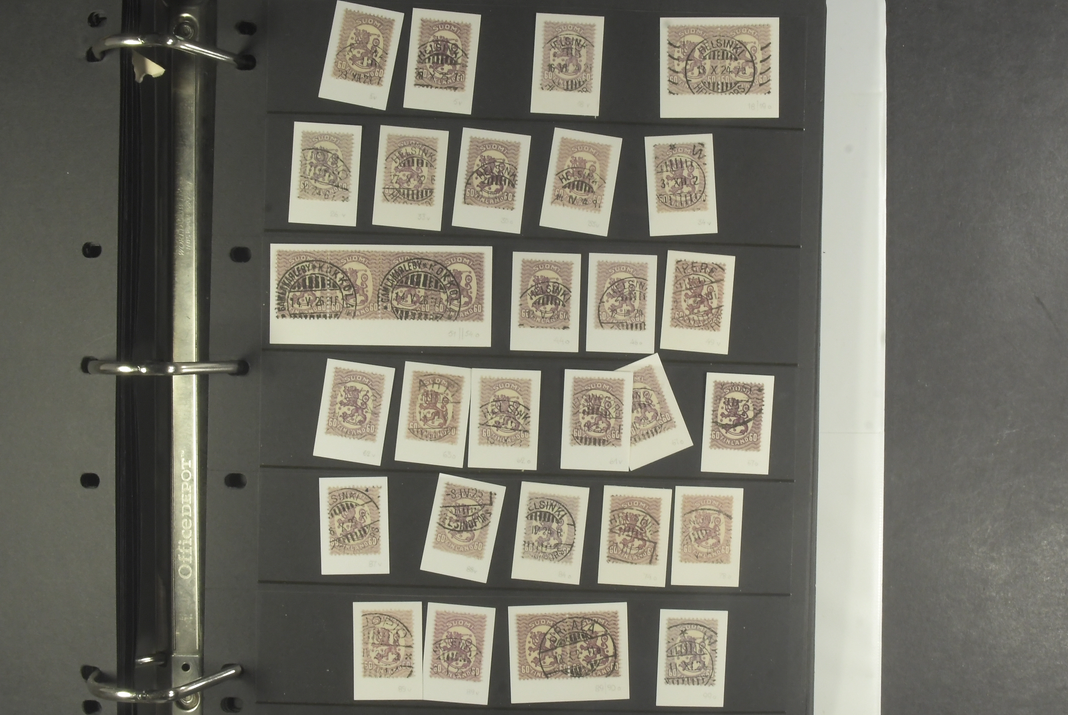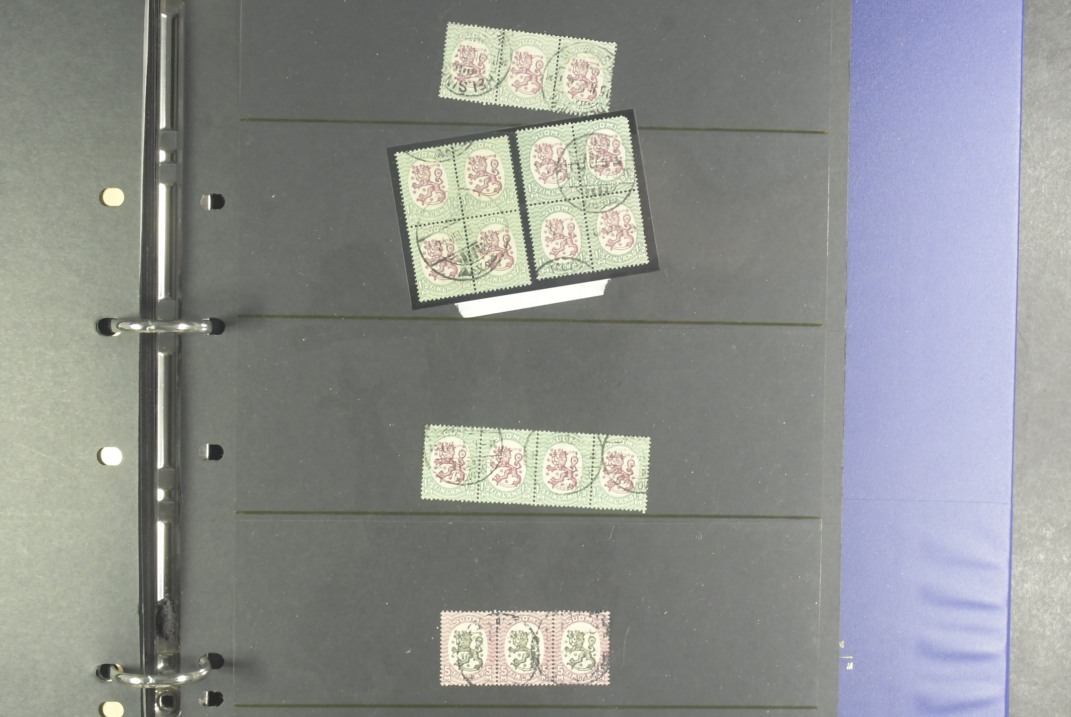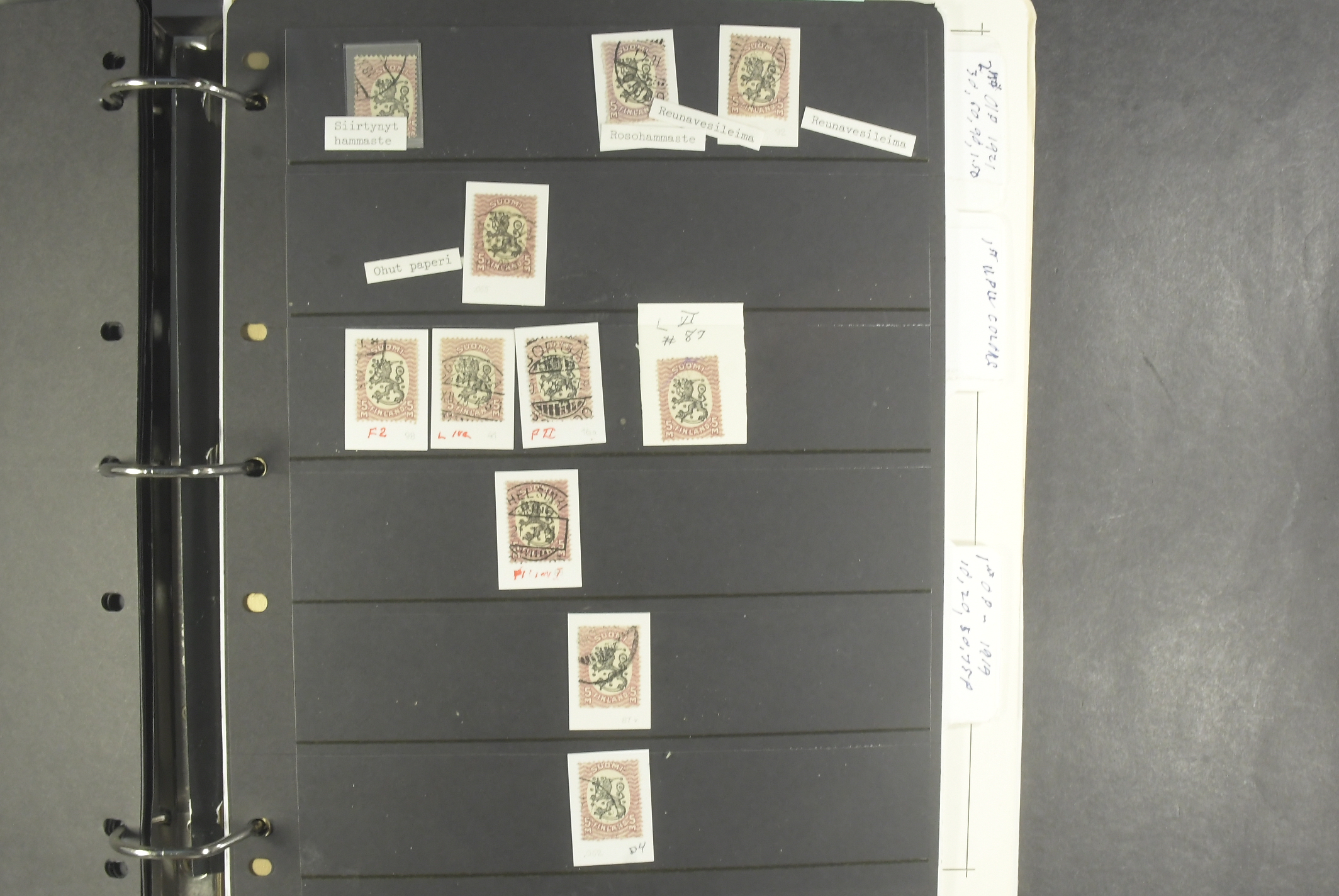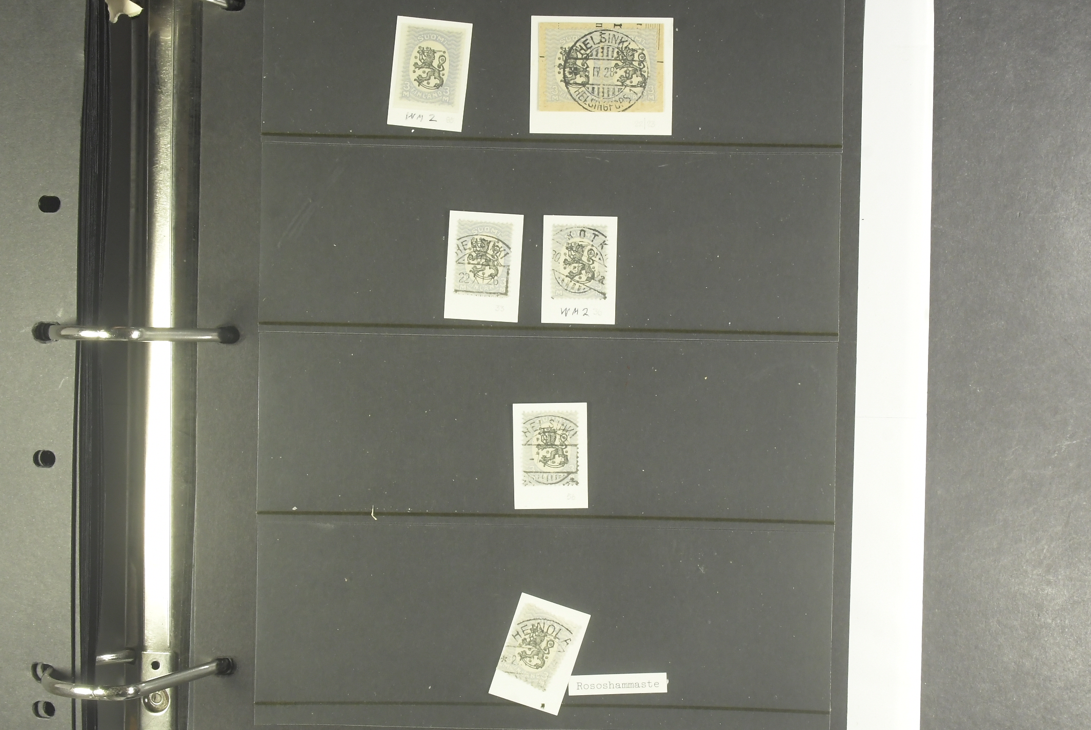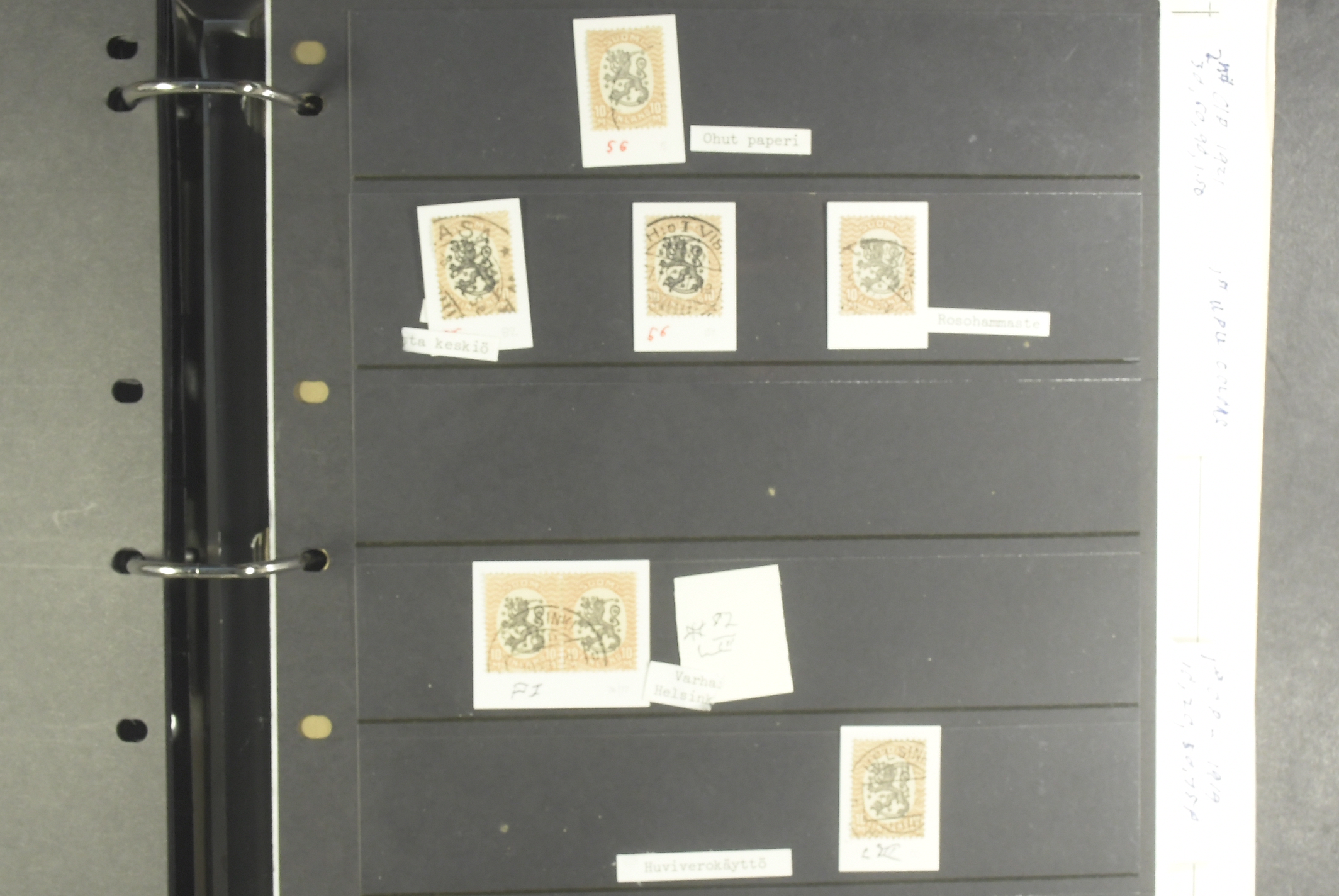 Finland. ★/⊙. An extraordinary range, very complex and scholarly even for the more experienced student of these issues, specifically for the first lion definitives of 1919 to 1929, all housed in four volumes with 1000s of stamps with countless varieties, unusual postmarks, lots of multiples, superb imprint blocks of six with the month and year of printing to determine the different papers, etc, etc. Much of this is a 'work in progress', as this collector expanded over a 40 year period of serious buying anything he could find. especially material that was different to the norm. It is because of this that while there are many pages of album leaves, there are also many more pages for the multiples housed in large stockcards, often written up accordingly to identify the stamps. Almost an impossible lot to describe as it is so in depth - anybody who is interested in this area of Finnish philately will be absolutely delighted in the breadth and scope of what is here. The viewing could take hours just to begin to appreciate this amazing holding. Approx. 6 kg.