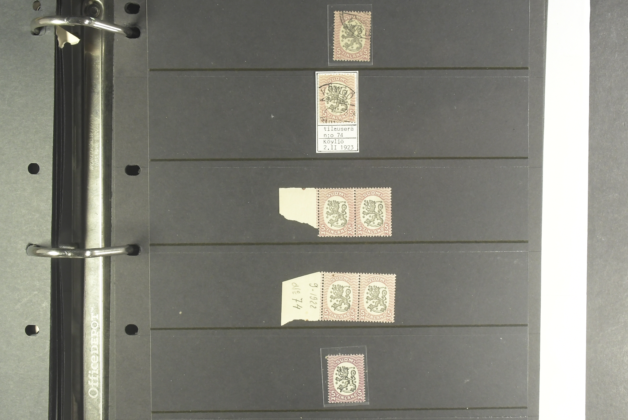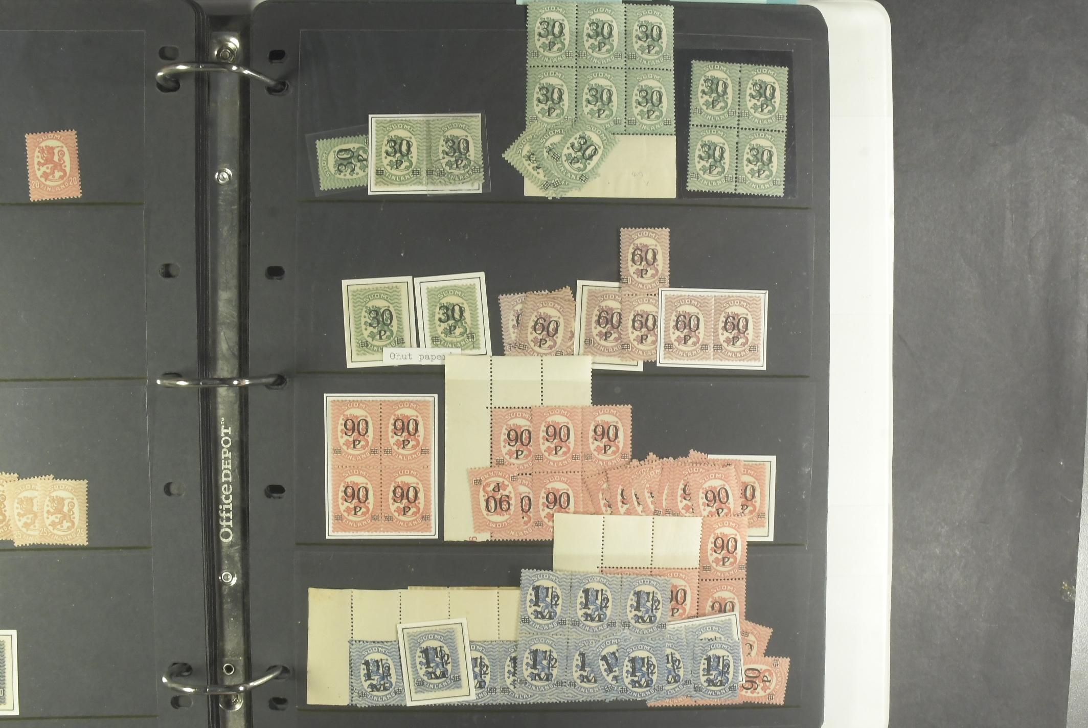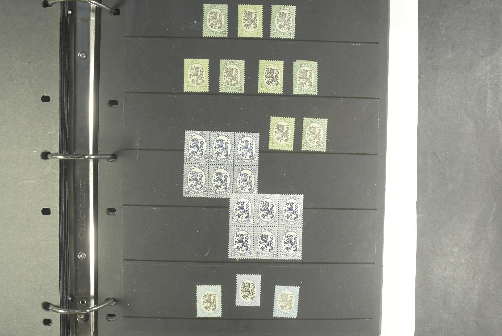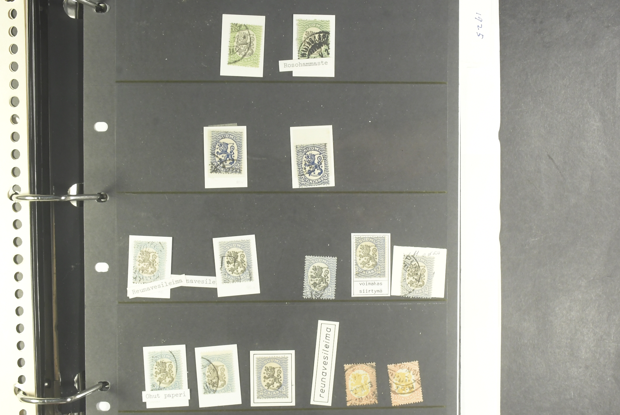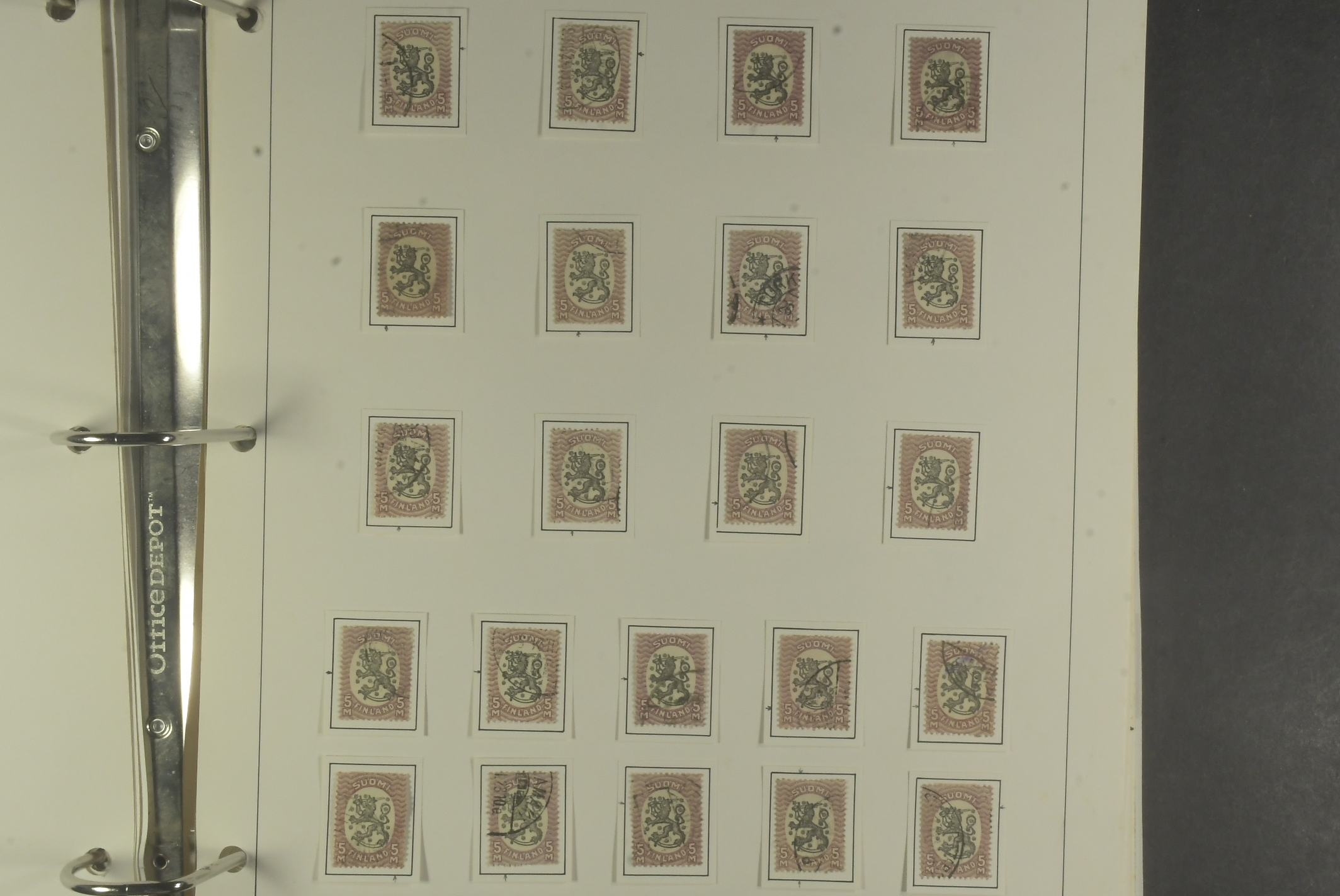 Finland. ★/⊙. An extraordinary range, very complex and scholarly even for the more experienced student of these issues, specifically for the first lion definitives of 1919 to 1929, all housed in four volumes with 1000s of stamps with countless varieties, unusual postmarks, lots of multiples, superb imprint blocks of six with the month and year of printing to determine the different papers, etc, etc. Much of this is a 'work in progress', as this collector expanded over a 40 year period of serious buying anything he could find. especially material that was different to the norm. It is because of this that while there are many pages of album leaves, there are also many more pages for the multiples housed in large stockcards, often written up accordingly to identify the stamps. Almost an impossible lot to describe as it is so in depth - anybody who is interested in this area of Finnish philately will be absolutely delighted in the breadth and scope of what is here. The viewing could take hours just to begin to appreciate this amazing holding. Approx. 6 kg.