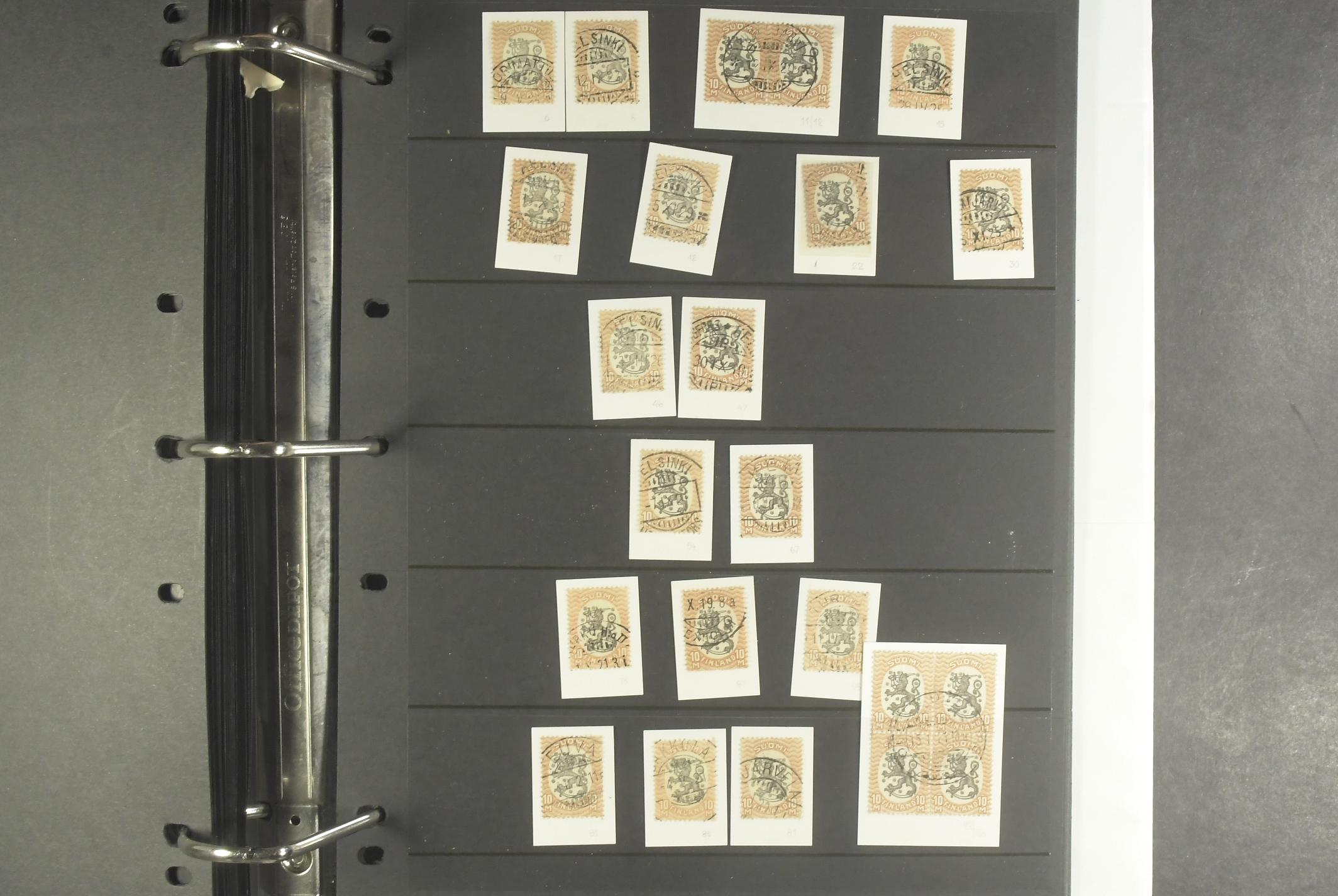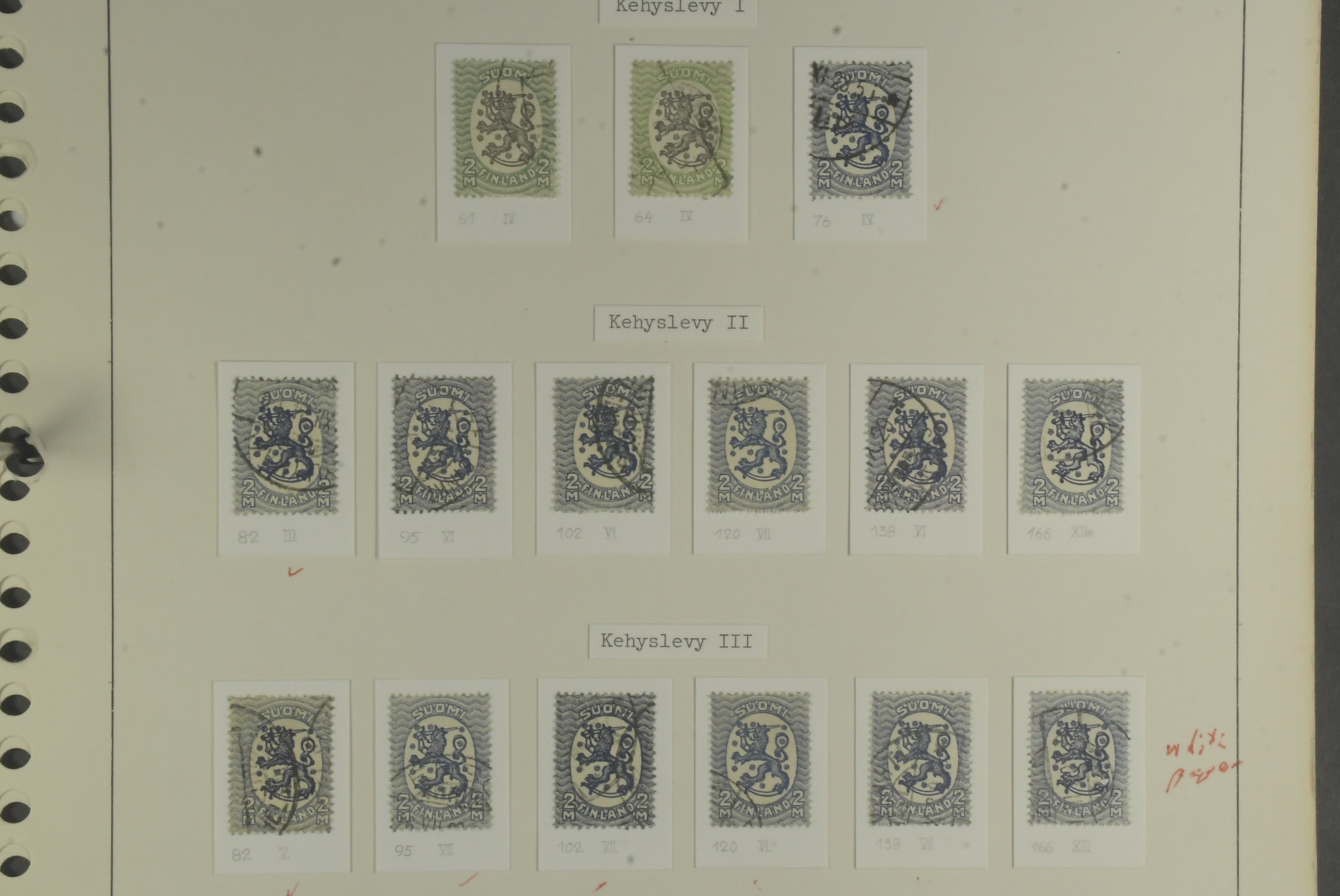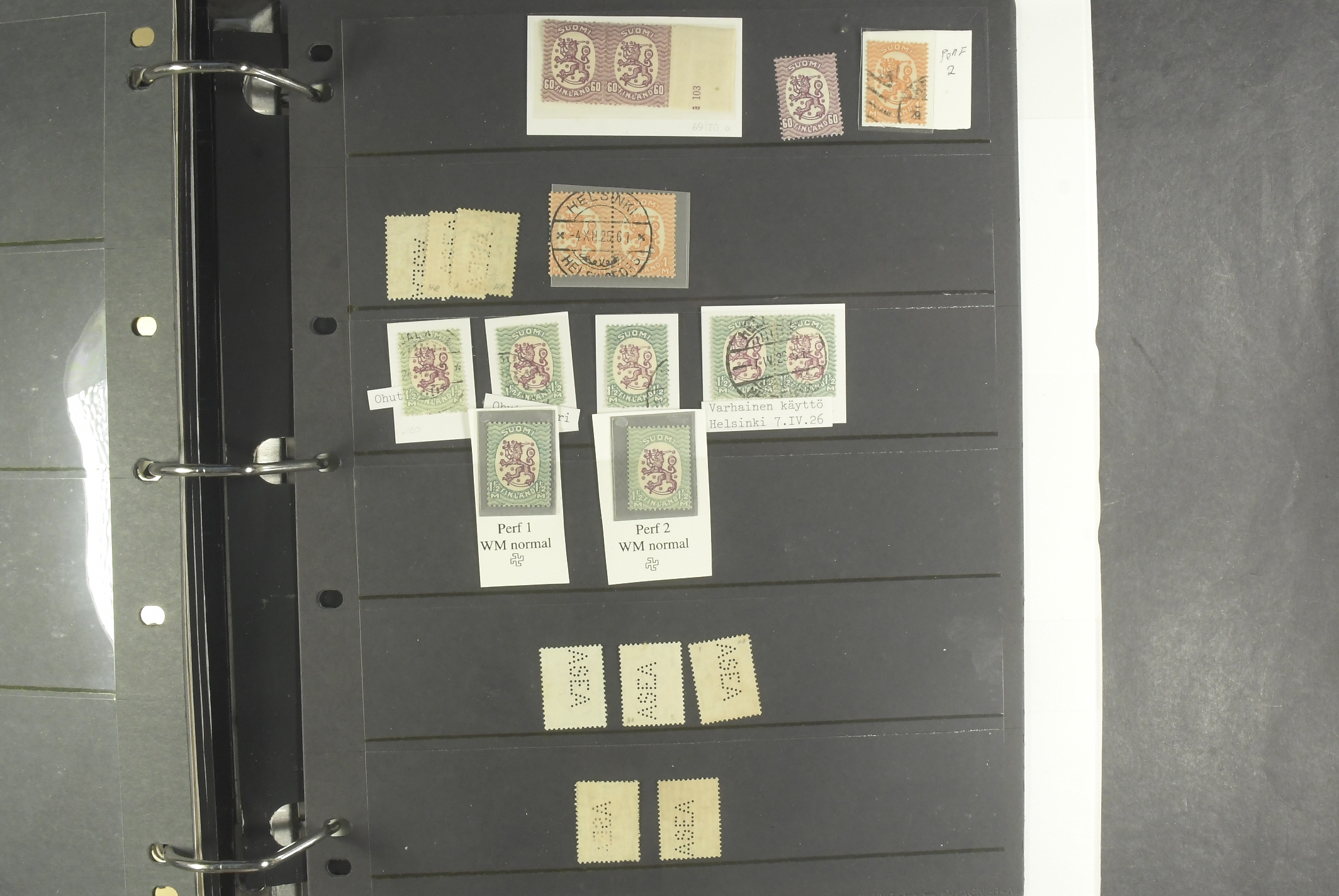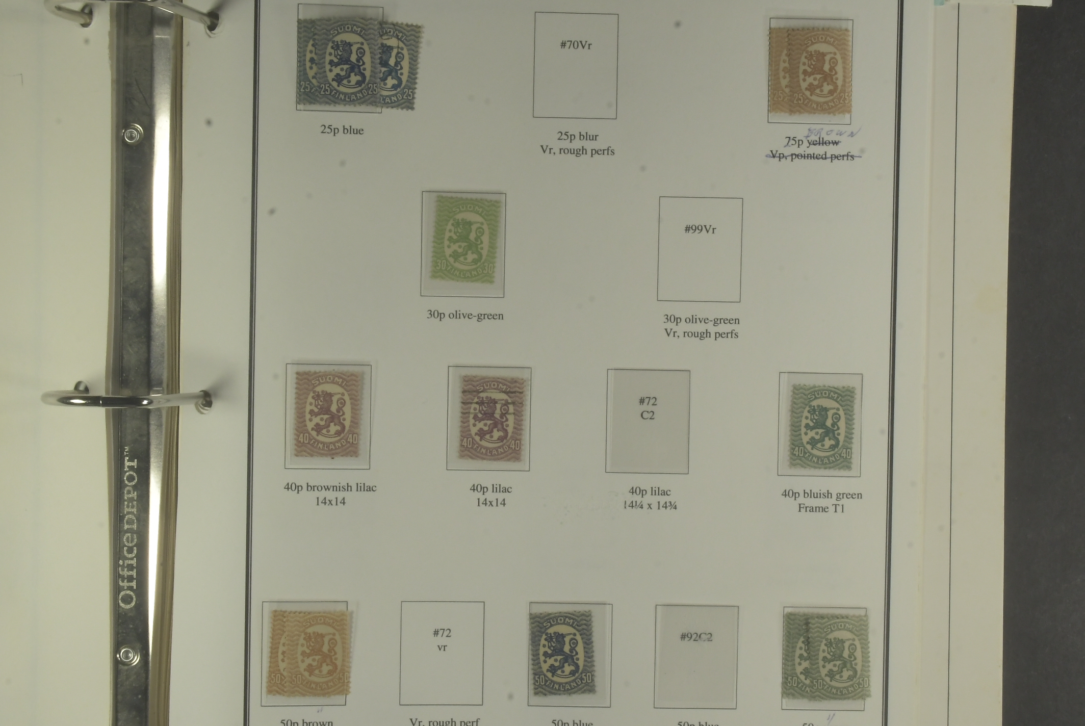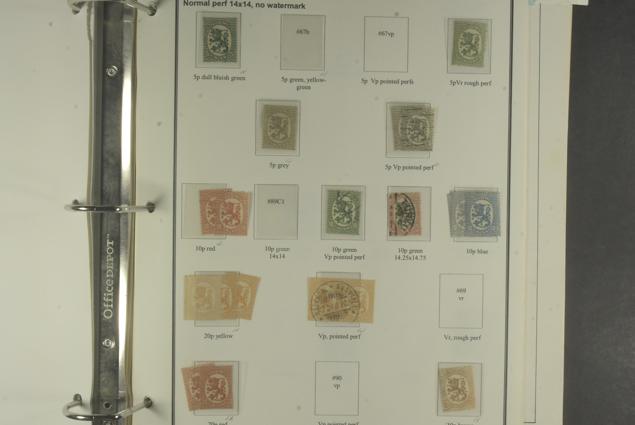 Finland. ★/⊙. An extraordinary range, very complex and scholarly even for the more experienced student of these issues, specifically for the first lion definitives of 1919 to 1929, all housed in four volumes with 1000s of stamps with countless varieties, unusual postmarks, lots of multiples, superb imprint blocks of six with the month and year of printing to determine the different papers, etc, etc. Much of this is a 'work in progress', as this collector expanded over a 40 year period of serious buying anything he could find. especially material that was different to the norm. It is because of this that while there are many pages of album leaves, there are also many more pages for the multiples housed in large stockcards, often written up accordingly to identify the stamps. Almost an impossible lot to describe as it is so in depth - anybody who is interested in this area of Finnish philately will be absolutely delighted in the breadth and scope of what is here. The viewing could take hours just to begin to appreciate this amazing holding. Approx. 6 kg.