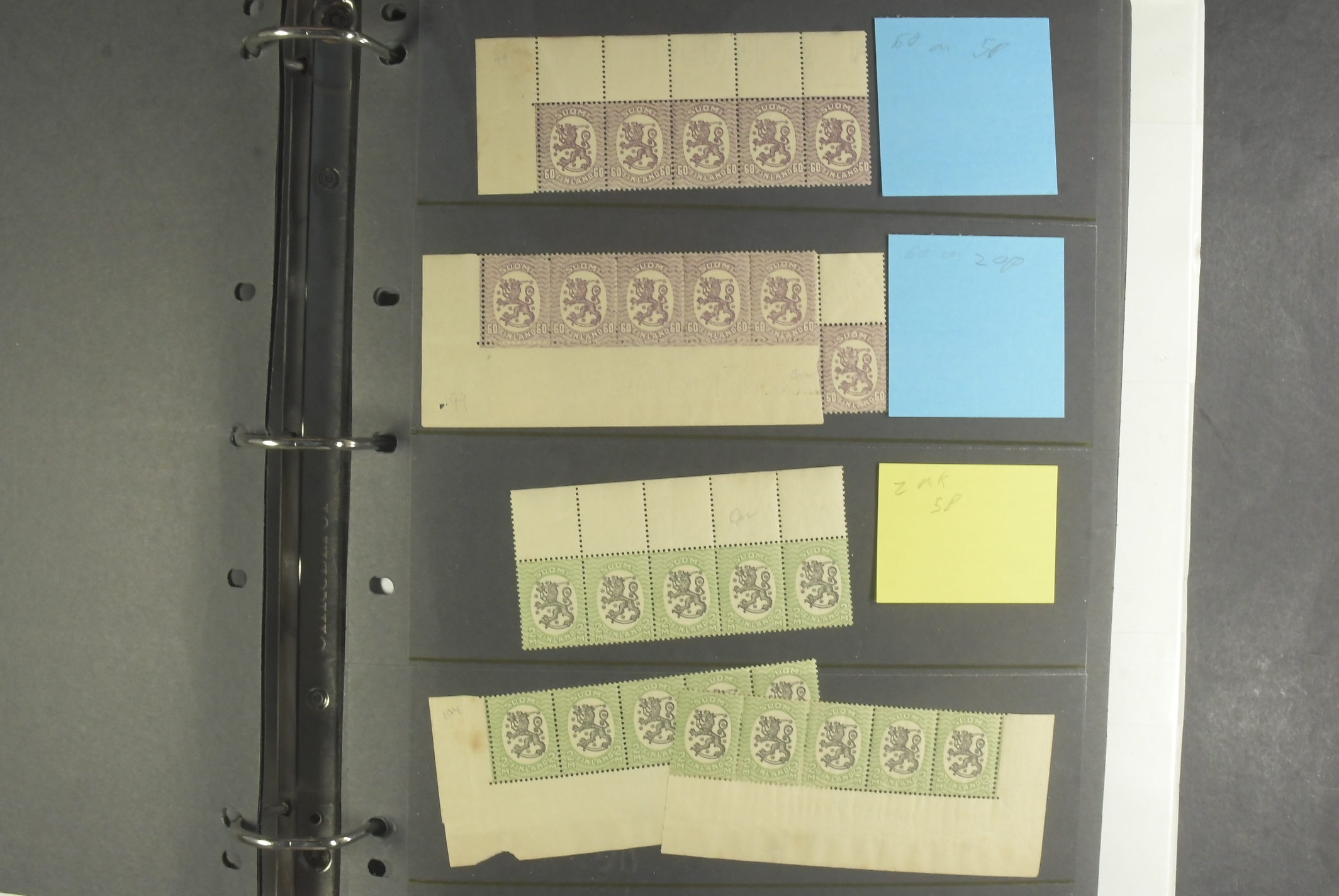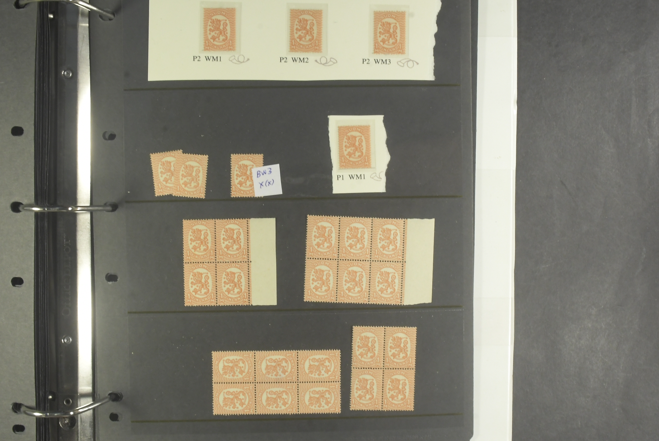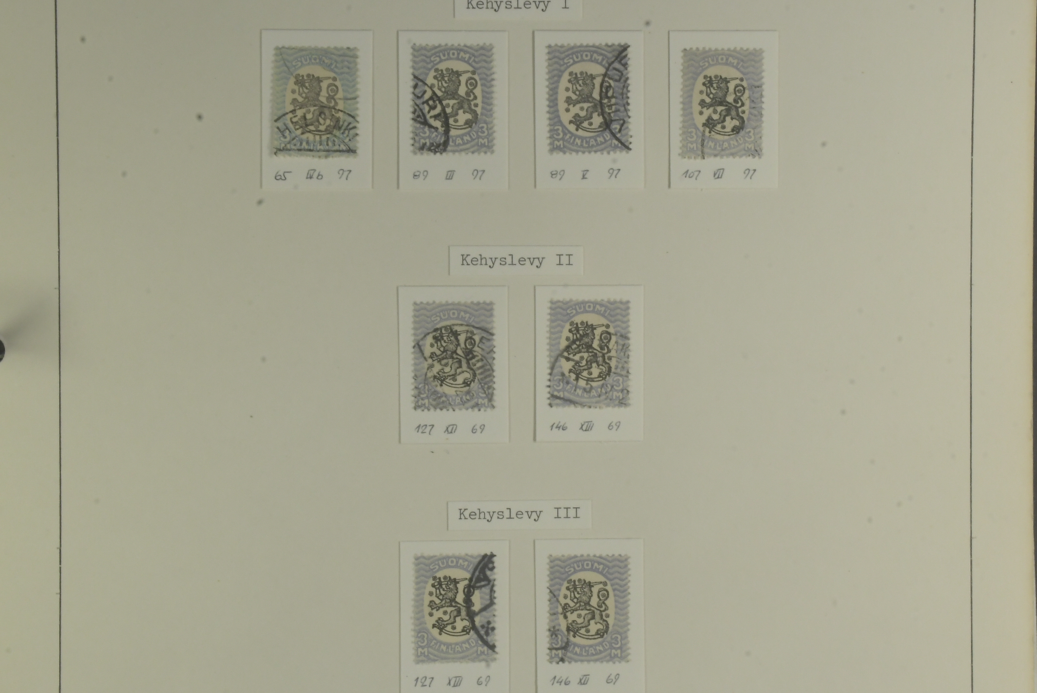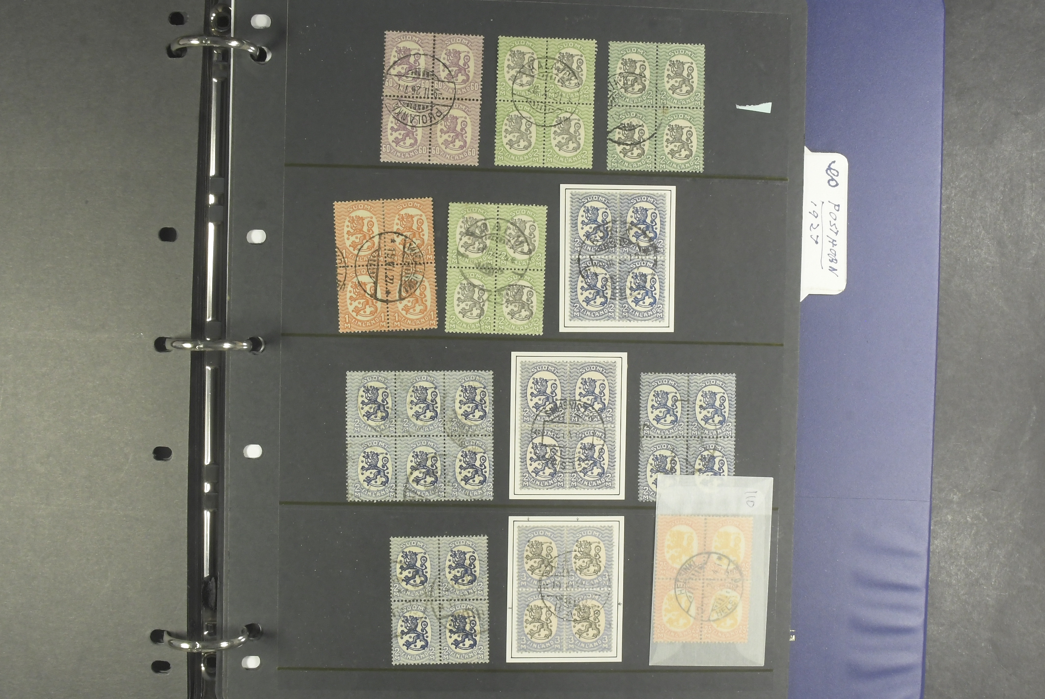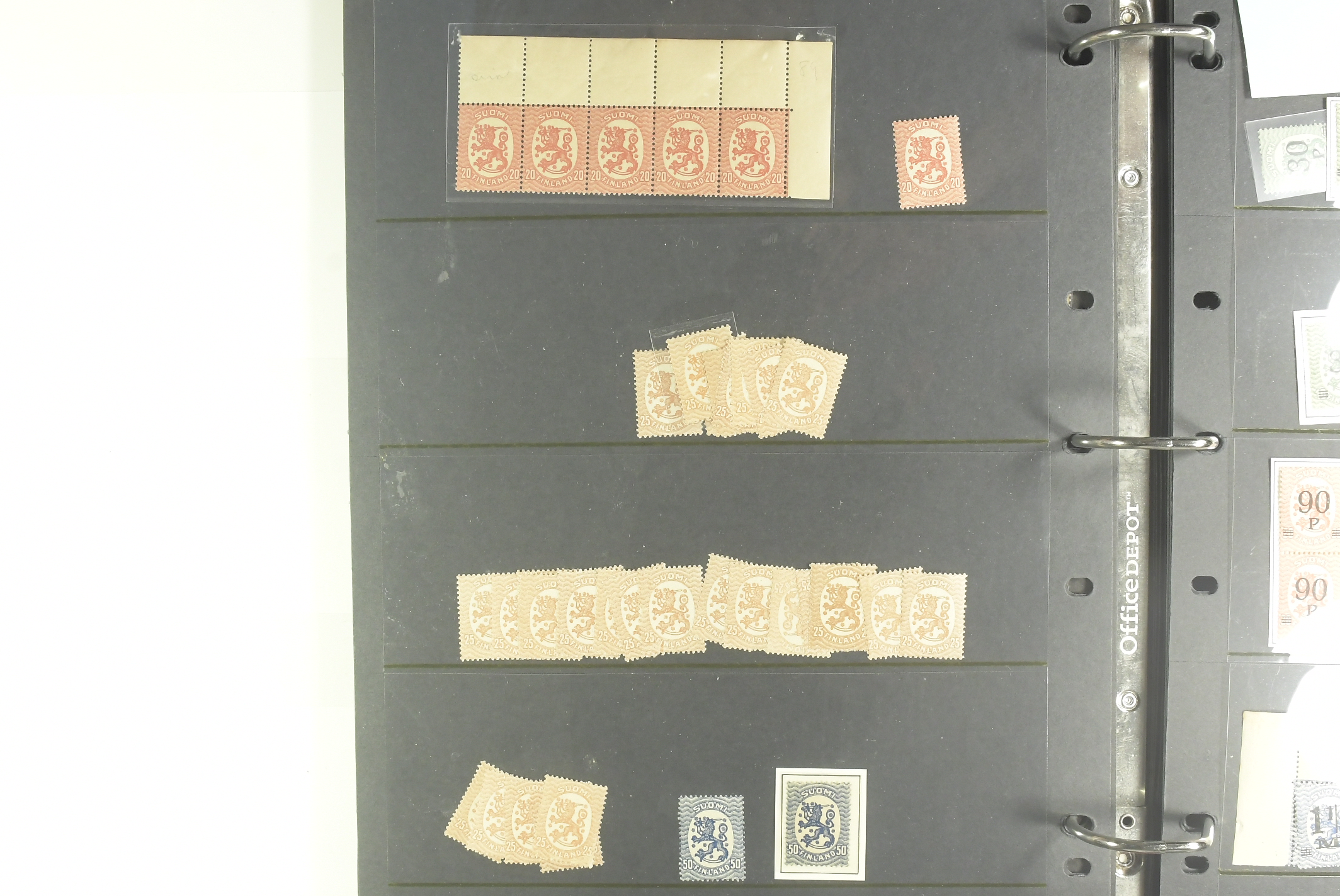Finland. ★/⊙. An extraordinary range, very complex and scholarly even for the more experienced student of these issues, specifically for the first lion definitives of 1919 to 1929, all housed in four volumes with 1000s of stamps with countless varieties, unusual postmarks, lots of multiples, superb imprint blocks of six with the month and year of printing to determine the different papers, etc, etc. Much of this is a 'work in progress', as this collector expanded over a 40 year period of serious buying anything he could find. especially material that was different to the norm. It is because of this that while there are many pages of album leaves, there are also many more pages for the multiples housed in large stockcards, often written up accordingly to identify the stamps. Almost an impossible lot to describe as it is so in depth - anybody who is interested in this area of Finnish philately will be absolutely delighted in the breadth and scope of what is here. The viewing could take hours just to begin to appreciate this amazing holding. Approx. 6 kg.