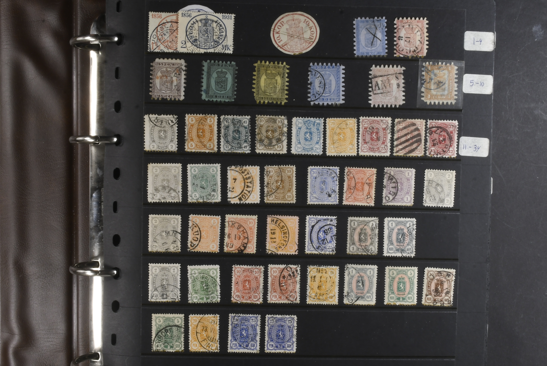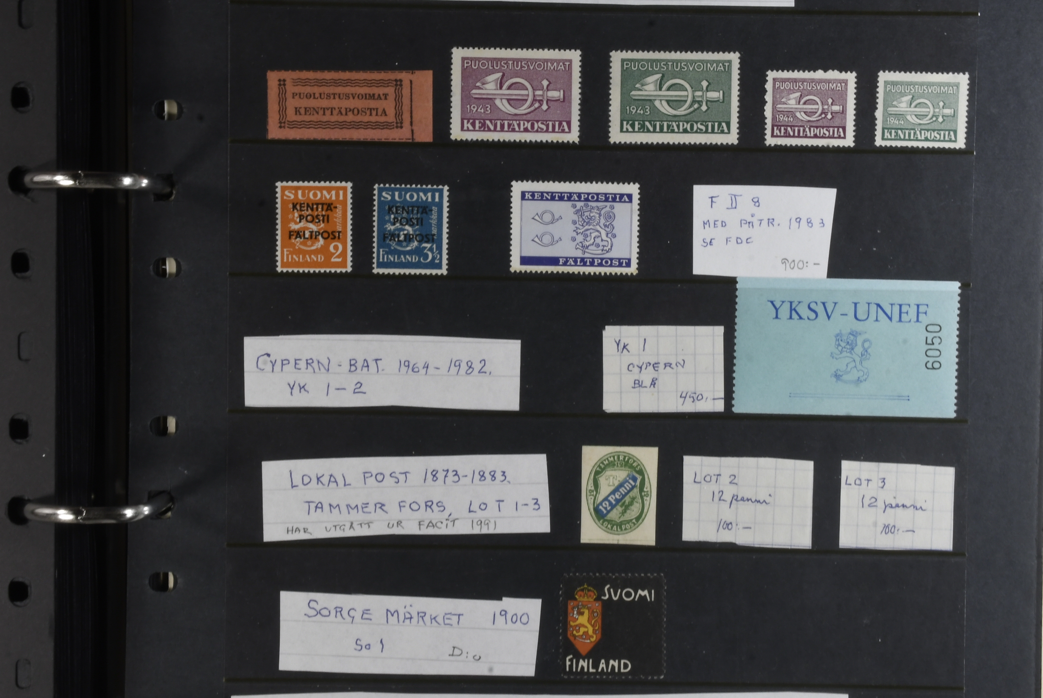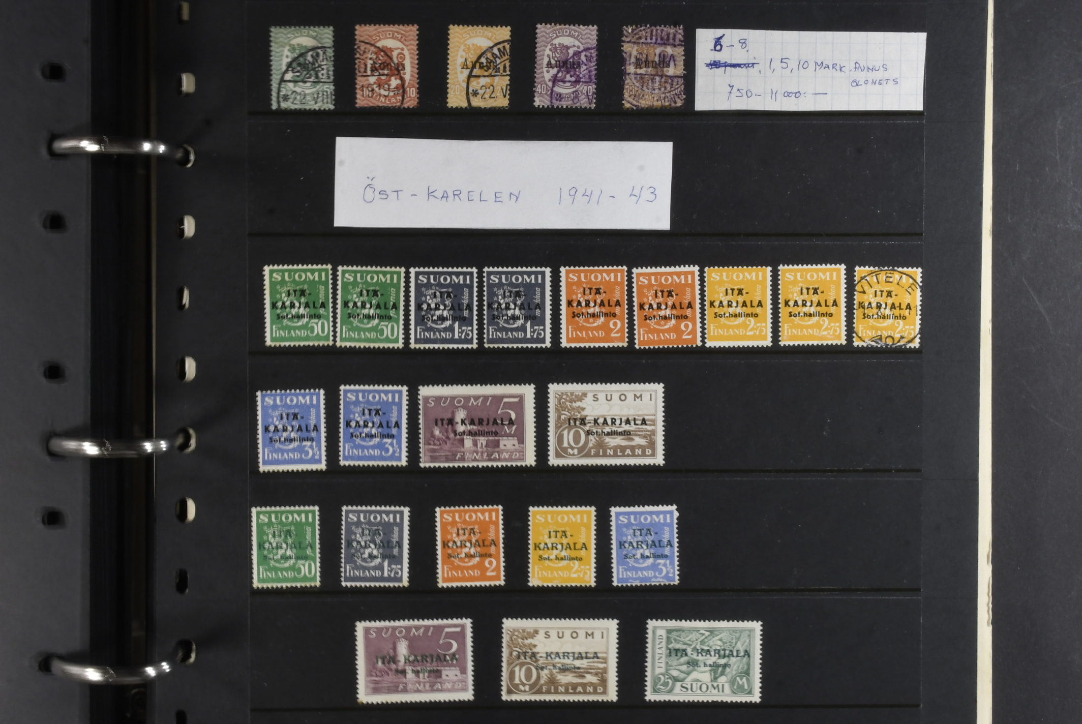 Finland. Collection ★★/★/⊙ 1856–2007 in album. Well filled collection with many better stamp. Condition is a bit mixed with some stamps with brown spots and some of the mint are with no gum e.g. Zeppelin and Karelen set. Uncounted € face value in the last few years and at the end a section of Aland is. Viewing is recommended. Please see a selection of scans at www.philea.se. Mixed quality. (1000+)