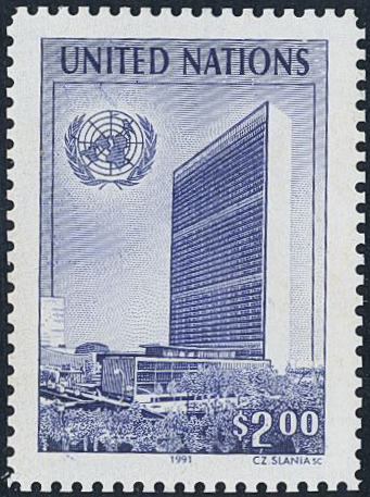 Thematics, Slania, FN New York. Michel 614. (★). 1991 UN Building $2 dark grey-blue. Stamp proof in ultramarine. Perforated.