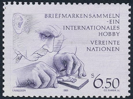 Thematics, Slania, FN Vienna. Michel 61. (★). 1986 Philately – The Internatinal hobby S 6.50. Stamp proof in dark ultramarine. Perforated.