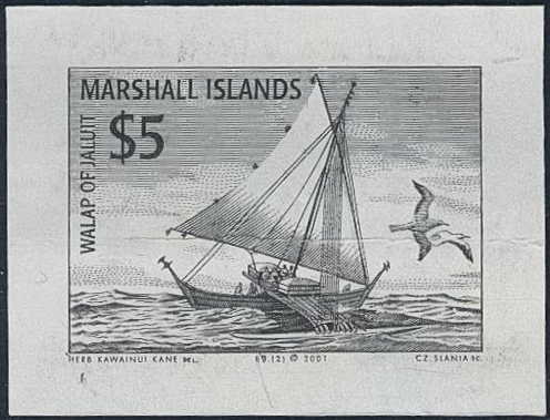 Thematics, Slania, Marshall Islands. Michel 1429. (★). 2001 Sailing canoe $ 5. Plate proof in grey. Horizontal fold due to printing process.