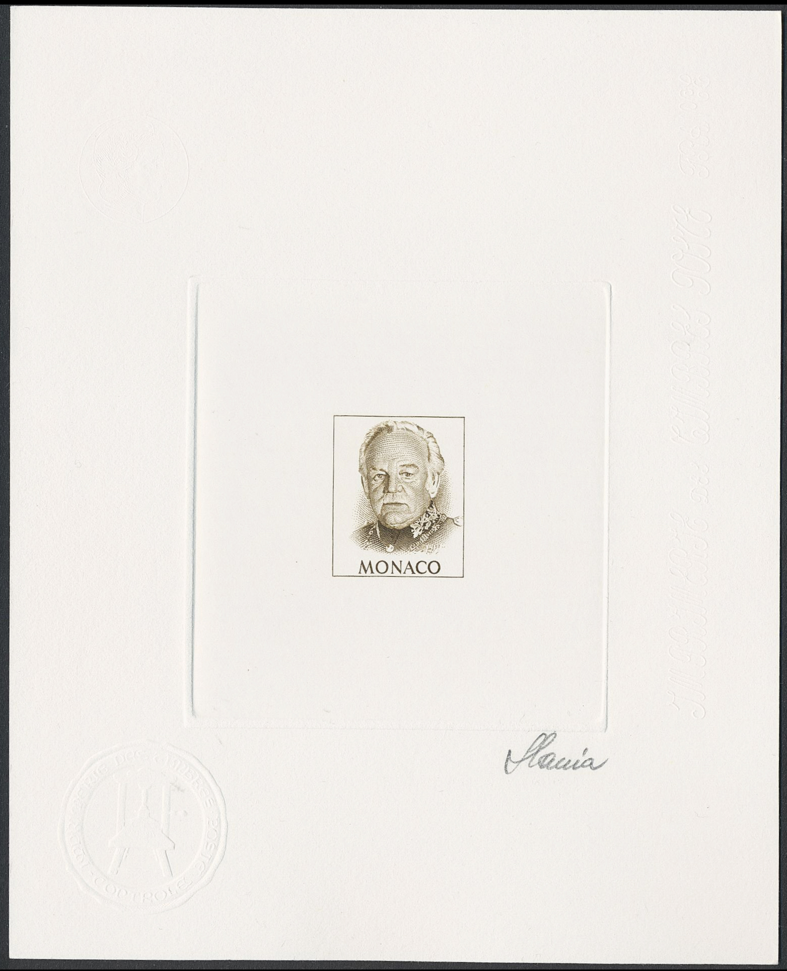 Thematics, Slania, Monaco. Michel 1911/2436. (★). 1989/2003 Prince Rainier III Plate proof without value in brown. Signed "Slania".