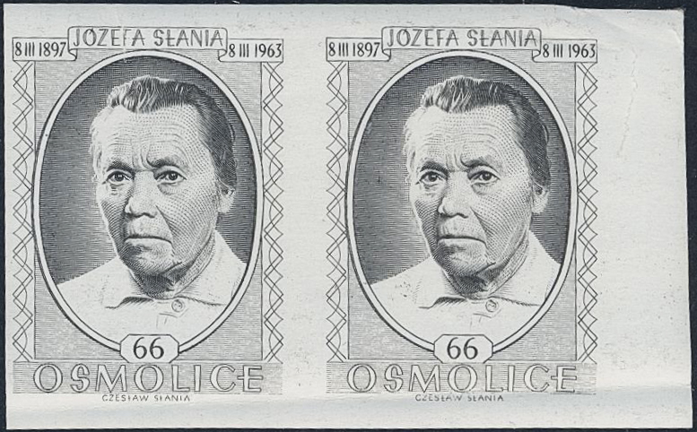 Thematics, Slania, Poland. ★★. JOZEFA SLANIA, Czeslaw Slania's mother. Engraving in grey for her 66th birthday 1963. Imperforated strip of five. Natural folds from production.