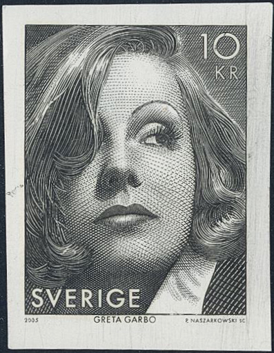 Thematics, Slania, Sweden. Facit 2508. (★). 2005 Greta Garbo 10 kr. Plate proof in greyish-black. Engraved by P. Naszarkowski, one of Slania's pupils.