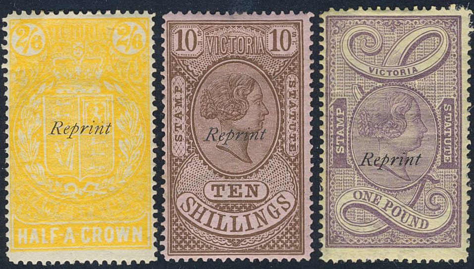 Australia, Victoria. SG 226, 229, 288 ★, 1884 2/6d, 10/- and £1 all with 'Reprint' overprint. Ordinary stamps catalogue value is £7925 – these are just as scarce if not scarcer than the originals.