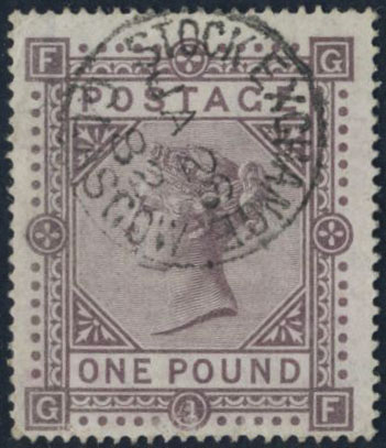 Britain. SG 129 used, 1878 QV One Pound Brown-lilac VF pmk Stock Exchange Glasgow JA 26 82. light face scuff over plate # and somewhat uneven perfs at left.