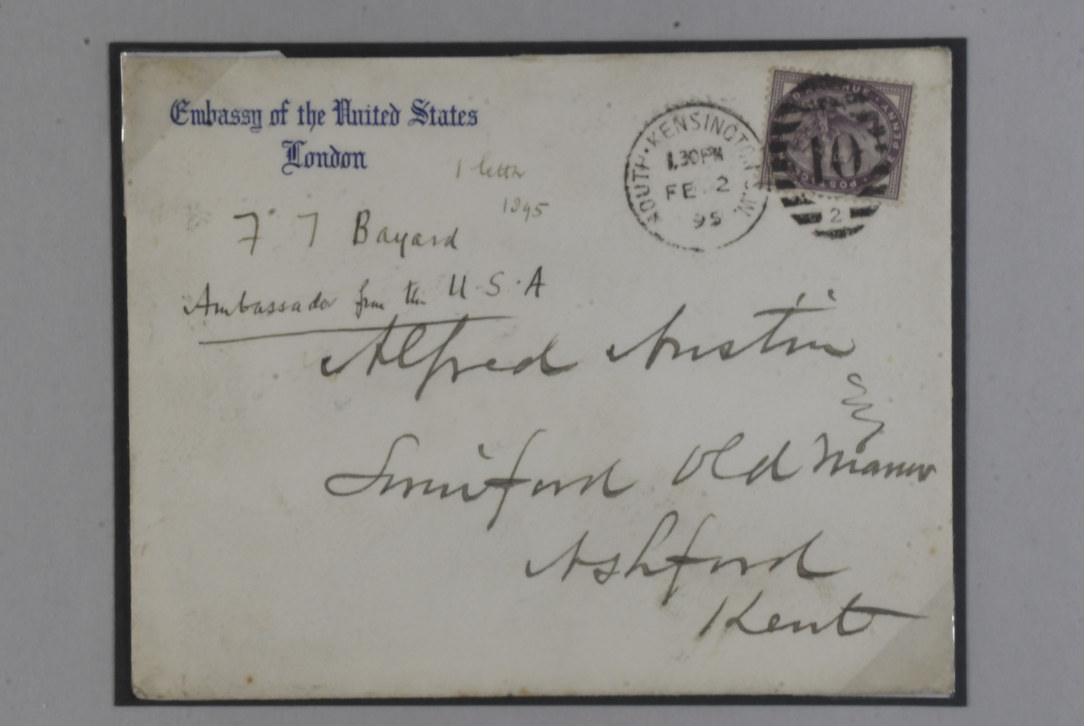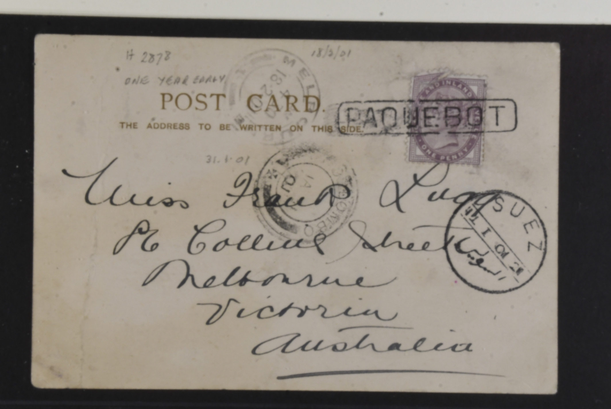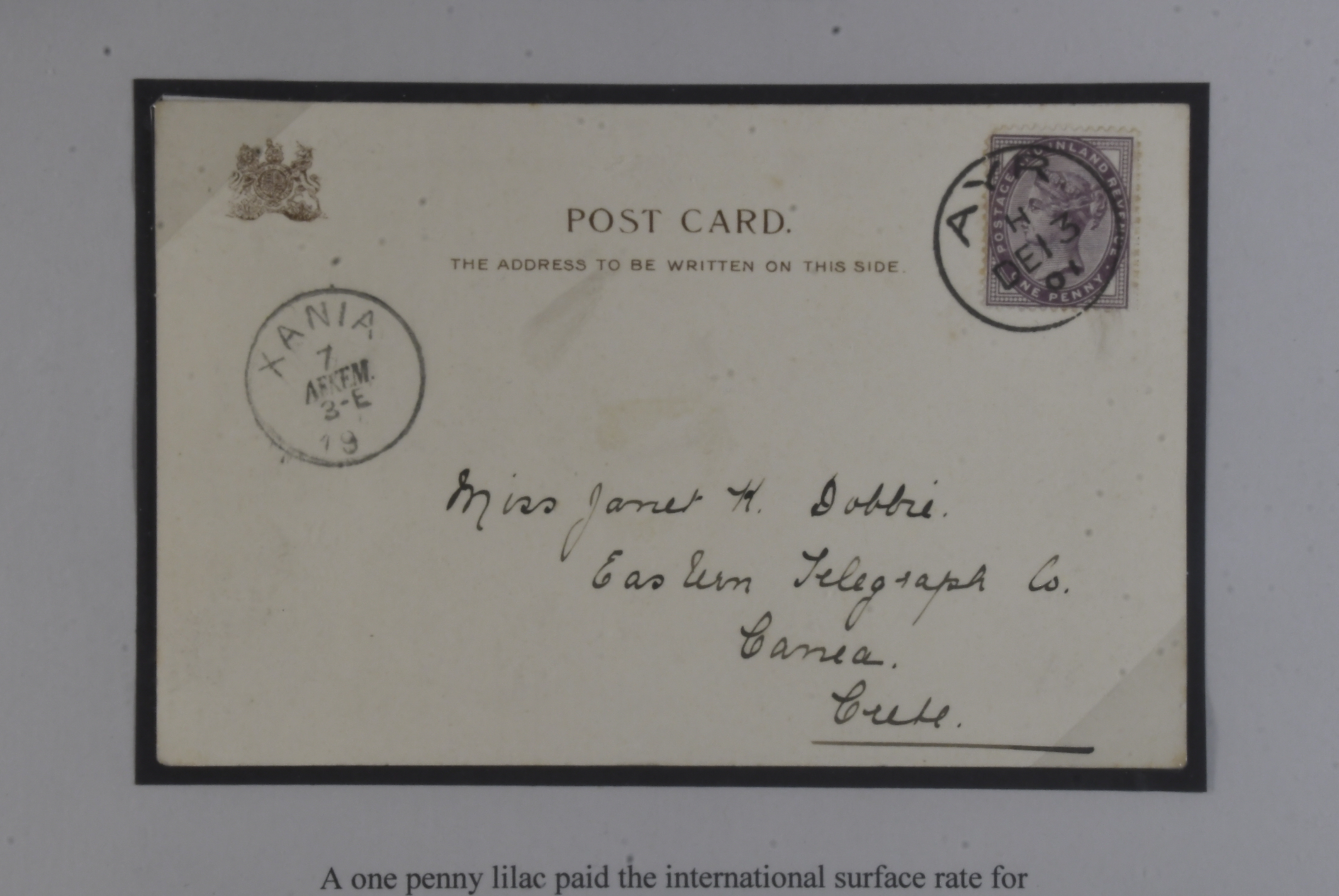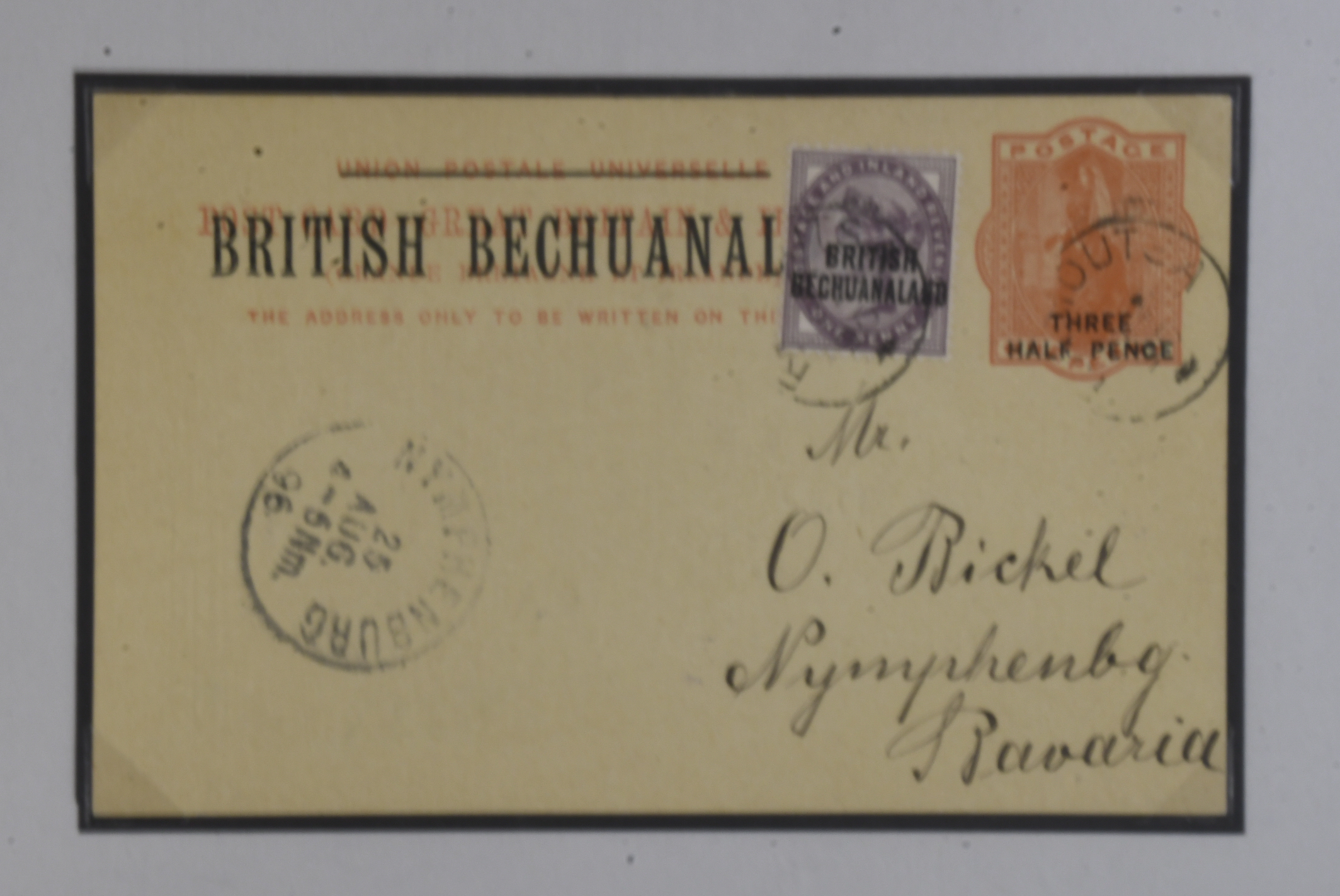 Britain. Covers. Penny lilac, four well written up postal history, one from the American ambassador, Alfred Austin, who later became 'poet laureate' after Tenneson. Then a lovely p/card to Xania, a Suez paqubot p/card to Australia and finally British Bechuanaland combination p.stat with three half pence combo.