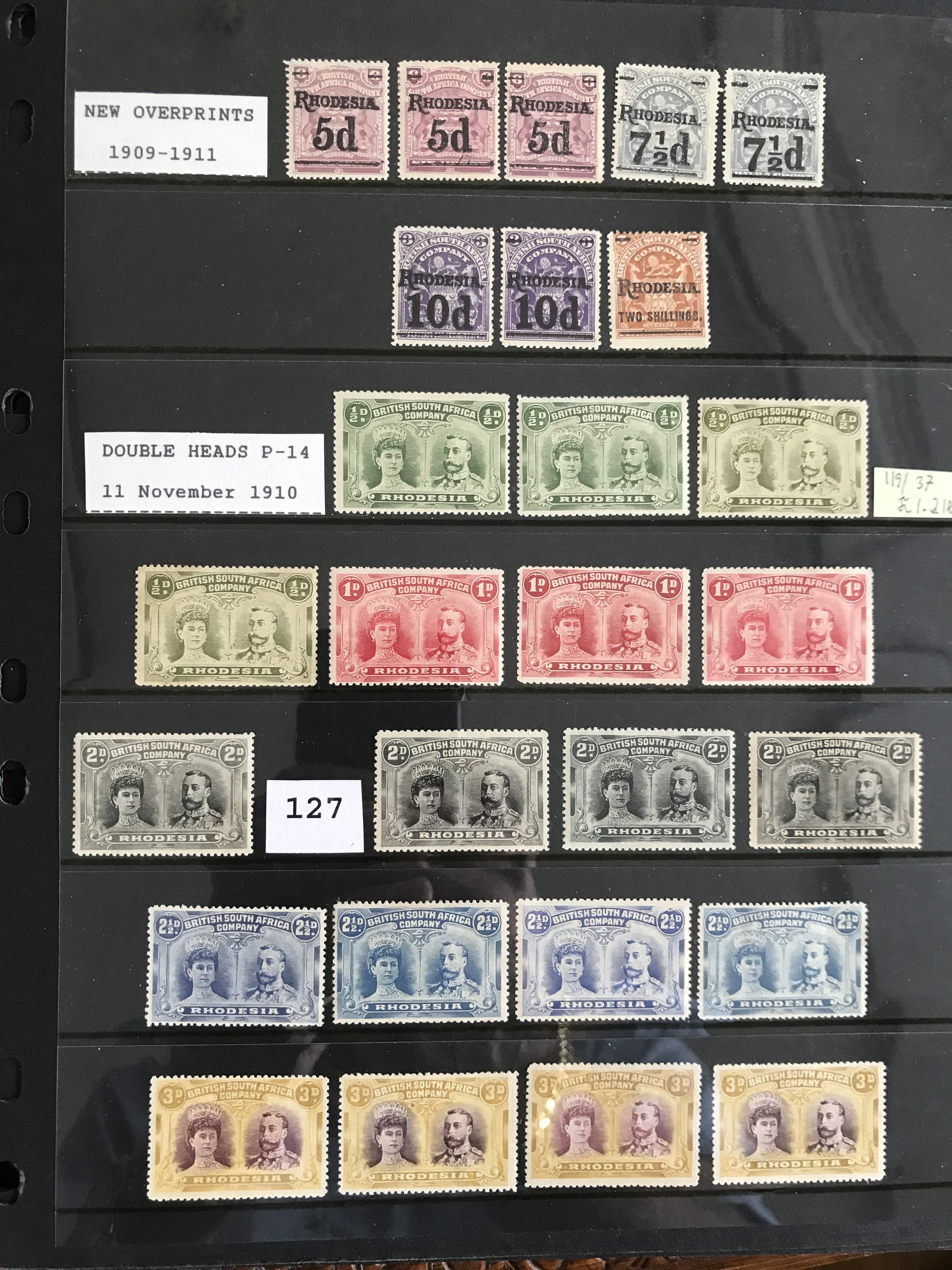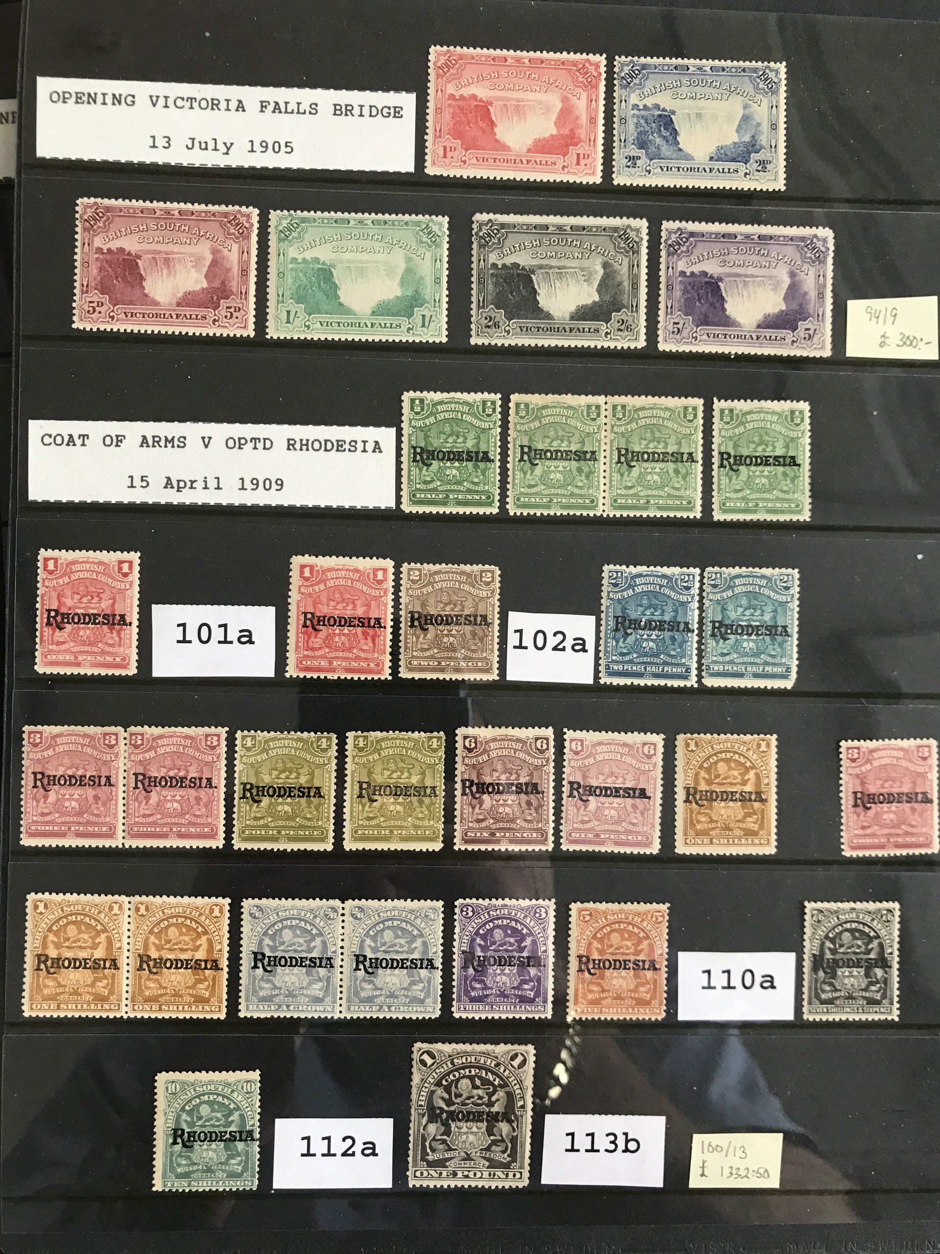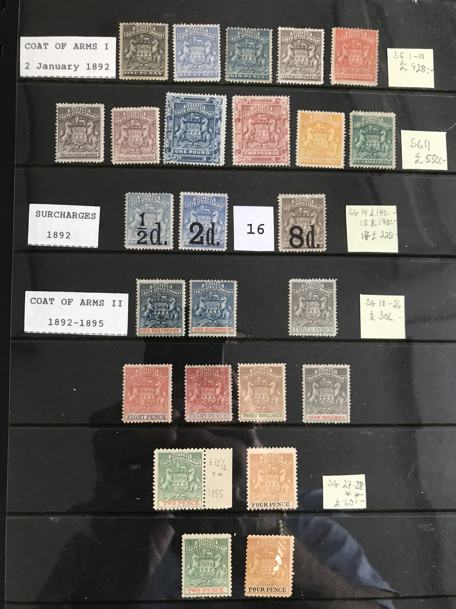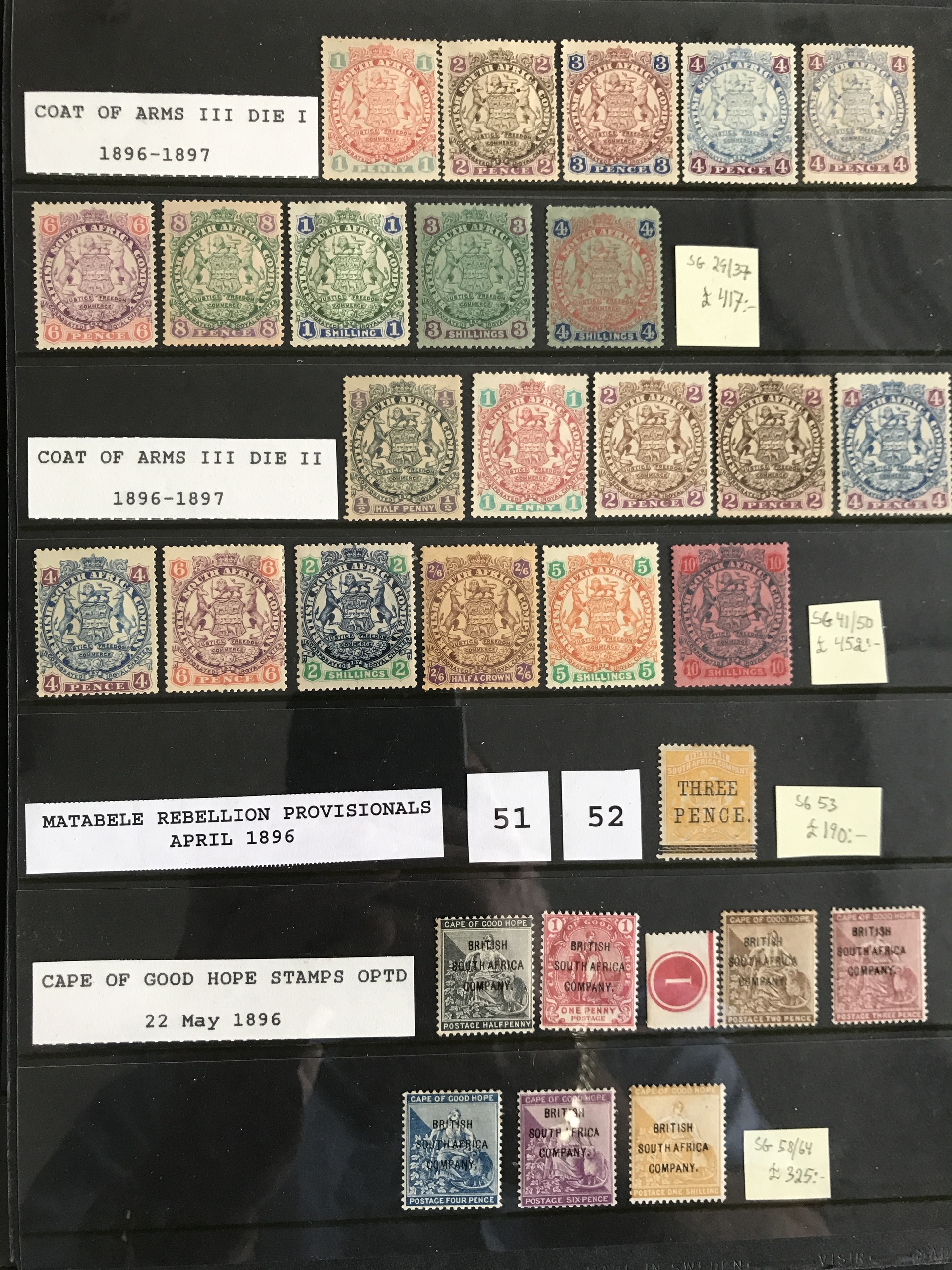 British South Africa Company. ★. Collection 1892–1917 incl. shades and types. Containing e.g. Mi1–9, 25–38I+II, 41–72, 76–95, 97–112 and 119–36, etc. Mi approx. 11500 Euro. The entire lot is presented at www.philea.se. (250)