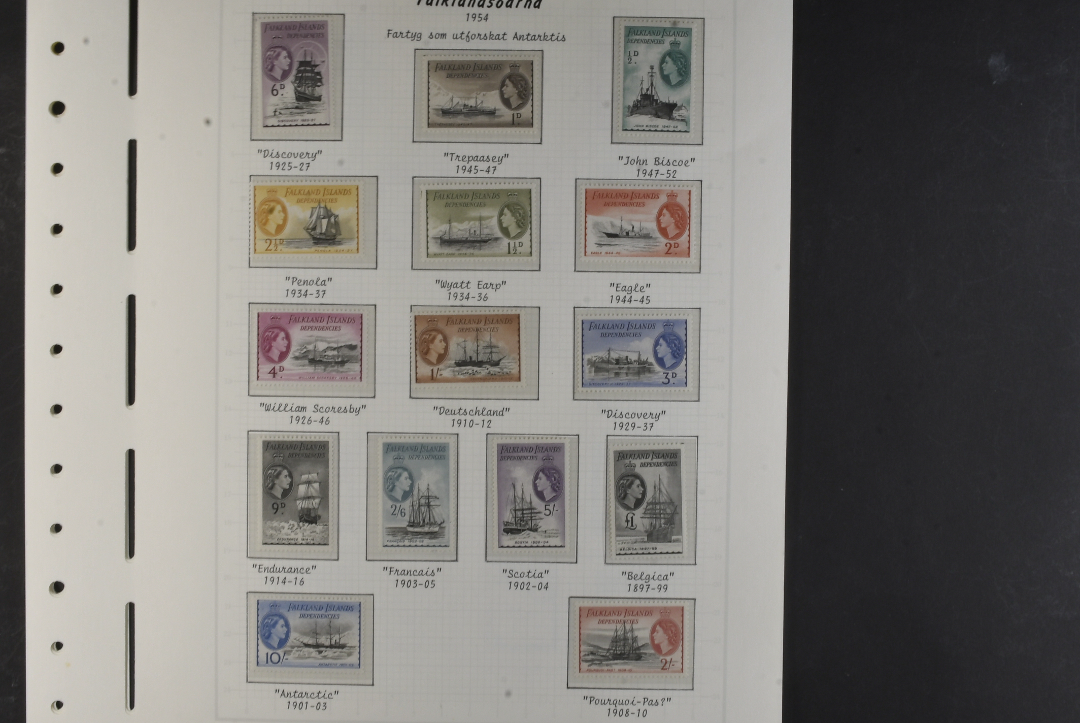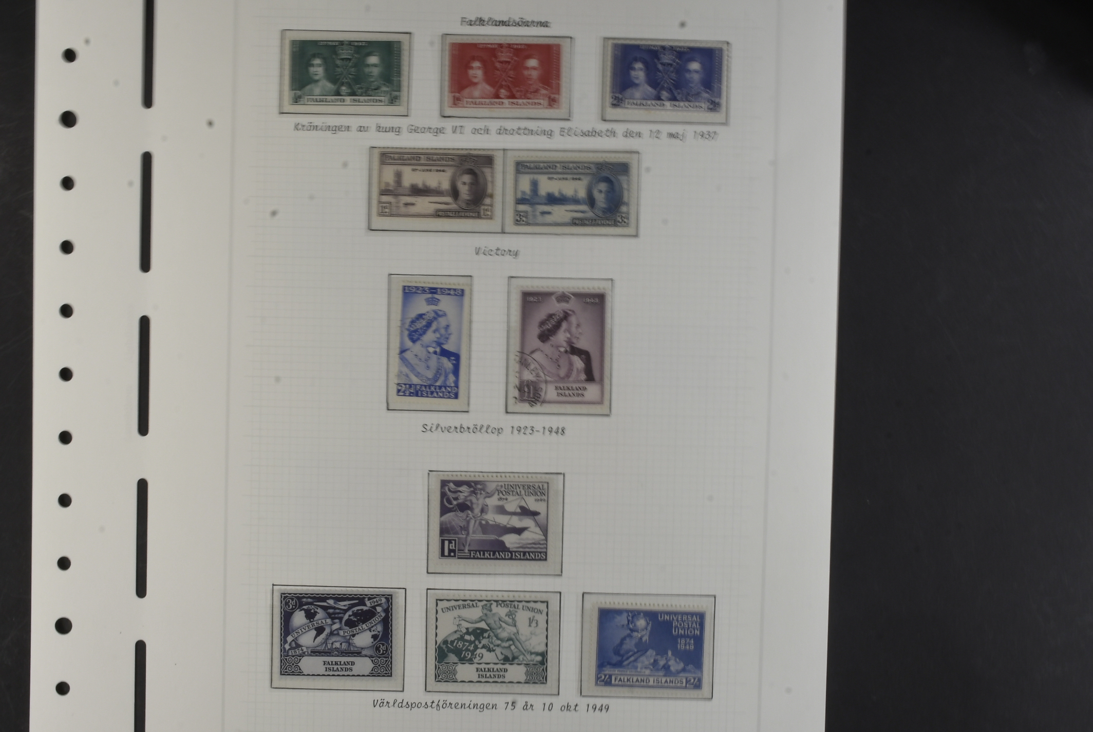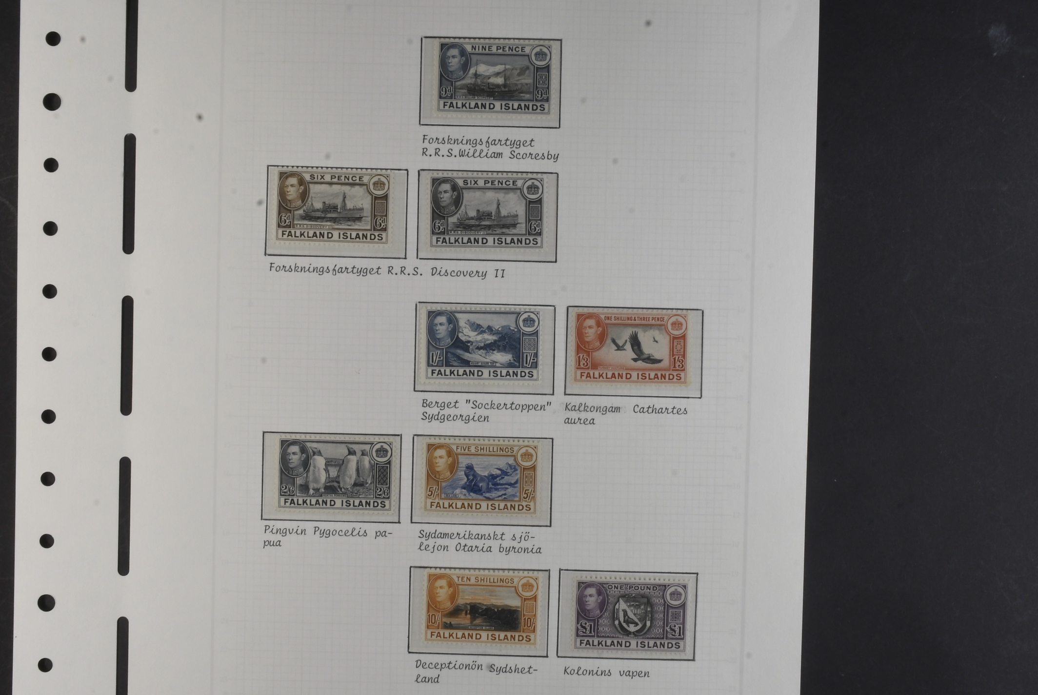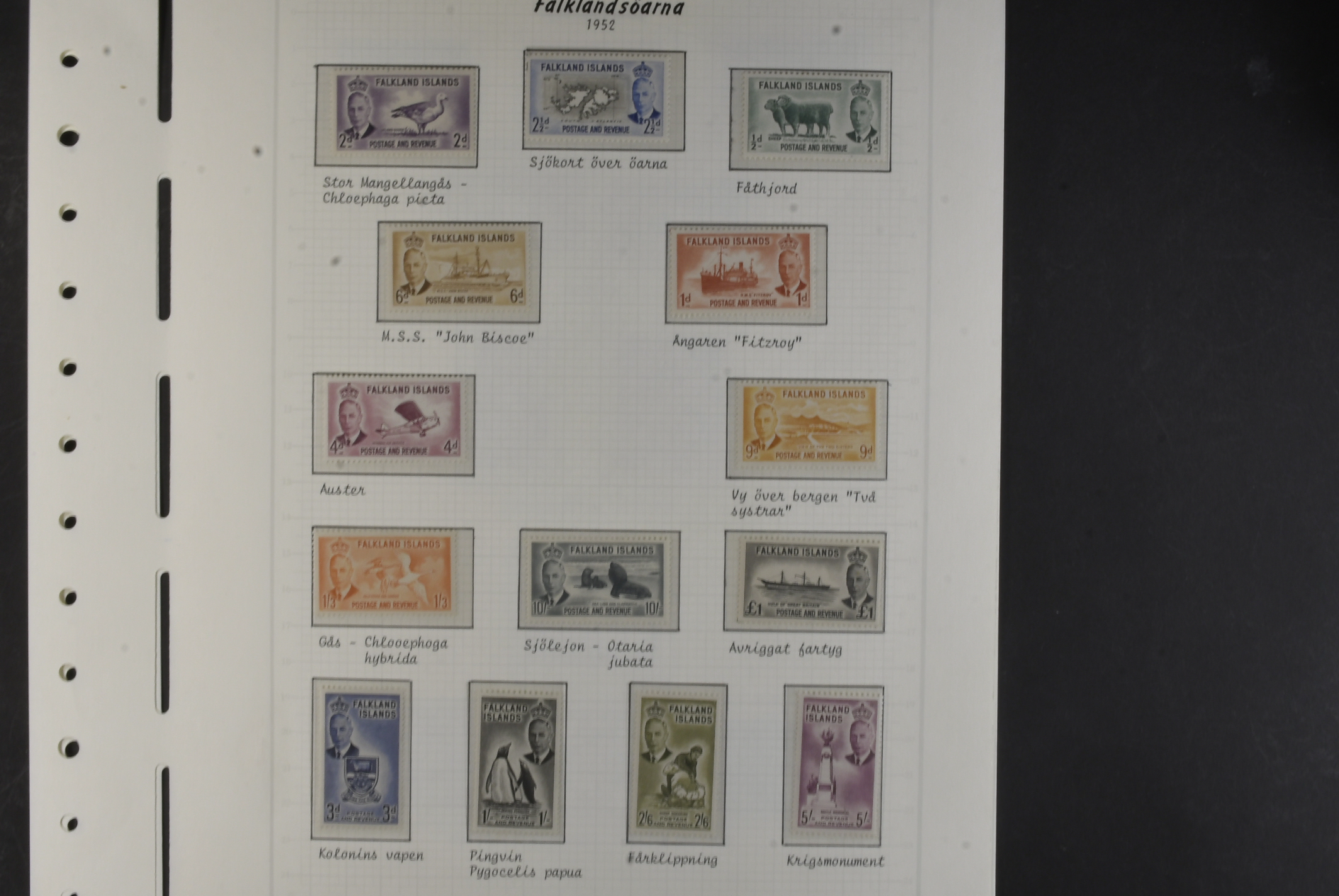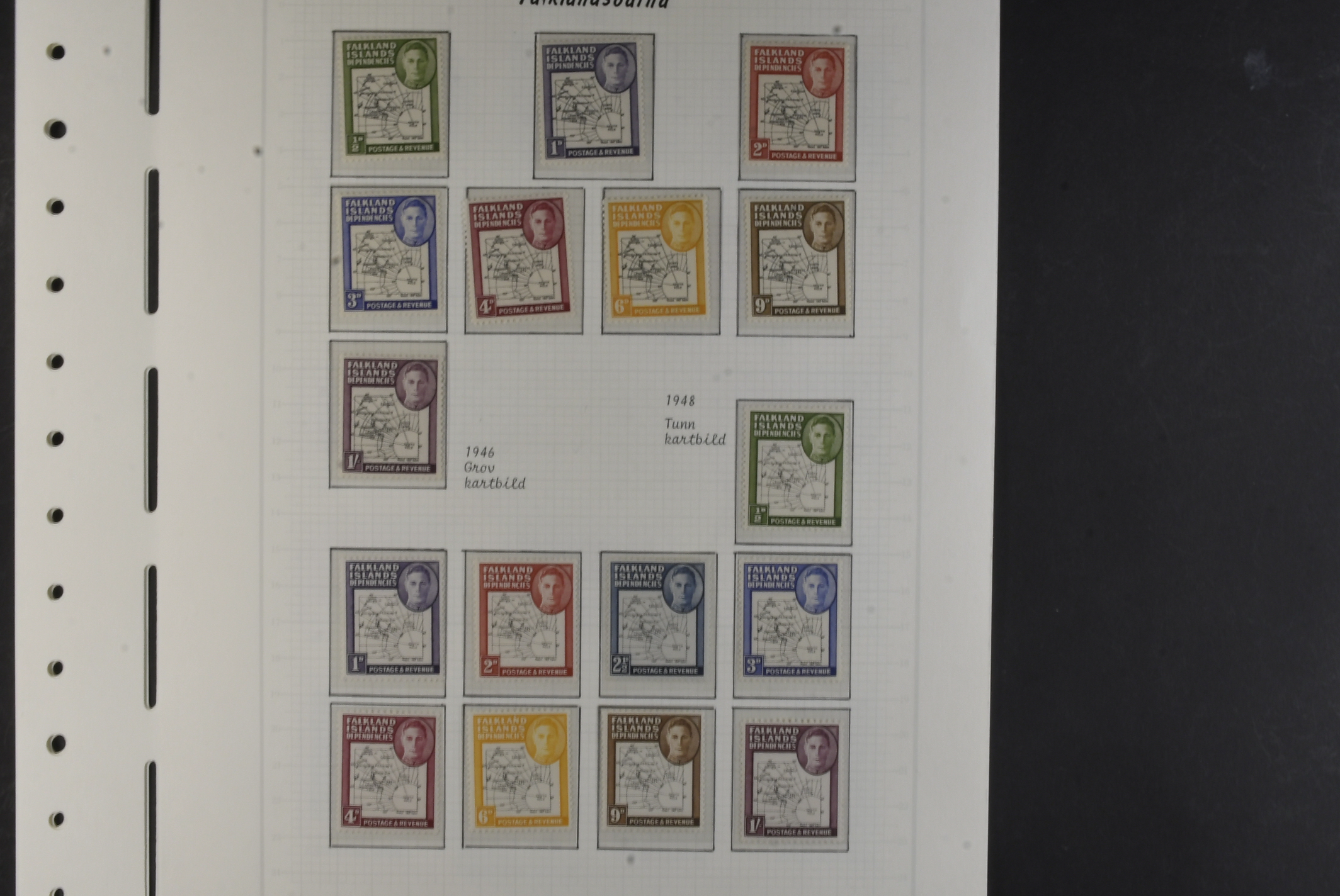 Falkland Islands. Collection mostly ★ 1929–1957 on leaves. KGV just a few stamps, 1938–1950 KGVI complete mh, RSW used, KGVI 1952 set mh with hr, QEII 1955–1957 set um, Dependencies KGVI both maps sets mh, QEII 1954 set mh. Please see a selection of scans at www.philea.se. Mostly good quality. (94)