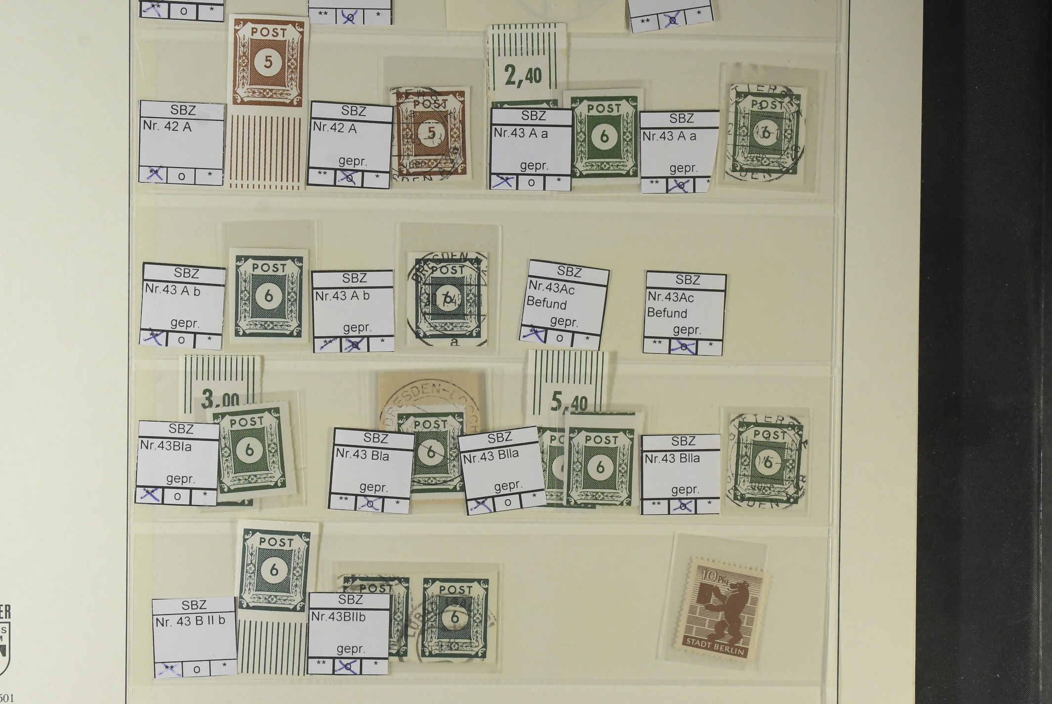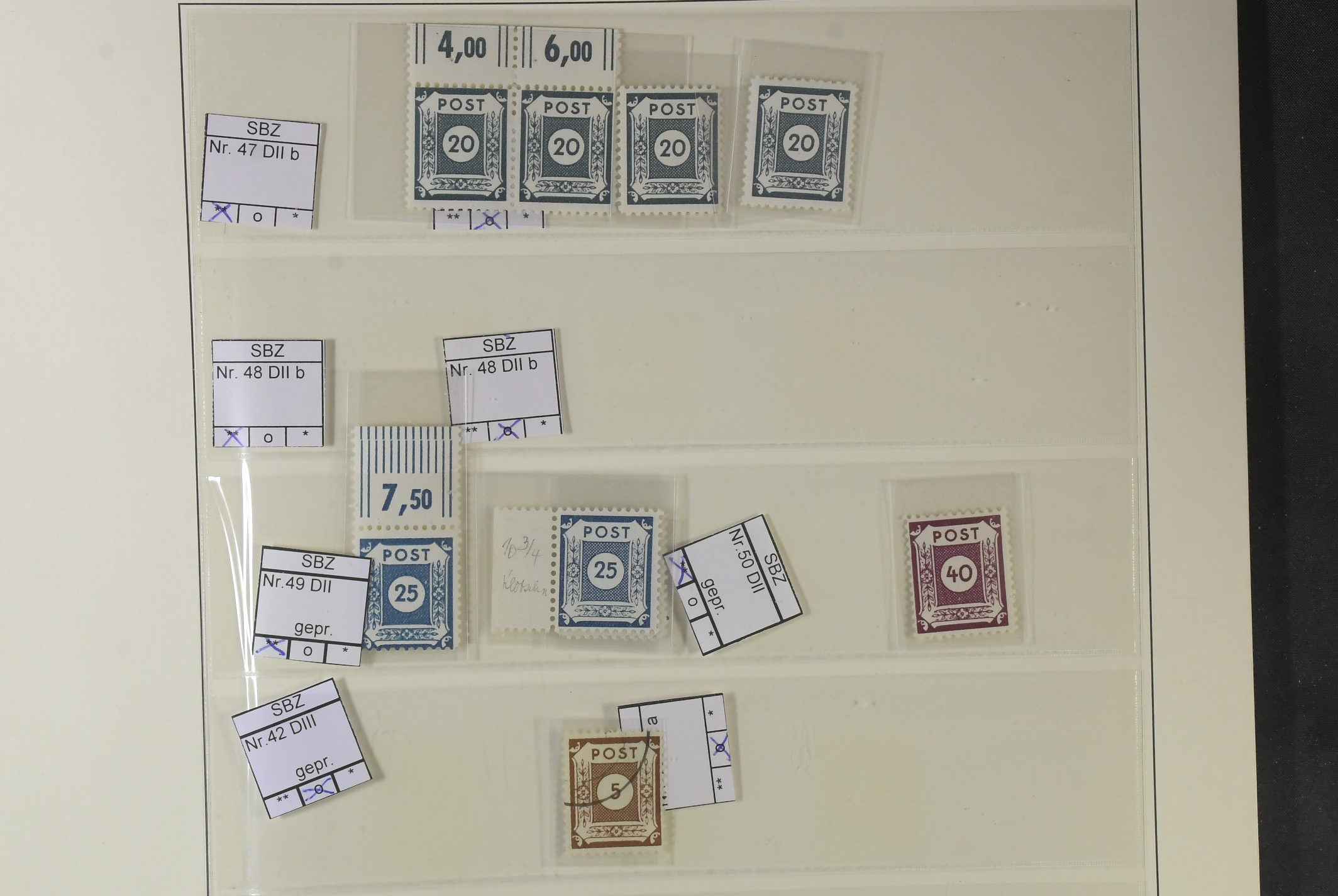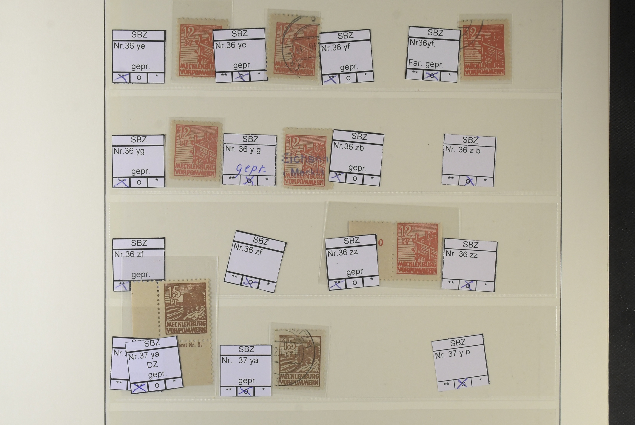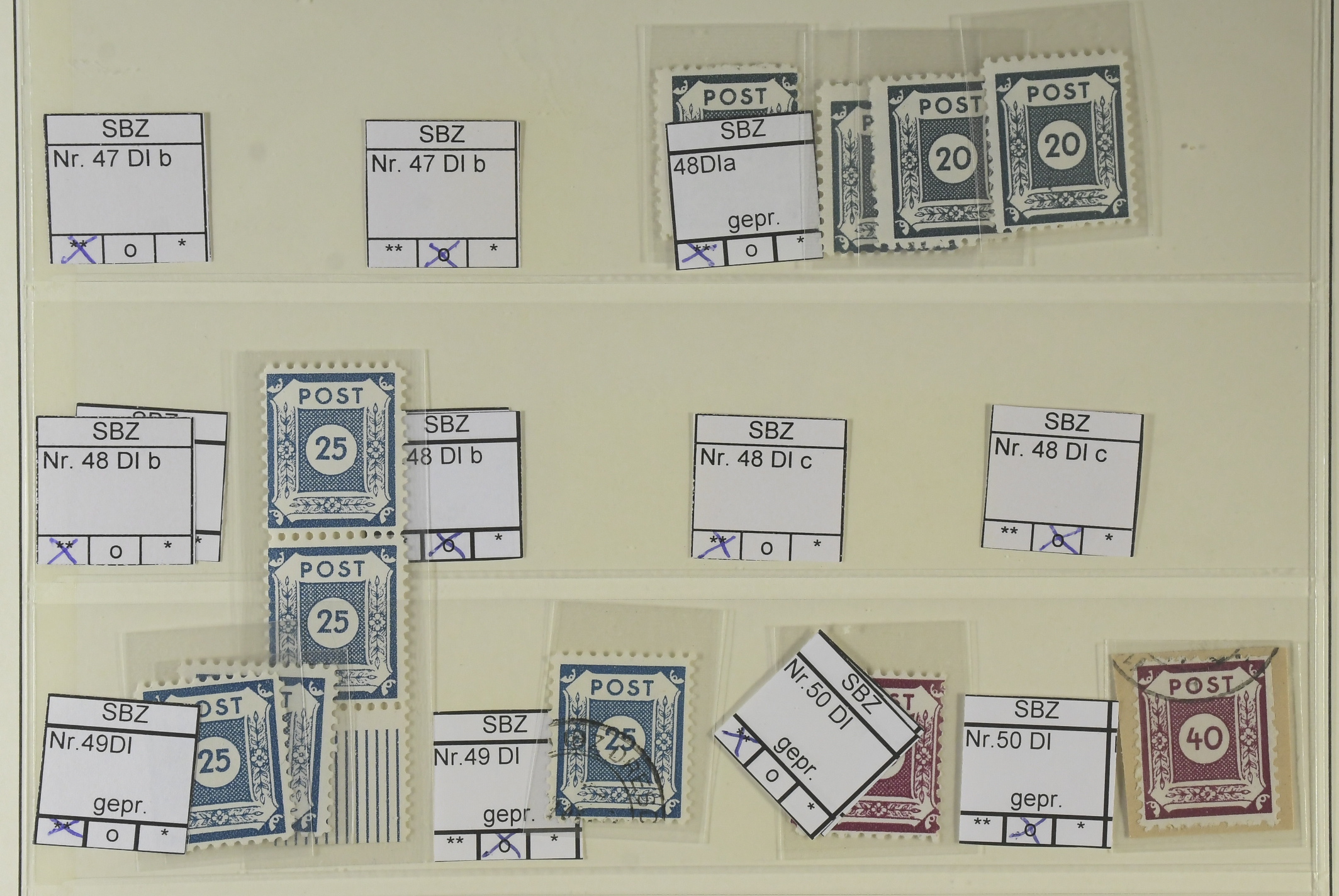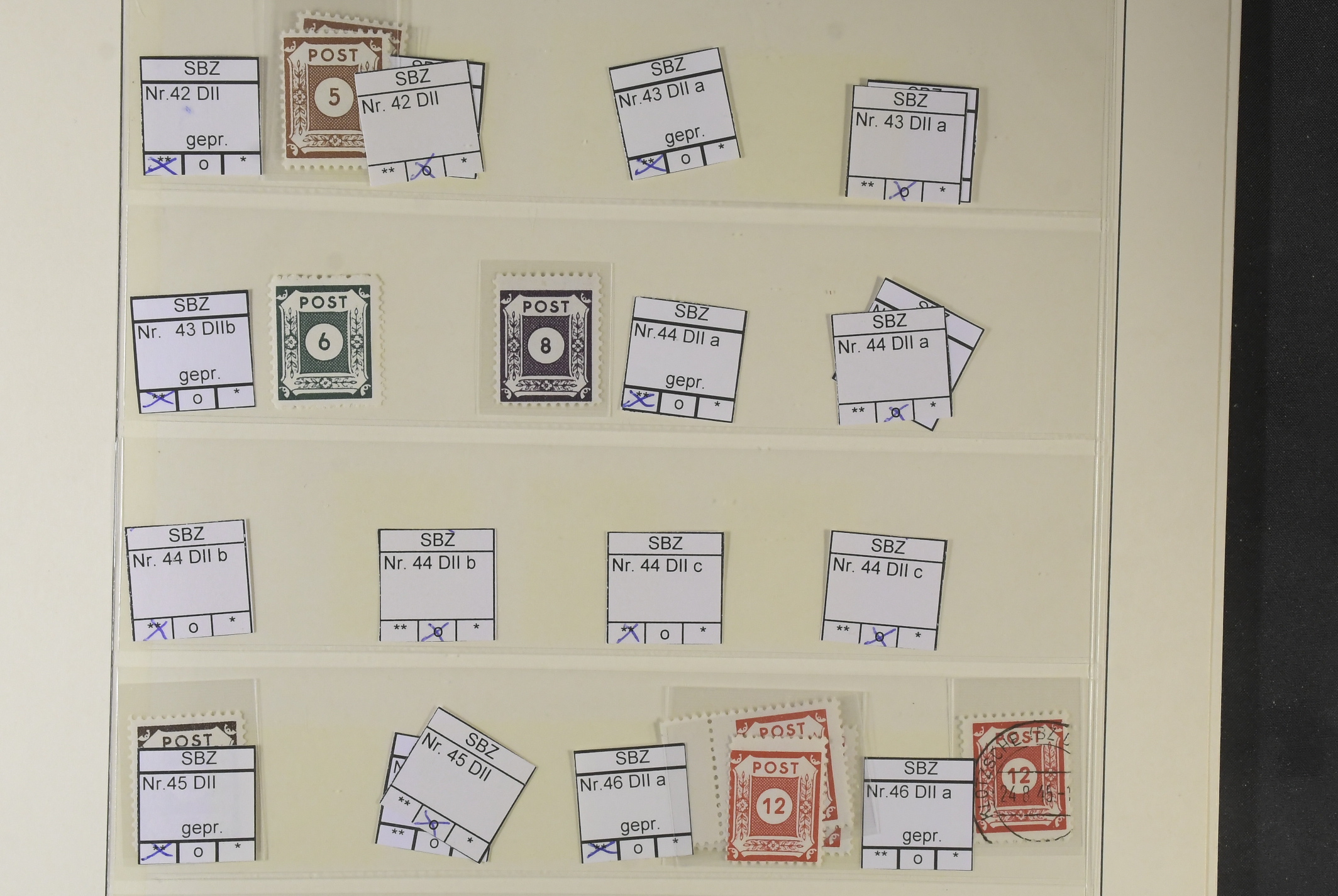 Germany, Soviet zone. Collection/accumulation ★★/⊙. Specialized study of many stamps Mi 1–50 with different shades, watermarks and specialities, all noted in detail on small paper pieces, many signed stamps also noted on the pieces. Excellent opportunity for the specialist. The entire lot is presented at www.philea.se.