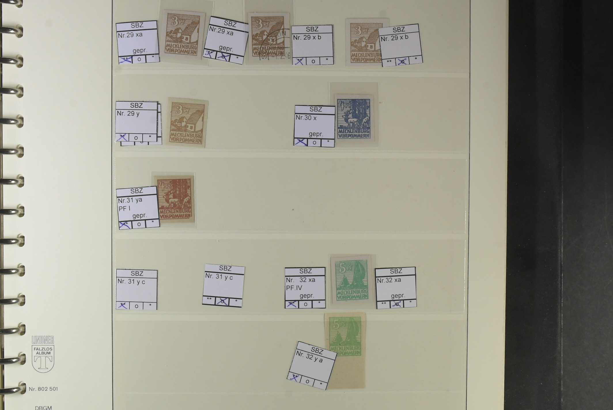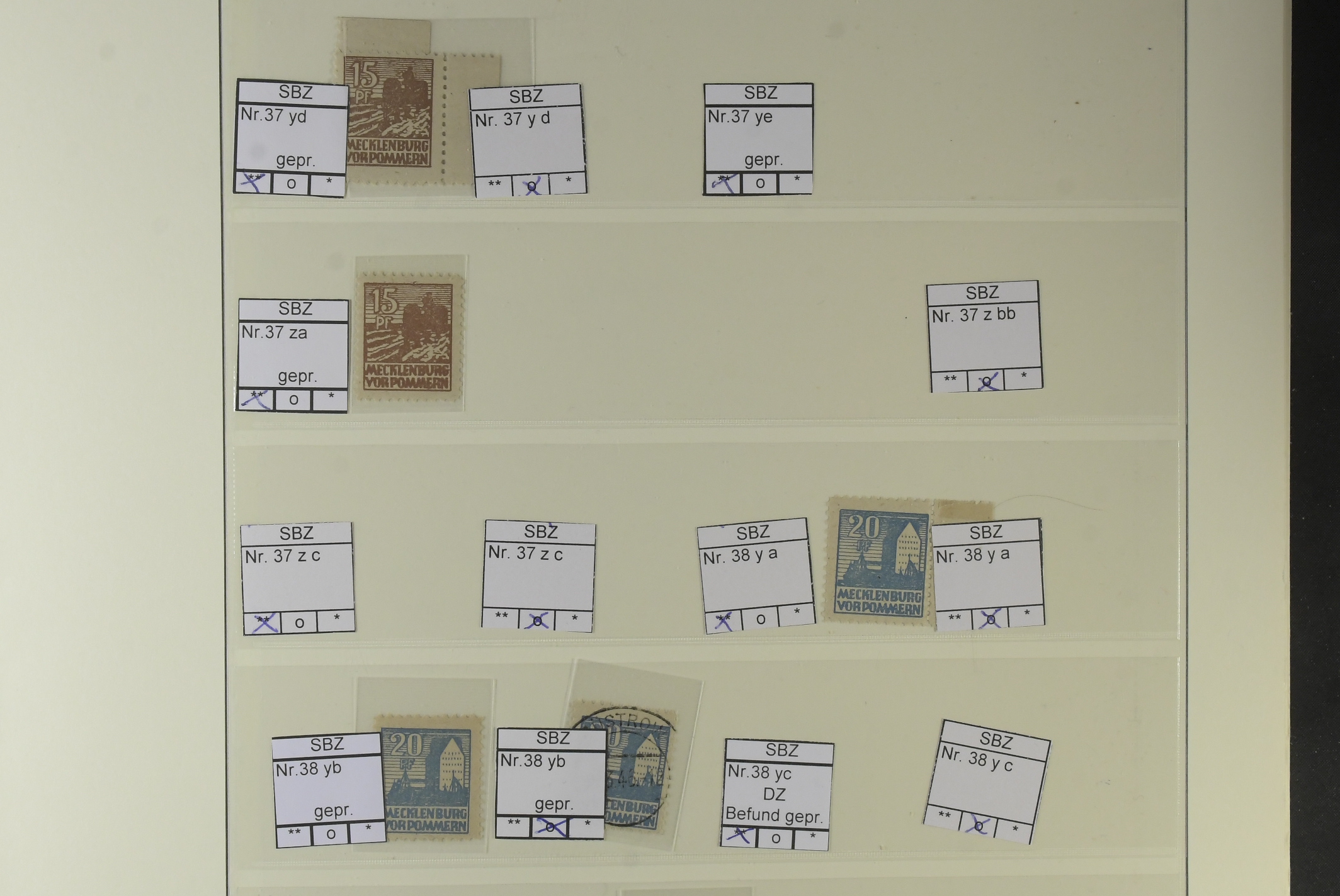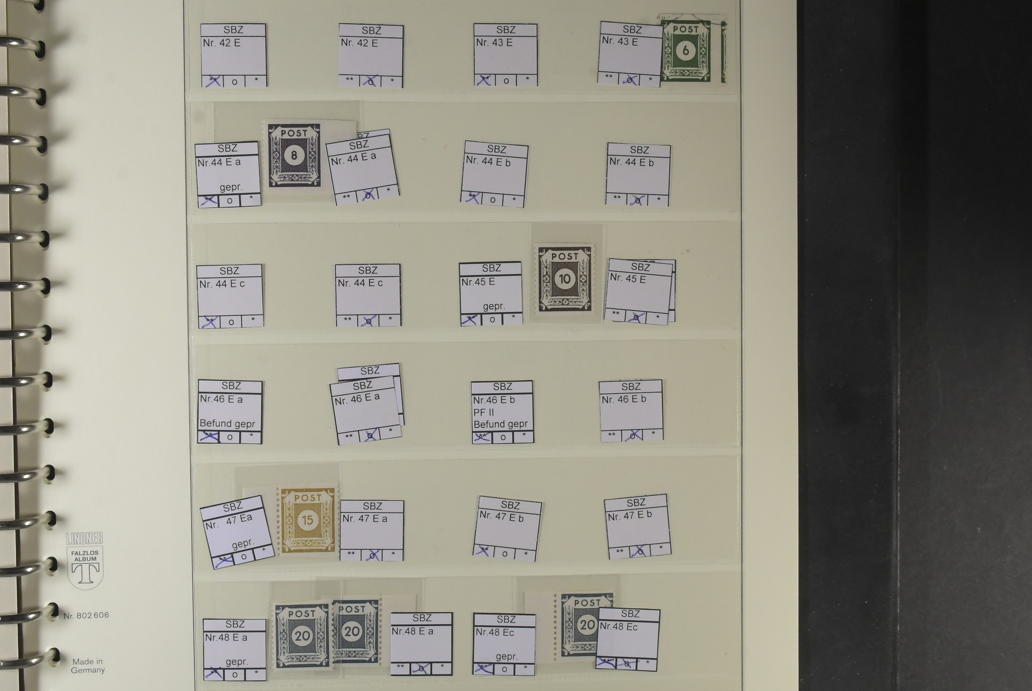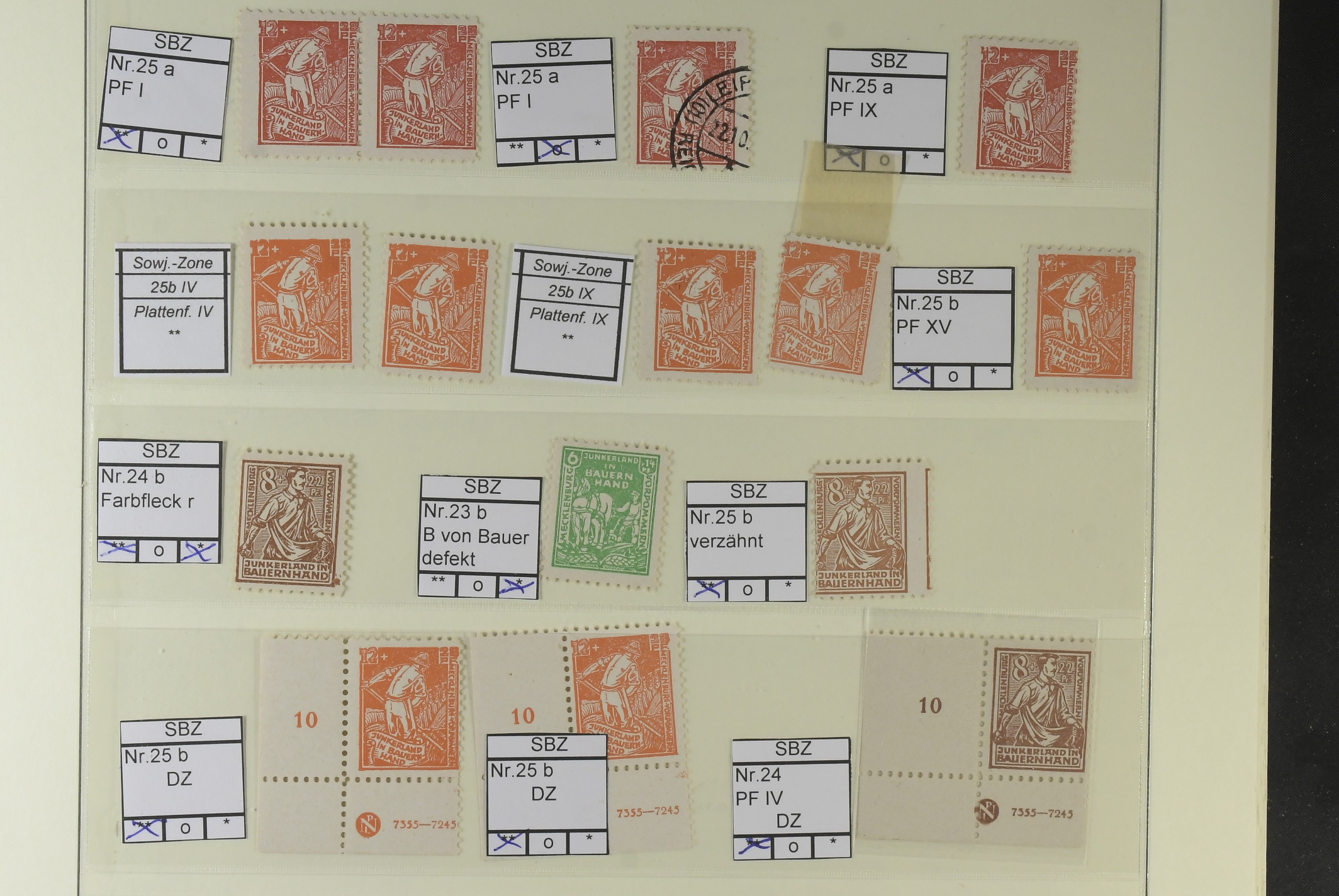 Germany, Soviet zone. Collection/accumulation ★★/⊙. Specialized study of many stamps Mi 1–50 with different shades, watermarks and specialities, all noted in detail on small paper pieces, many signed stamps also noted on the pieces. Excellent opportunity for the specialist. The entire lot is presented at www.philea.se.