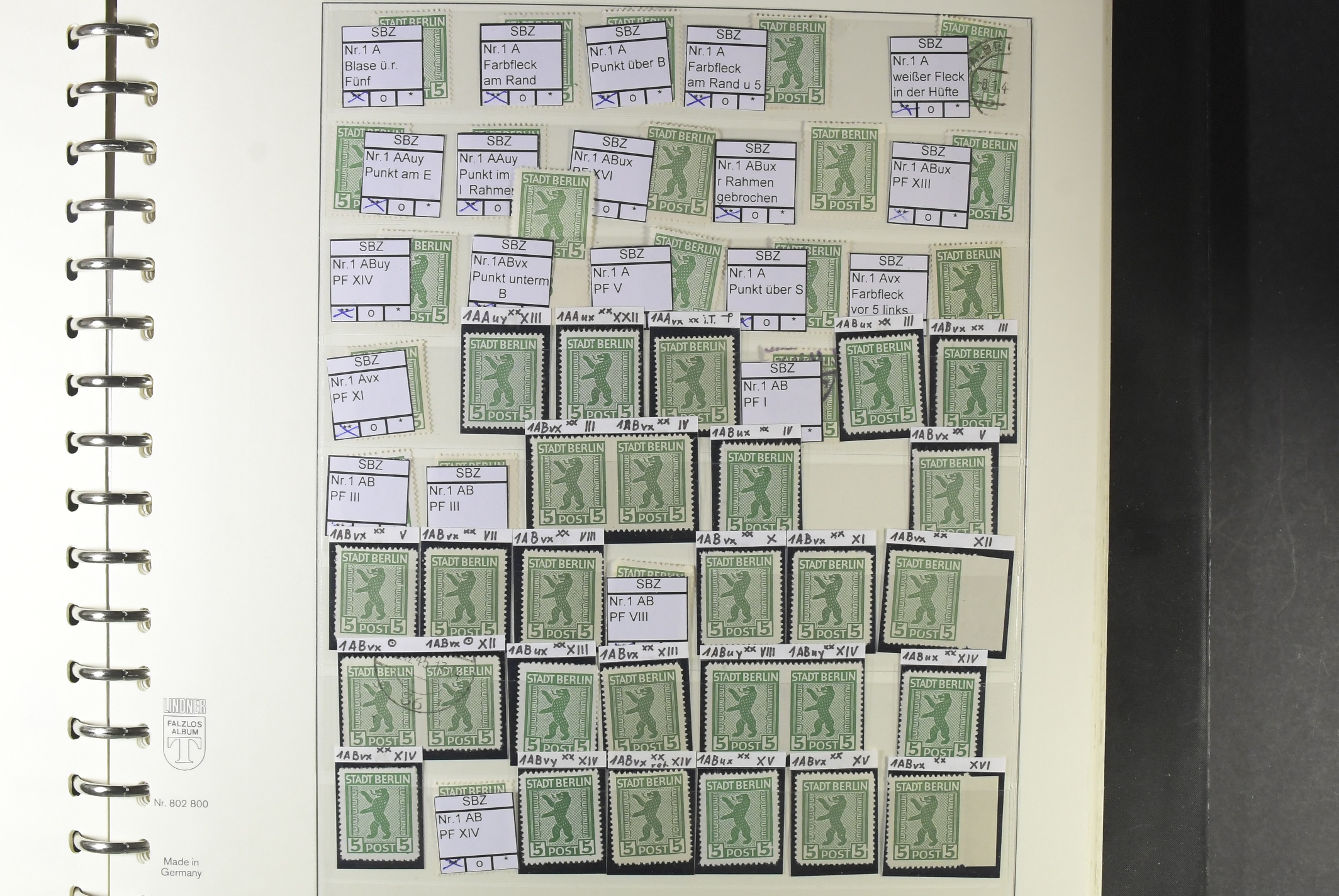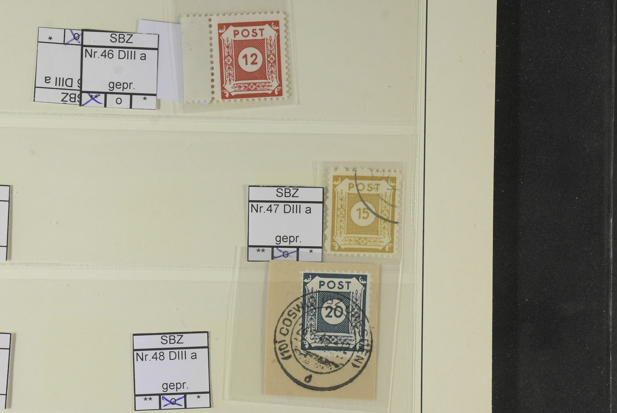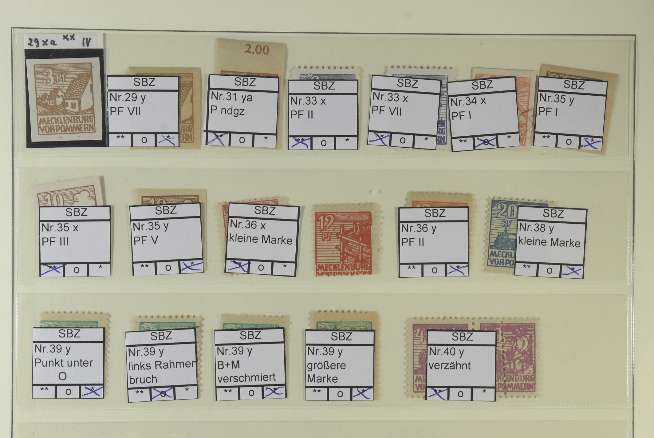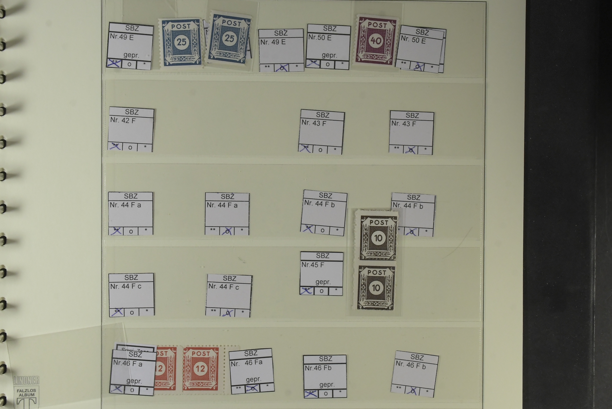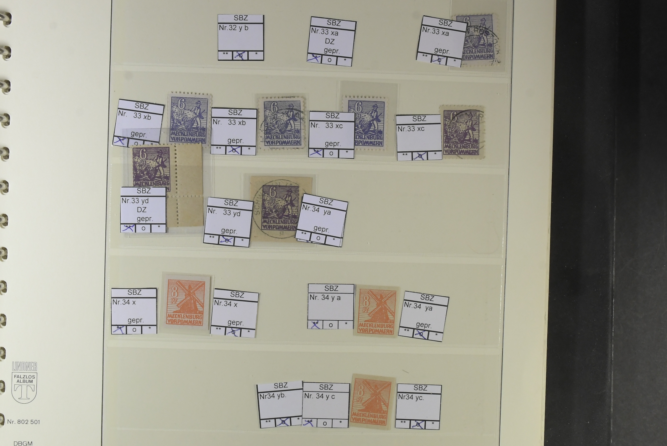 Germany, Soviet zone. Collection/accumulation ★★/⊙. Specialized study of many stamps Mi 1–50 with different shades, watermarks and specialities, all noted in detail on small paper pieces, many signed stamps also noted on the pieces. Excellent opportunity for the specialist. The entire lot is presented at www.philea.se.