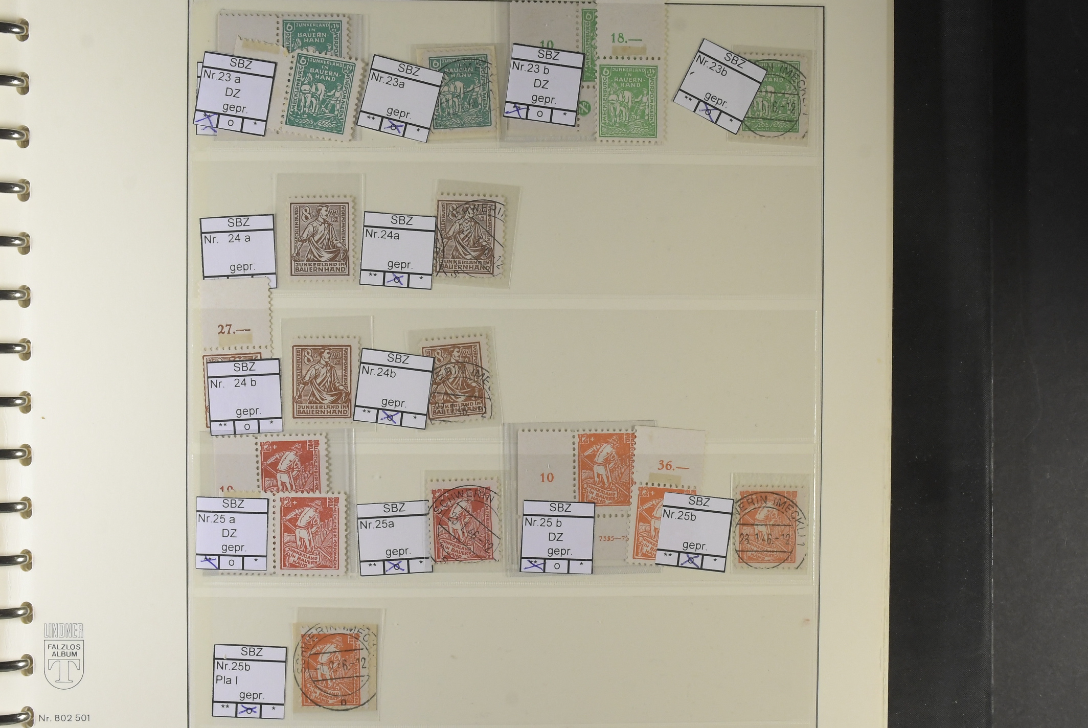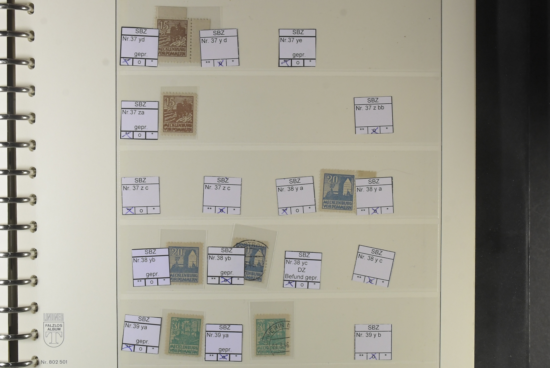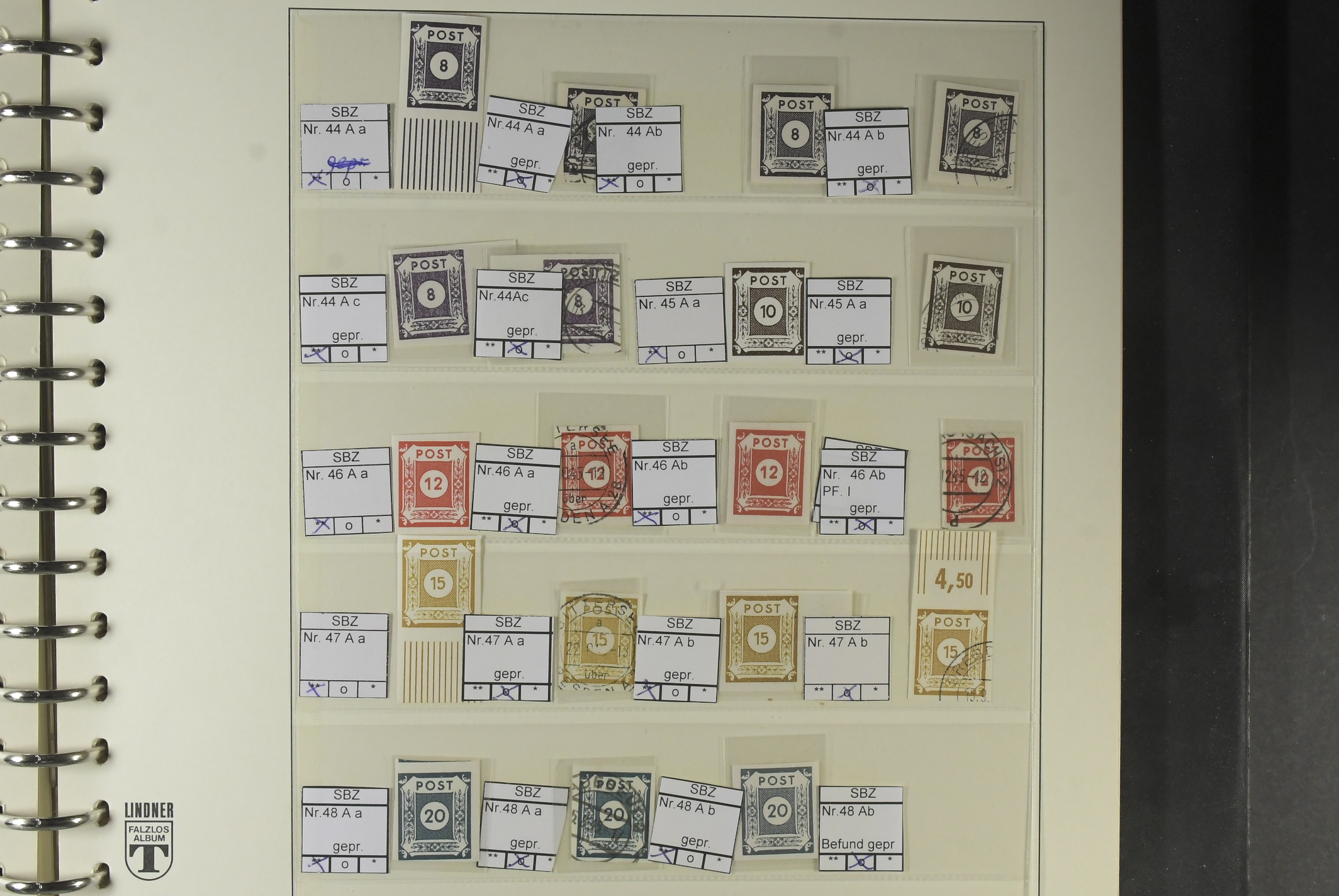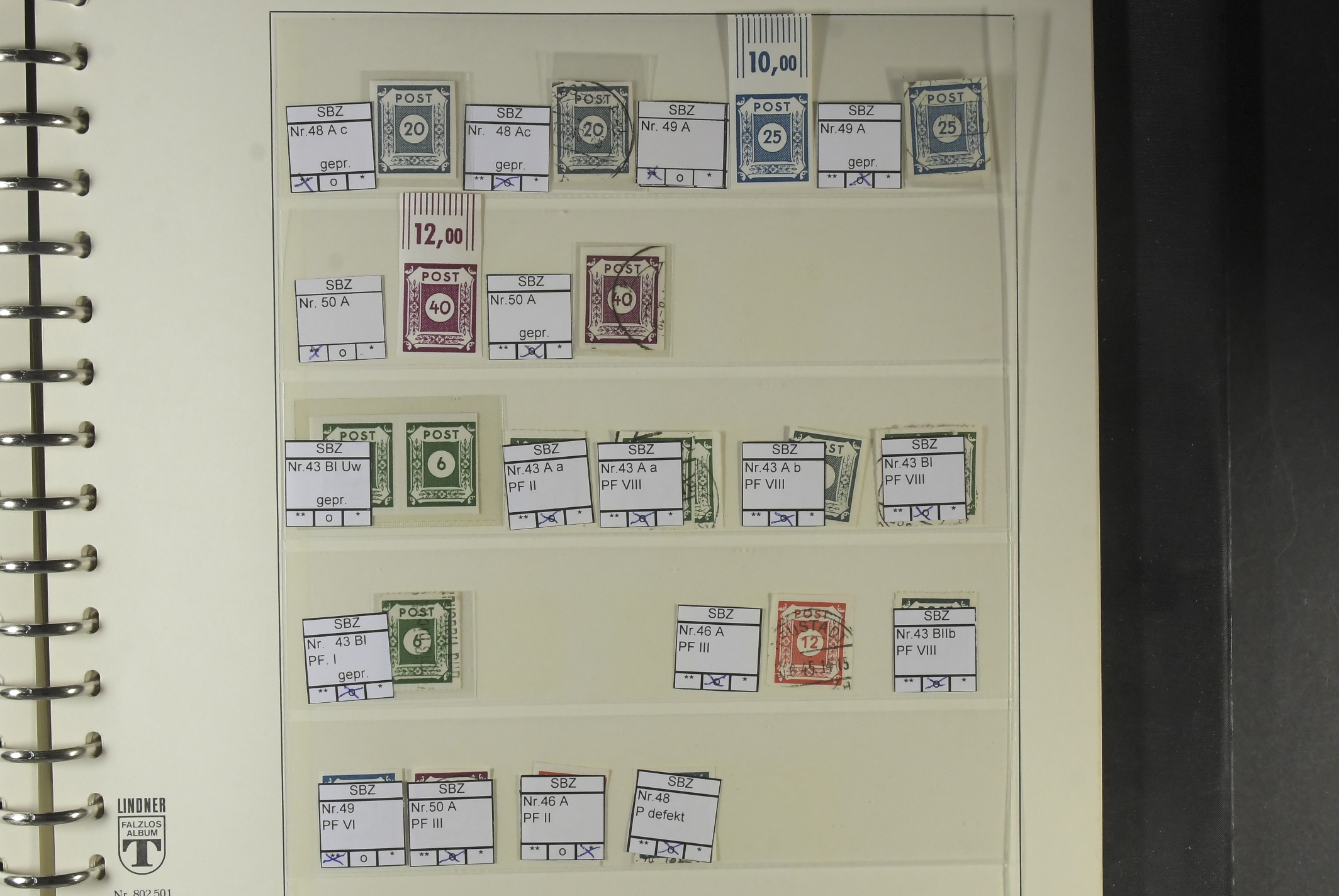 Germany, Soviet zone. Collection/accumulation ★★/⊙. Specialized study of many stamps Mi 1–50 with different shades, watermarks and specialities, all noted in detail on small paper pieces, many signed stamps also noted on the pieces. Excellent opportunity for the specialist. The entire lot is presented at www.philea.se.