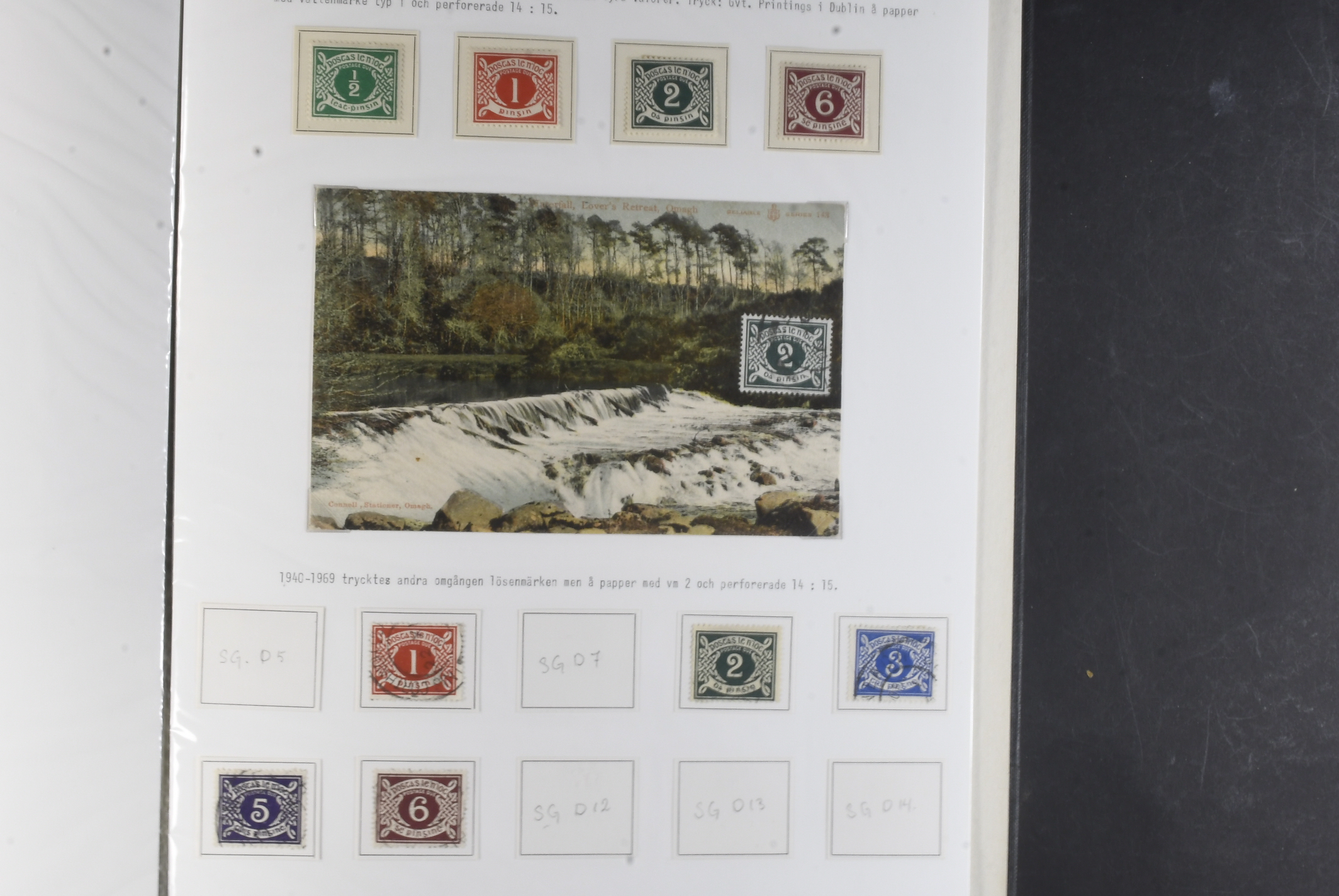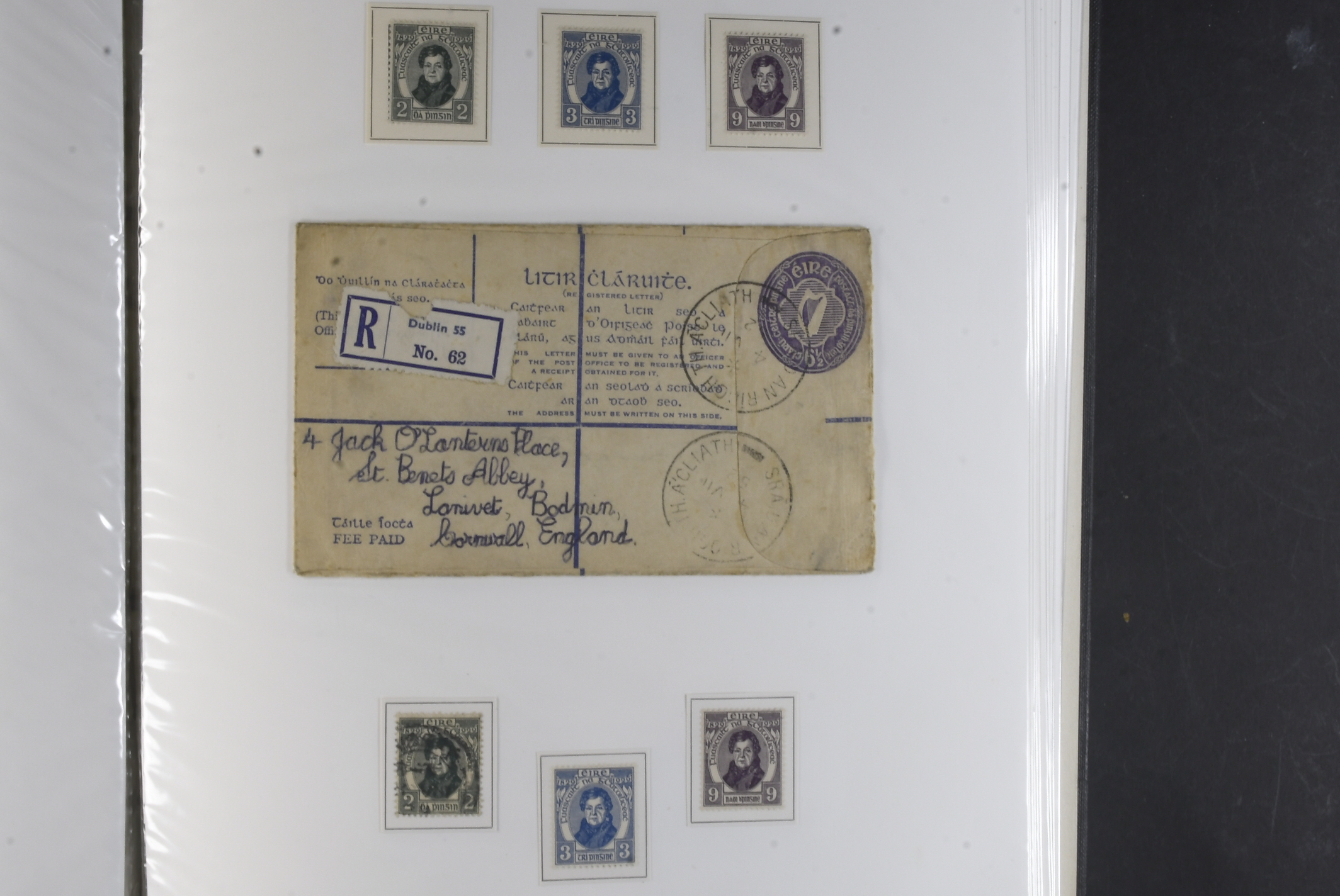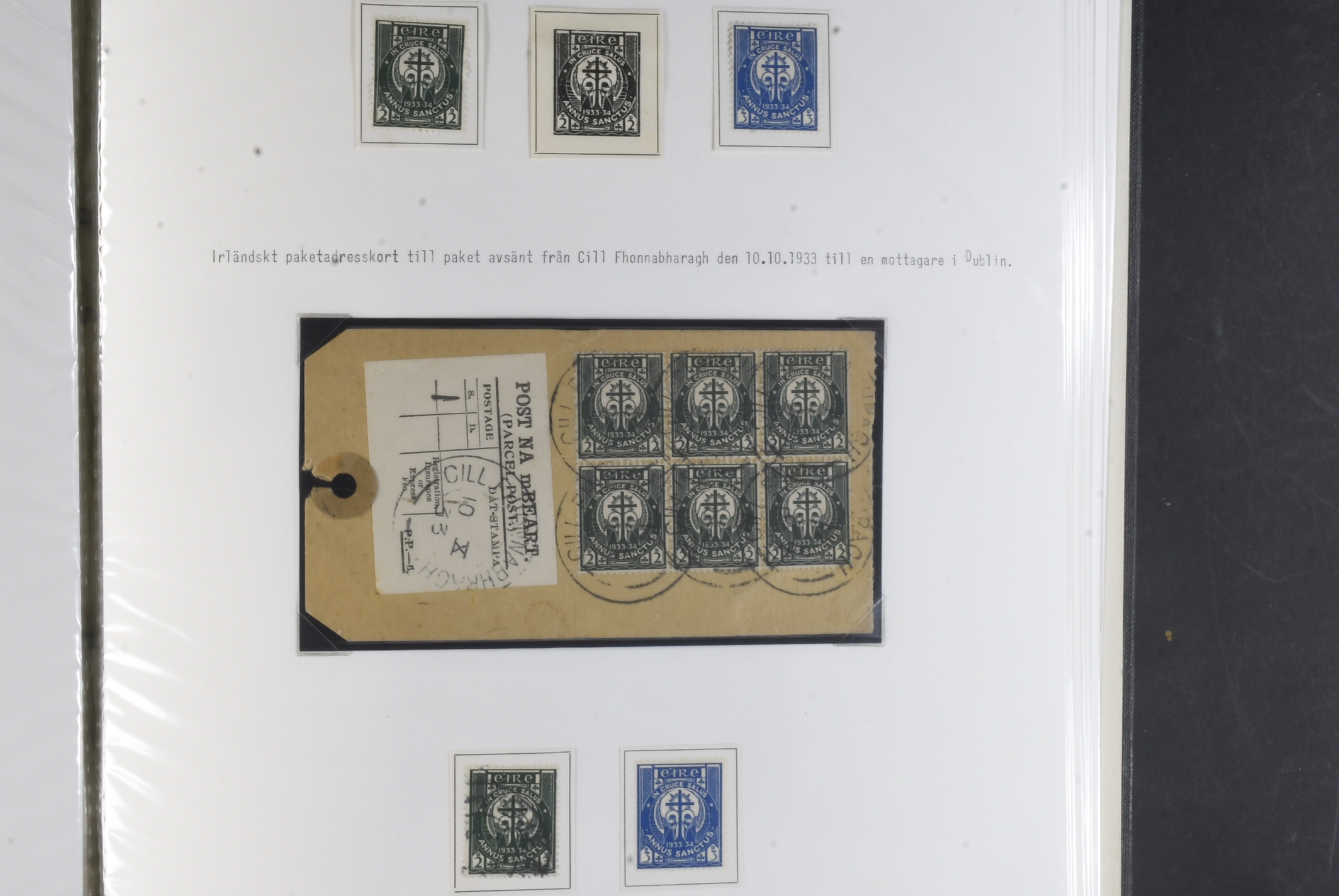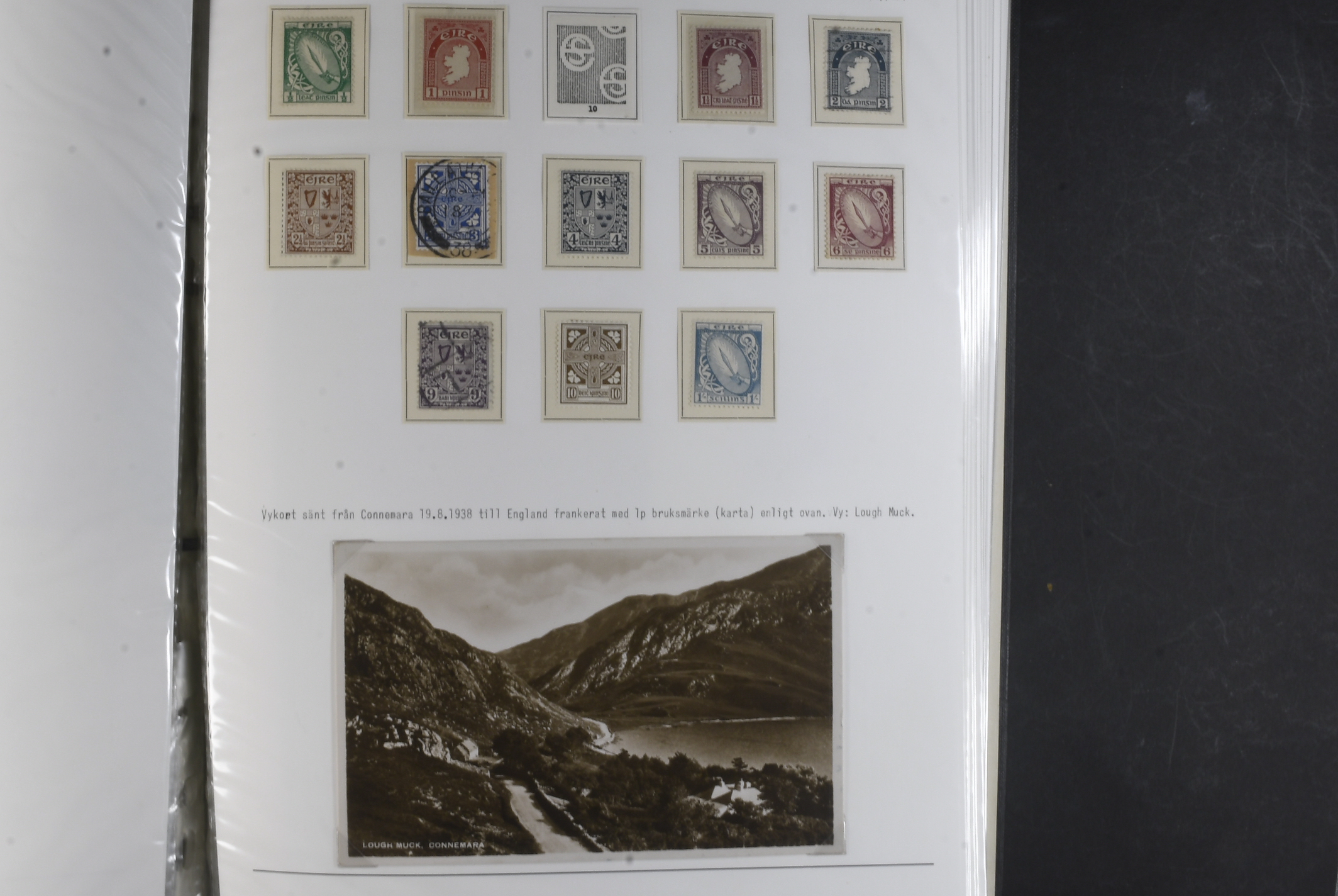Ireland. Collection ★★/★/⊙ 1841–1972 in two albums. Nicely written up. Starts with 5 QV entires and one postal card and then eight postcards from the KEVII and KGV period. Ireland stamp period well filled with many high value stamps and on every page there is also one cover/card from the same issue. Inspection is recommended. Please see a selection of scans at www.philea.se. Mostly fine quality. (250 stamps + 200 covers/cards)