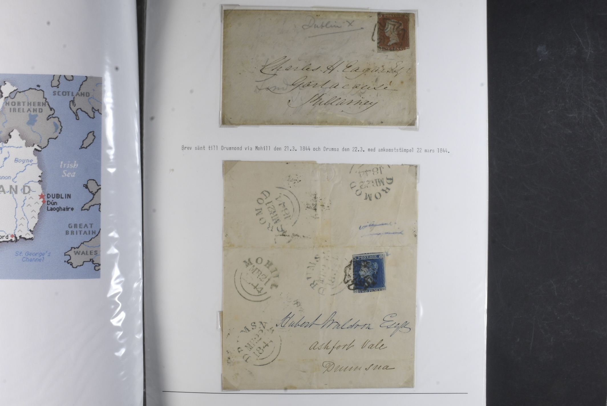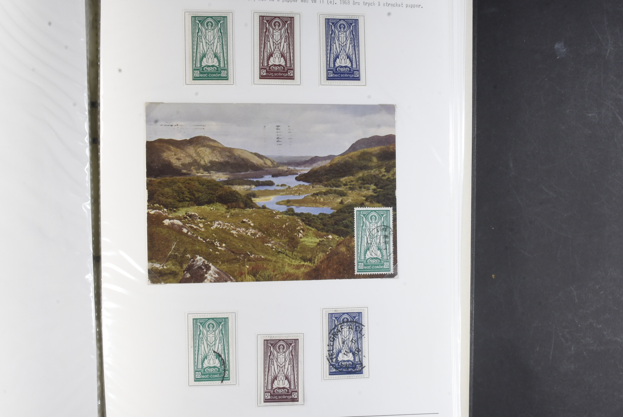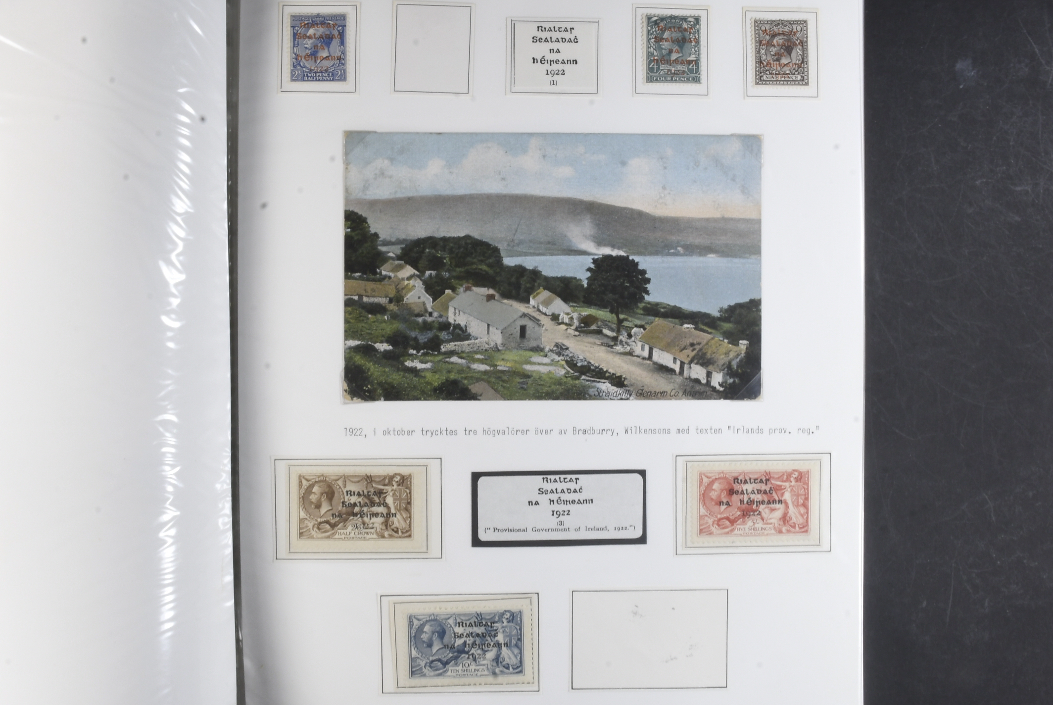 Ireland. Collection ★★/★/⊙ 1841–1972 in two albums. Nicely written up. Starts with 5 QV entires and one postal card and then eight postcards from the KEVII and KGV period. Ireland stamp period well filled with many high value stamps and on every page there is also one cover/card from the same issue. Inspection is recommended. Please see a selection of scans at www.philea.se. Mostly fine quality. (250 stamps + 200 covers/cards)