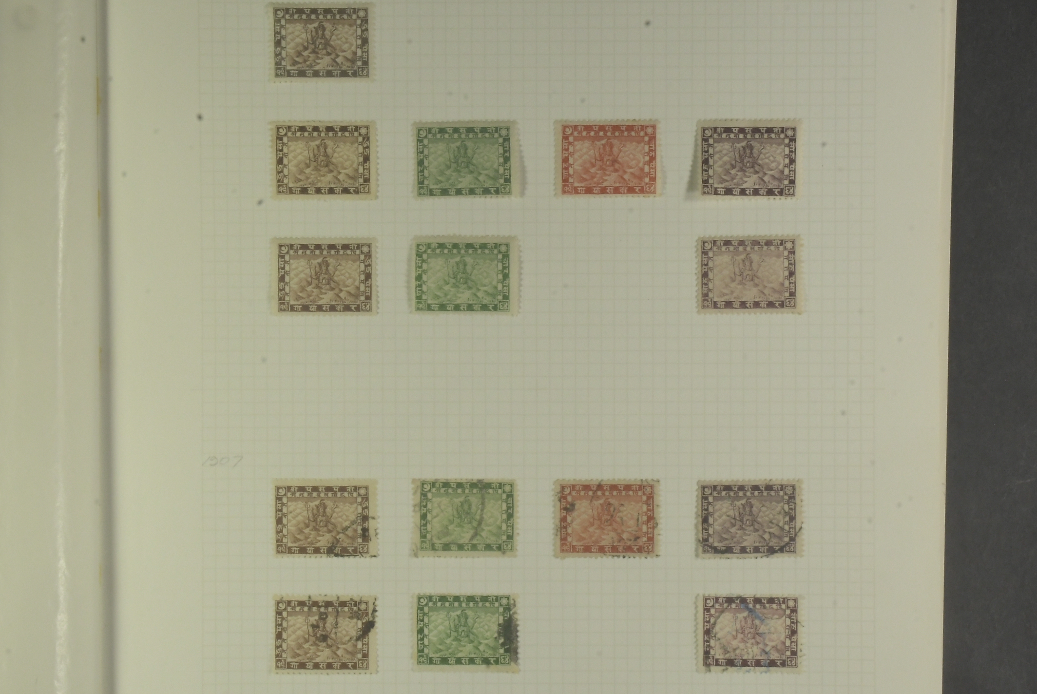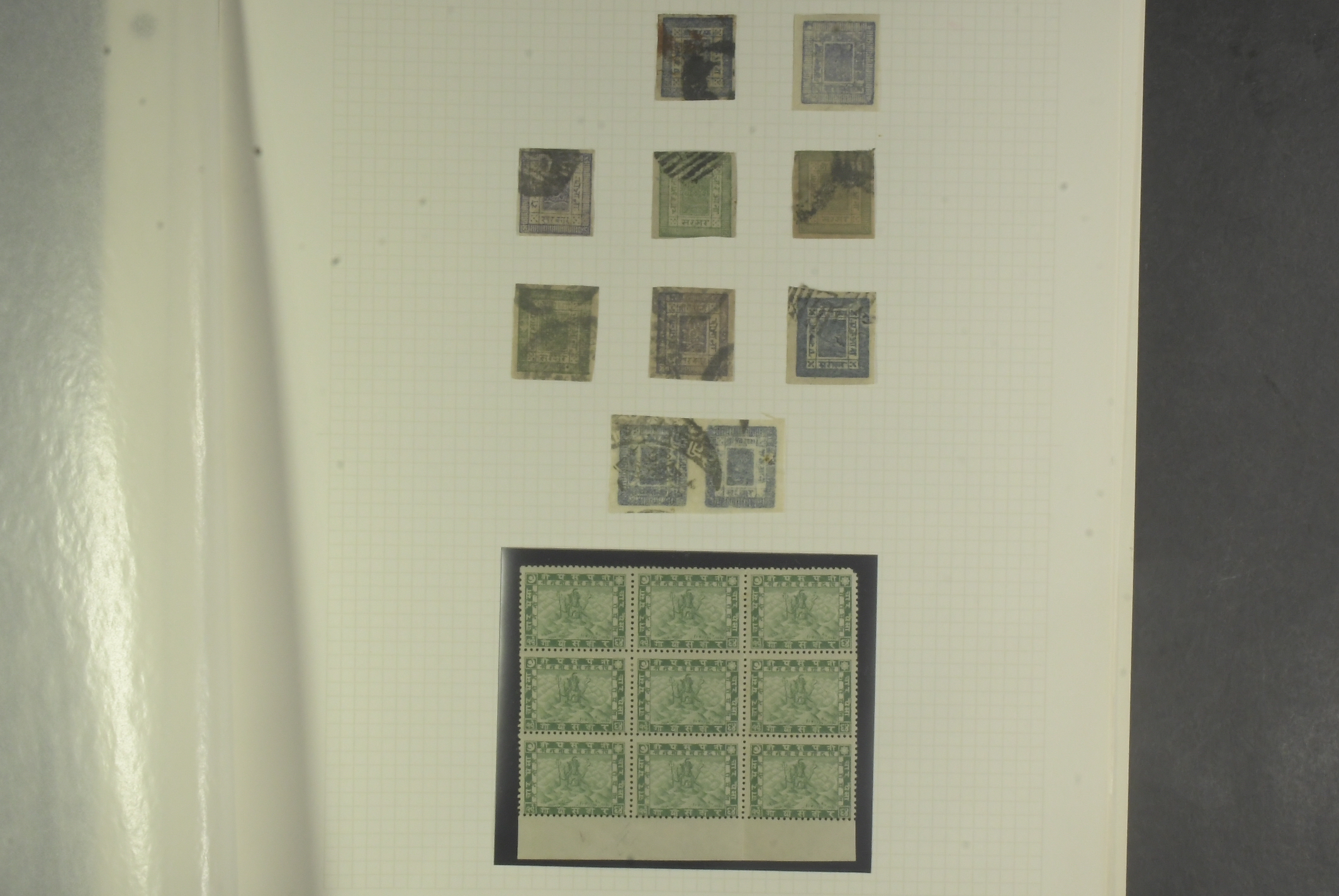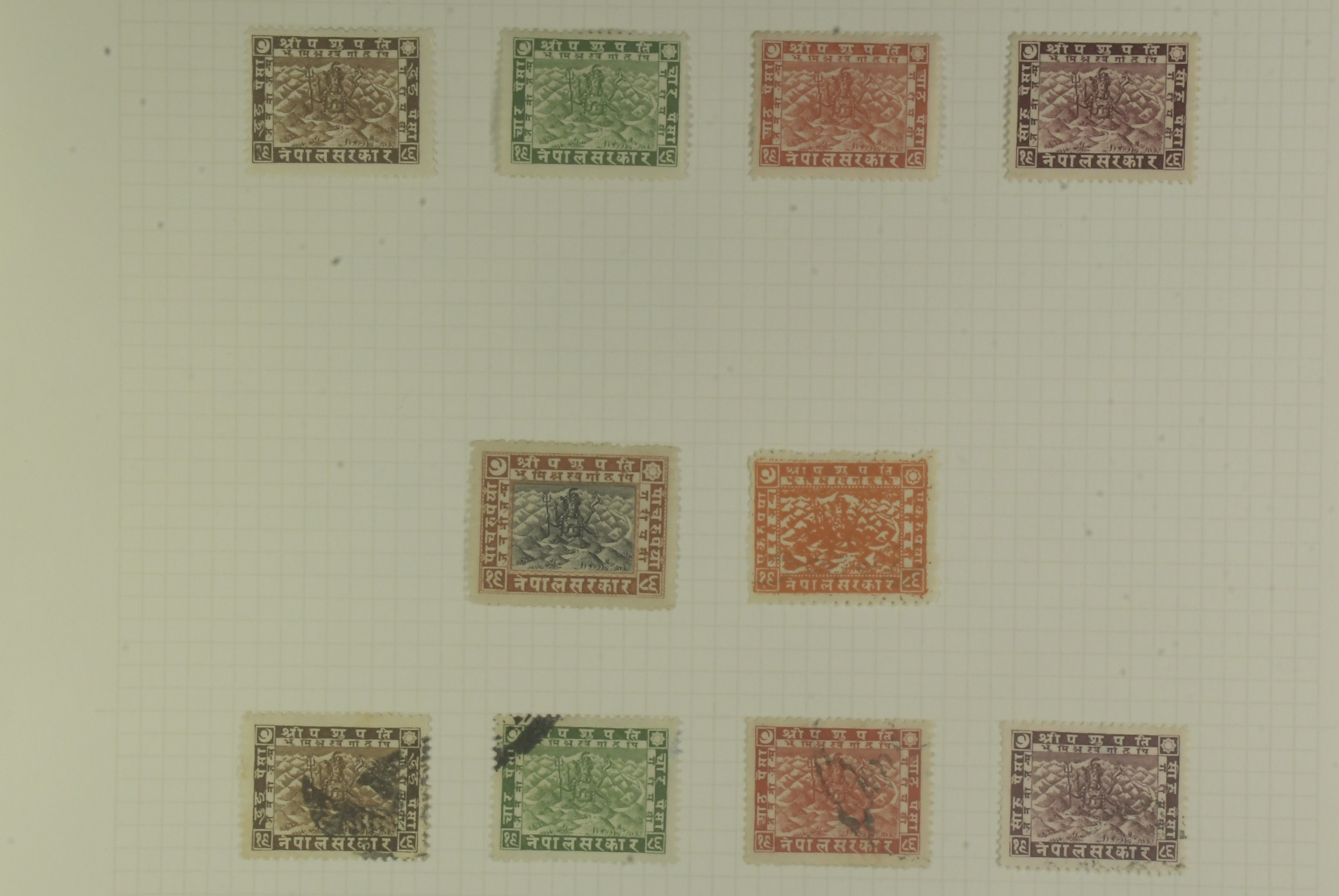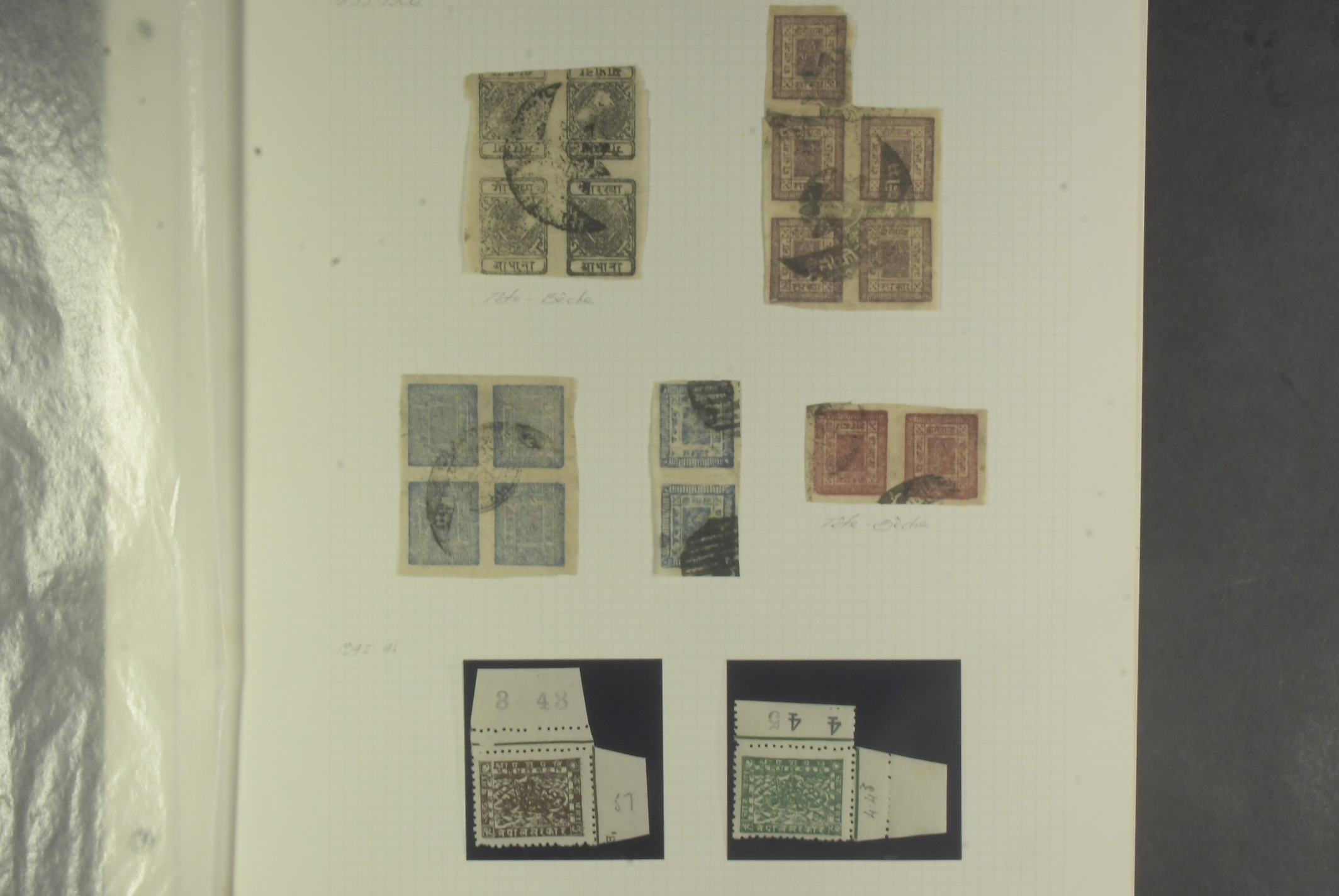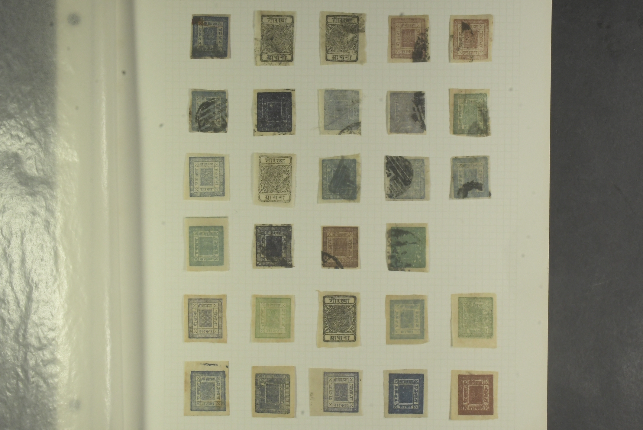Nepal. ★/⊙. A good old time collection housed on quadrille album leaves, mint and used. The first page sets the pace with 28 examples of the cut squares imperf, all with generous margins, quite probably all one a kind with at least 10 mint. The next page consists of multiples of these issues including used blocks of four and pairs tete-beche, yet further imperfs require classification, followed by a sheet of 64 used of the rectangular black definitives, leading onto various diffferent types of high values etc., etc. There are many very scarce items here especially in the first three pages. We have not had a chance to study these properly and the collection is offered as received, an outstanding opportunity with many potential individual items present.