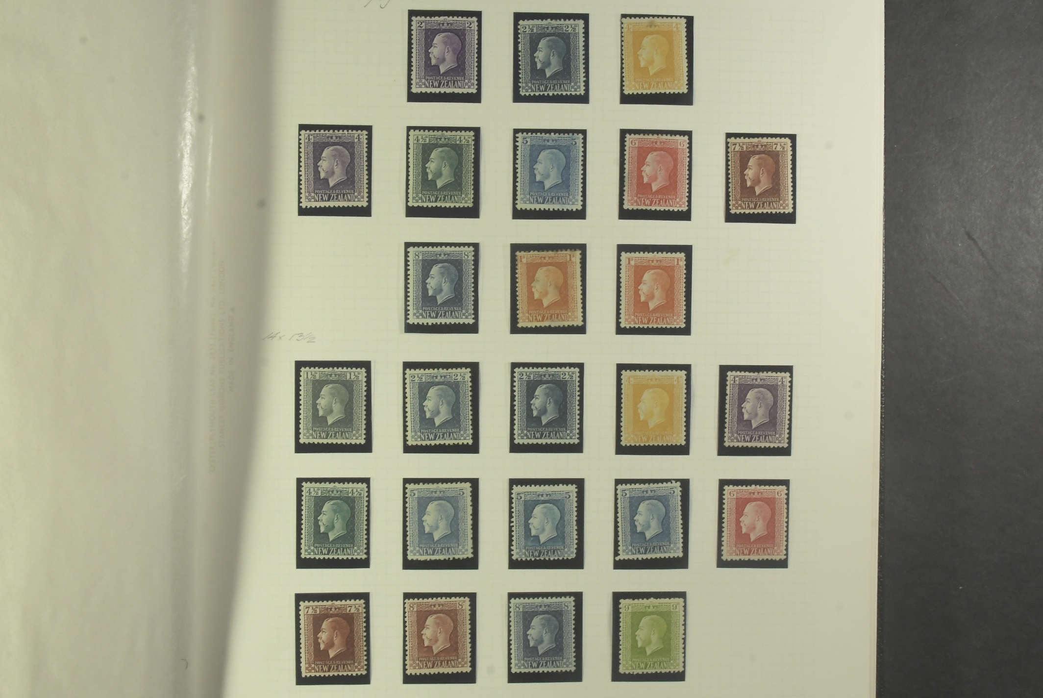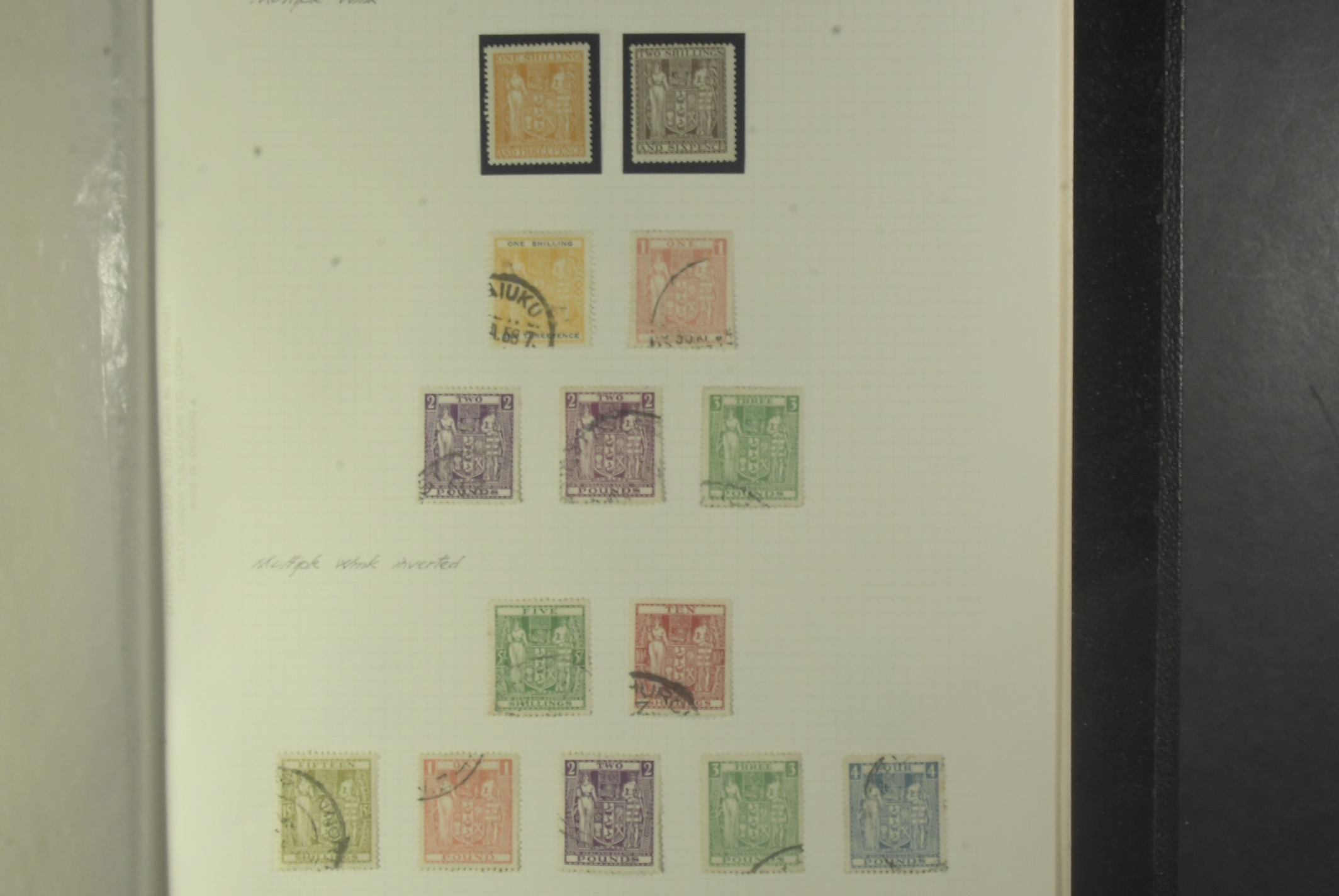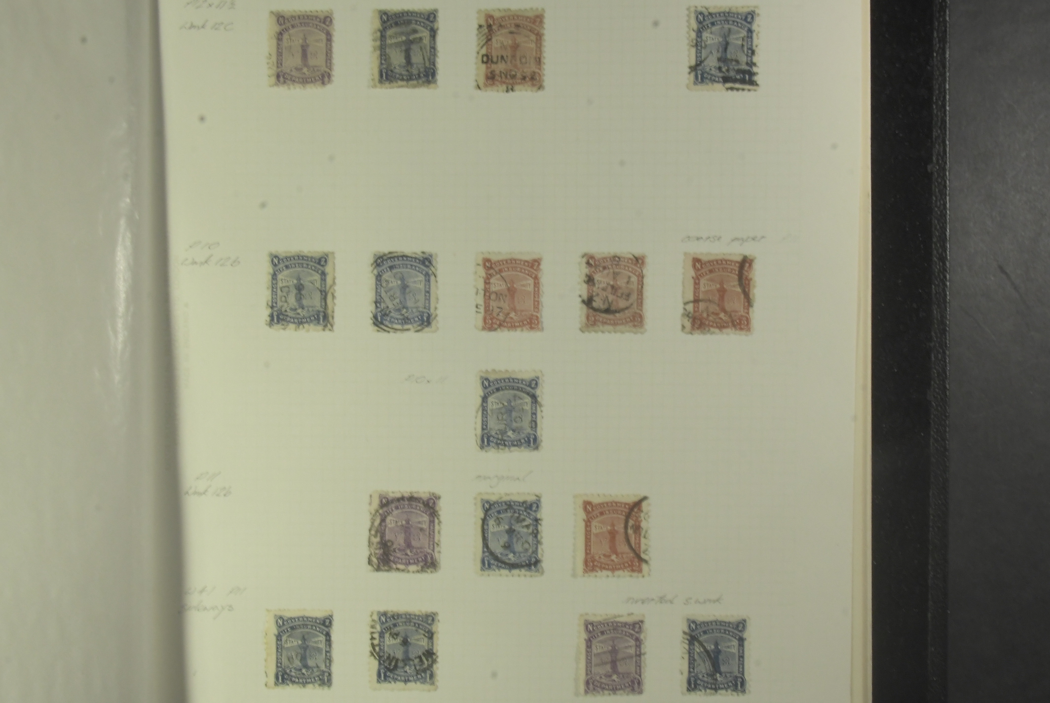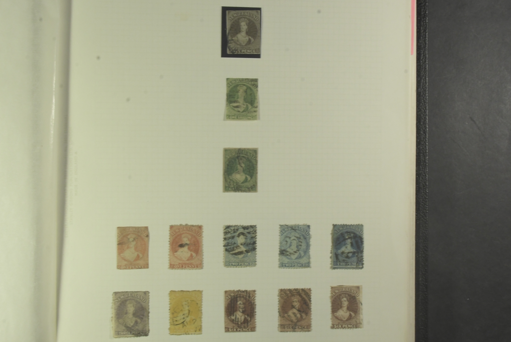 New Zealand. ★/⊙. A good old fashioned grandfather collection, mint and used, housed in a SG Plymouth album on quadrille leaves with good classics through to back of the book officials, postal fiscals, etc. Highlights include Chalons with a few imperfs with a well balanced cds four margined 6d and 2 distinct shades on the 1/- with and star and NZ watermark, then there are perforated Chalons with 10 to identify from the various different printings, leaving on to the small definitive types with a good range of a few dozen to 1/-, etc. Then early 20th century with Mt Cook to 5/- and various different perforation types on to KGV, with an excellent range of mint side profiles with at least 2 dozen of these to investigate and then the same again used, followed by the victory set complete mint, similarly Dunedin, etc. Then virtually completion KGVI to QEII – then the collection starts again with 19th century lighthouses, extensive perf studies looking very impressive, the long postal fiscals to values to £1, the latter of which is postally used, the arms type with £2, £3 and £4 inc watermark inverted, etc, ending with the officials. The collection is completely uncatalogued and has much merit throughout – there is the distinct probability of finds to be made as this was formed many decades ago. A recommended viewing, a collection with substance throughout.