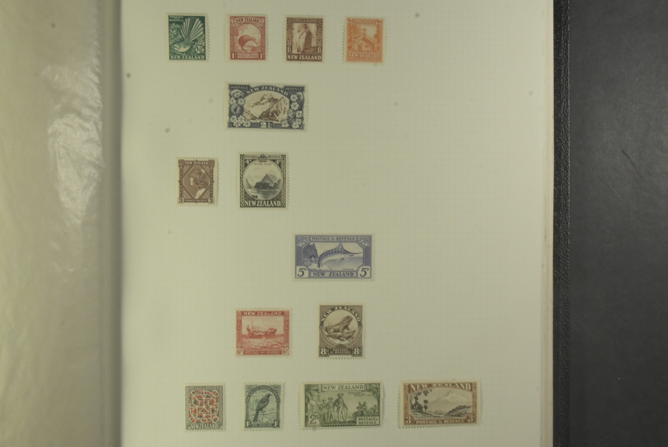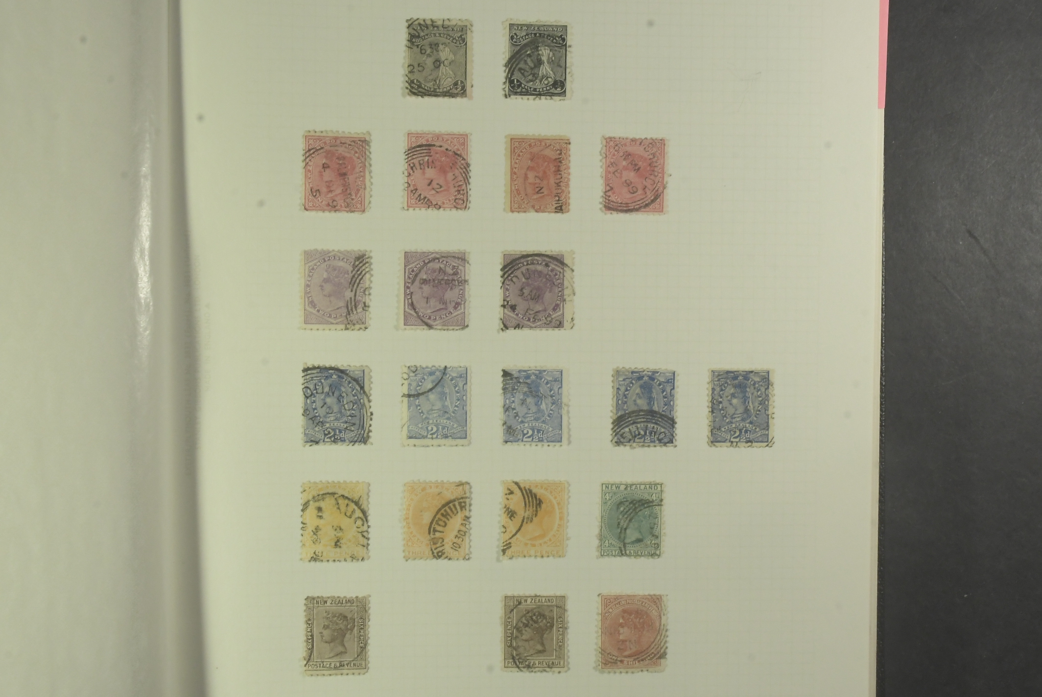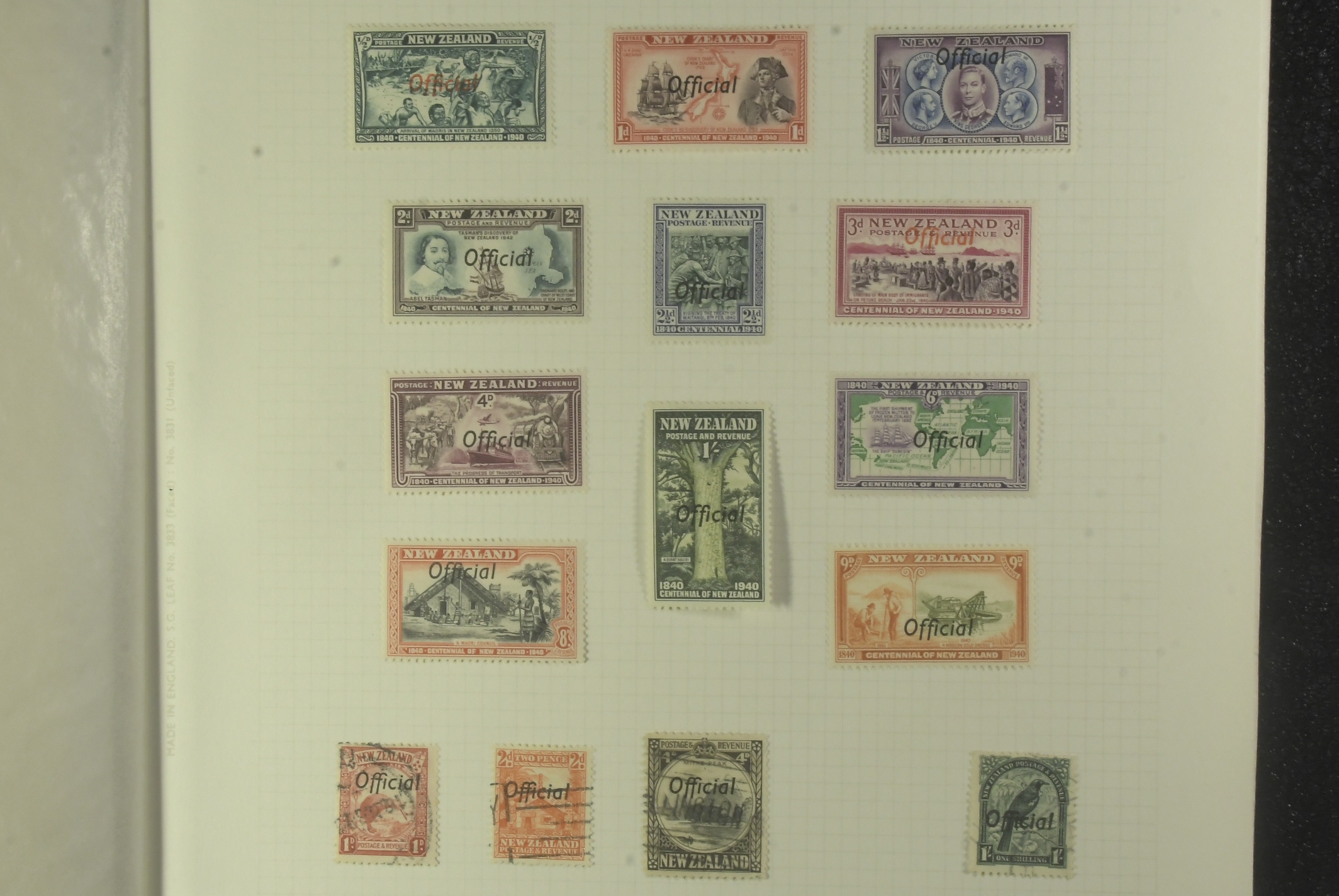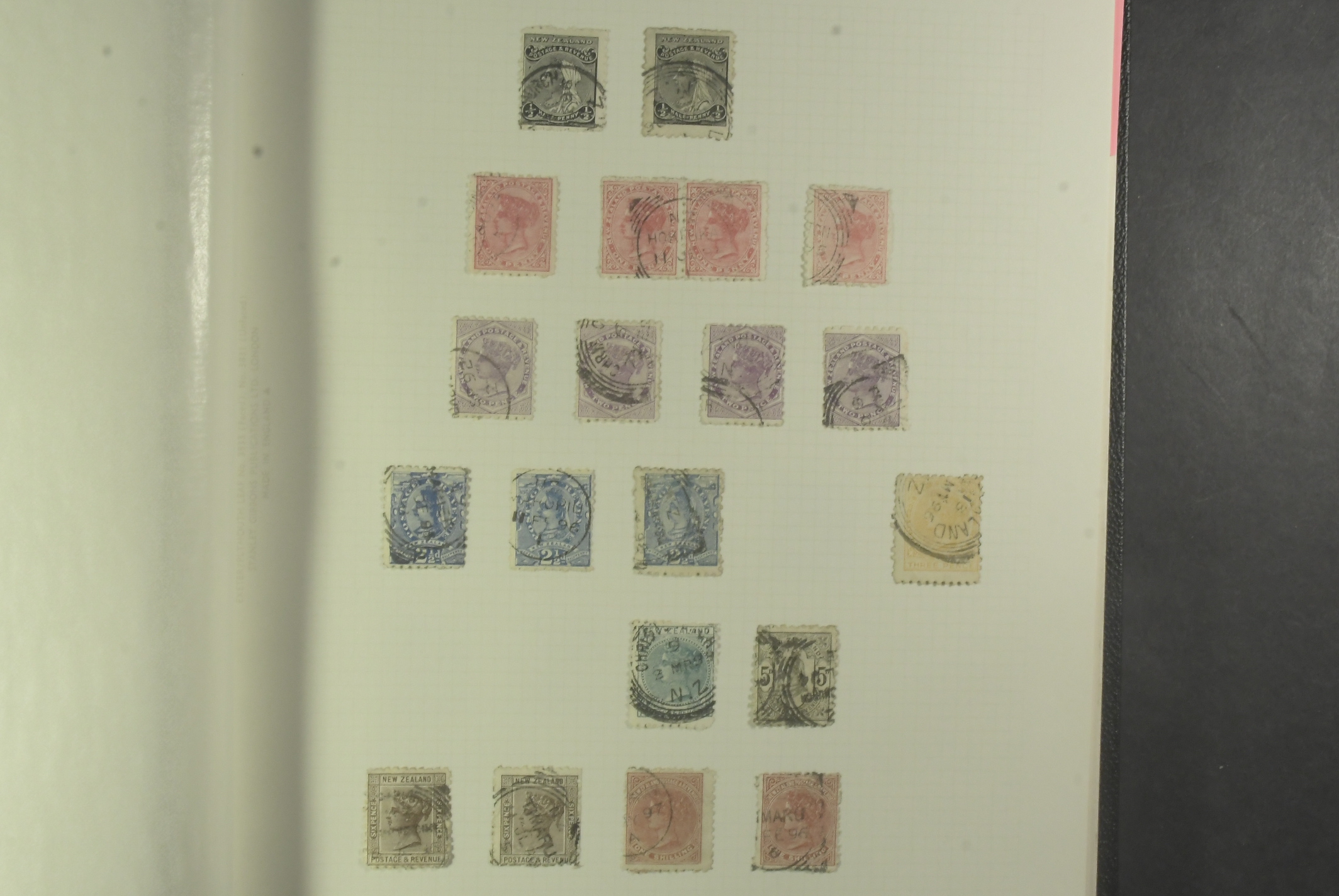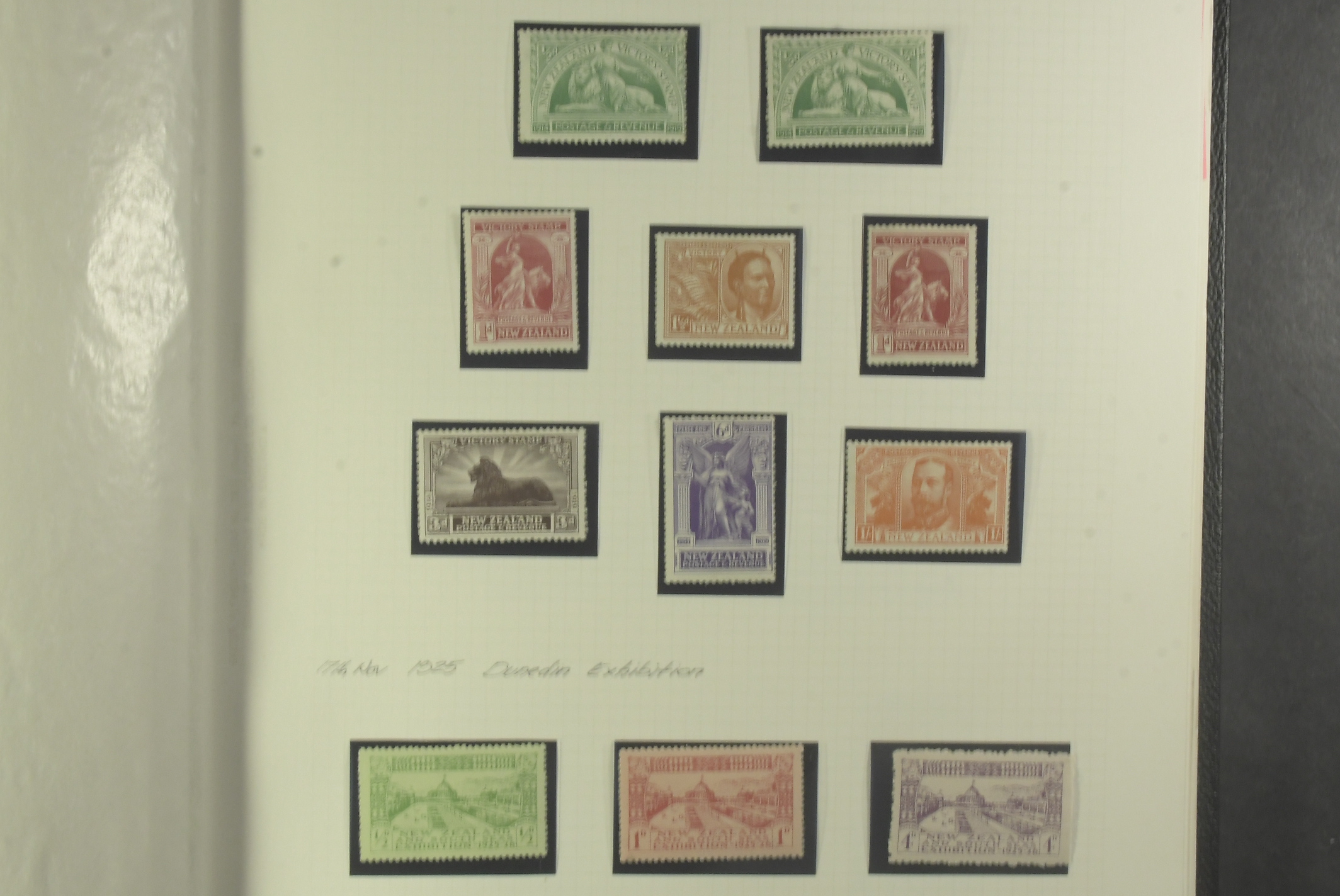 New Zealand. ★/⊙. A good old fashioned grandfather collection, mint and used, housed in a SG Plymouth album on quadrille leaves with good classics through to back of the book officials, postal fiscals, etc. Highlights include Chalons with a few imperfs with a well balanced cds four margined 6d and 2 distinct shades on the 1/- with and star and NZ watermark, then there are perforated Chalons with 10 to identify from the various different printings, leaving on to the small definitive types with a good range of a few dozen to 1/-, etc. Then early 20th century with Mt Cook to 5/- and various different perforation types on to KGV, with an excellent range of mint side profiles with at least 2 dozen of these to investigate and then the same again used, followed by the victory set complete mint, similarly Dunedin, etc. Then virtually completion KGVI to QEII – then the collection starts again with 19th century lighthouses, extensive perf studies looking very impressive, the long postal fiscals to values to £1, the latter of which is postally used, the arms type with £2, £3 and £4 inc watermark inverted, etc, ending with the officials. The collection is completely uncatalogued and has much merit throughout – there is the distinct probability of finds to be made as this was formed many decades ago. A recommended viewing, a collection with substance throughout.