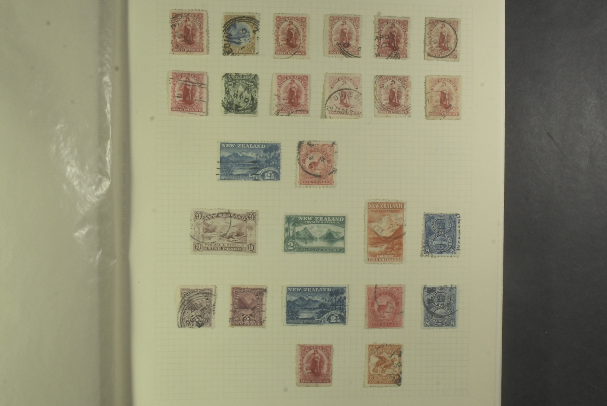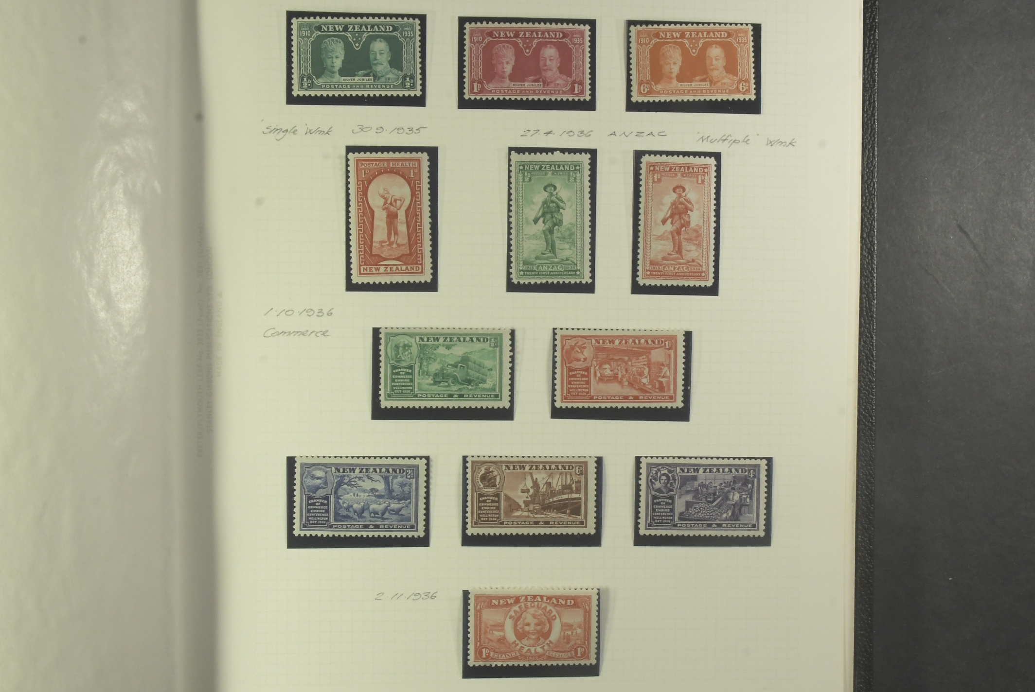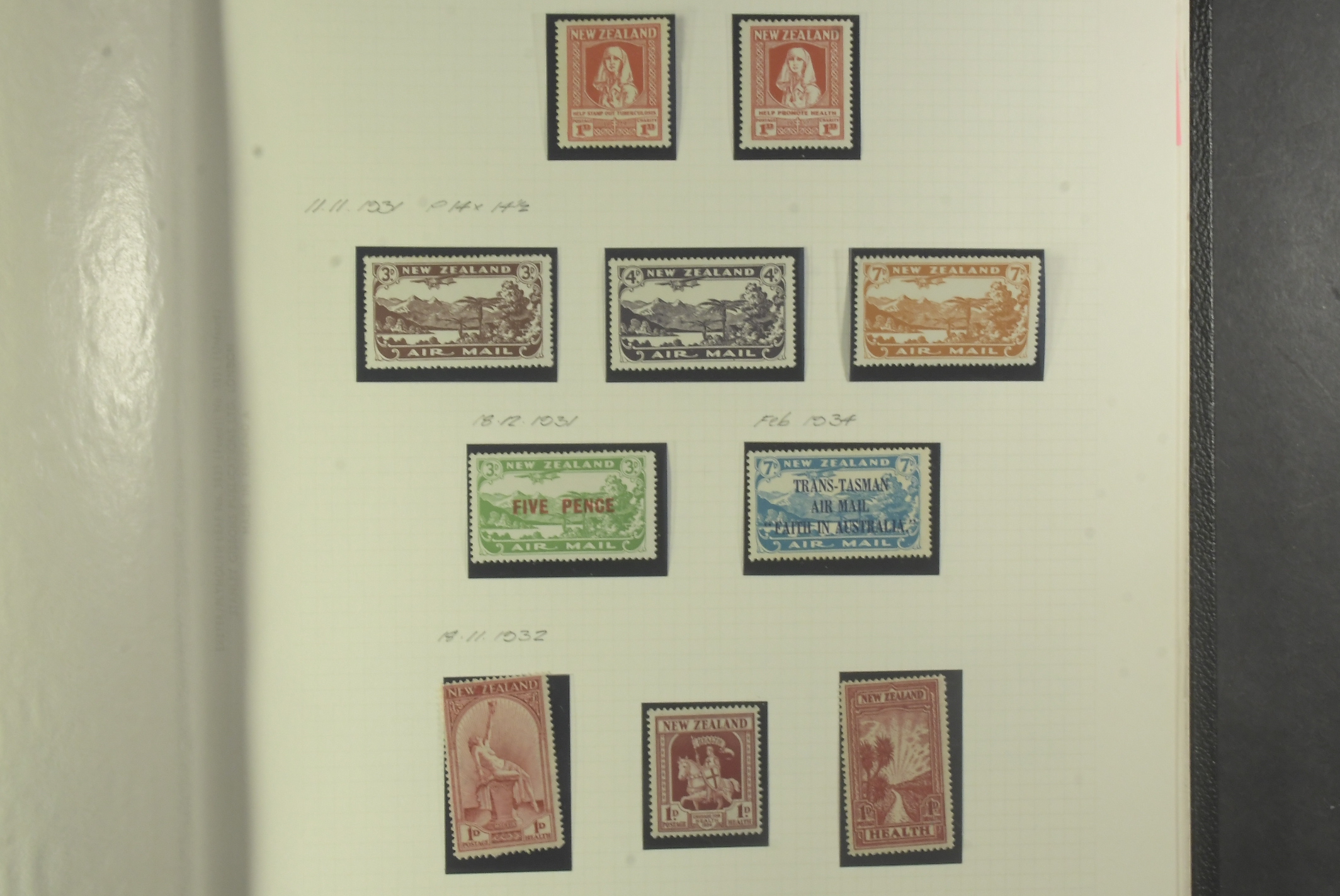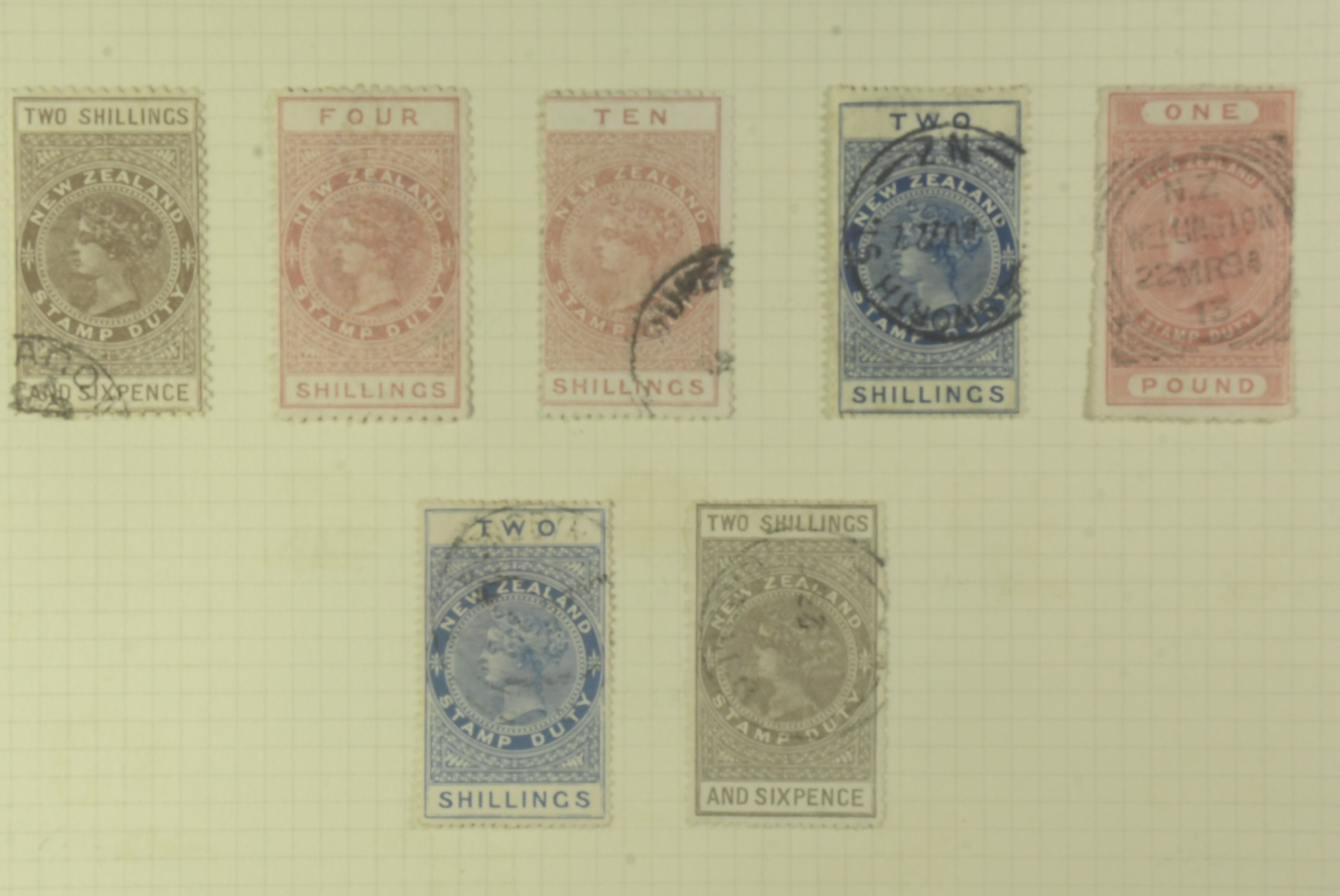 New Zealand. ★/⊙. A good old fashioned grandfather collection, mint and used, housed in a SG Plymouth album on quadrille leaves with good classics through to back of the book officials, postal fiscals, etc. Highlights include Chalons with a few imperfs with a well balanced cds four margined 6d and 2 distinct shades on the 1/- with and star and NZ watermark, then there are perforated Chalons with 10 to identify from the various different printings, leaving on to the small definitive types with a good range of a few dozen to 1/-, etc. Then early 20th century with Mt Cook to 5/- and various different perforation types on to KGV, with an excellent range of mint side profiles with at least 2 dozen of these to investigate and then the same again used, followed by the victory set complete mint, similarly Dunedin, etc. Then virtually completion KGVI to QEII – then the collection starts again with 19th century lighthouses, extensive perf studies looking very impressive, the long postal fiscals to values to £1, the latter of which is postally used, the arms type with £2, £3 and £4 inc watermark inverted, etc, ending with the officials. The collection is completely uncatalogued and has much merit throughout – there is the distinct probability of finds to be made as this was formed many decades ago. A recommended viewing, a collection with substance throughout.