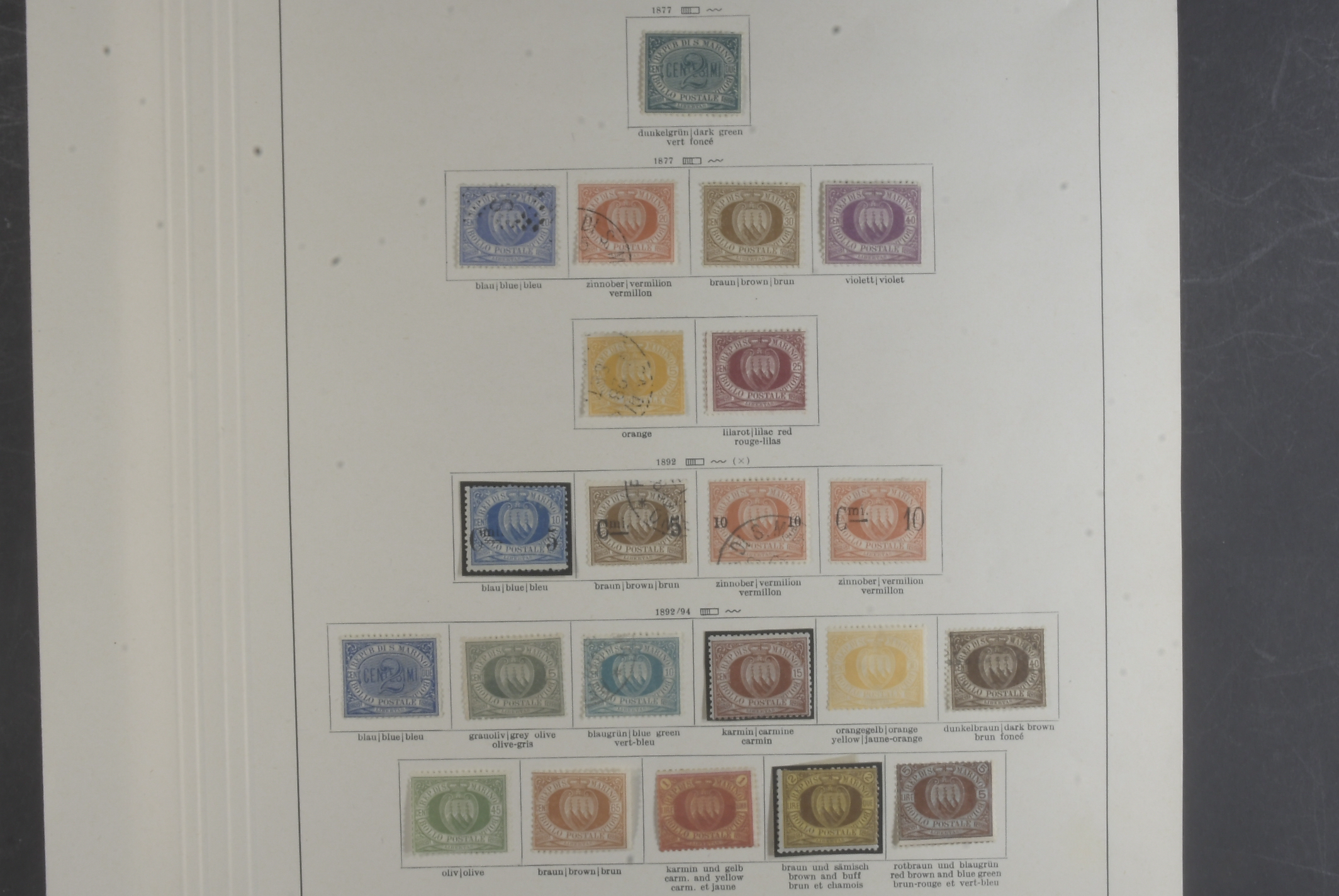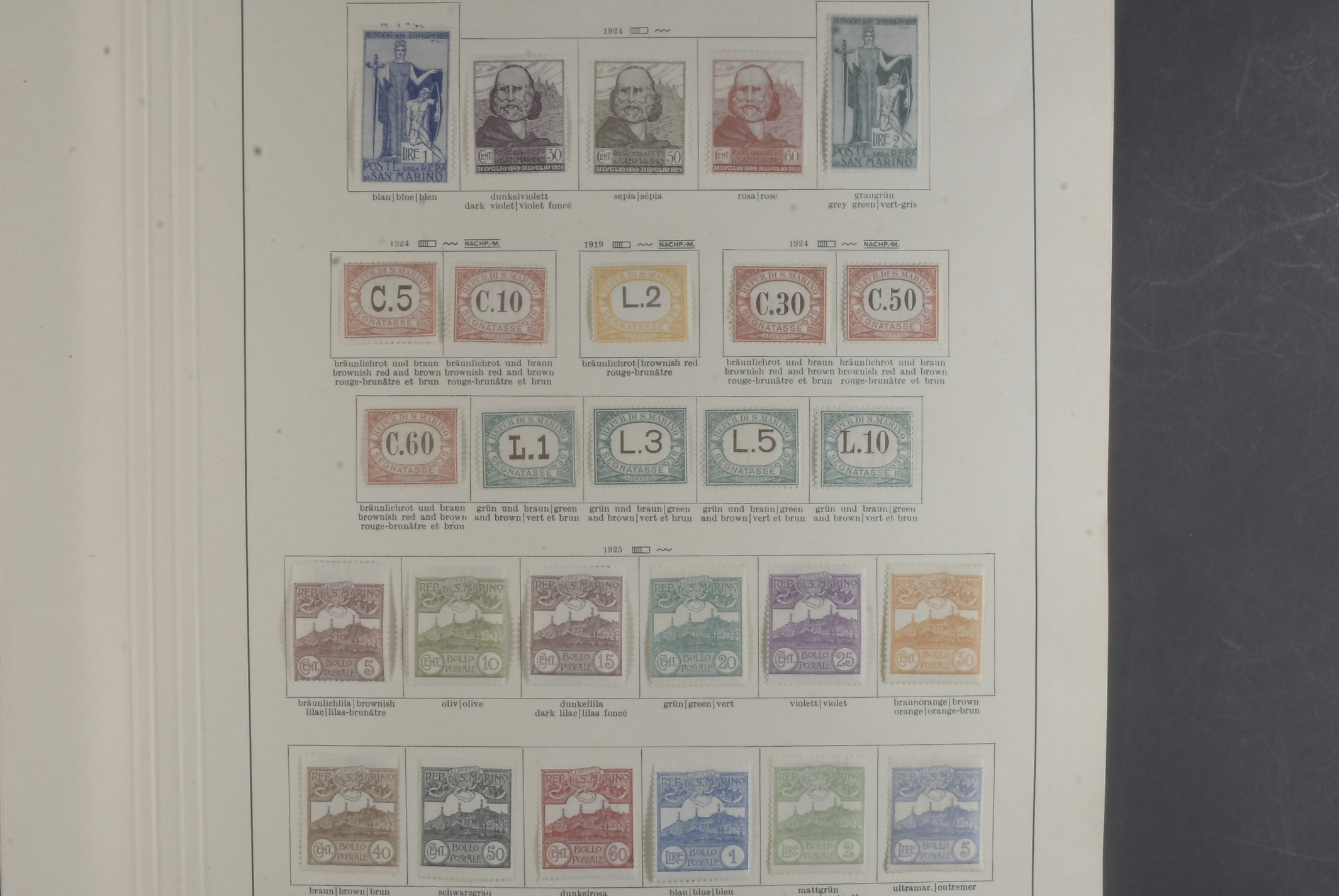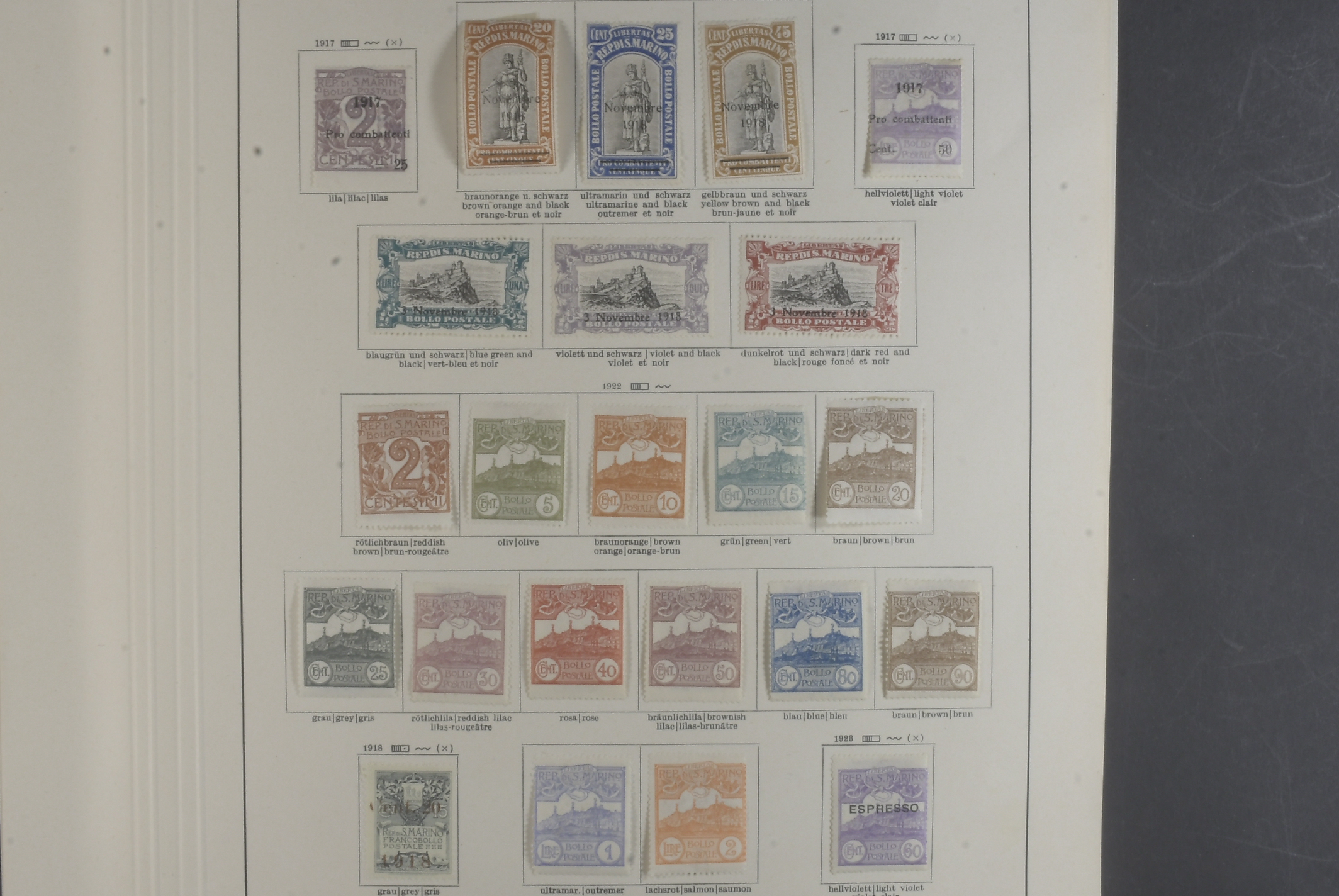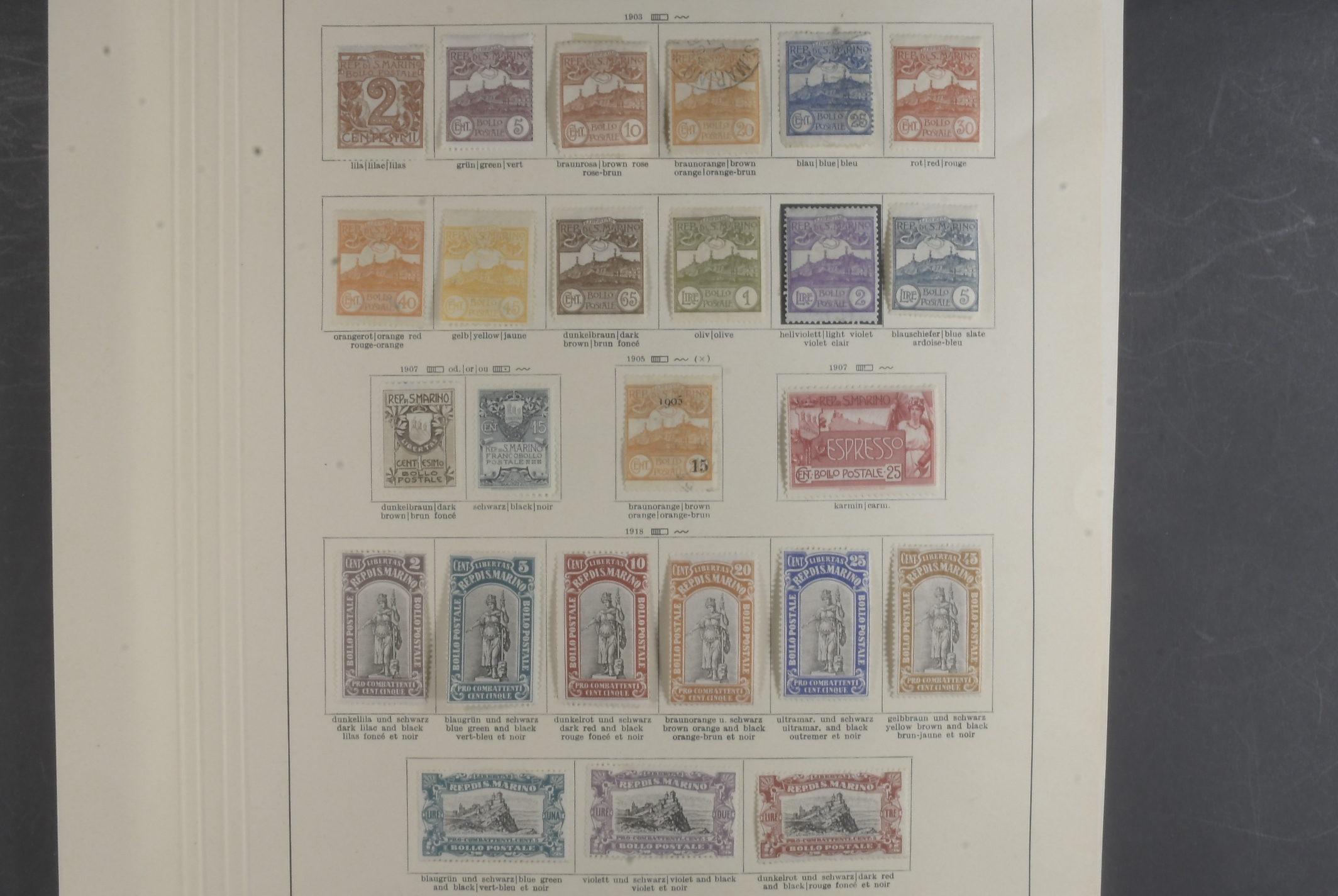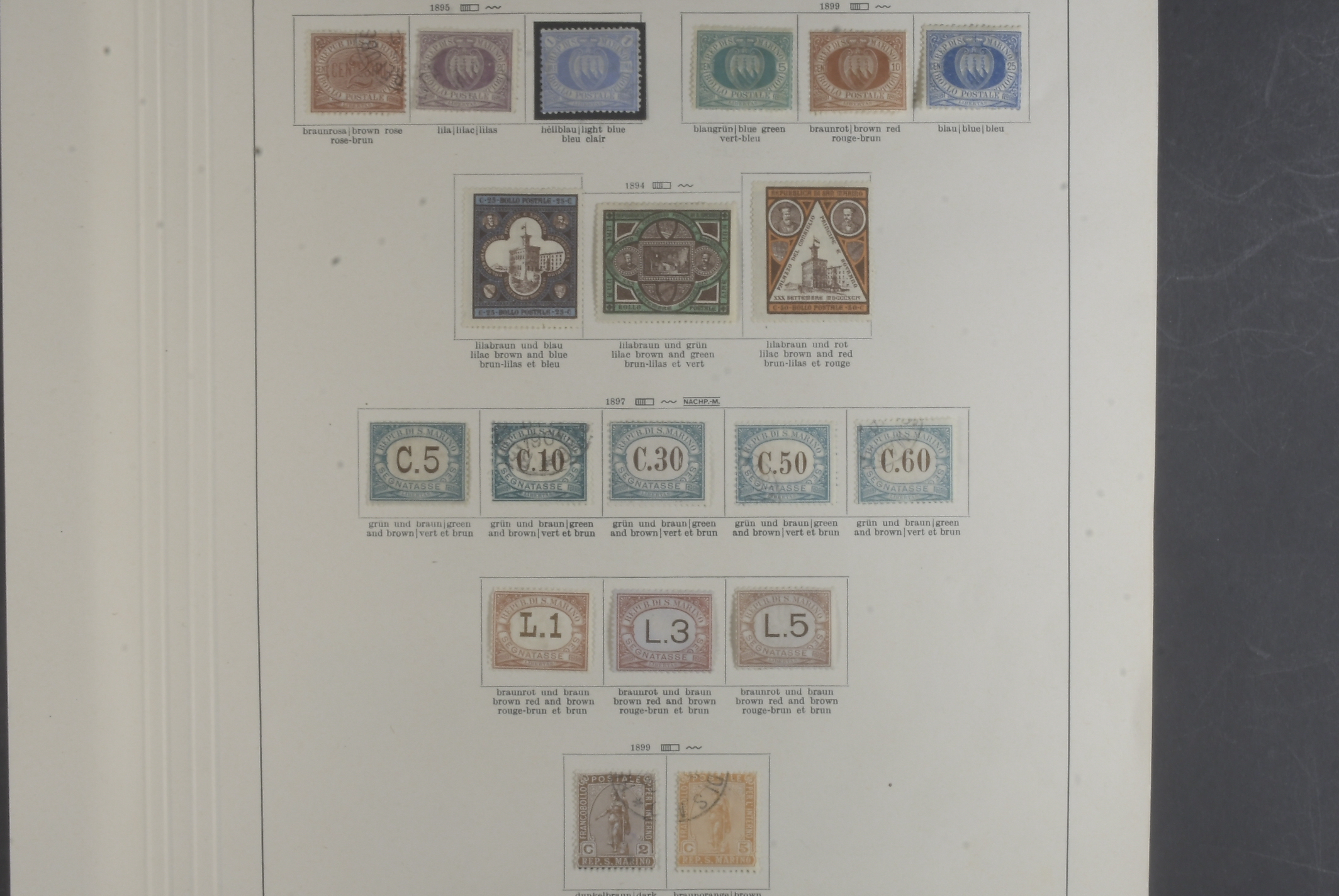 San Marino. Collection ★ 1877–1955 on leaves. Almost complete used and mint mixed with many better stamps. E.g. Mi 4–5, 7, 12–22, 31, 44–45, 133–74 mint *, 175–205 used, due 10–18 and 19–30 * used. Somewhat mixed quality.