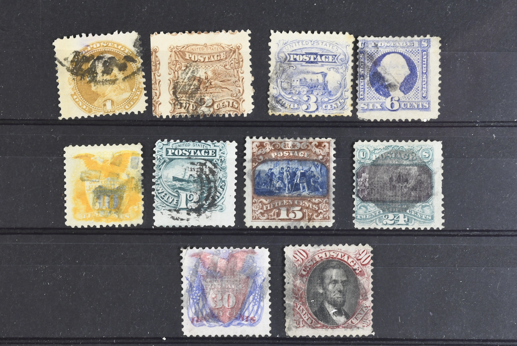 U.S.A. Michel 26–35 used, 1869 Different designs SET (10). 2 c with interesting perforation error, cut to the left a bit into the next stamp. A few short perfs, also on 90 c. EUR 4000