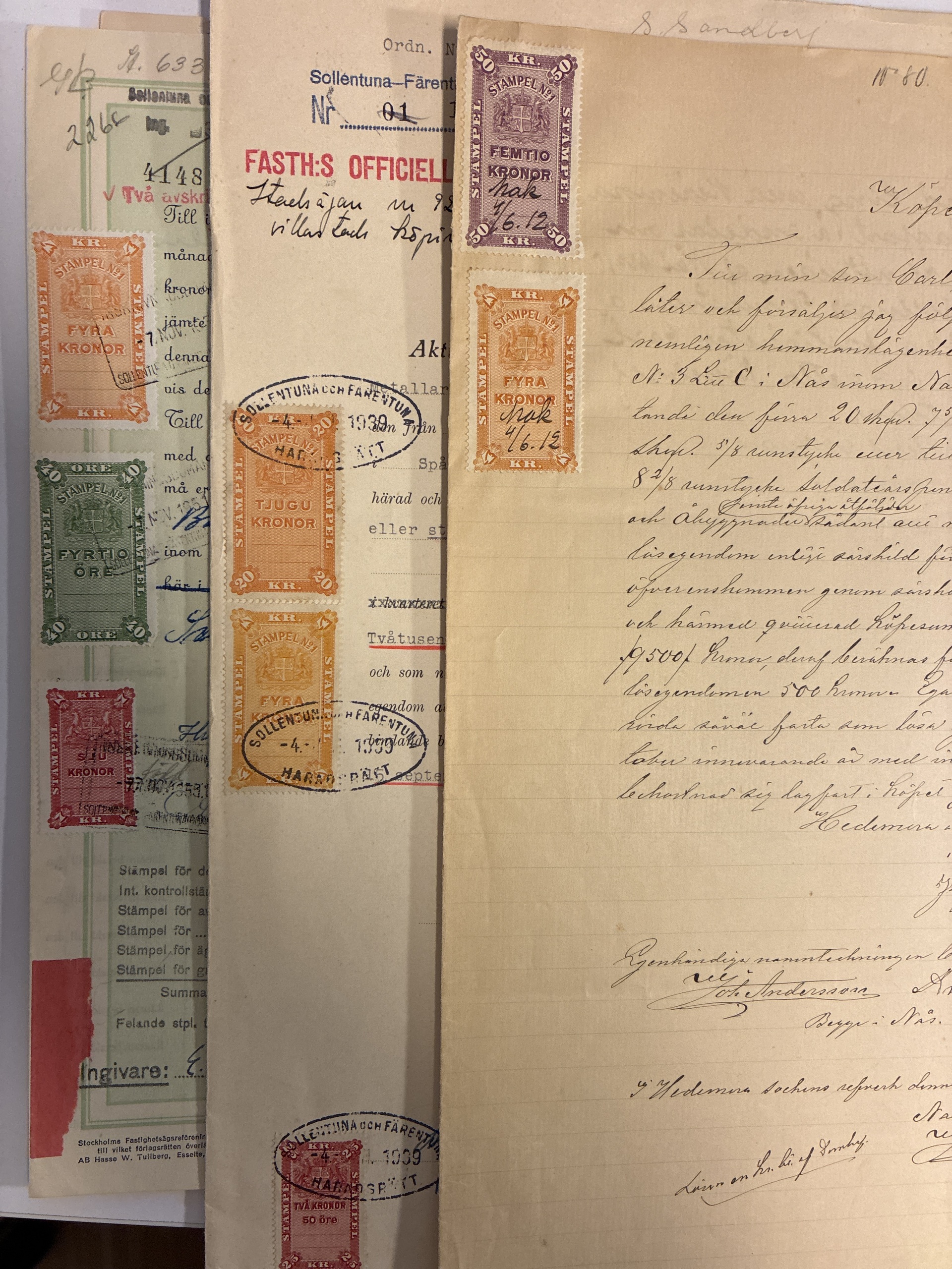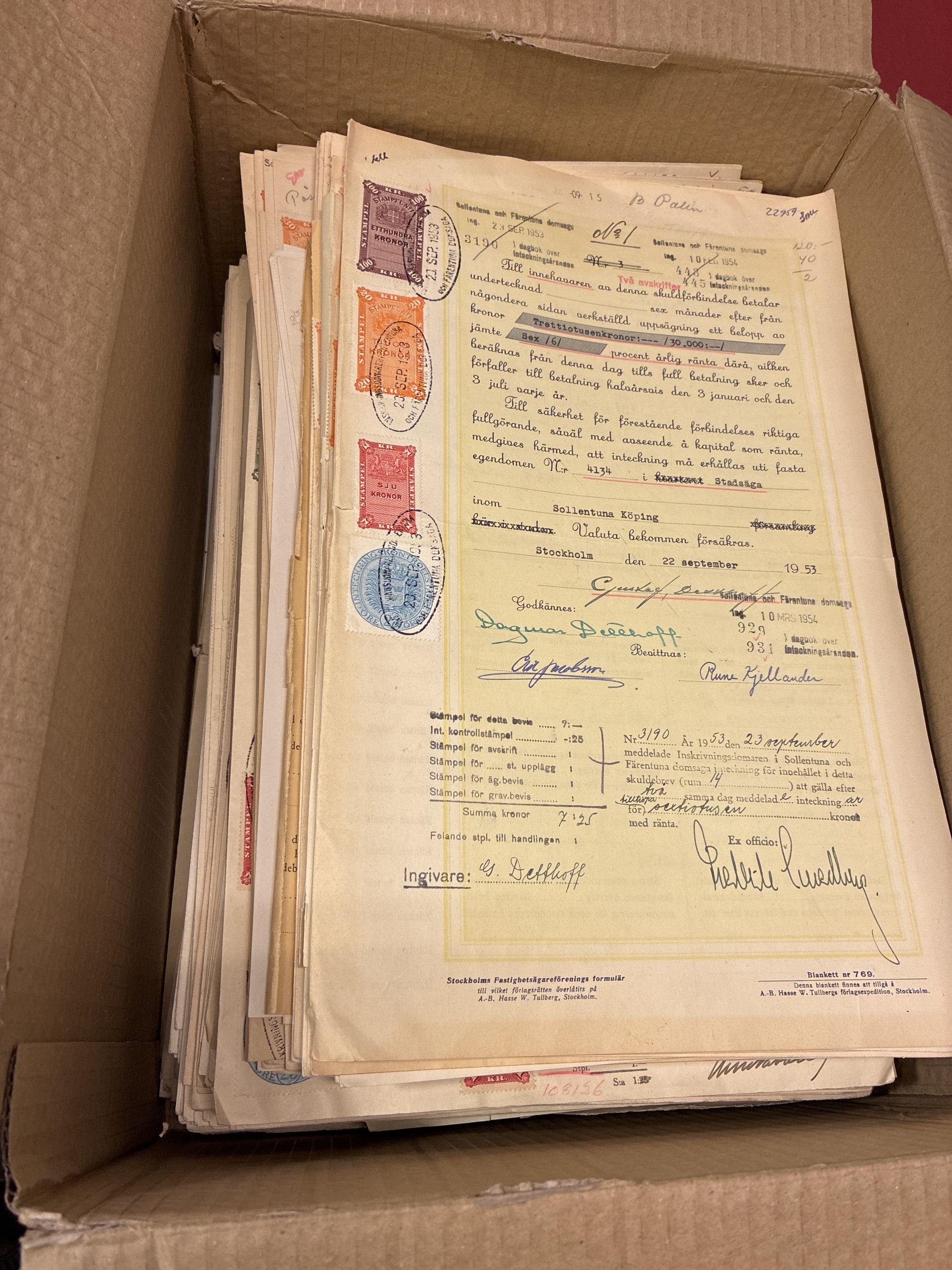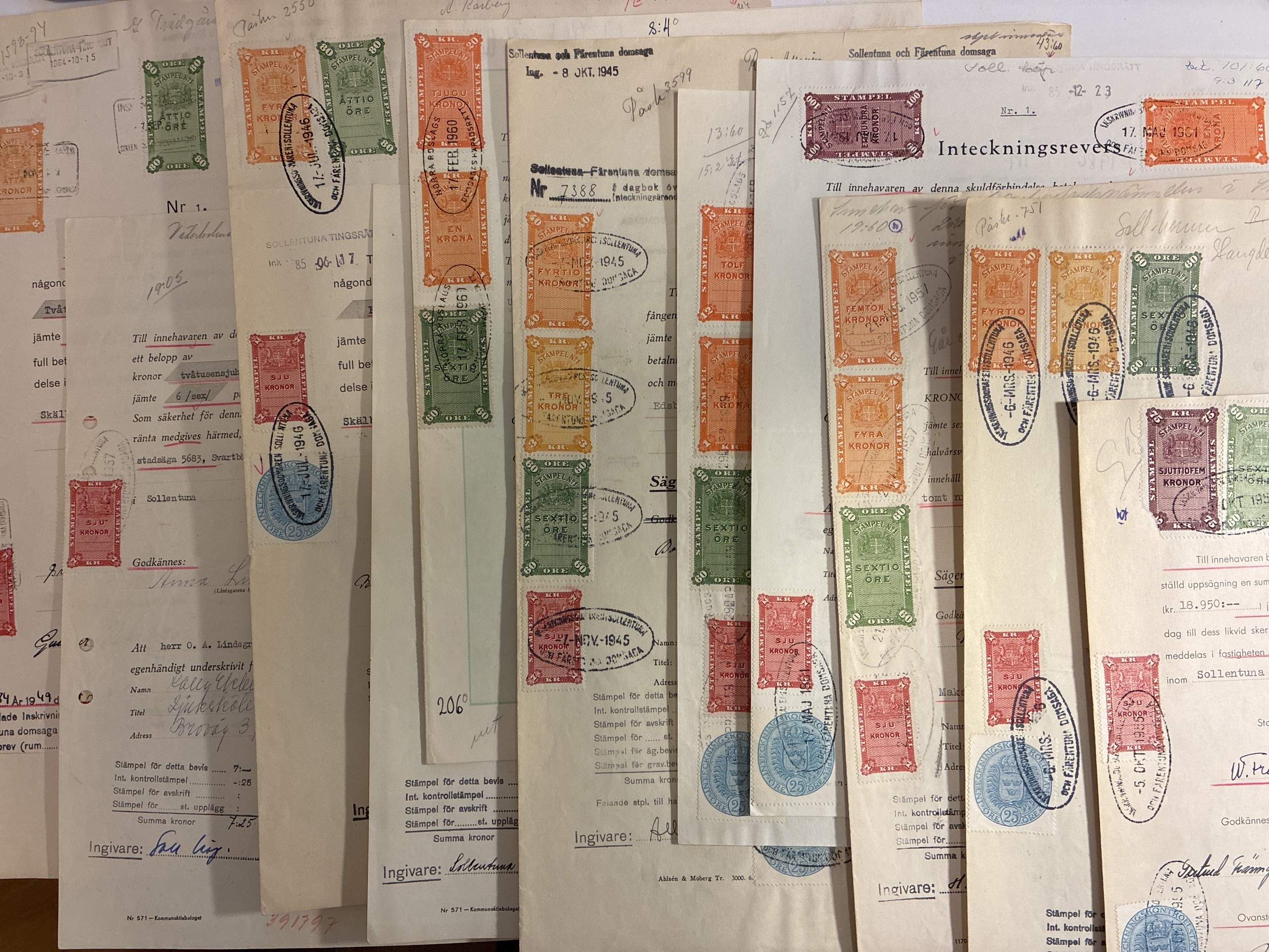 Sweden. Cinderella, accumulation 1930–1950s in box. Revenues Sweden on bank papers. Please see a selection of scans at www.philea.se. Mostly good quality. Approx. 9 kg. (ca. 1000)