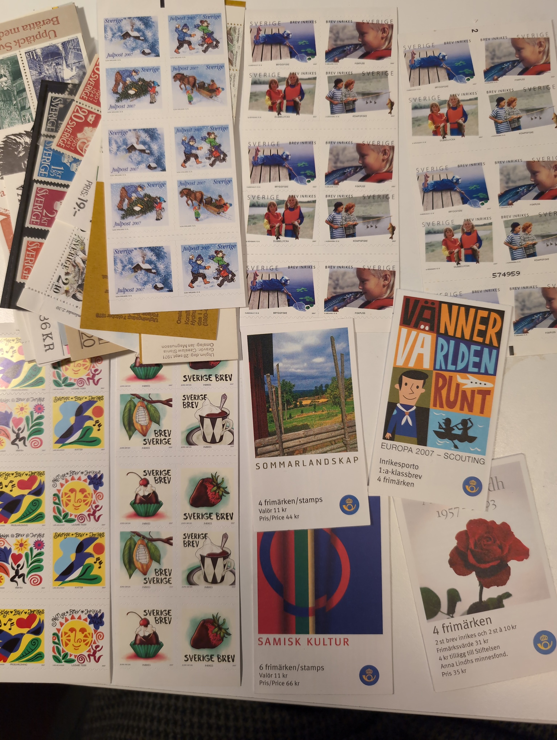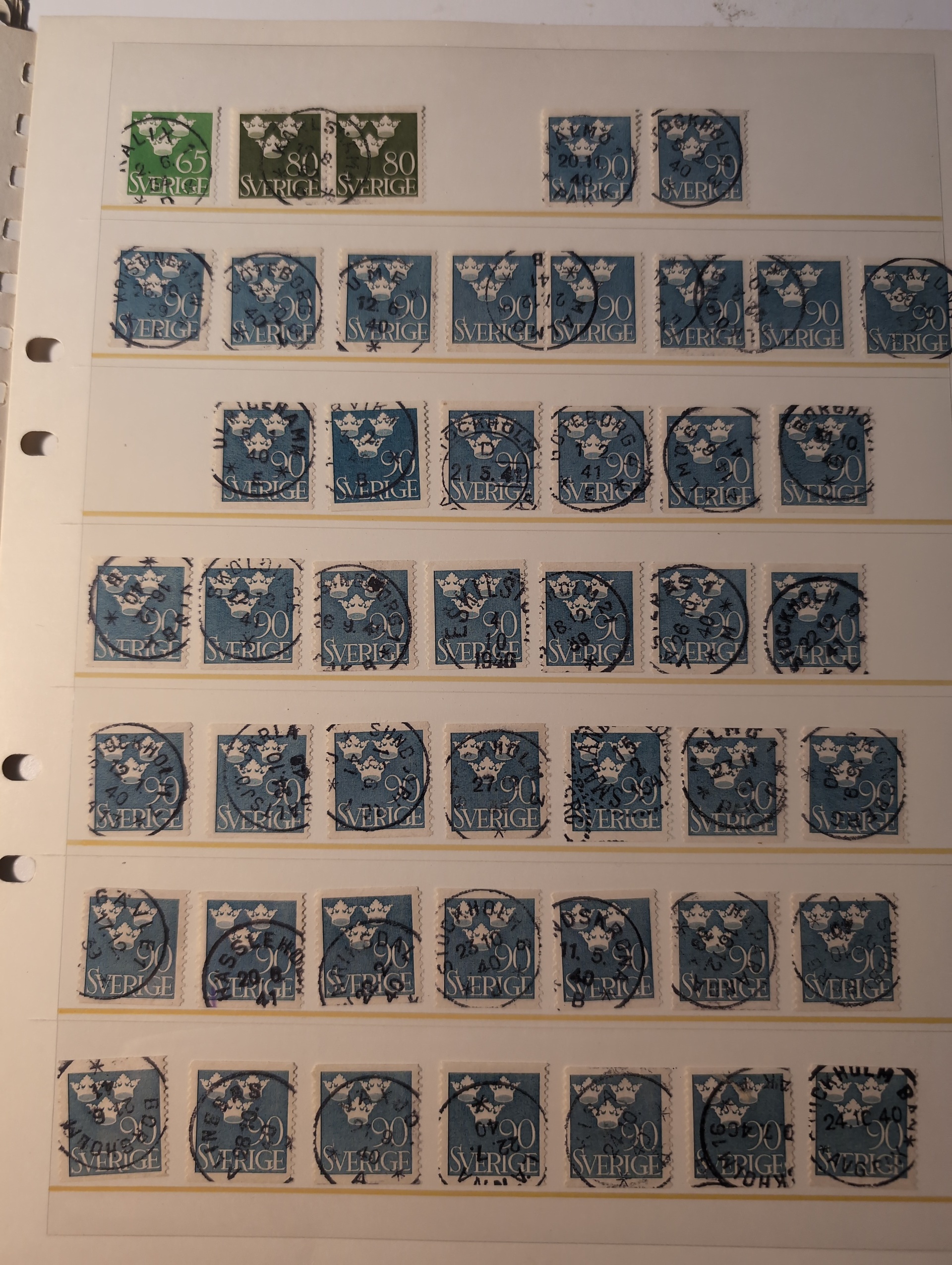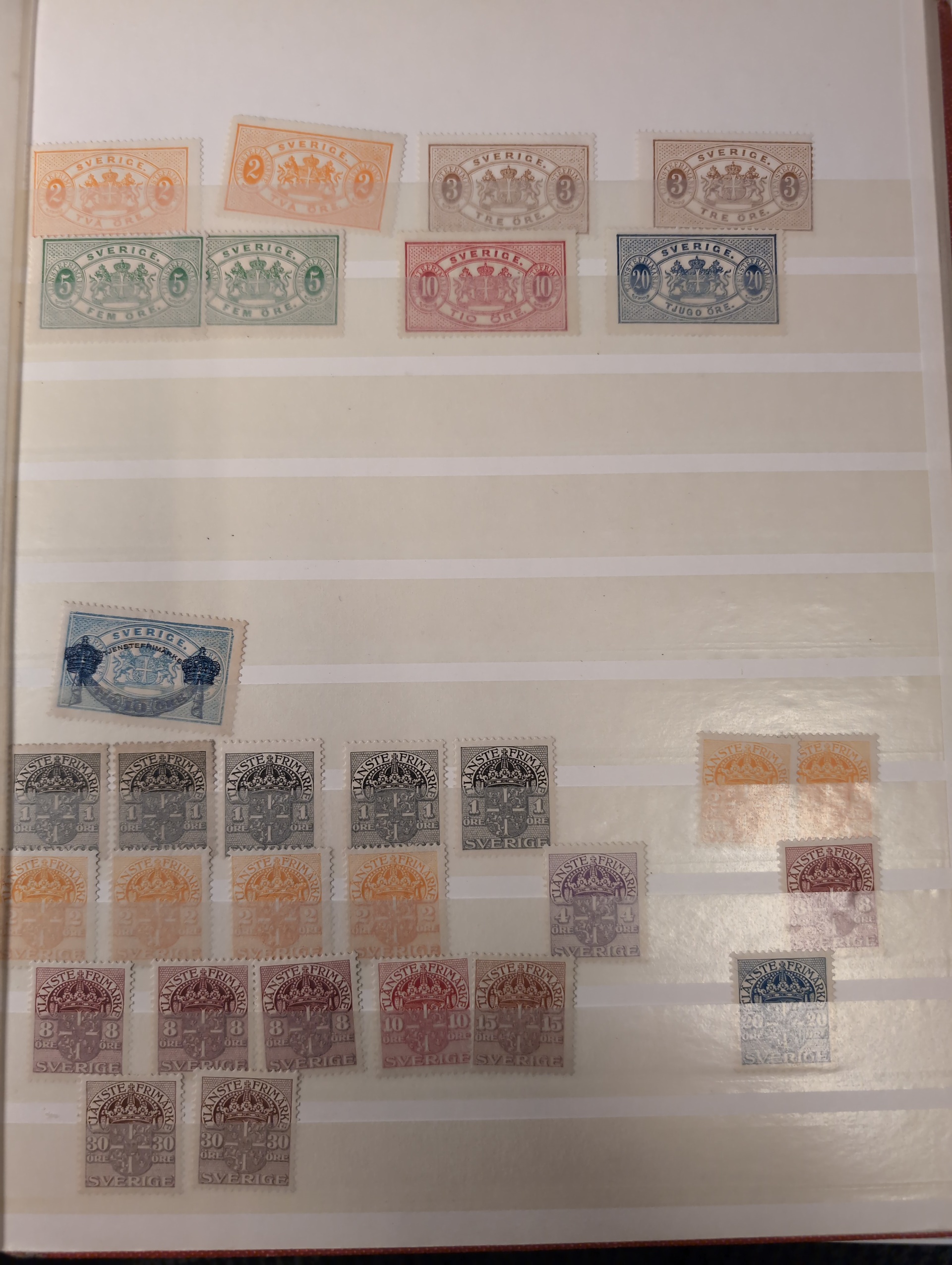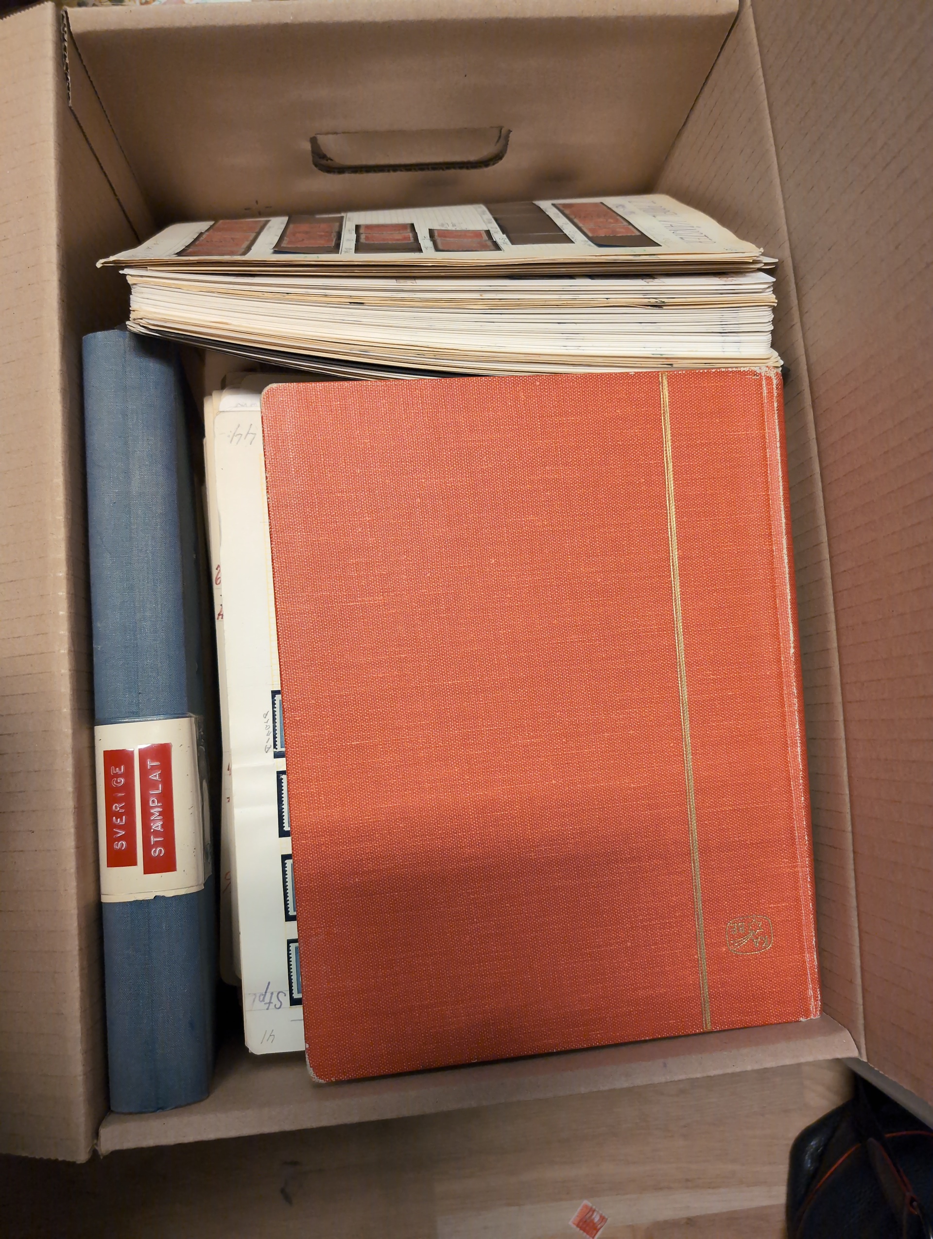 Sweden. Accumulation ★★/★/⊙ 1870s–2010 in box. Mystery box with a huge pile of album leaves and visir leaves mostly Coilstamps - 1960s. One album vending machine booklets, 2 stockbooks and 2 other albums with a mix of Sweden old-1950s. One envelope with more modern Face value incl. 46 "Brev" and 10 "Christmas" stamps. Interesting lot. Somewhat mixed quality. Approx. 18 kg. (1000s)